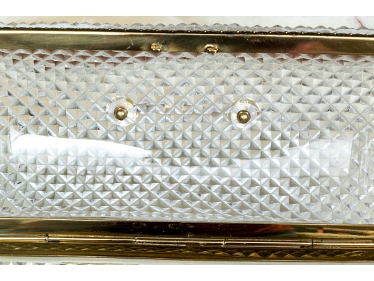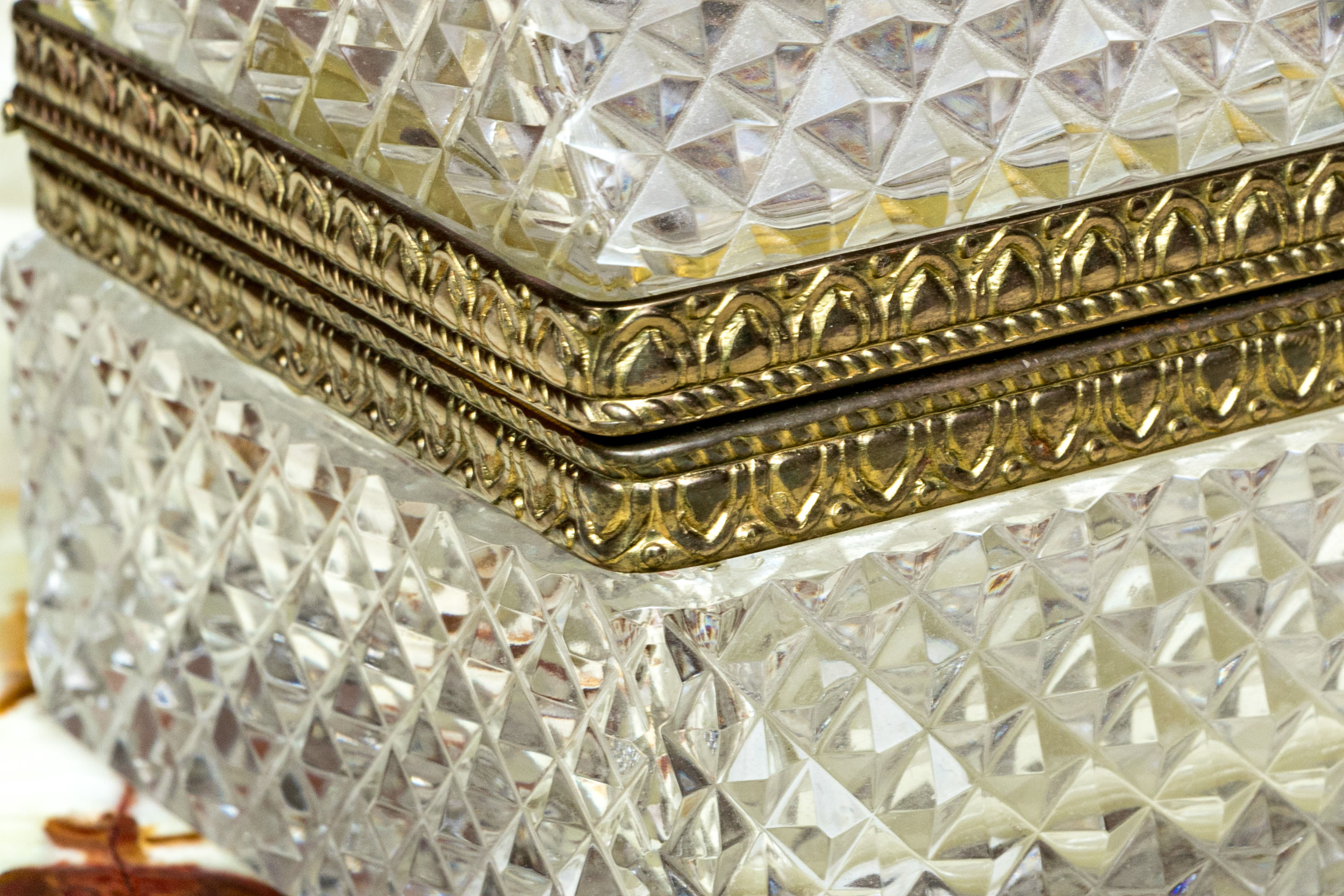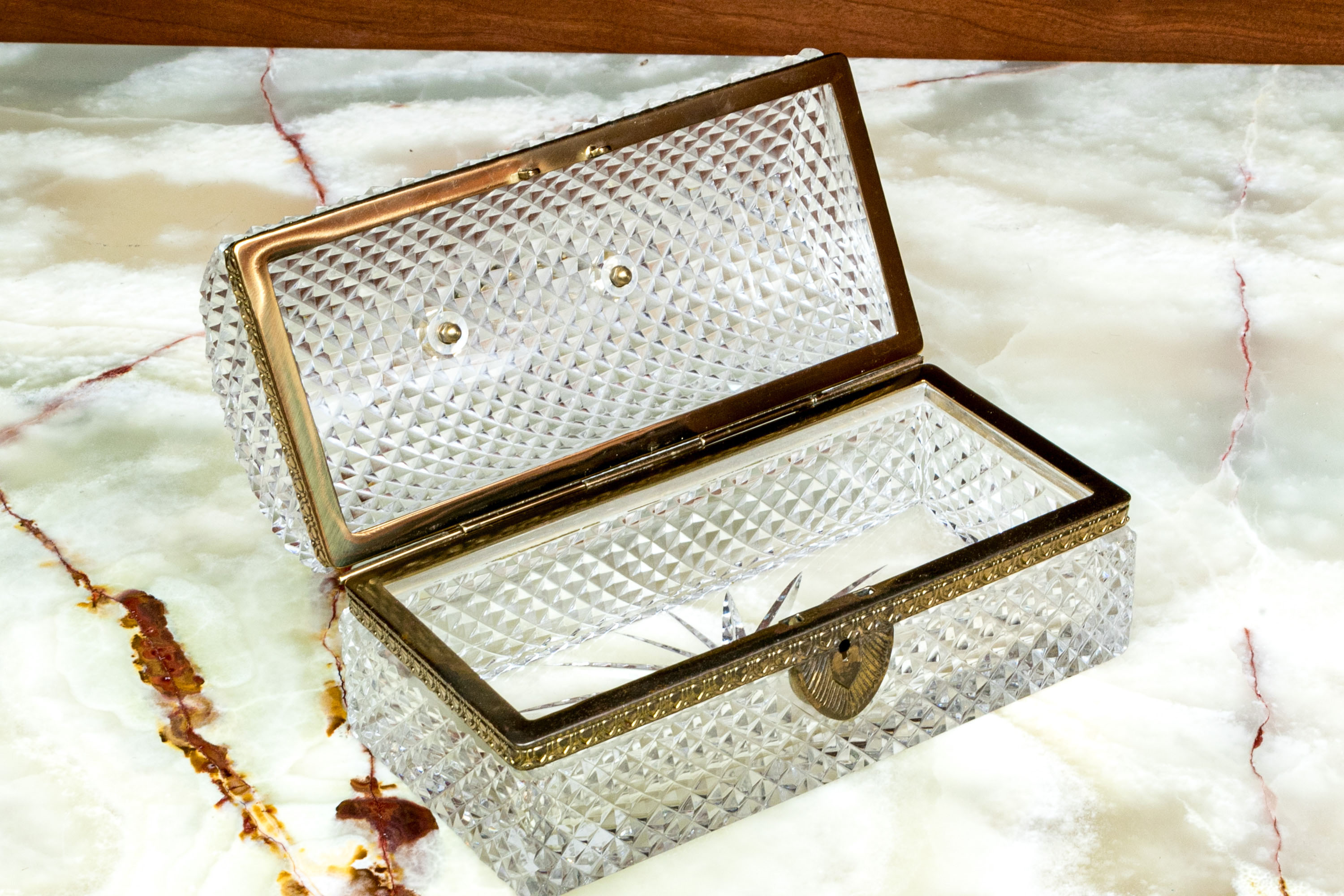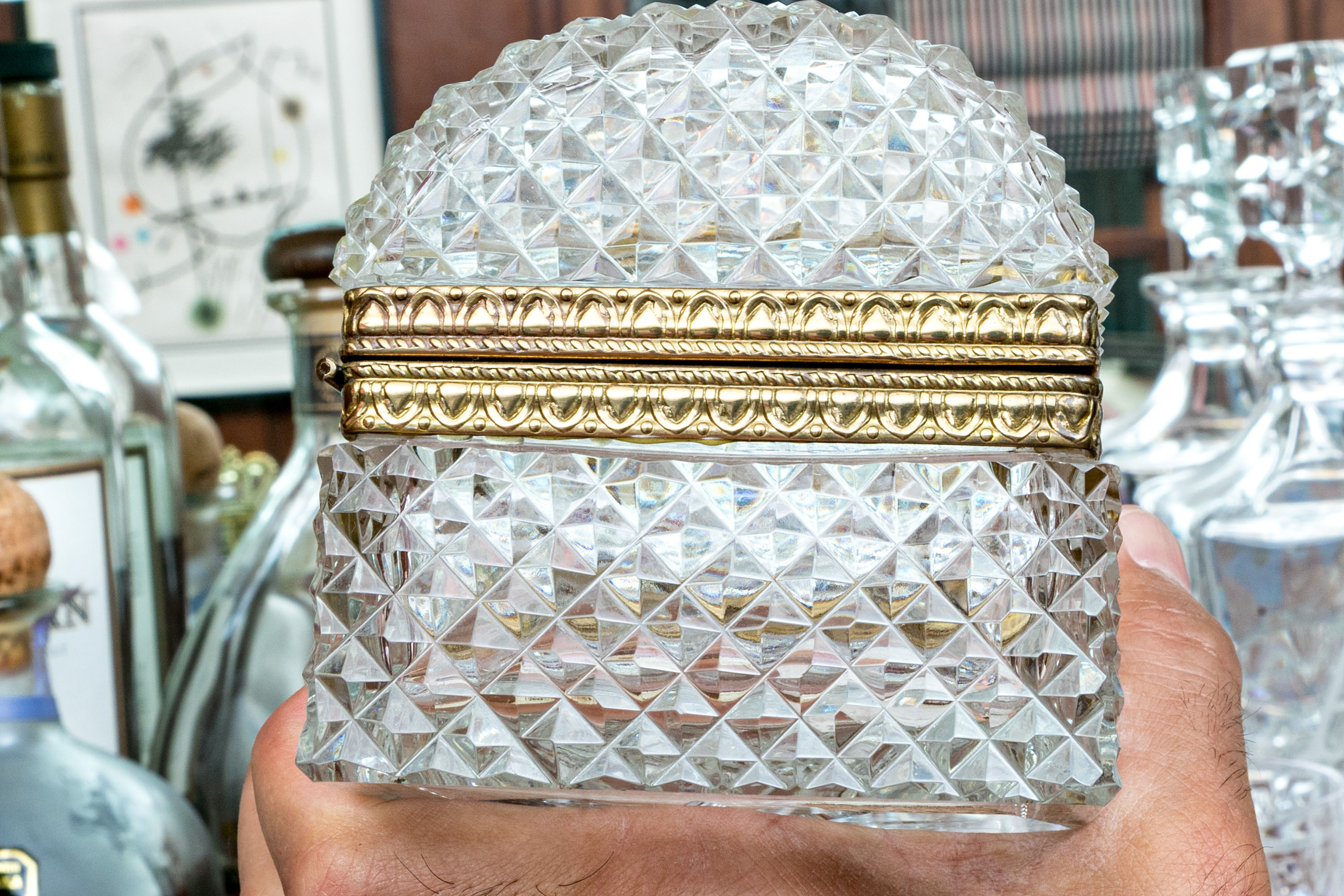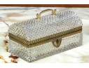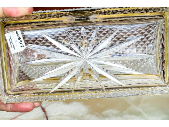 The cut crystal domed lidded box with art deco style gilt metal mounts along with handle atop the domed lid.