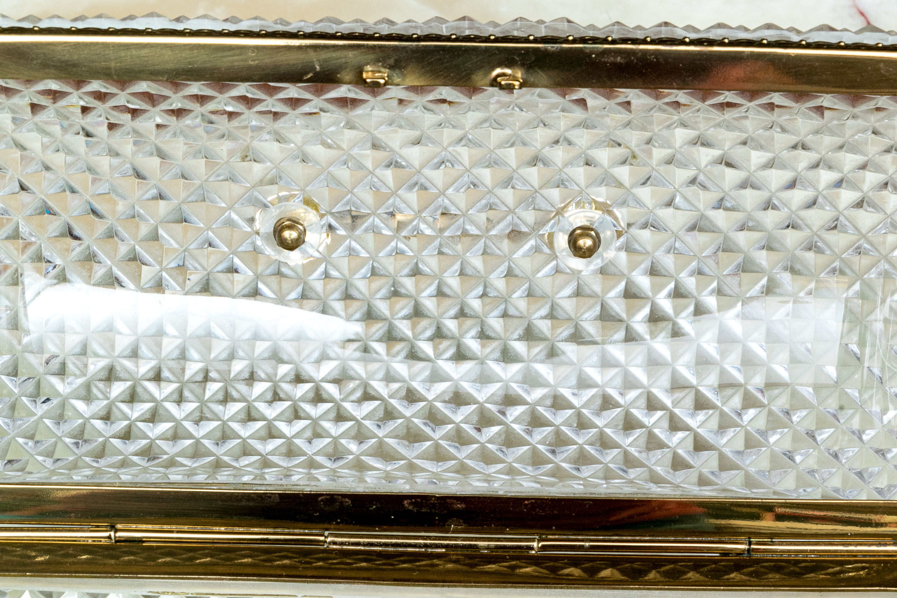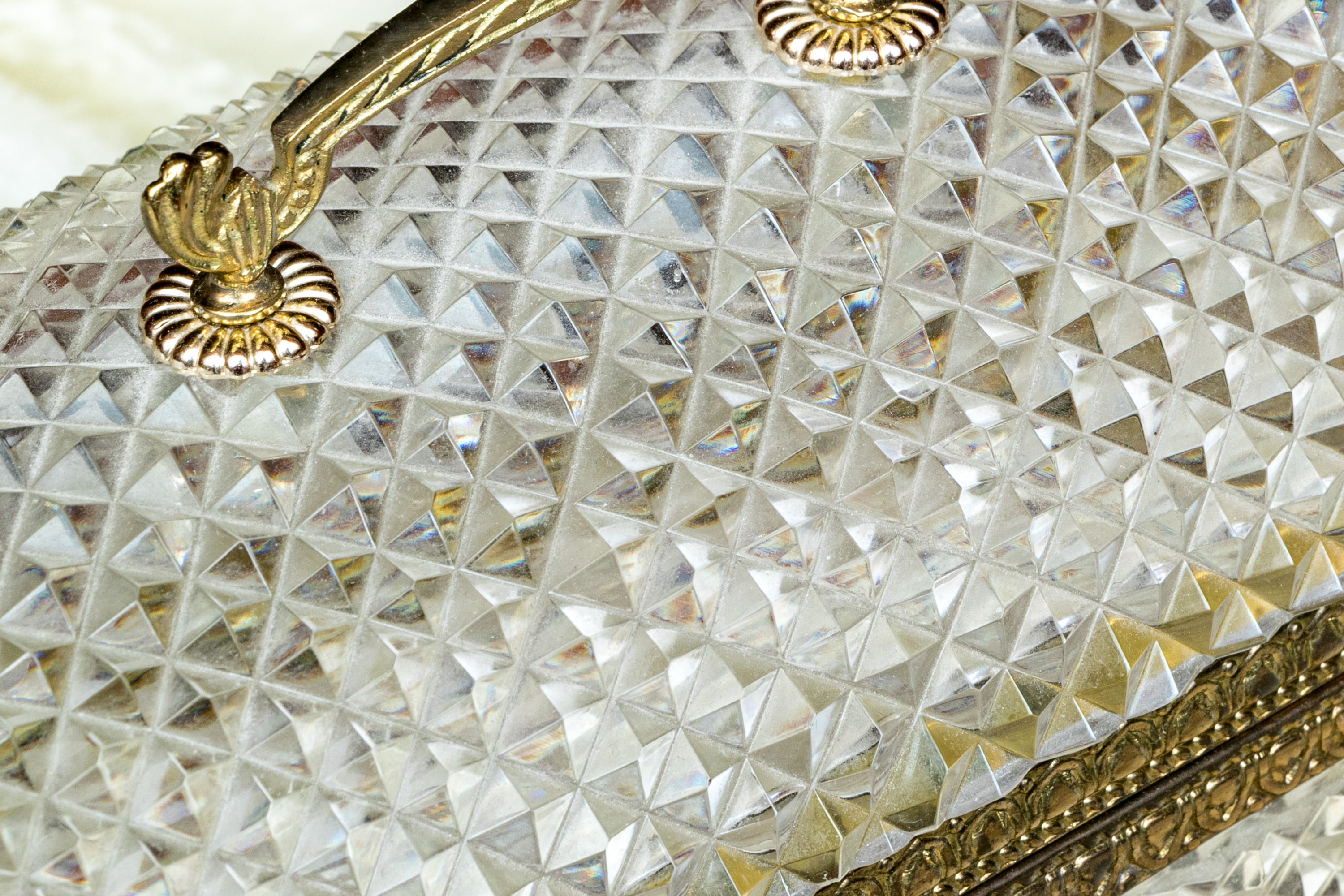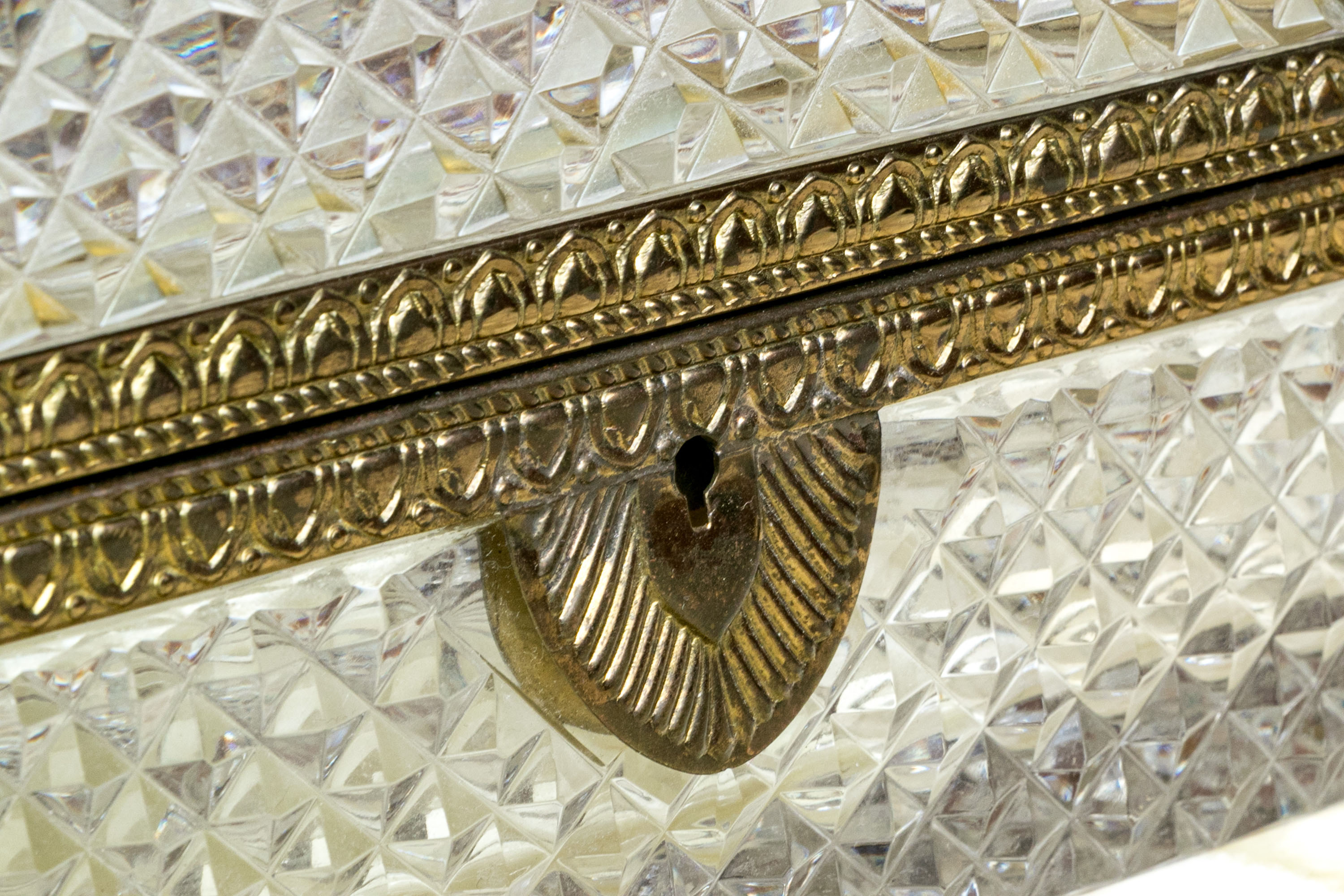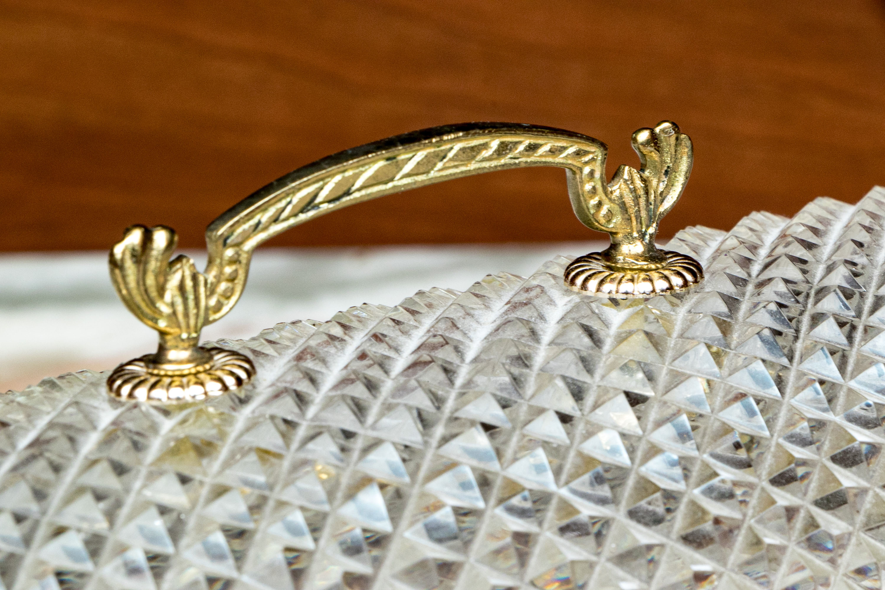 The cut crystal domed lidded box with art deco style gilt metal mounts along with handle atop the domed lid.