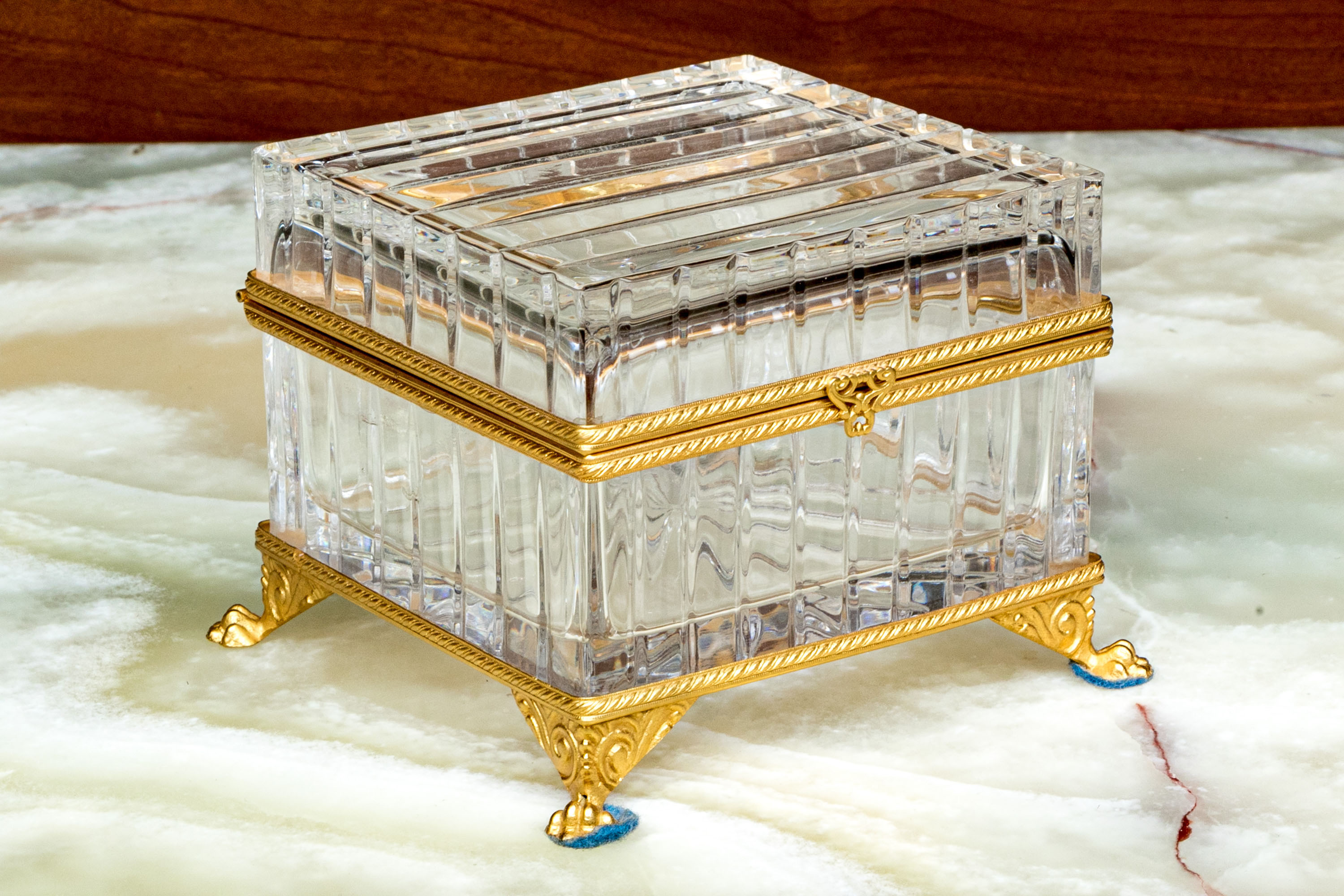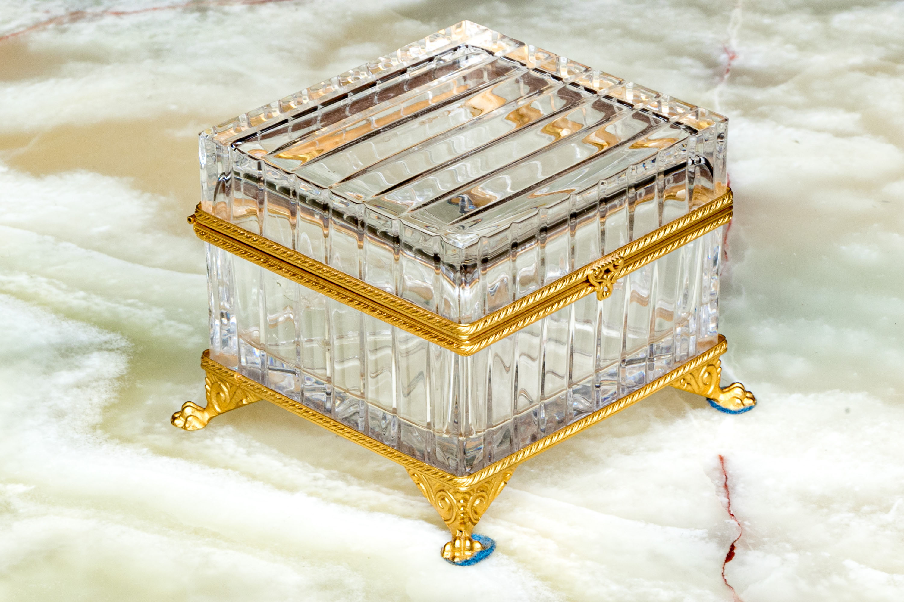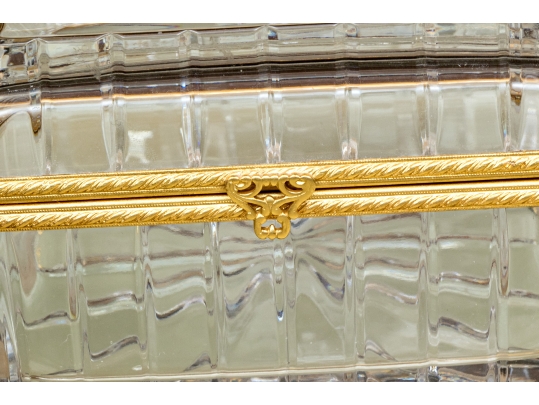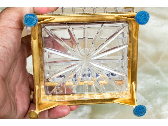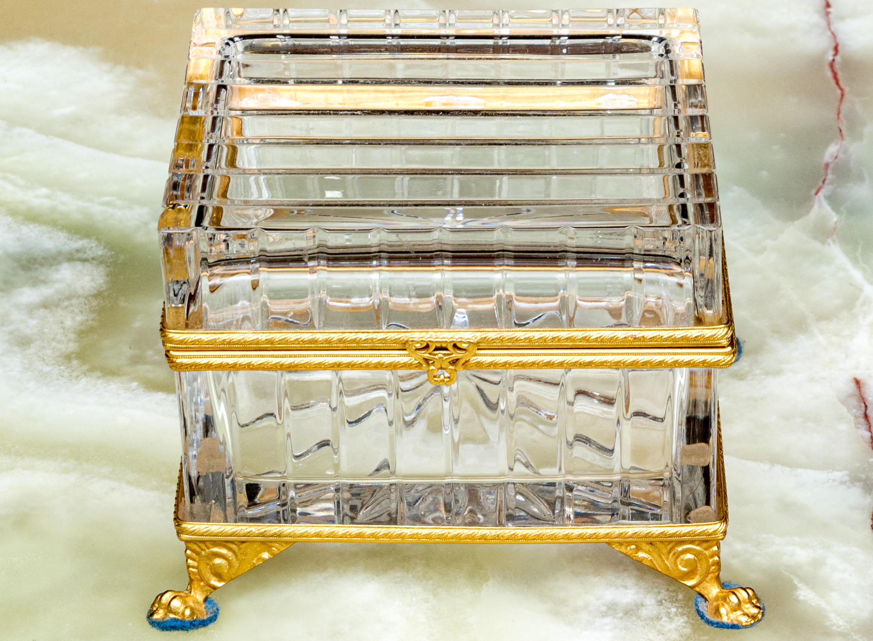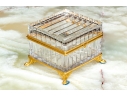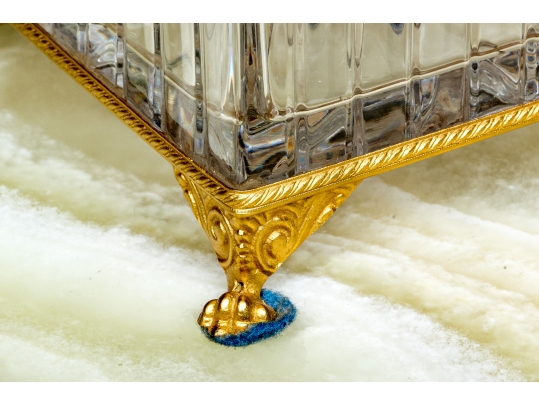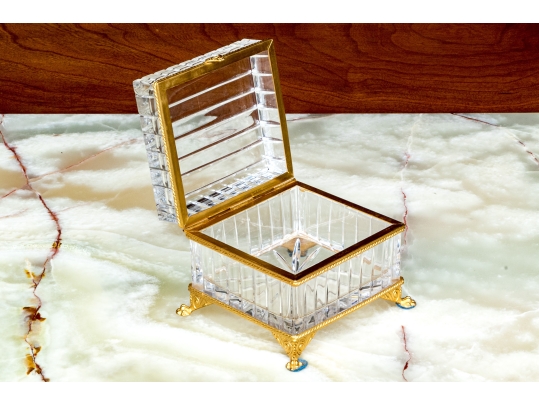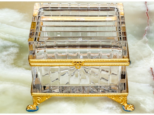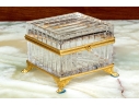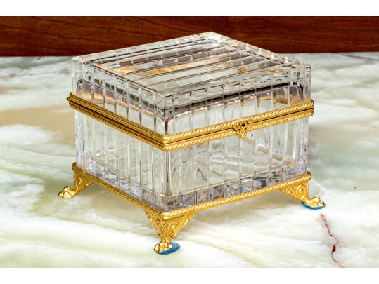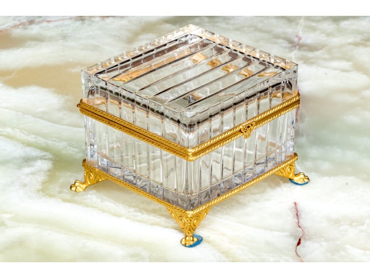 Square form with linear cut decorative motif. The crystal box has a hinged lid and is raised on four feet. The box is fantastically mounted with gilt metal mounts.