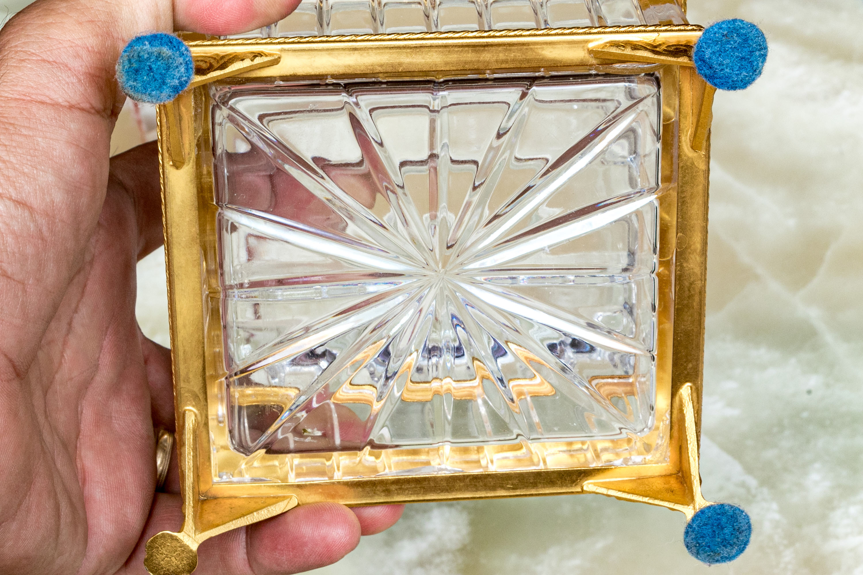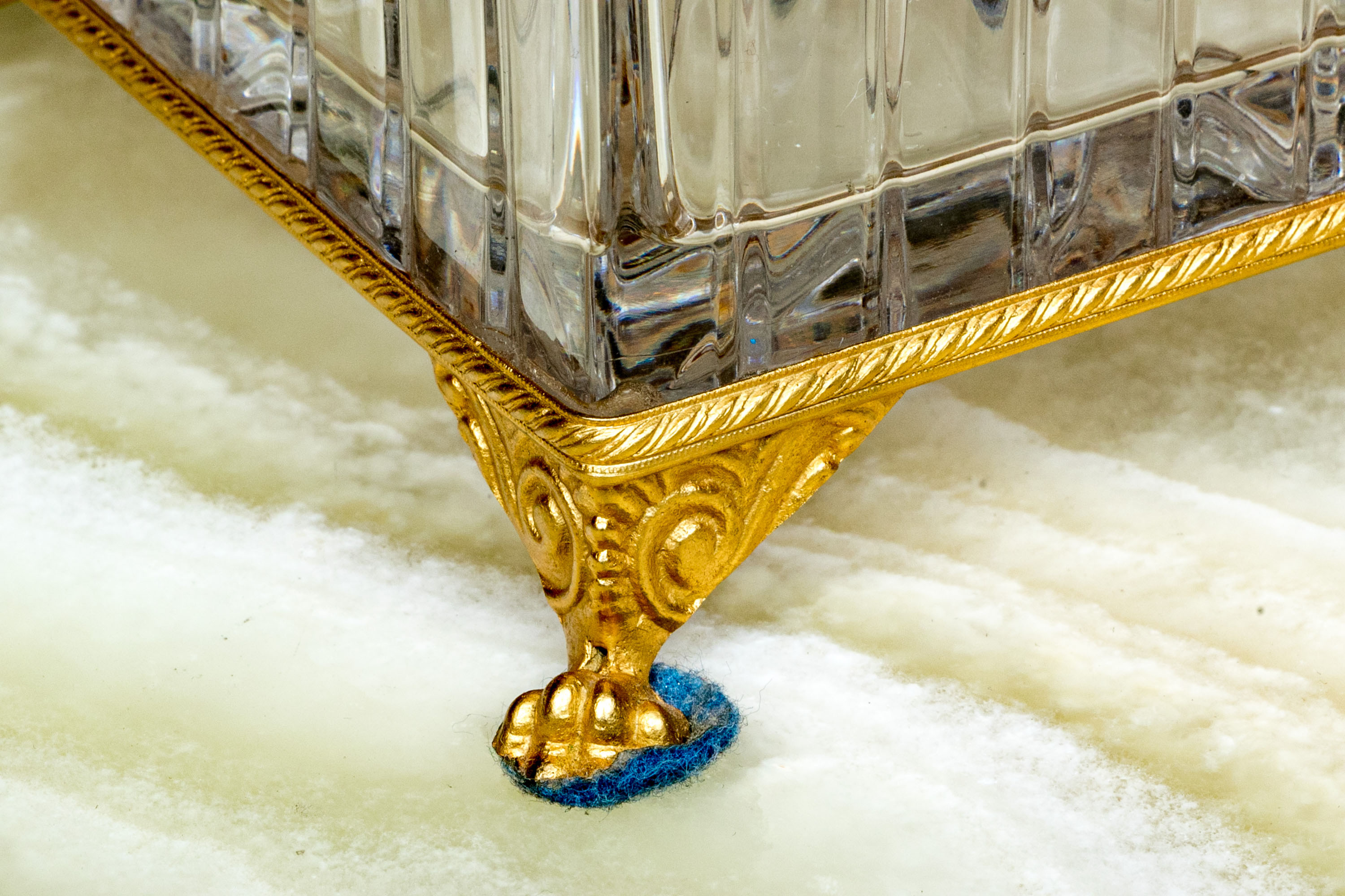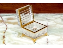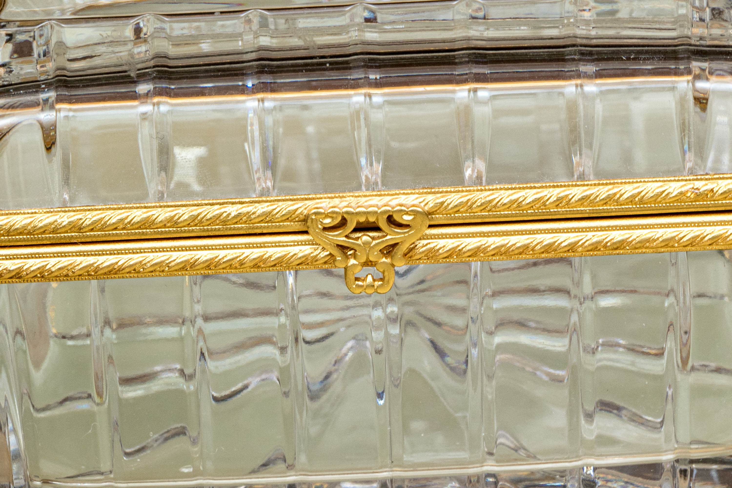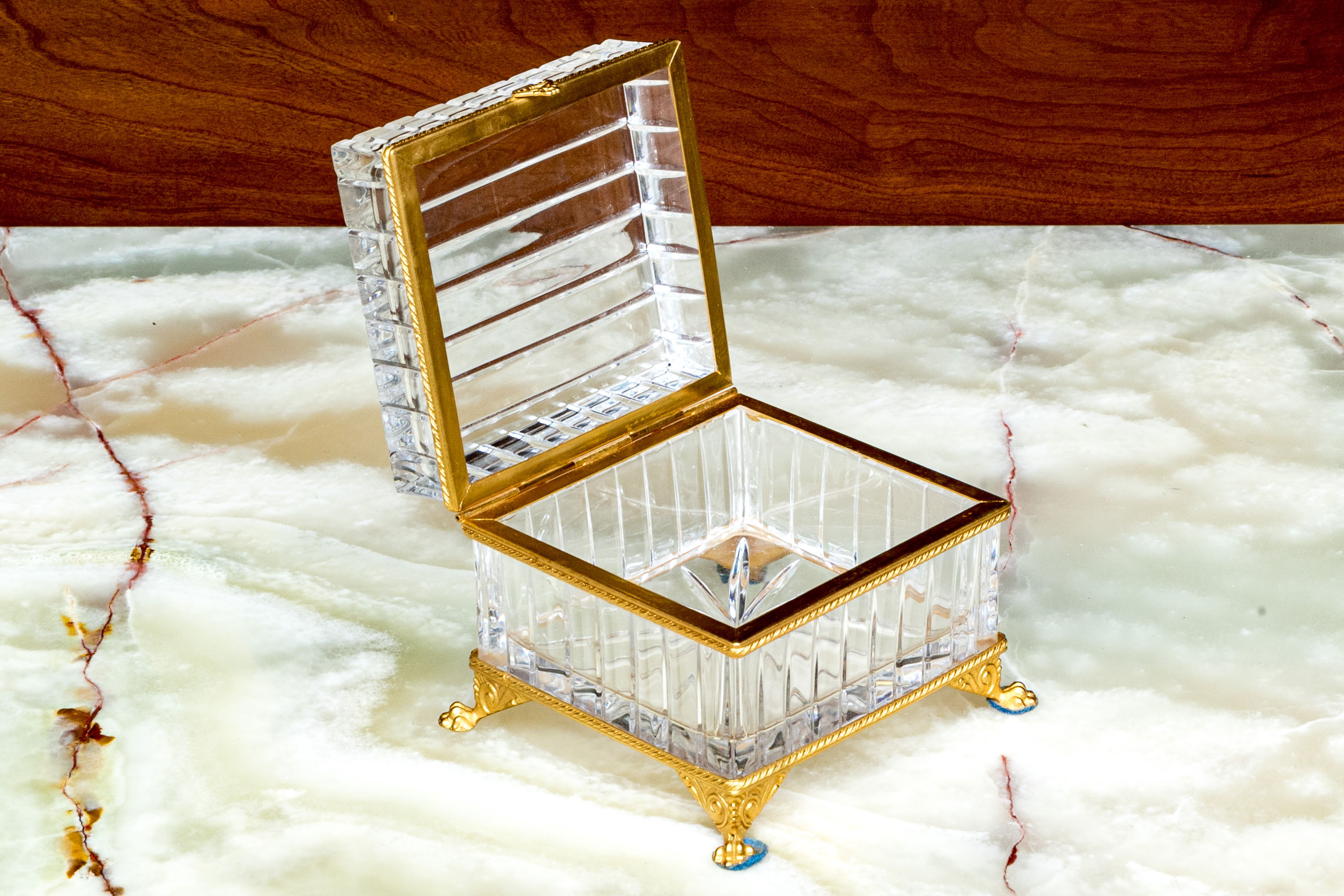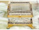 Square form with linear cut decorative motif. The crystal box has a hinged lid and is raised on four feet. The box is fantastically mounted with gilt metal mounts.