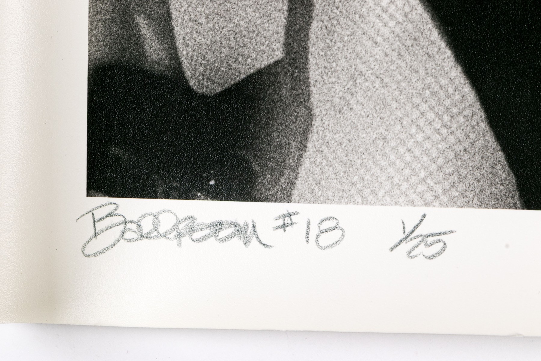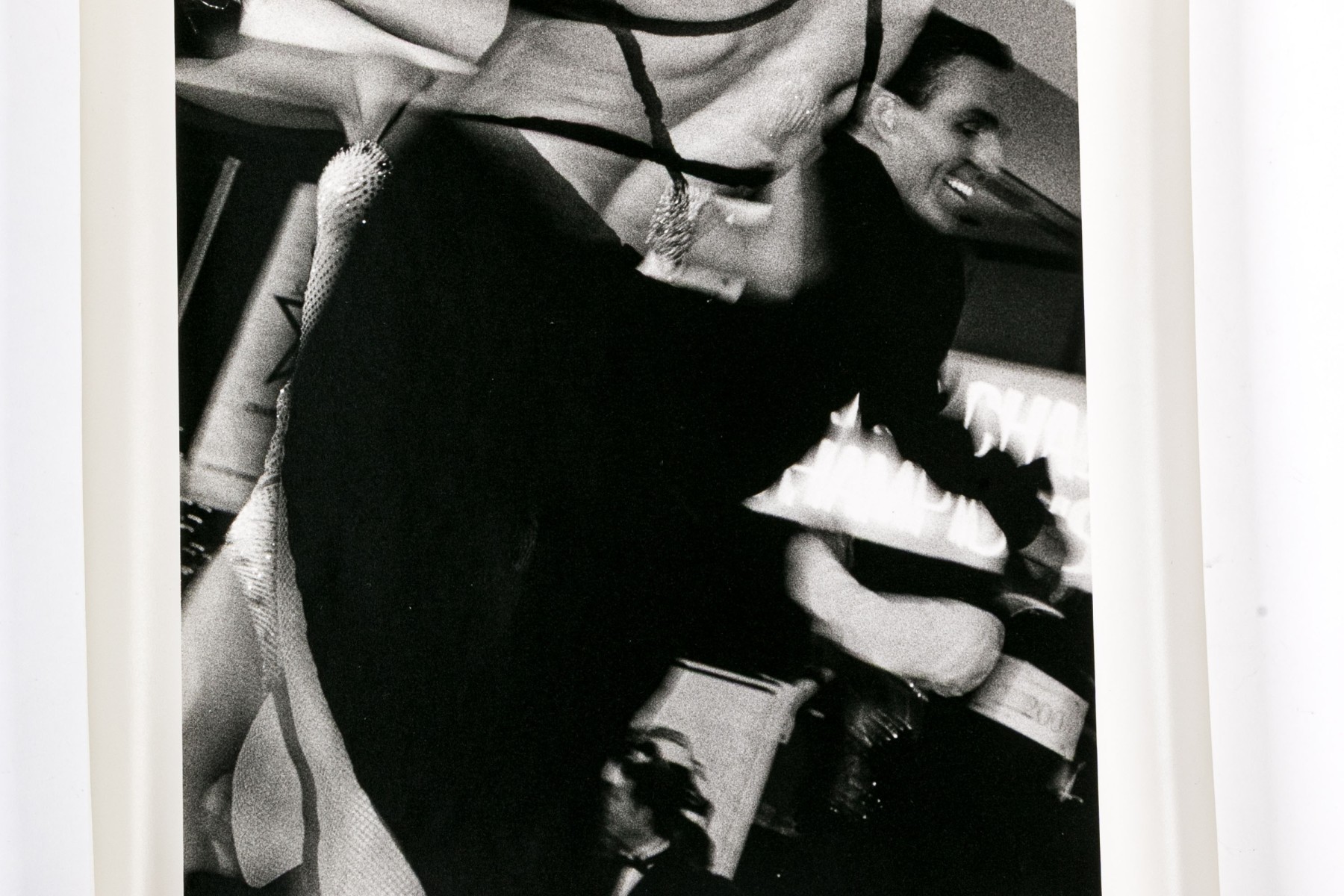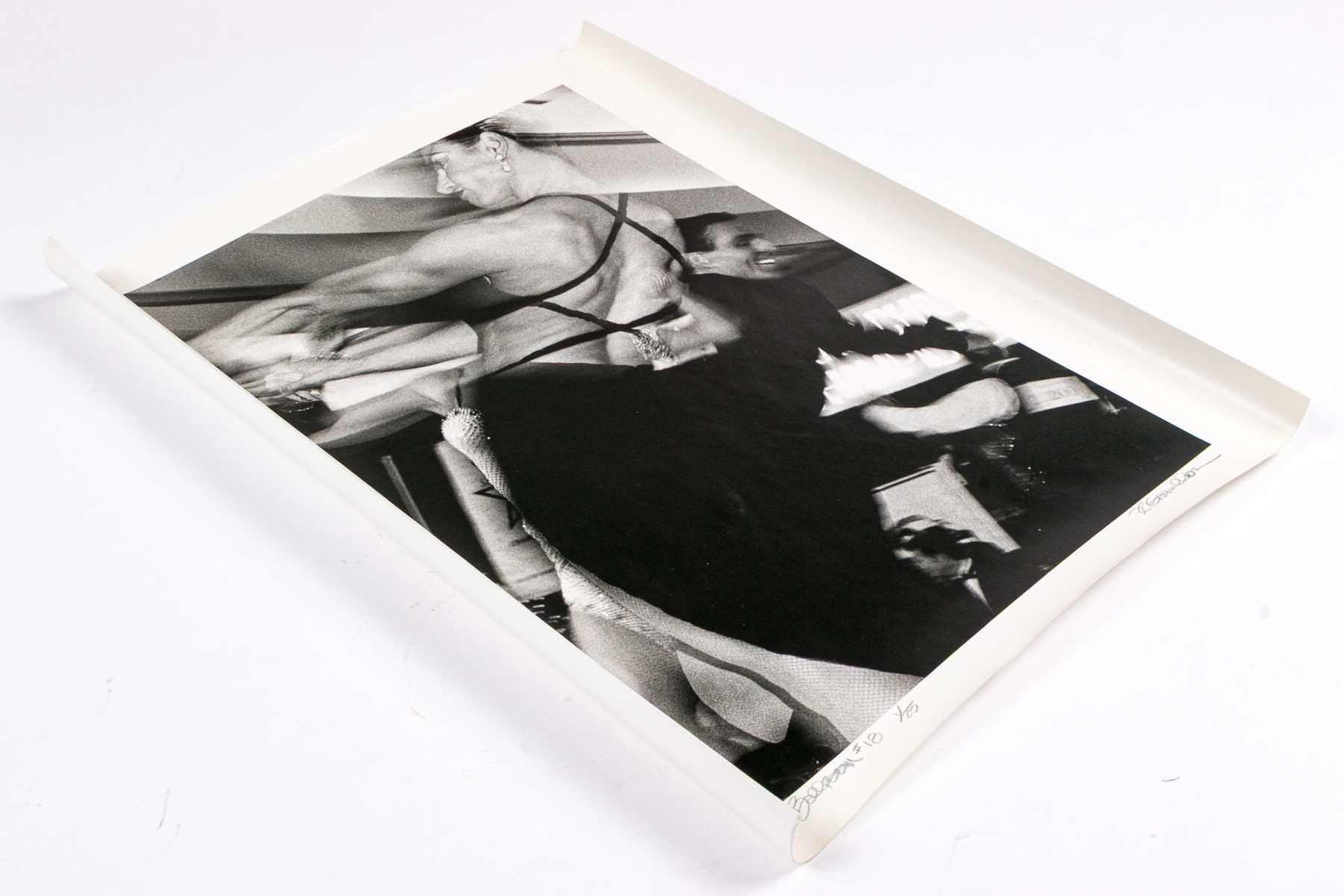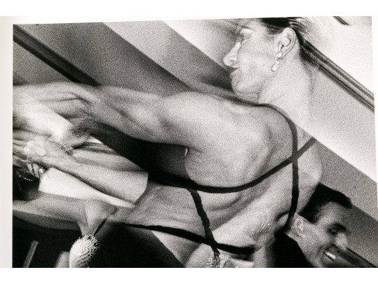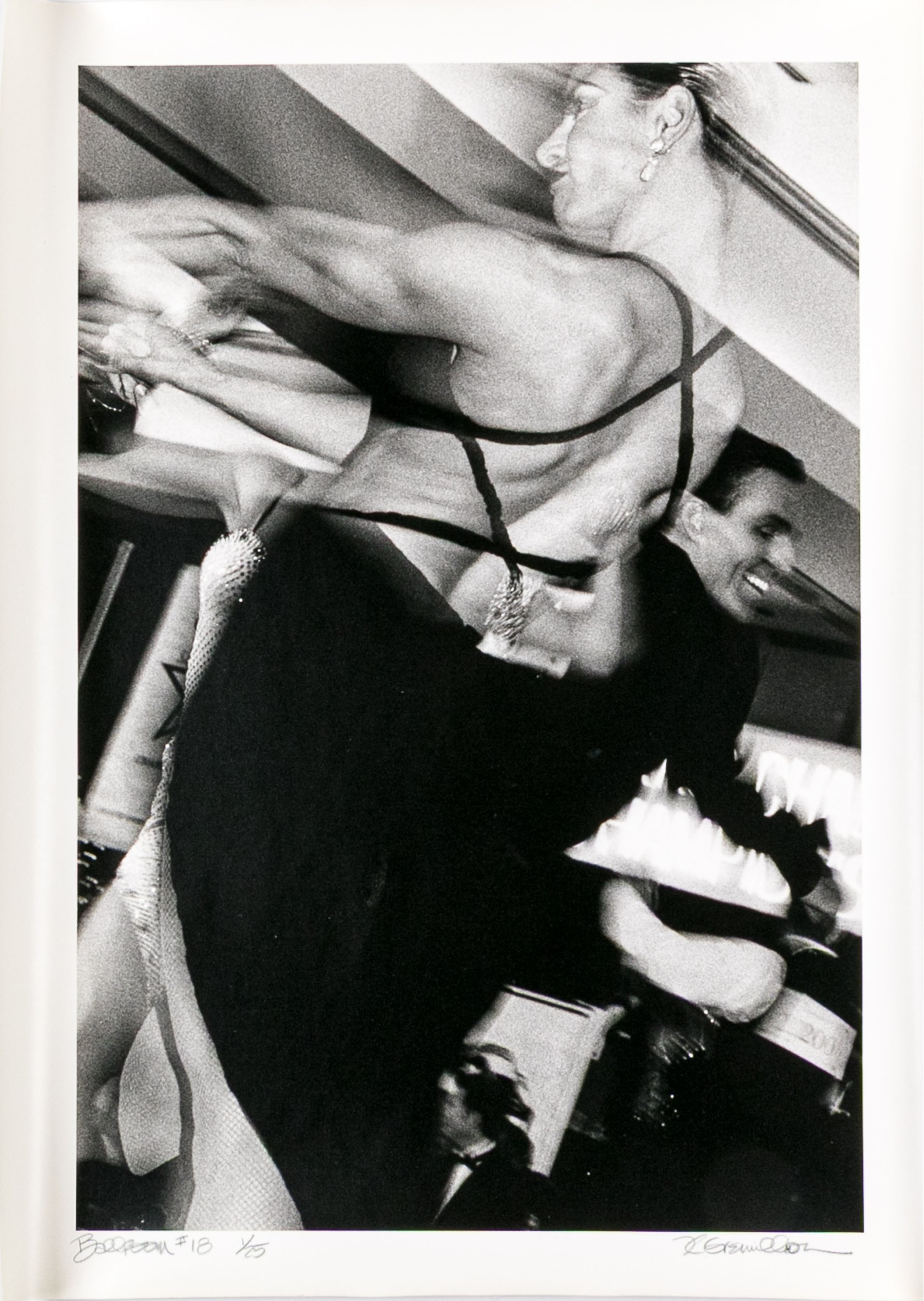 Kimberly Gremillion (America, B. 1955) "Ballroom #18" gelatin silver print depicting a woman in a black dress dancing in an interior with men in black suits. Blurred details add a great sense of motion and energy. Pencil signed lower right, titled and numbered 1/25 lower left. Unframed.