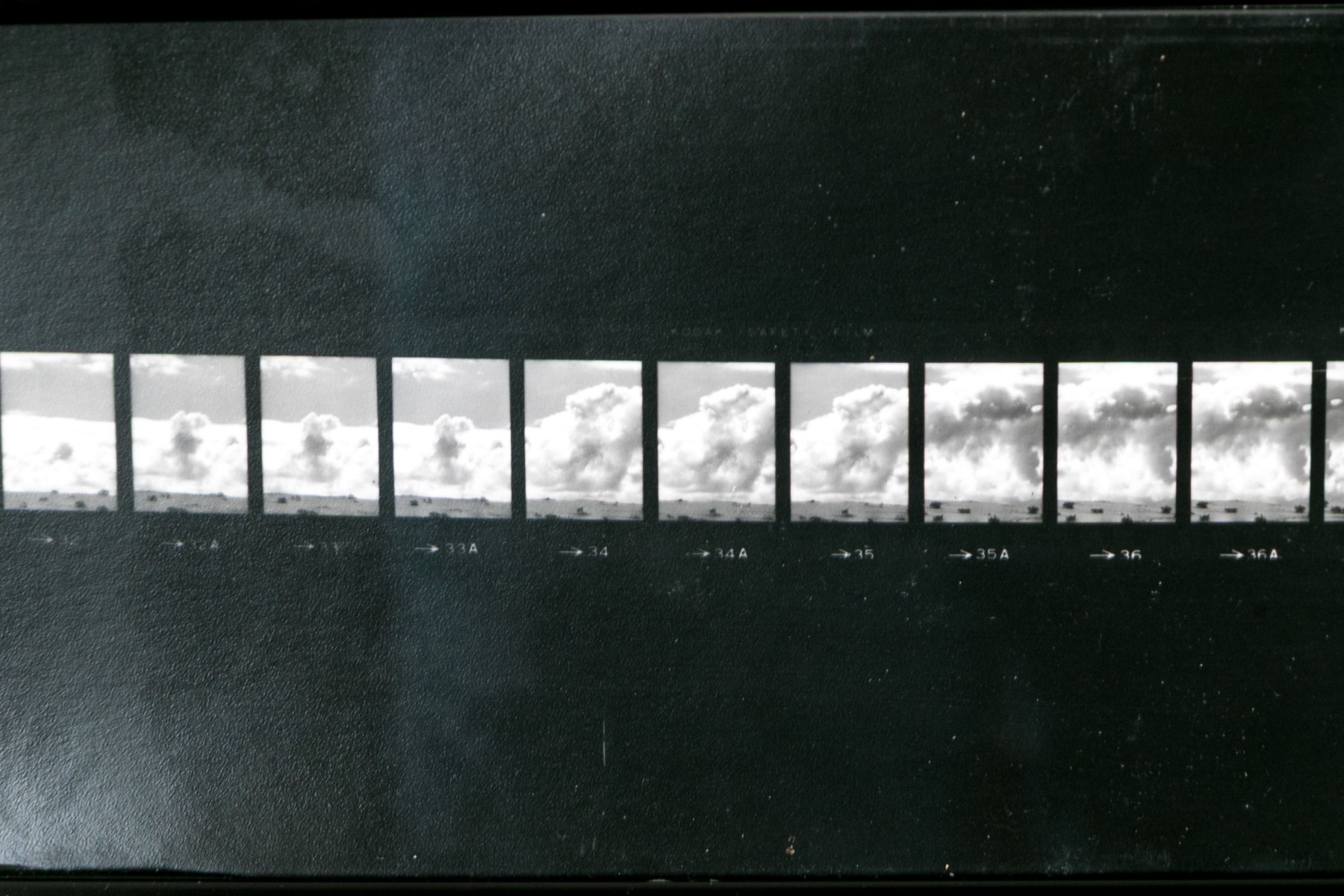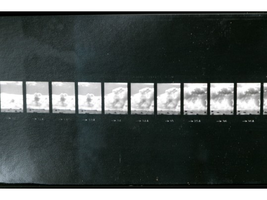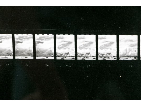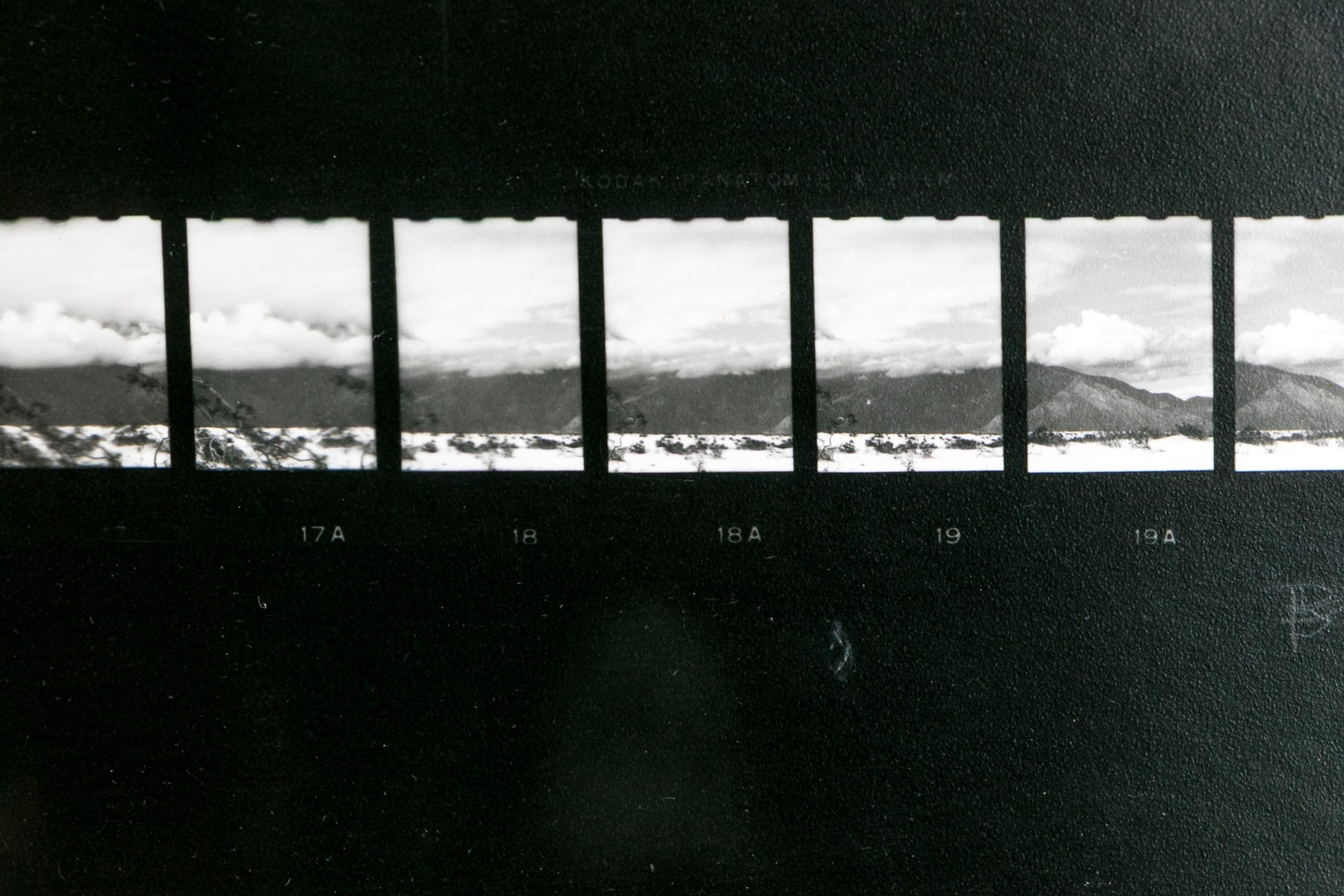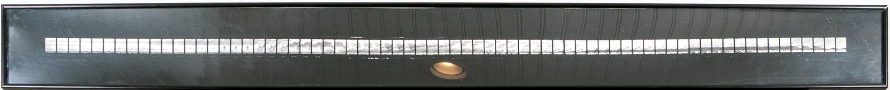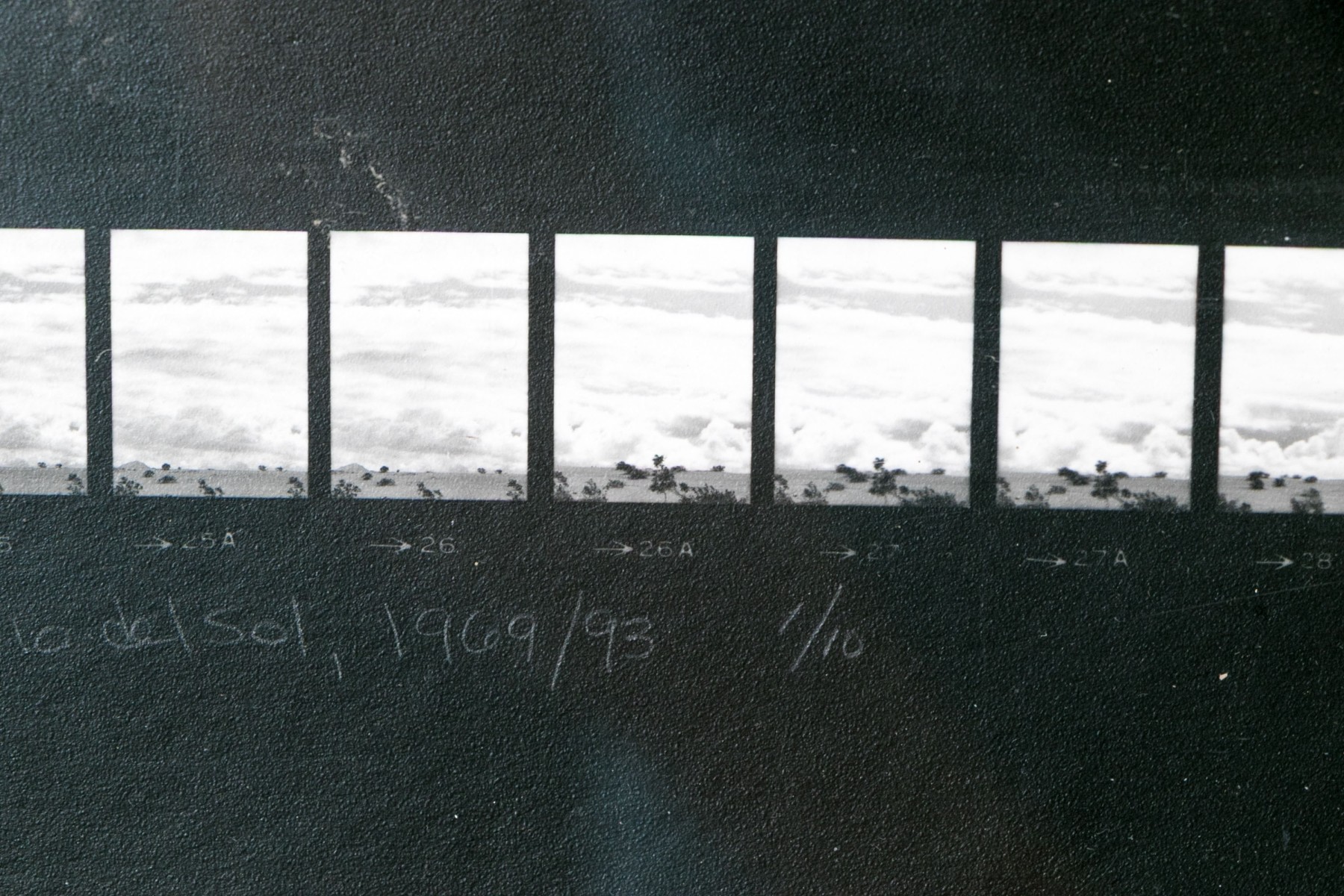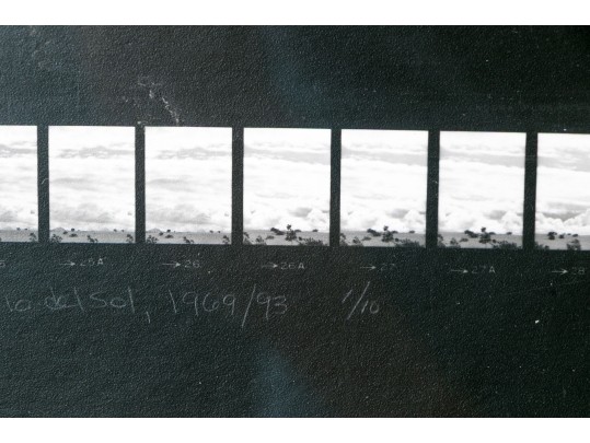 An eye-catching Kodak Panatomic film strip spanning four feet and nine inches horizontally, depicting a landscape with impressive billowing clouds. With a handwritten label partially reading "...la del sol, 1969/93 1/10" lower trim. Displayed in a black frame.