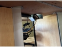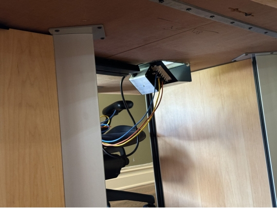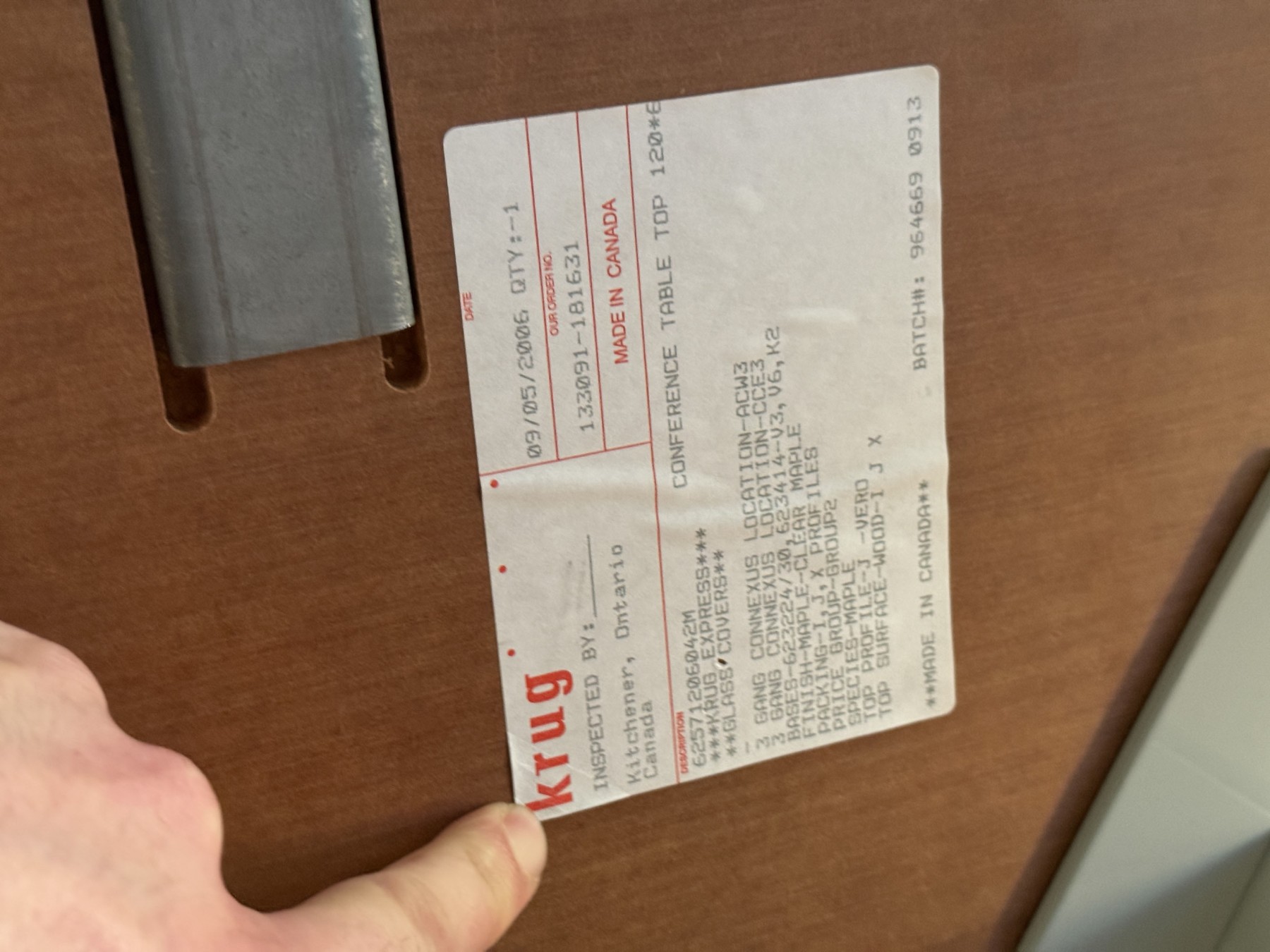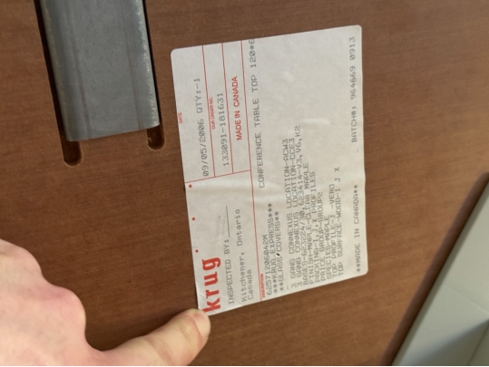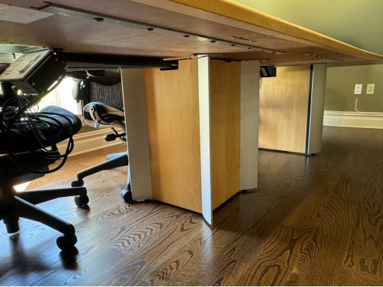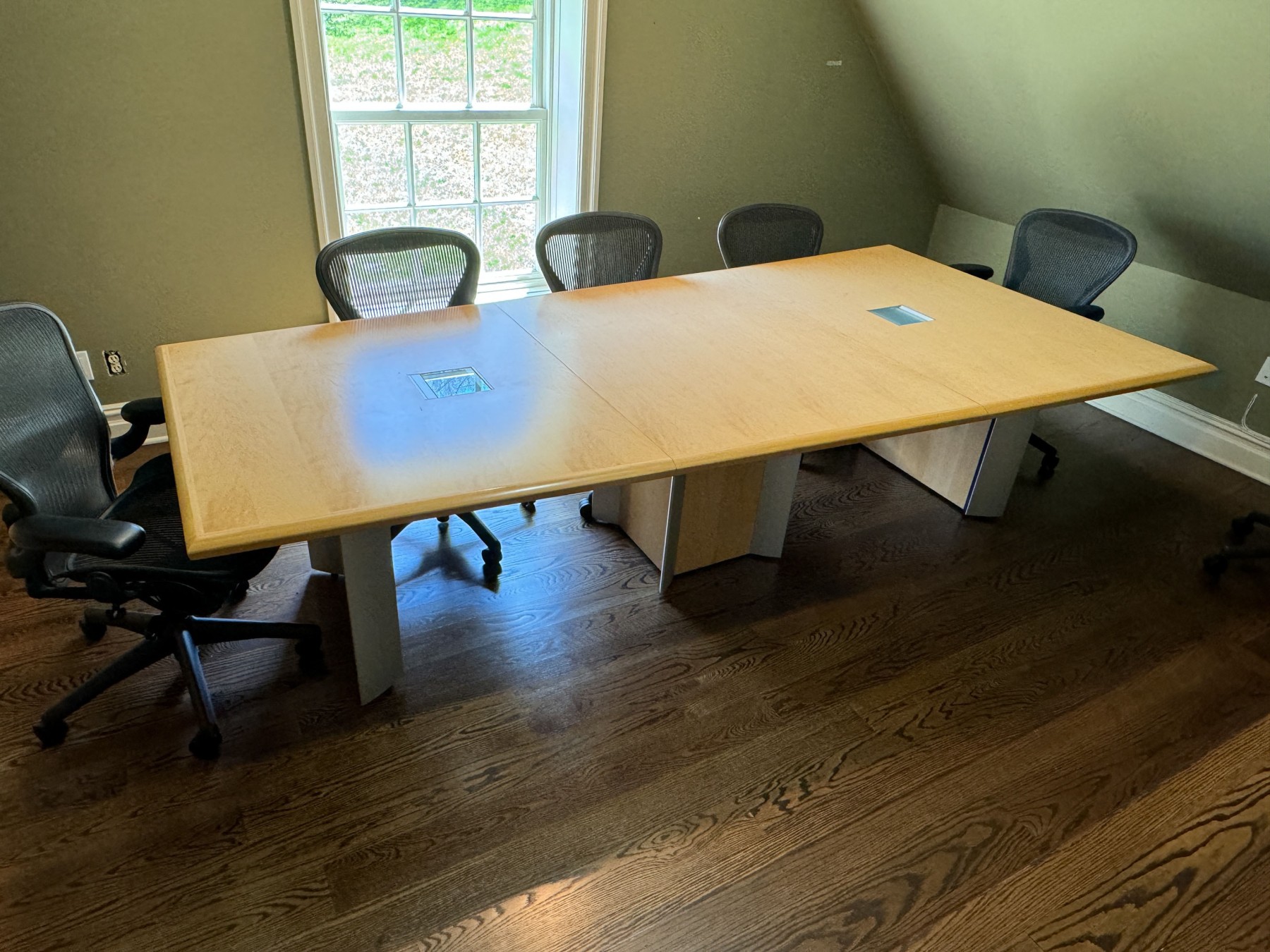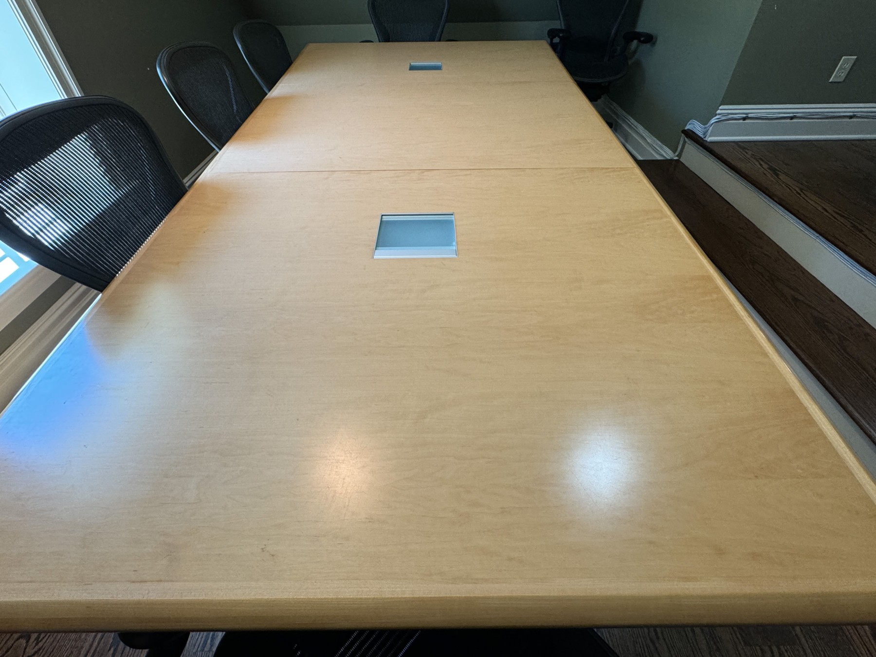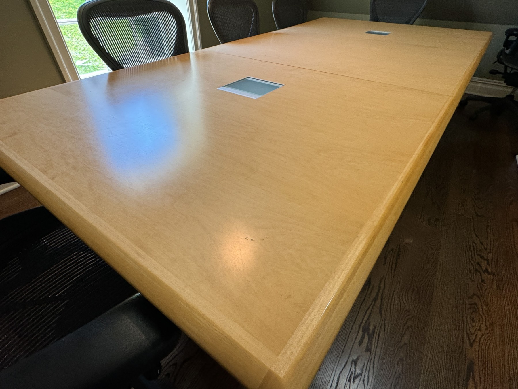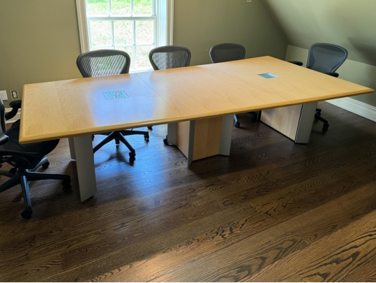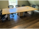 A uniquely formed conference table that is ready for a new office! Complete with areas for power supplies.