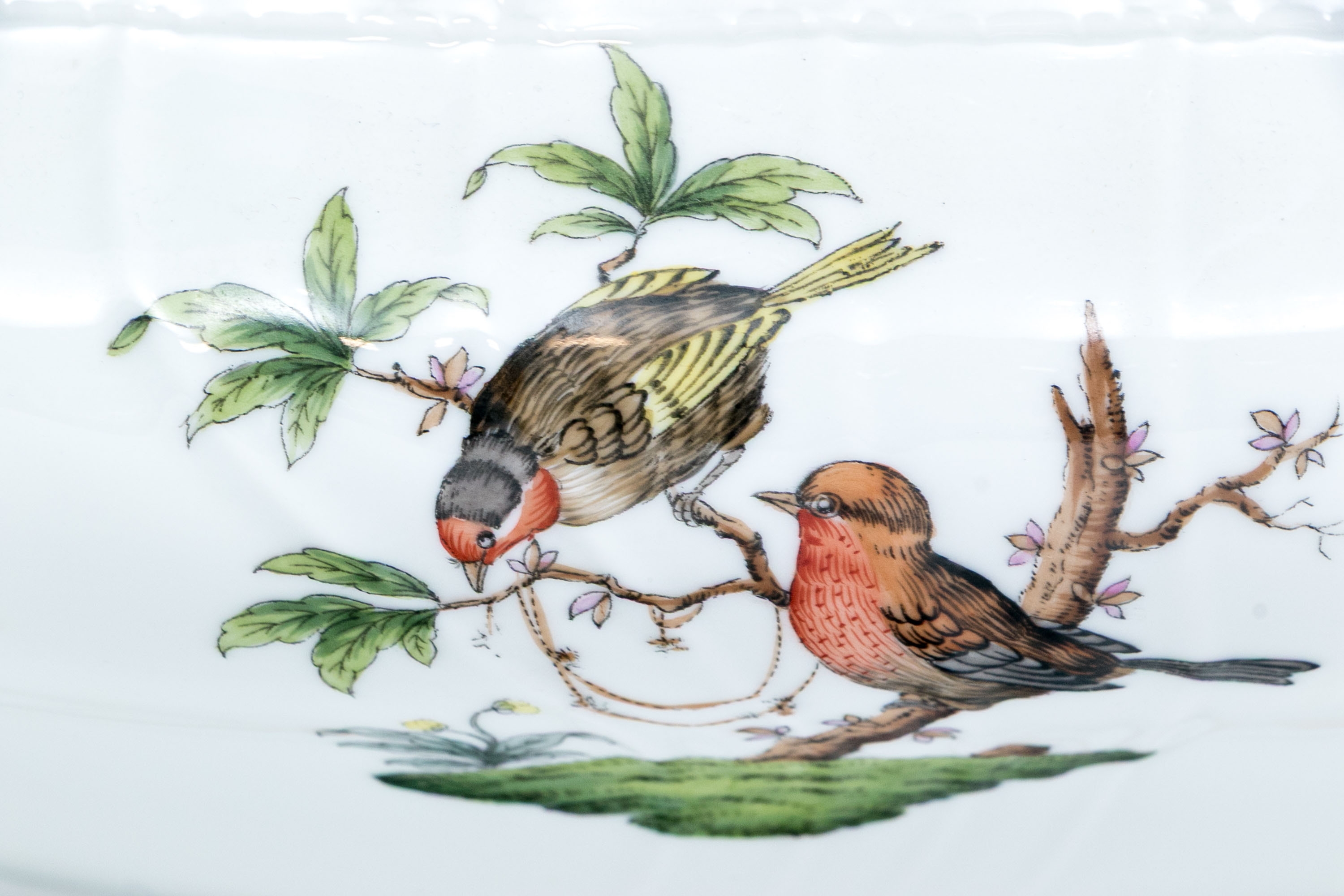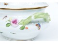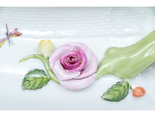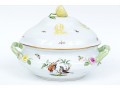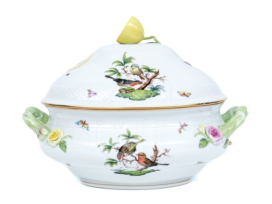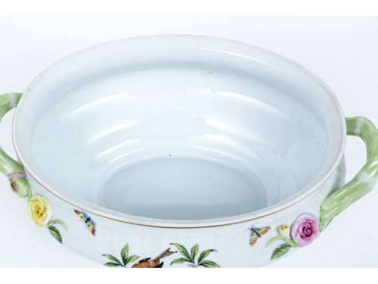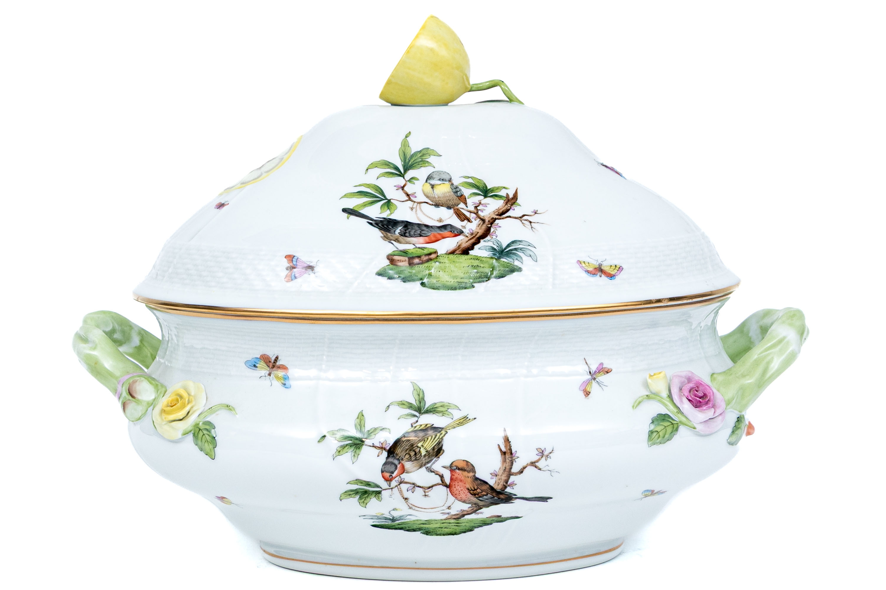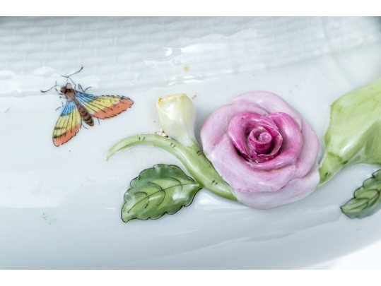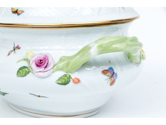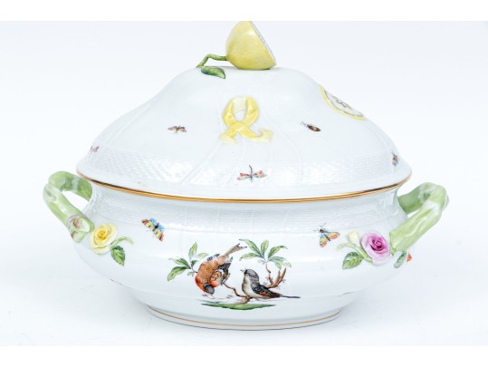 Herend porcelain tureen features a gently lobed body and domed lid, hand-painted with the Rothschild Bird (RO) motif—pairs of vividly detailed birds perched upon flowering branches with necklace, encircled by playful butterflies and insects. The painting is done in rich, naturalistic tones of rust, green, and yellow, accented with delicate shading and fine gilt borders. The tureen’s applied handles are modeled as curling green branches entwined with hand-sculpted pink and yellow roses, while the lemon finial lid adds a playful, lifelike touch. The interior is smooth and glossy, suitable for serving or display. The form rests elegantly balanced on its footed base, the design enhanced by Herend’s signature basketweave relief pattern along the upper body. Underside bears the Herend blue shield mark reading HEREND HUNGARY HANDPAINTED, along with the impressed and painted pattern and form numbers 1002/RO