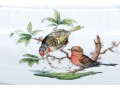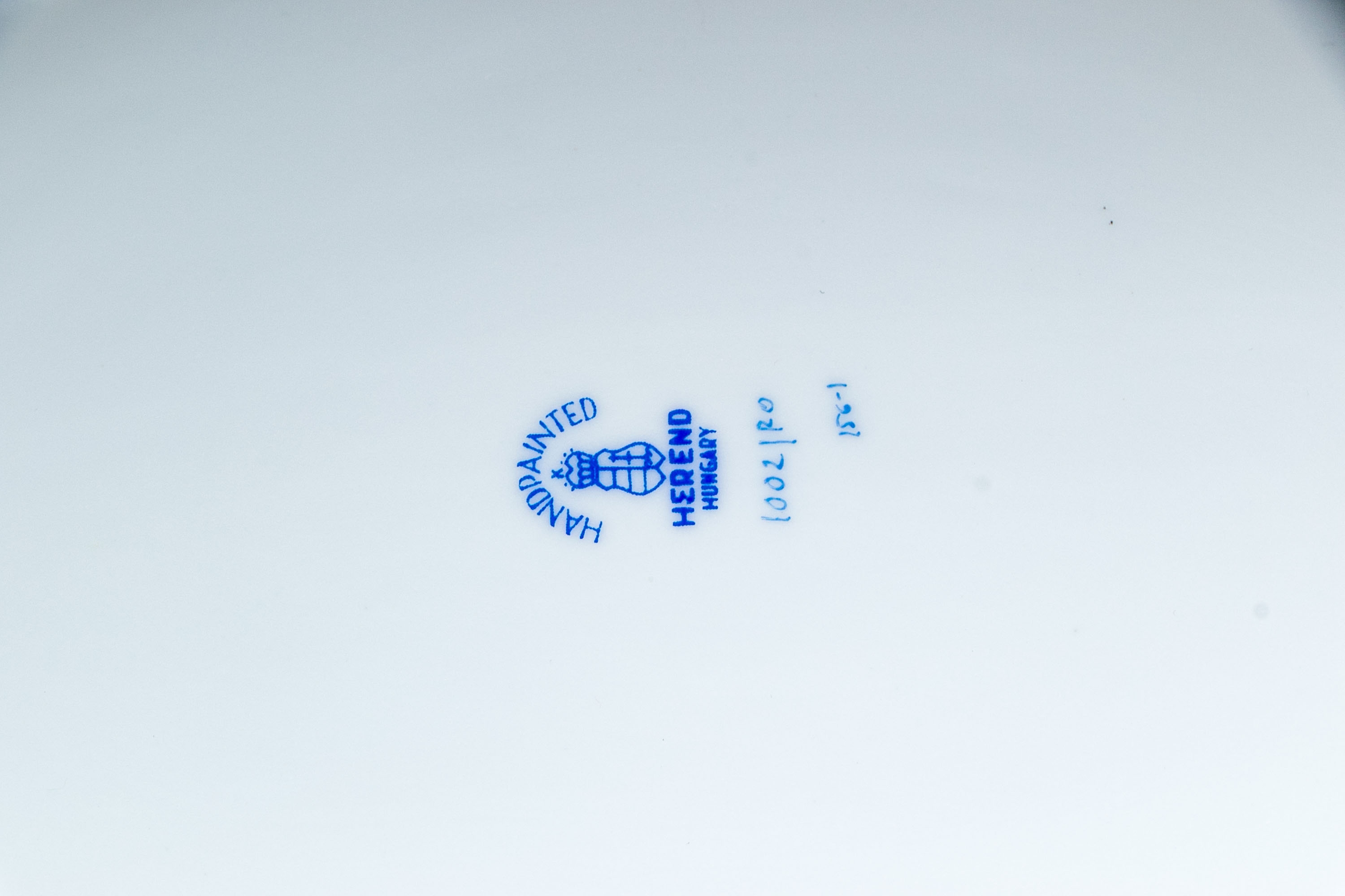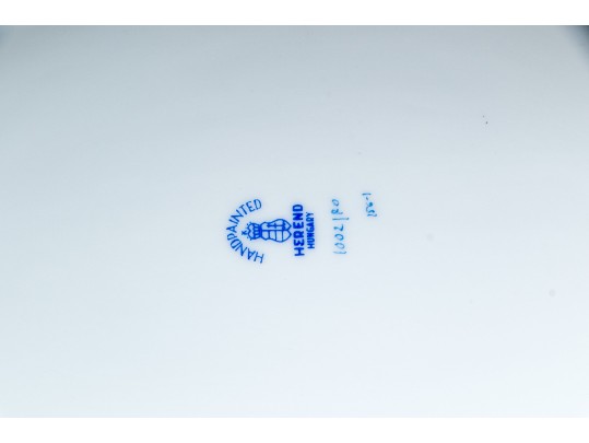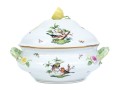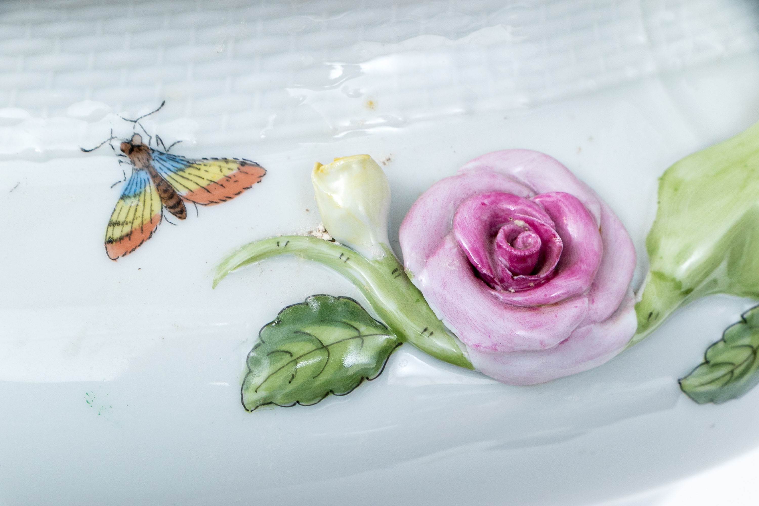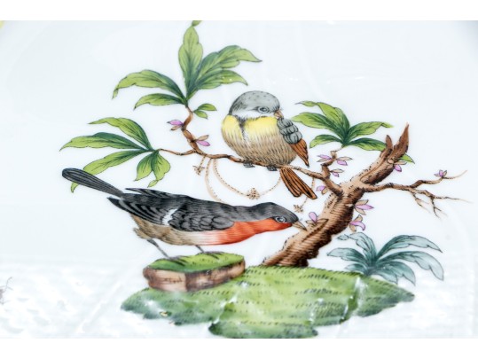 Herend porcelain tureen features a gently lobed body and domed lid, hand-painted with the Rothschild Bird (RO) motif—pairs of vividly detailed birds perched upon flowering branches with necklace, encircled by playful butterflies and insects. The painting is done in rich, naturalistic tones of rust, green, and yellow, accented with delicate shading and fine gilt borders. The tureen’s applied handles are modeled as curling green branches entwined with hand-sculpted pink and yellow roses, while the lemon finial lid adds a playful, lifelike touch. The interior is smooth and glossy, suitable for serving or display. The form rests elegantly balanced on its footed base, the design enhanced by Herend’s signature basketweave relief pattern along the upper body. Underside bears the Herend blue shield mark reading HEREND HUNGARY HANDPAINTED, along with the impressed and painted pattern and form numbers 1002/RO