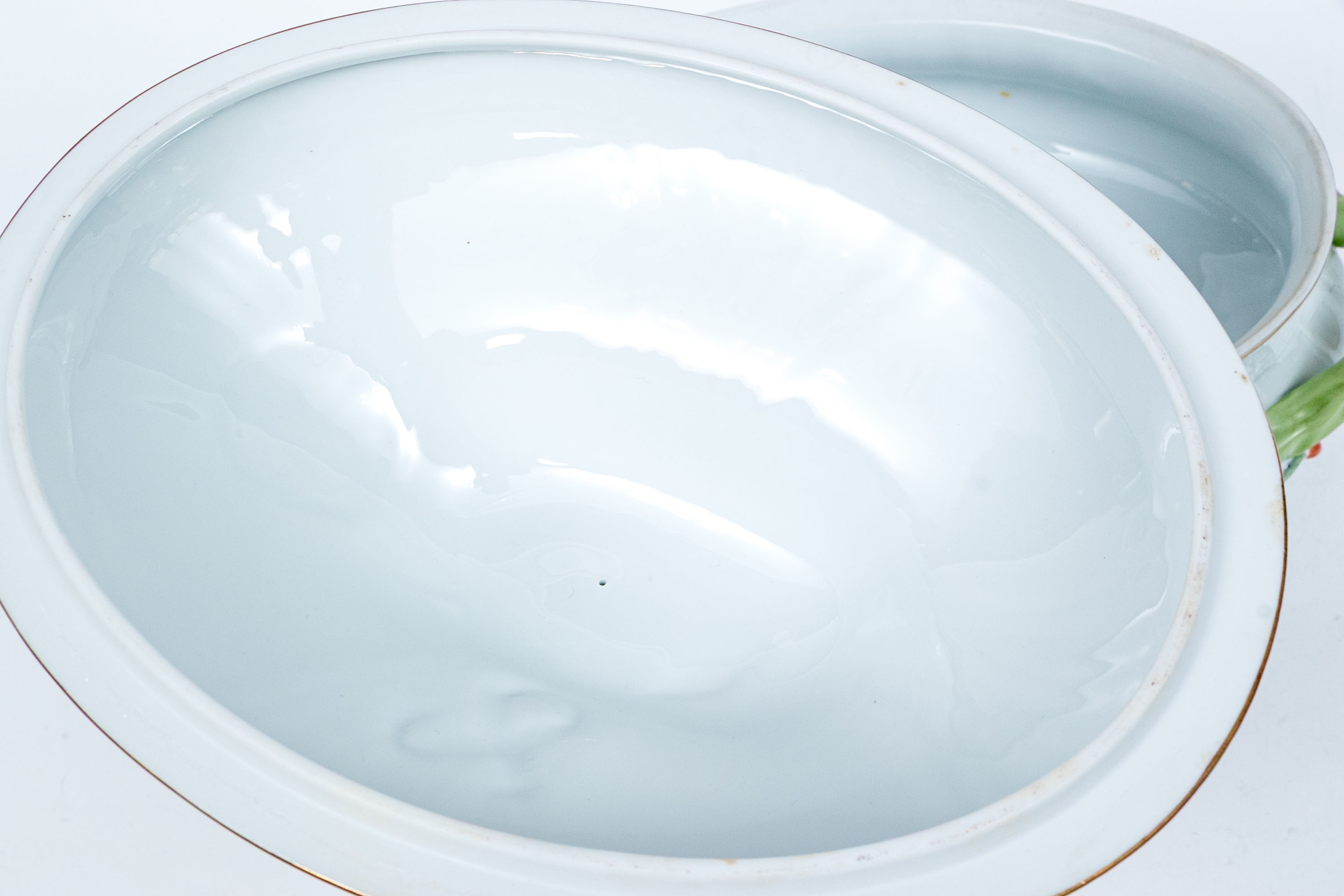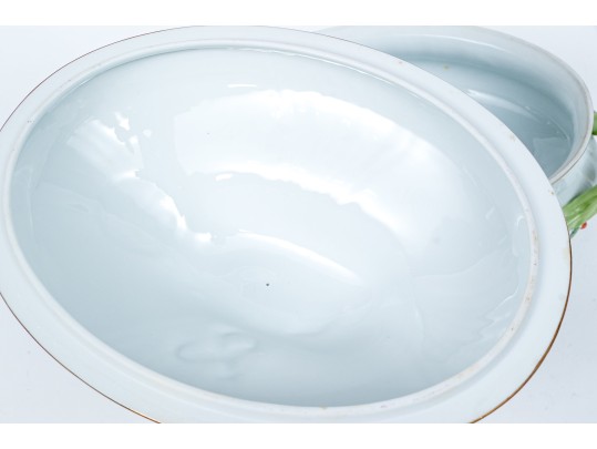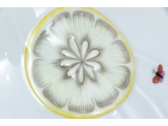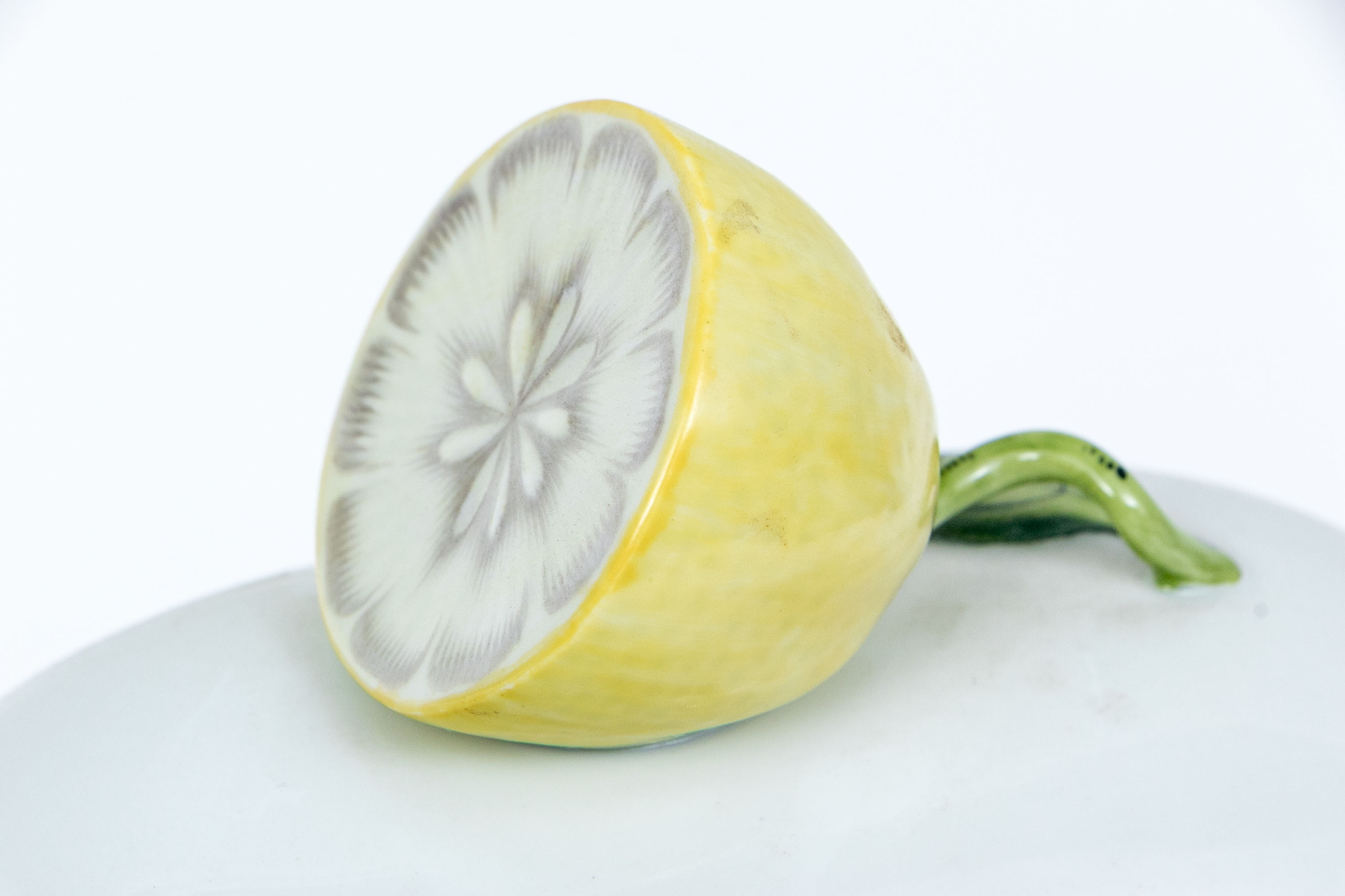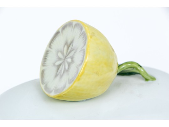 Condition: Excellent overall condition. The porcelain is clean and free of cracks, chips, or restorations. The paintwork is crisp and vibrant, with no fading or discoloration. The applied flowers and lemon finial are fully intact.. The gilded edging is bright and continuous, with only minimal, expected wear from handling. Could use a gently cleaning - a few spots.