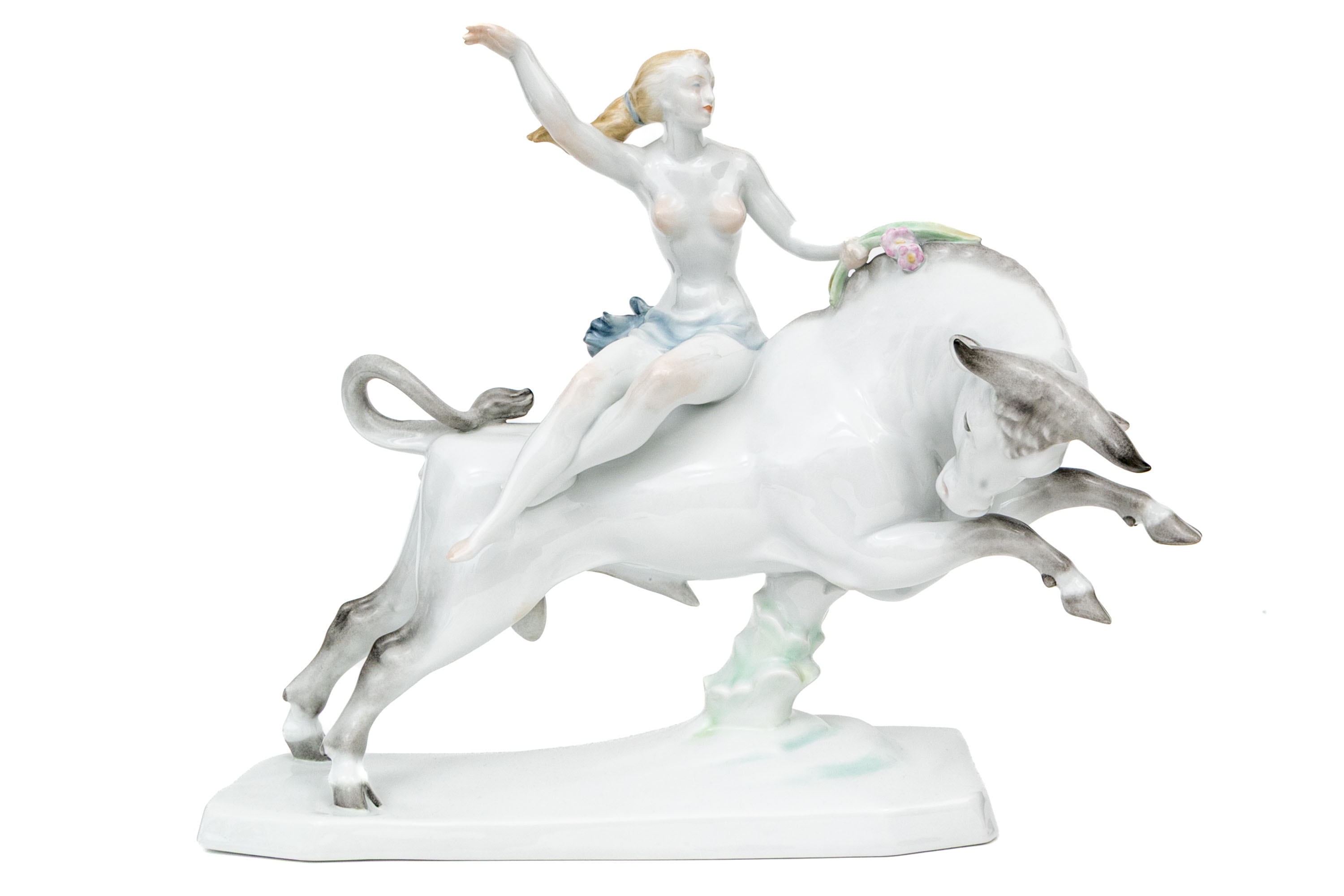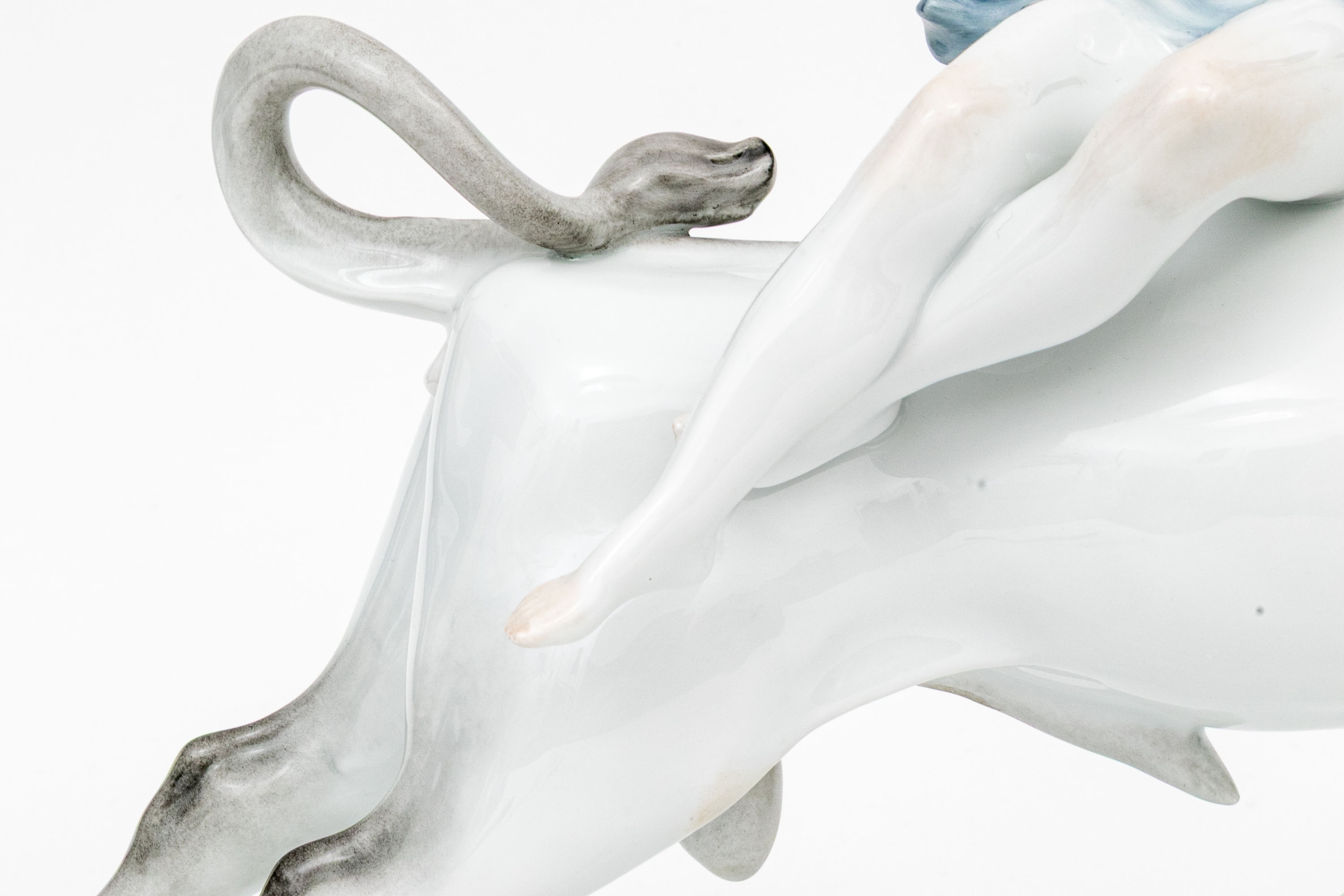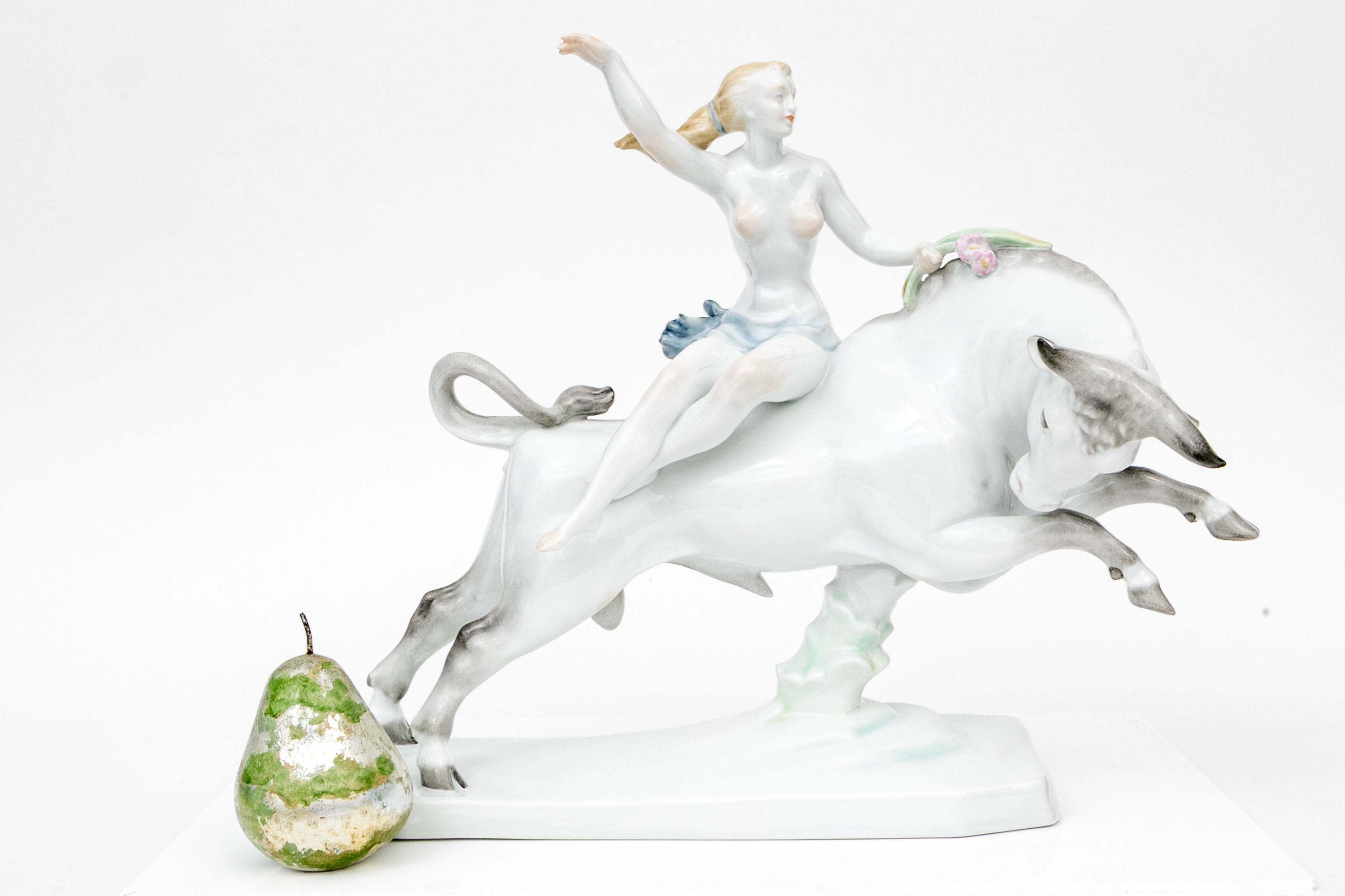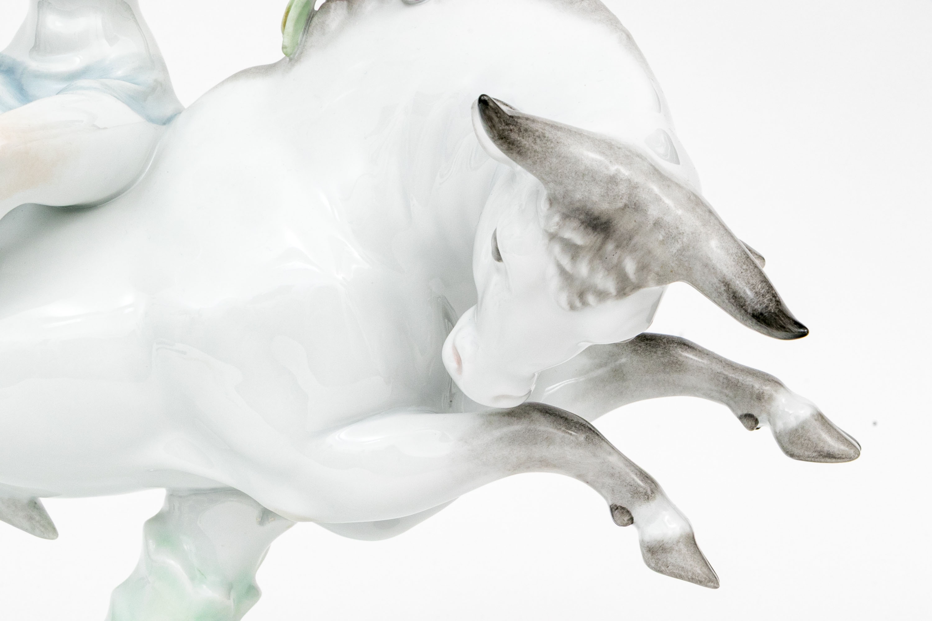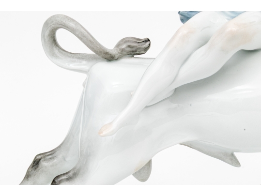 An exquisite Herend porcelain figure group depicting the Phoenician Princess Europa and the Bull, inspired by the classical myth from Ovid’s Metamorphoses. Finely modeled and hand-painted in soft pearlescent white with subtle pastel accents, the nude Europa is shown gracefully seated on the back of Zeus in bull form, holding a garland of flowers she collected at the seashore while her flowing hair and poised gesture capture a sense of motion and elegance. This is part of the Herend Nudes Collection. Based upon the classical Greek myth.