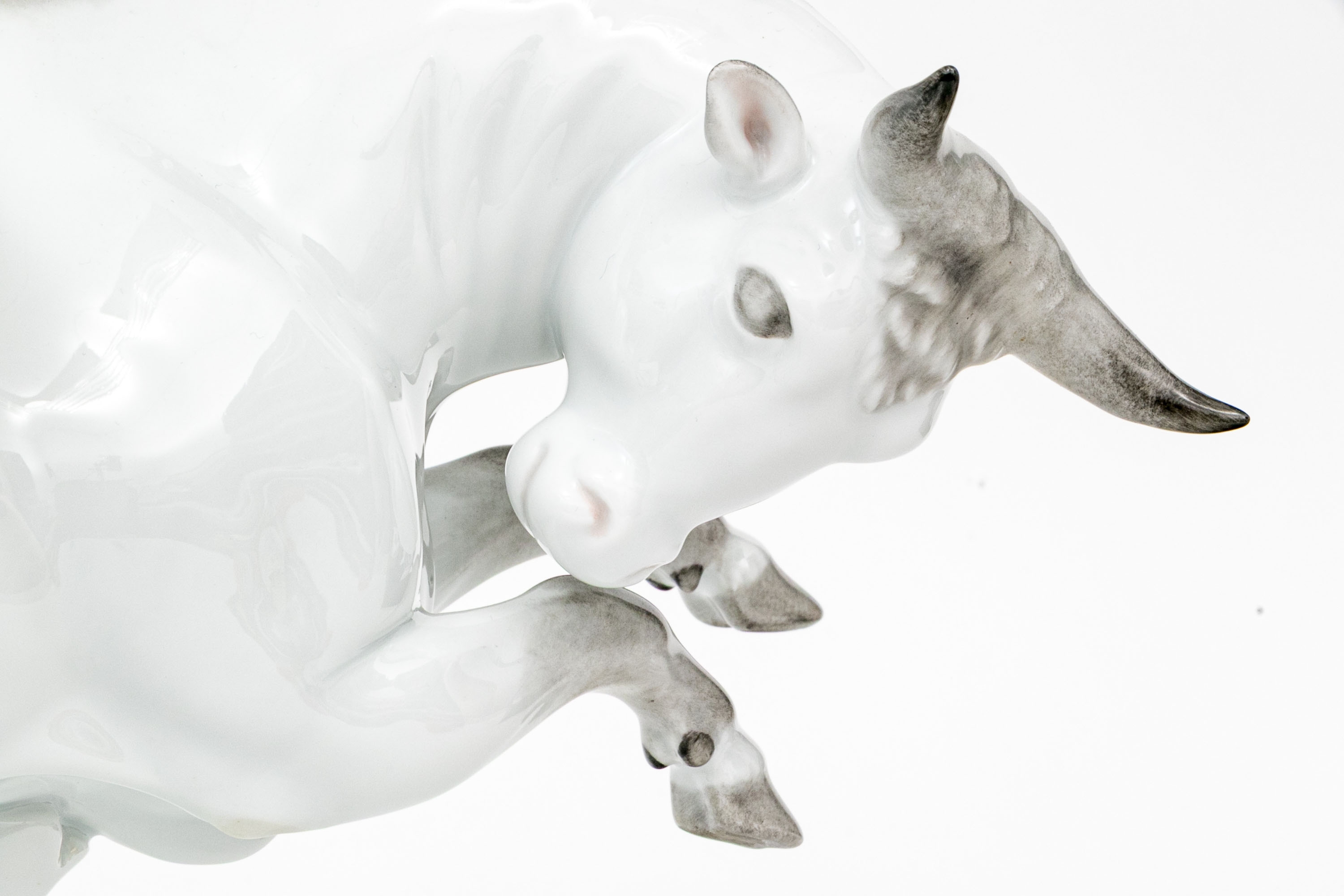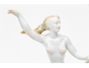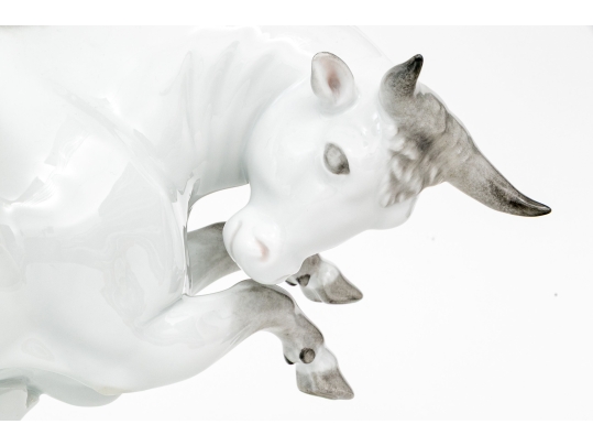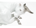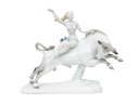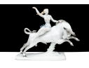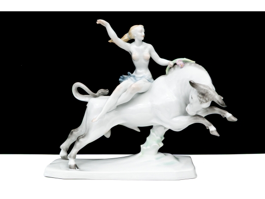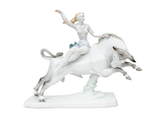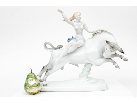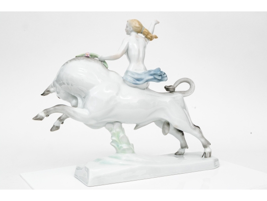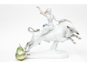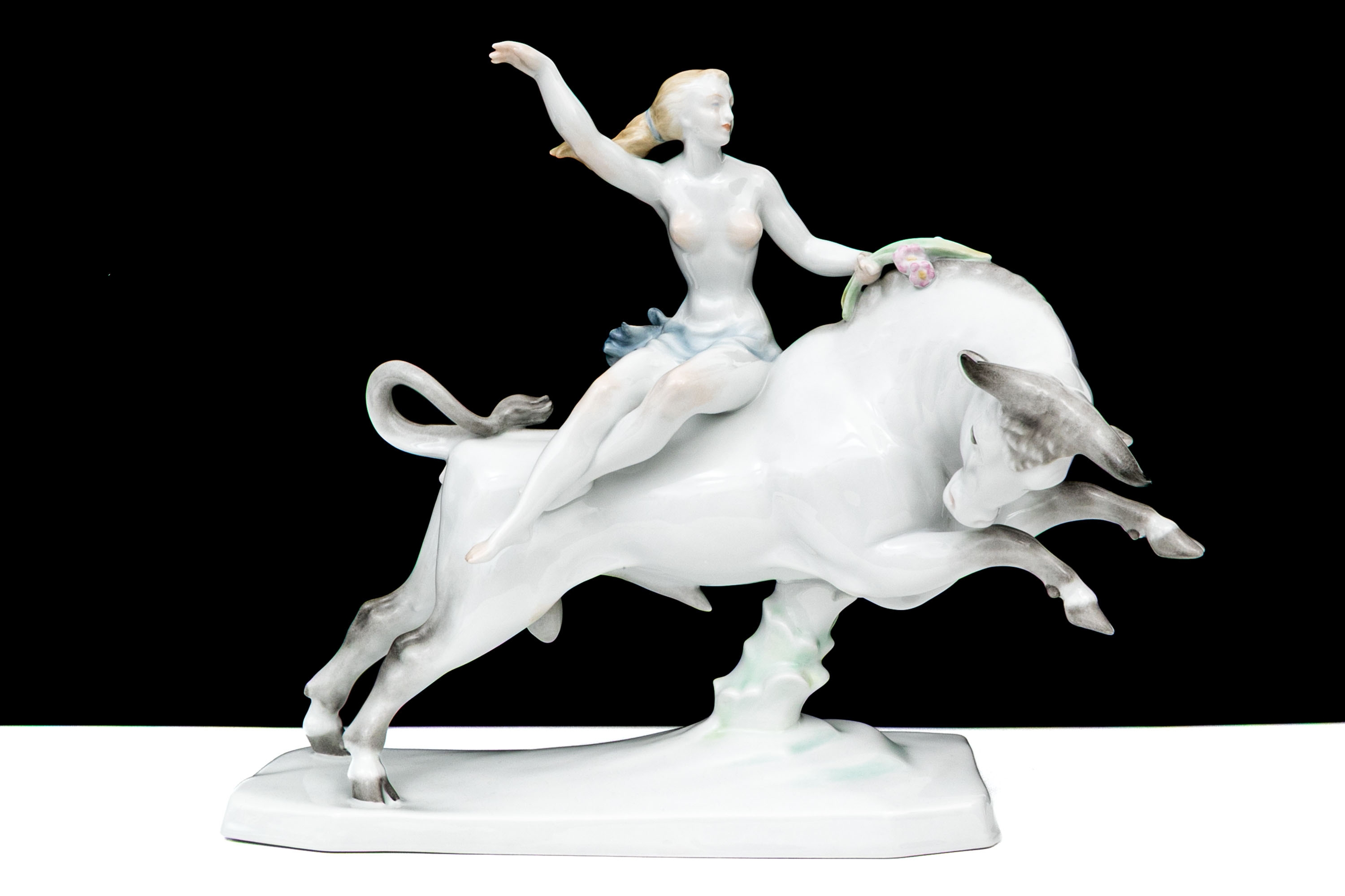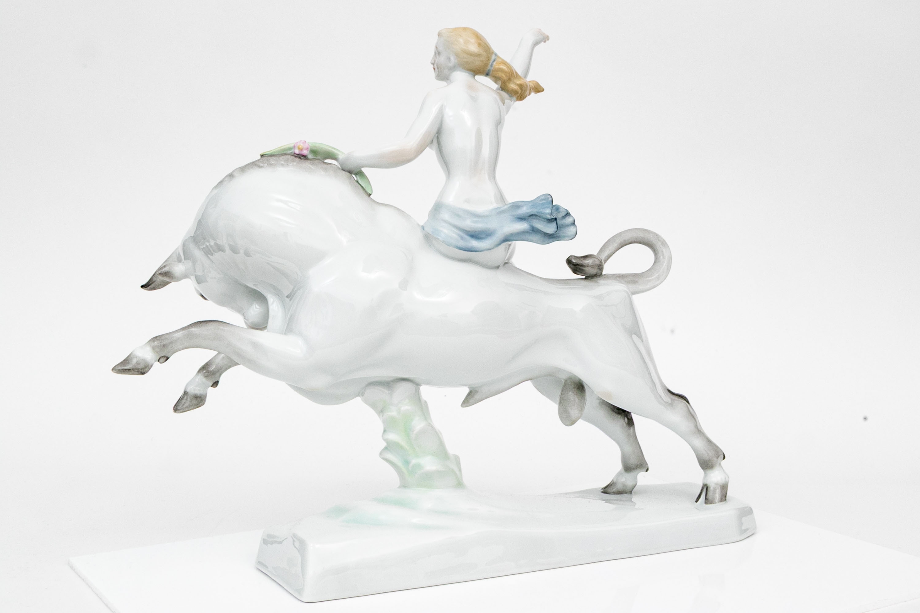 An exquisite Herend porcelain figure group depicting the Phoenician Princess Europa and the Bull, inspired by the classical myth from Ovid’s Metamorphoses. Finely modeled and hand-painted in soft pearlescent white with subtle pastel accents, the nude Europa is shown gracefully seated on the back of Zeus in bull form, holding a garland of flowers she collected at the seashore while her flowing hair and poised gesture capture a sense of motion and elegance. This is part of the Herend Nudes Collection. Based upon the classical Greek myth.