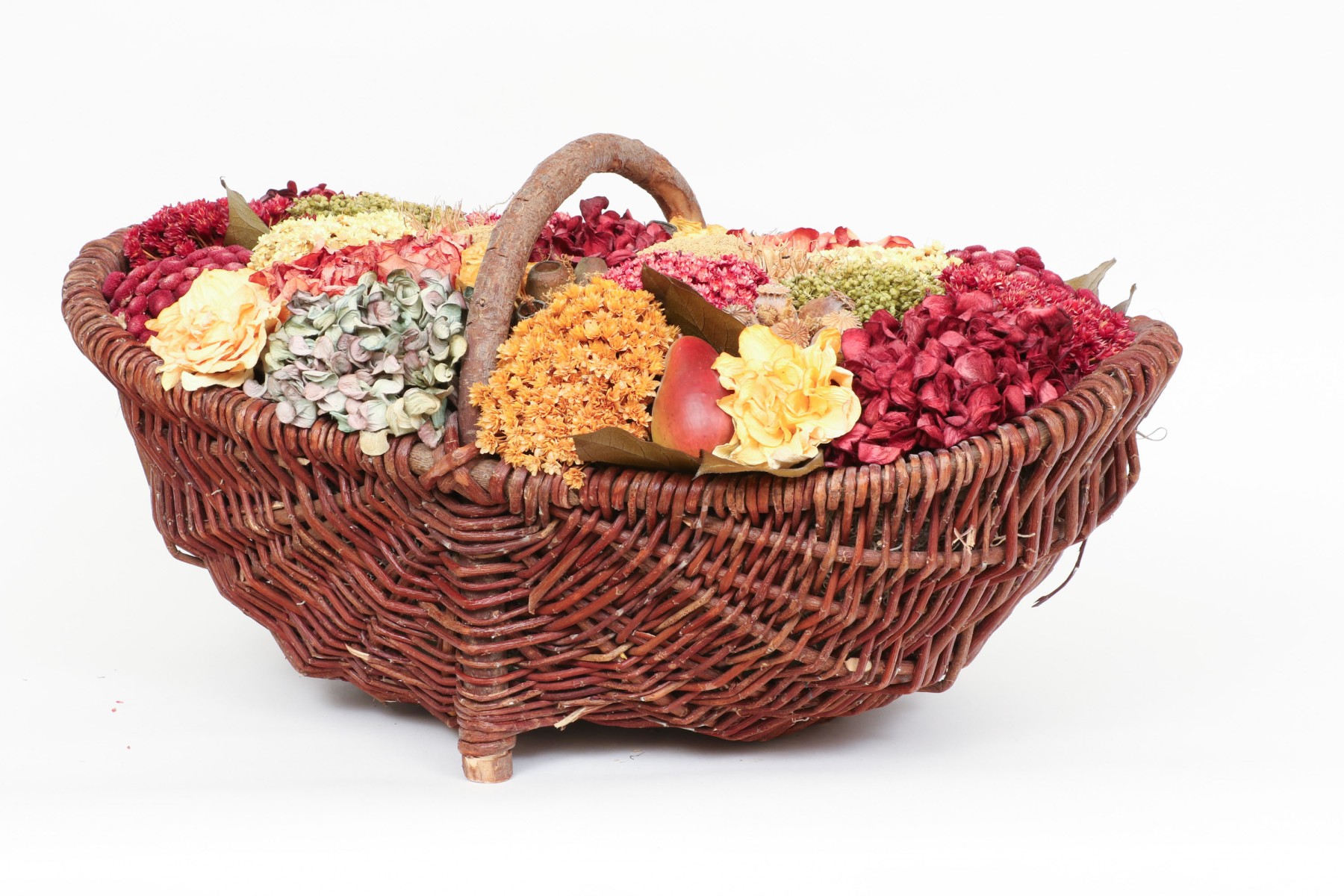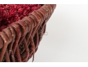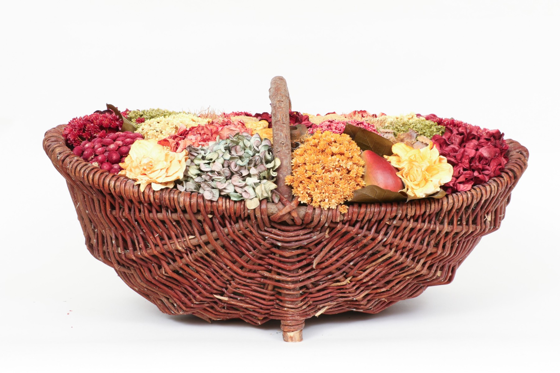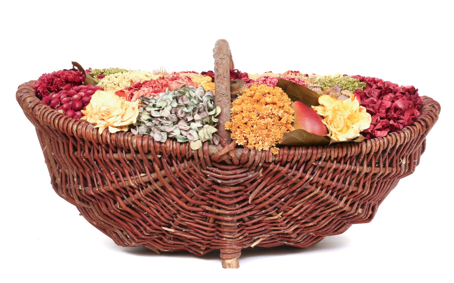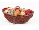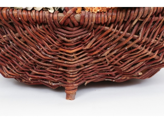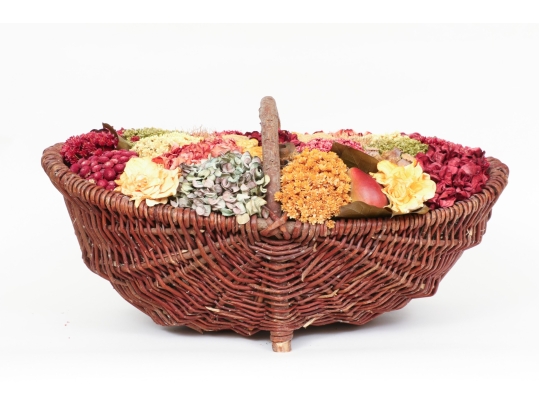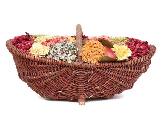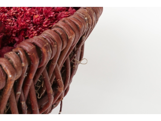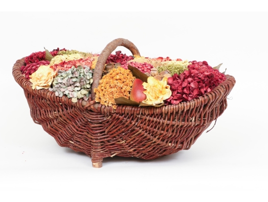 A large wicker woven trug basket with a faux/dried floral bouquet.