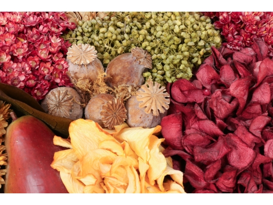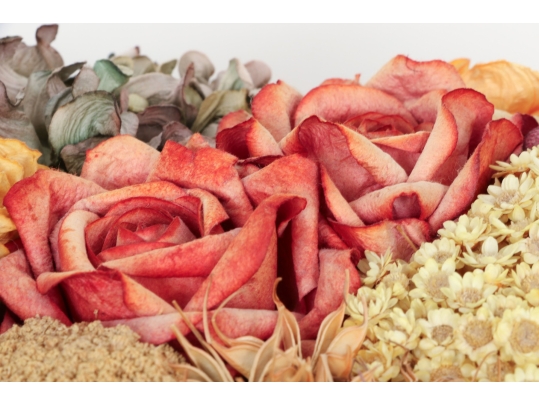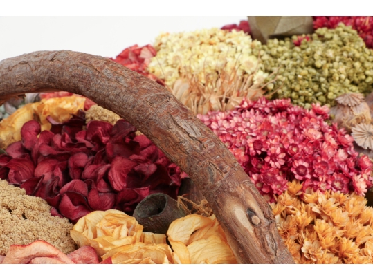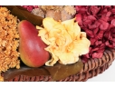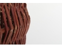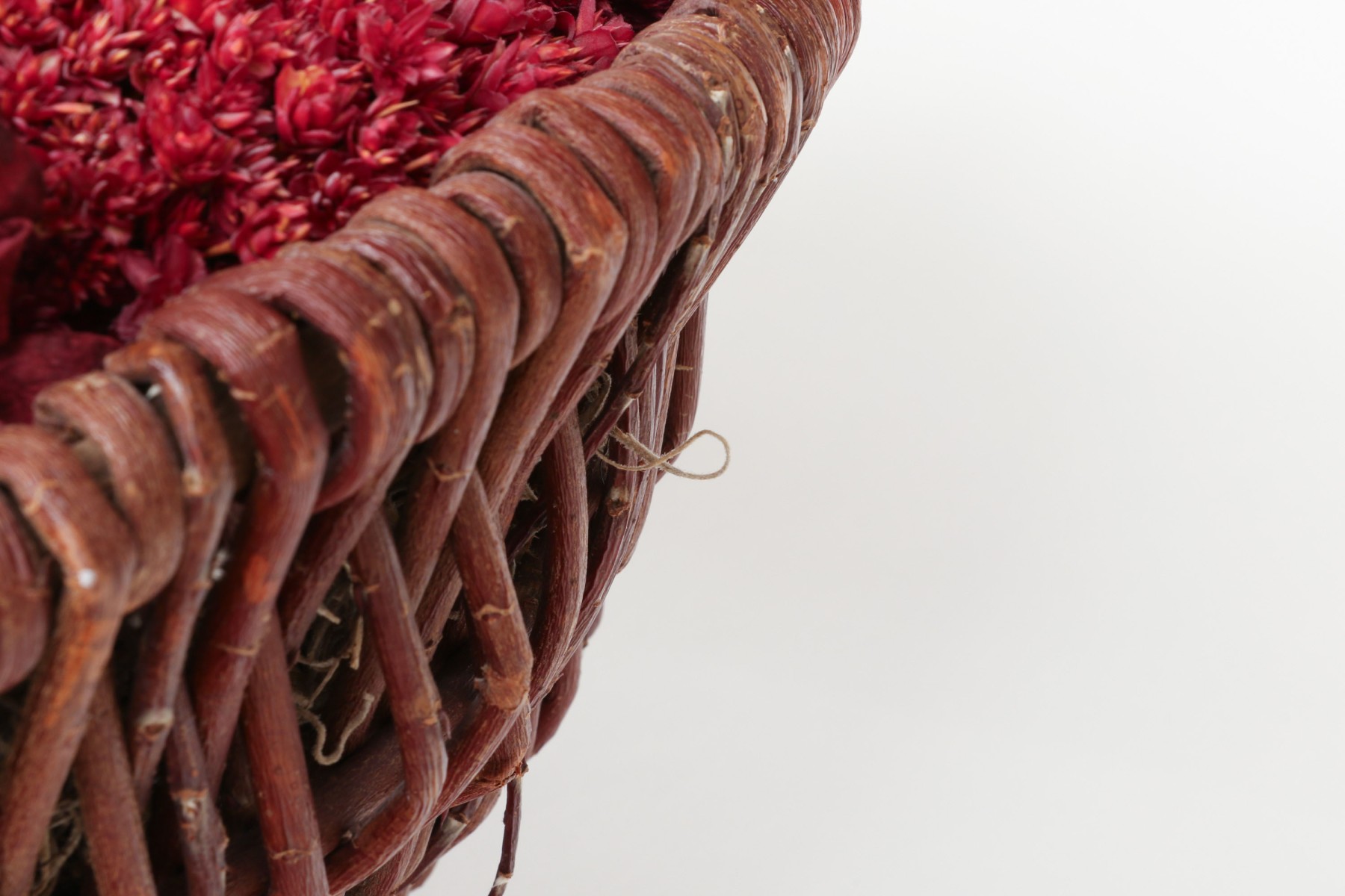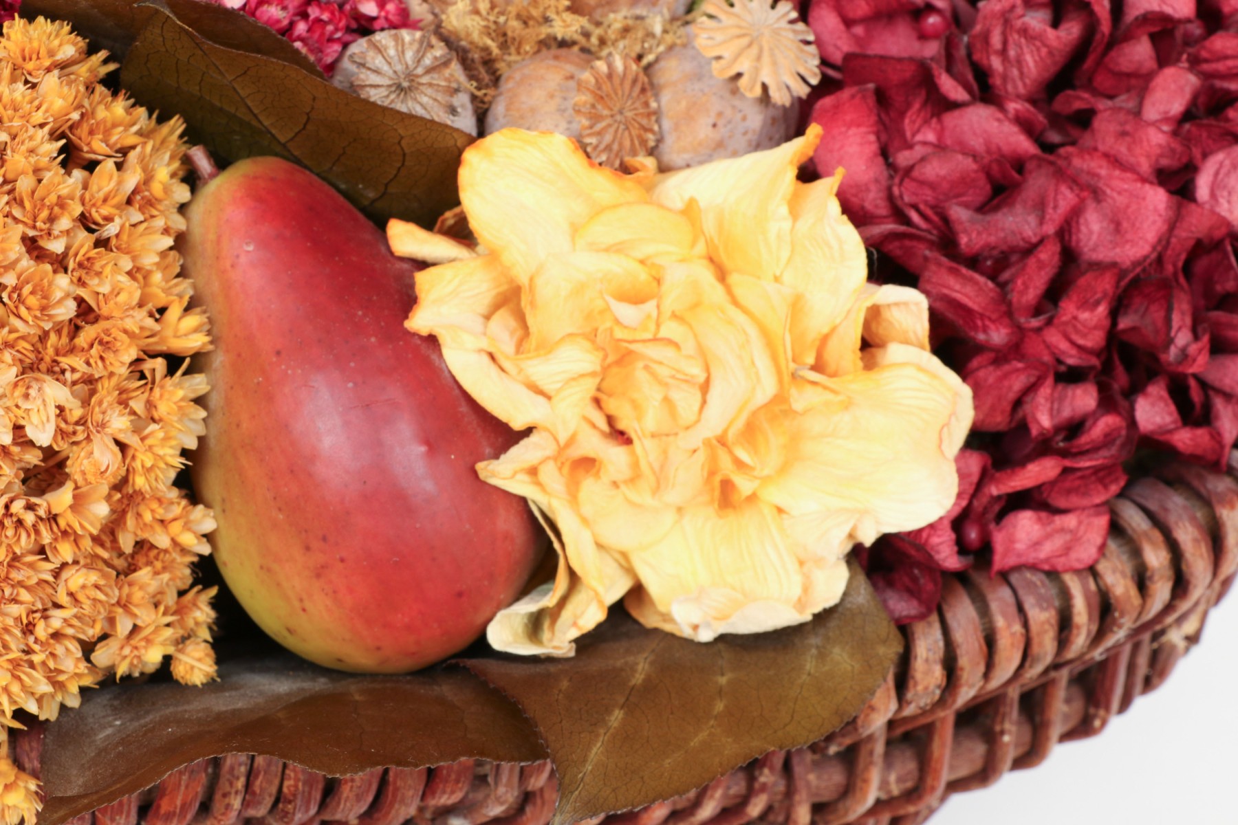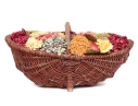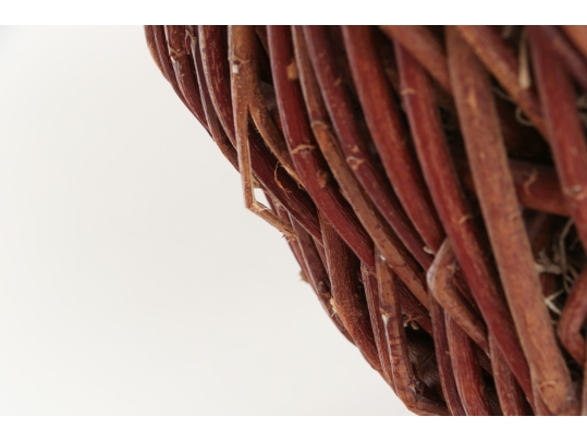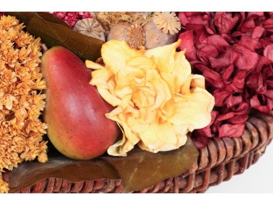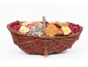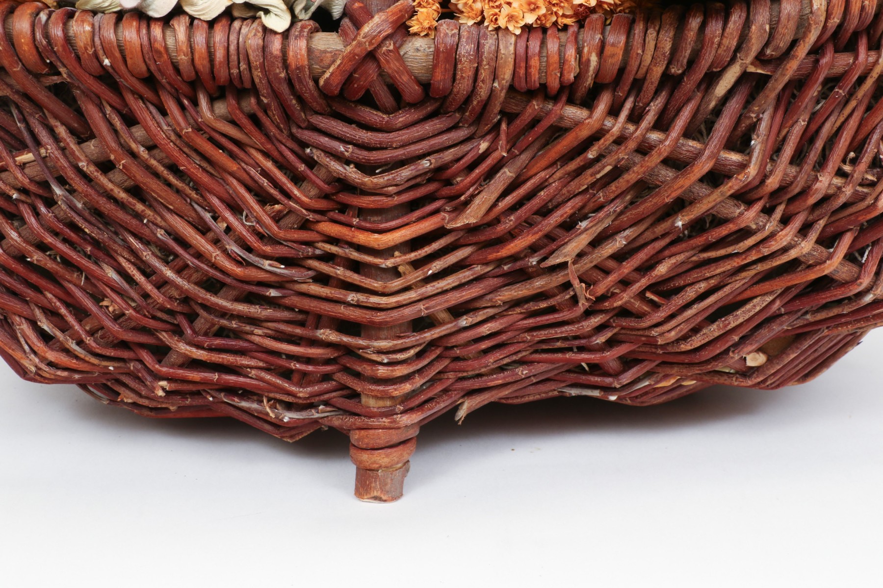 A large wicker woven trug basket with a faux/dried floral bouquet.