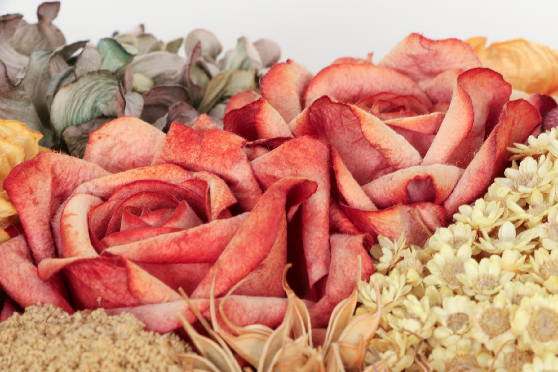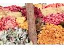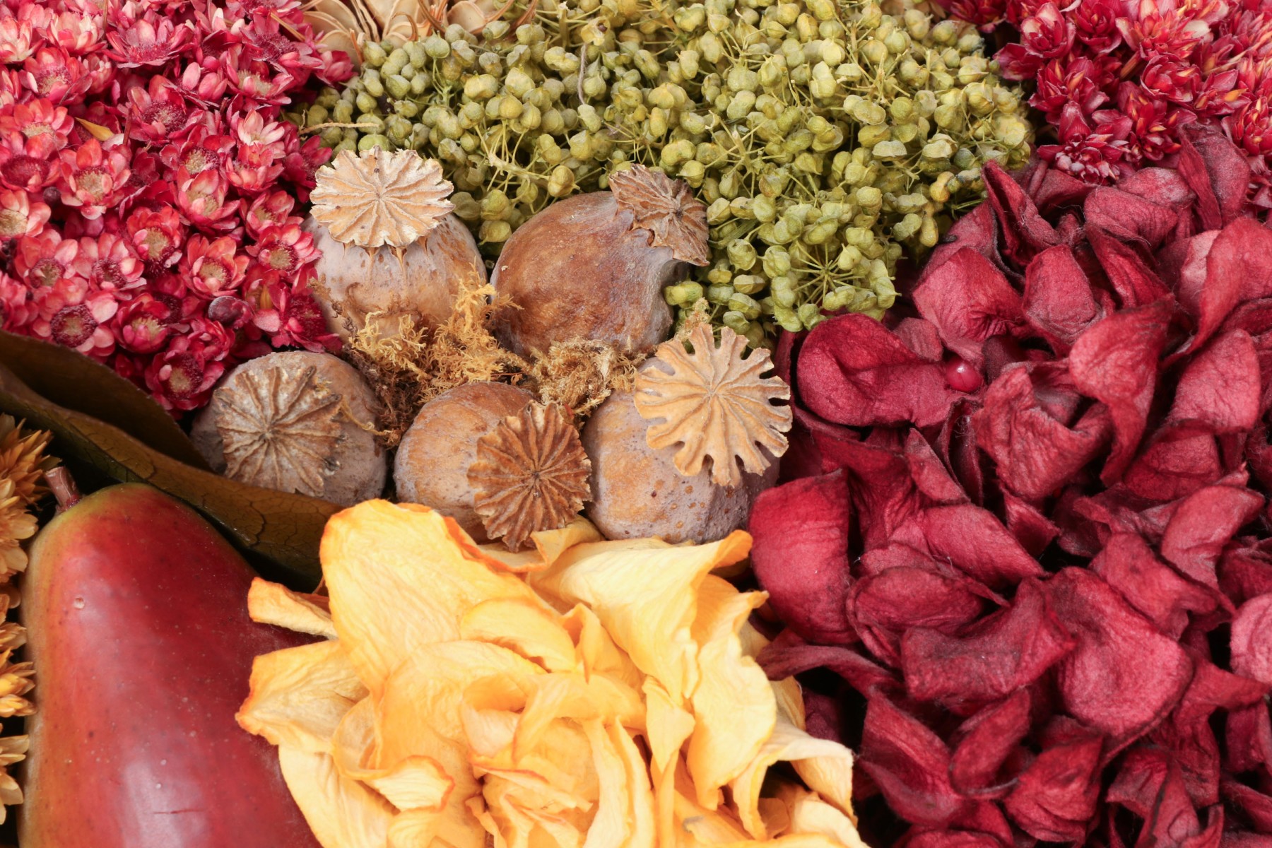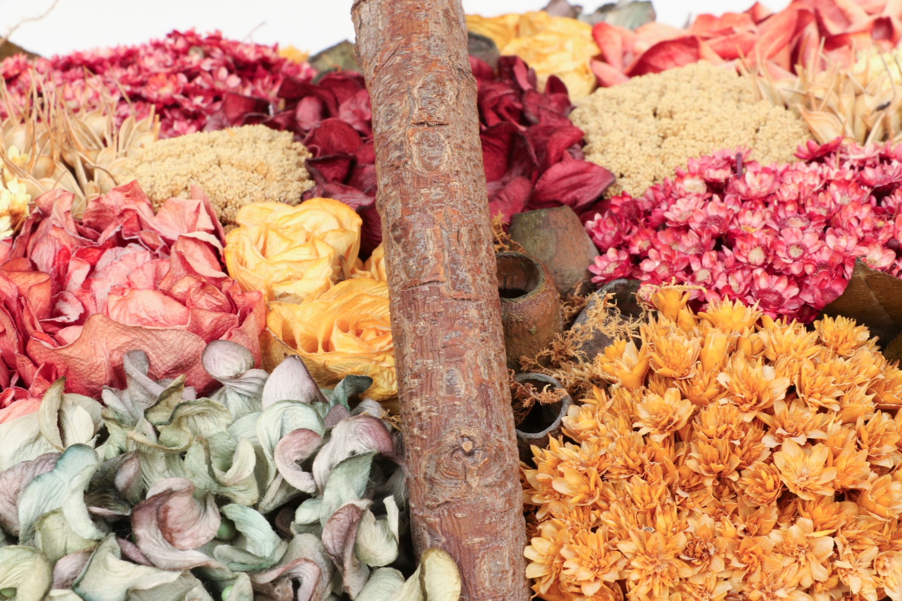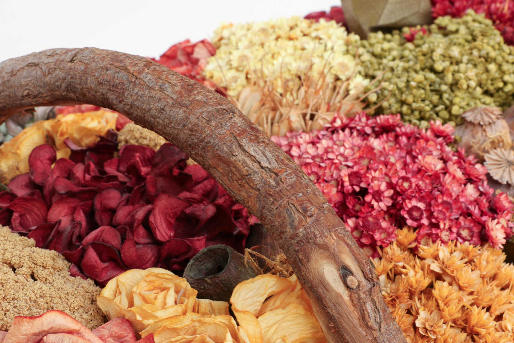A large wicker woven trug basket with a faux/dried floral bouquet.