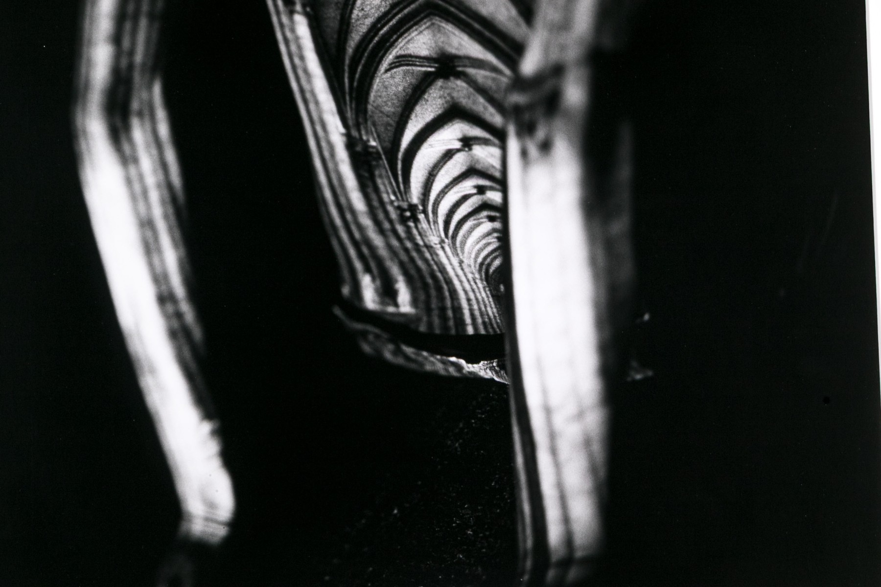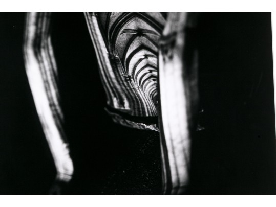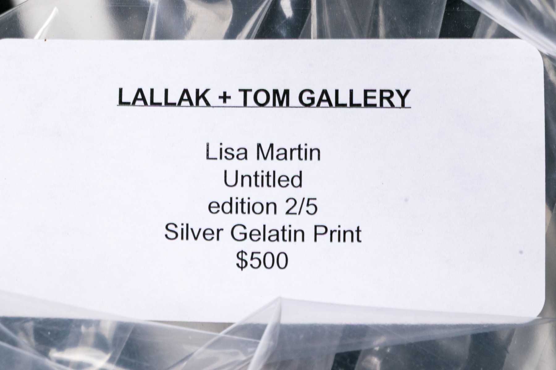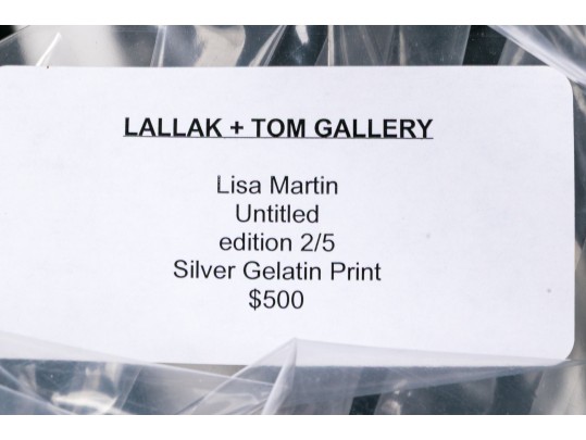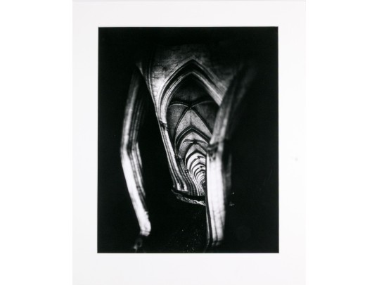 An eye-catching photographic print by Lisa Martin depicting a nearly abstracted view of vaulted ceilings in dramatic contrast. Signed and dated 1995. Bearing a label from Lallak + Tom Gallery denoting the original list price of $500.