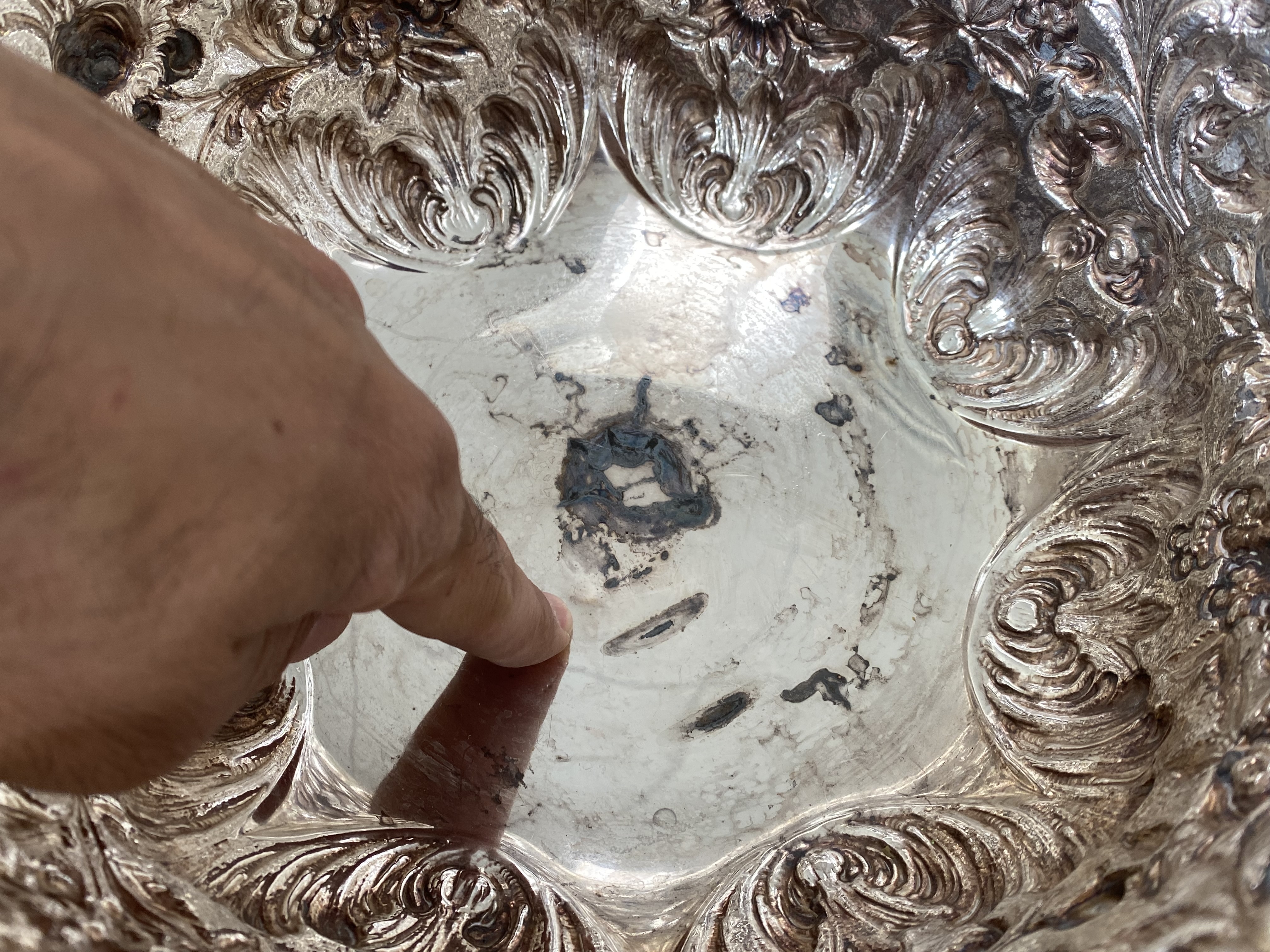 Good overall, gently tarnished. The bowl is in very good condition. There is a small ding to the bottom of the bowl seen in the photos. The foot is in good condition and is not bent.