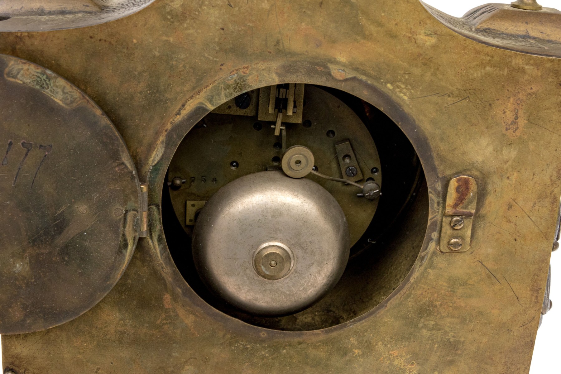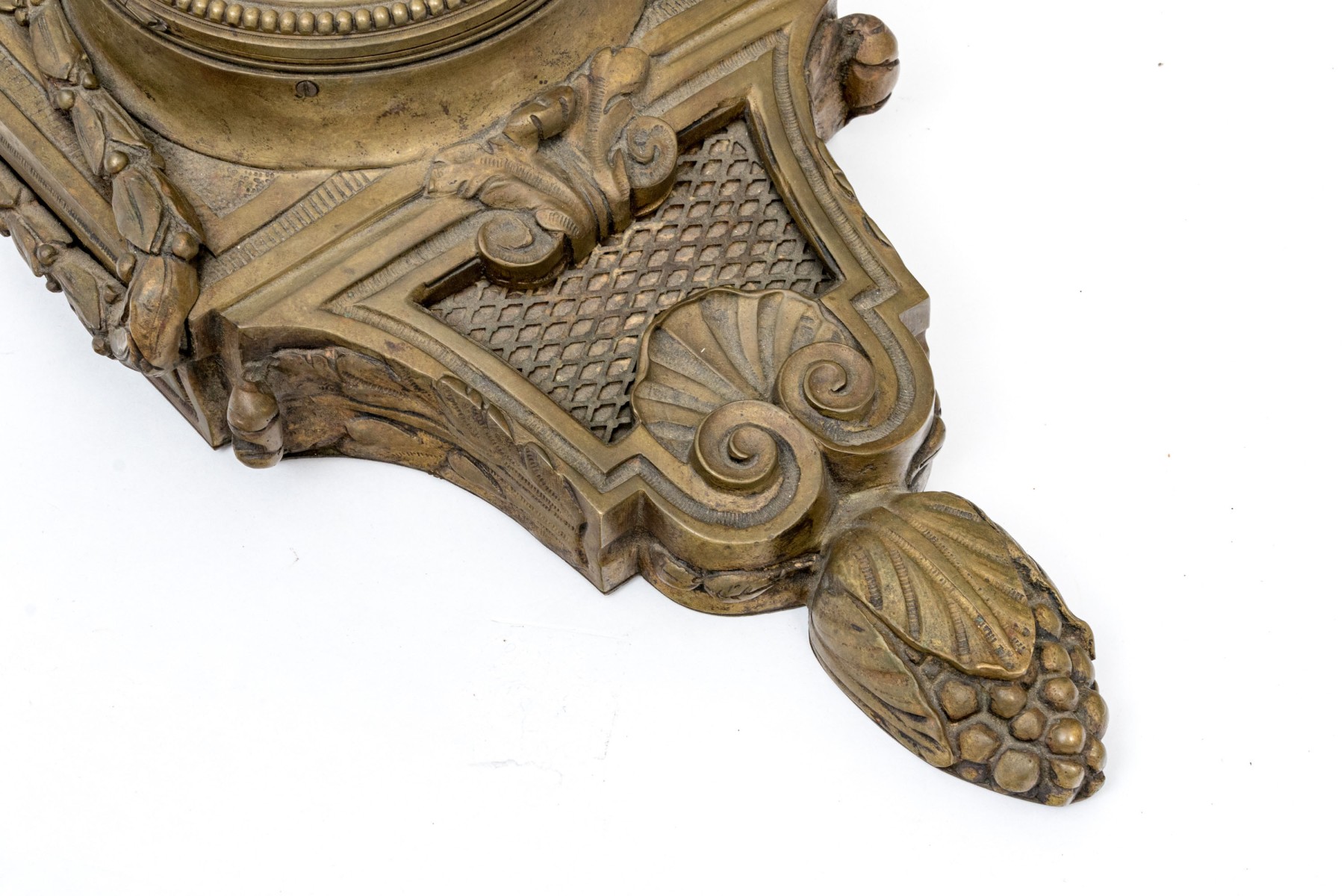 surmounted with an ornate urn form finial with swags, opposite the clocks foliate form terminal with ornate shell motif. The glass face cover surrounded by a band of beads.
