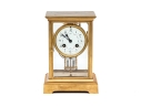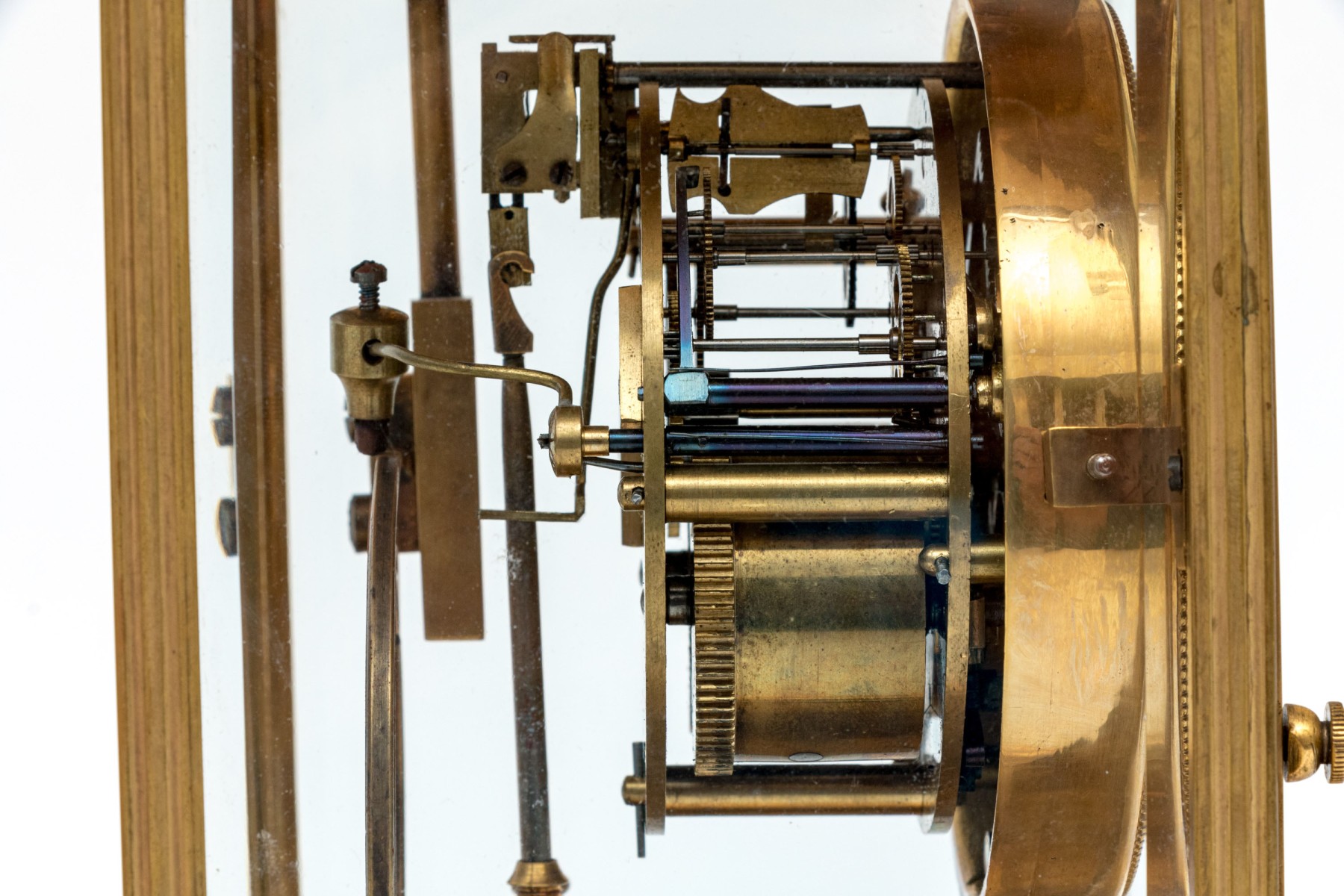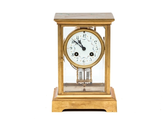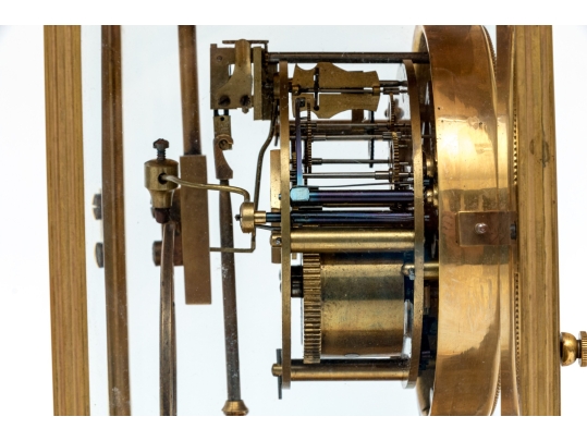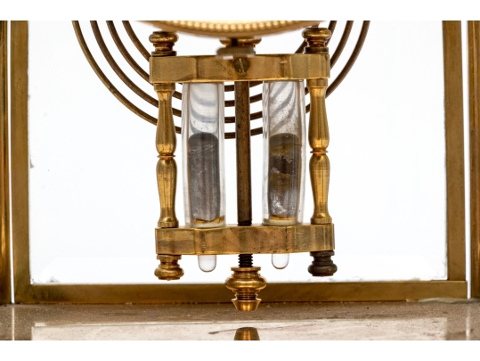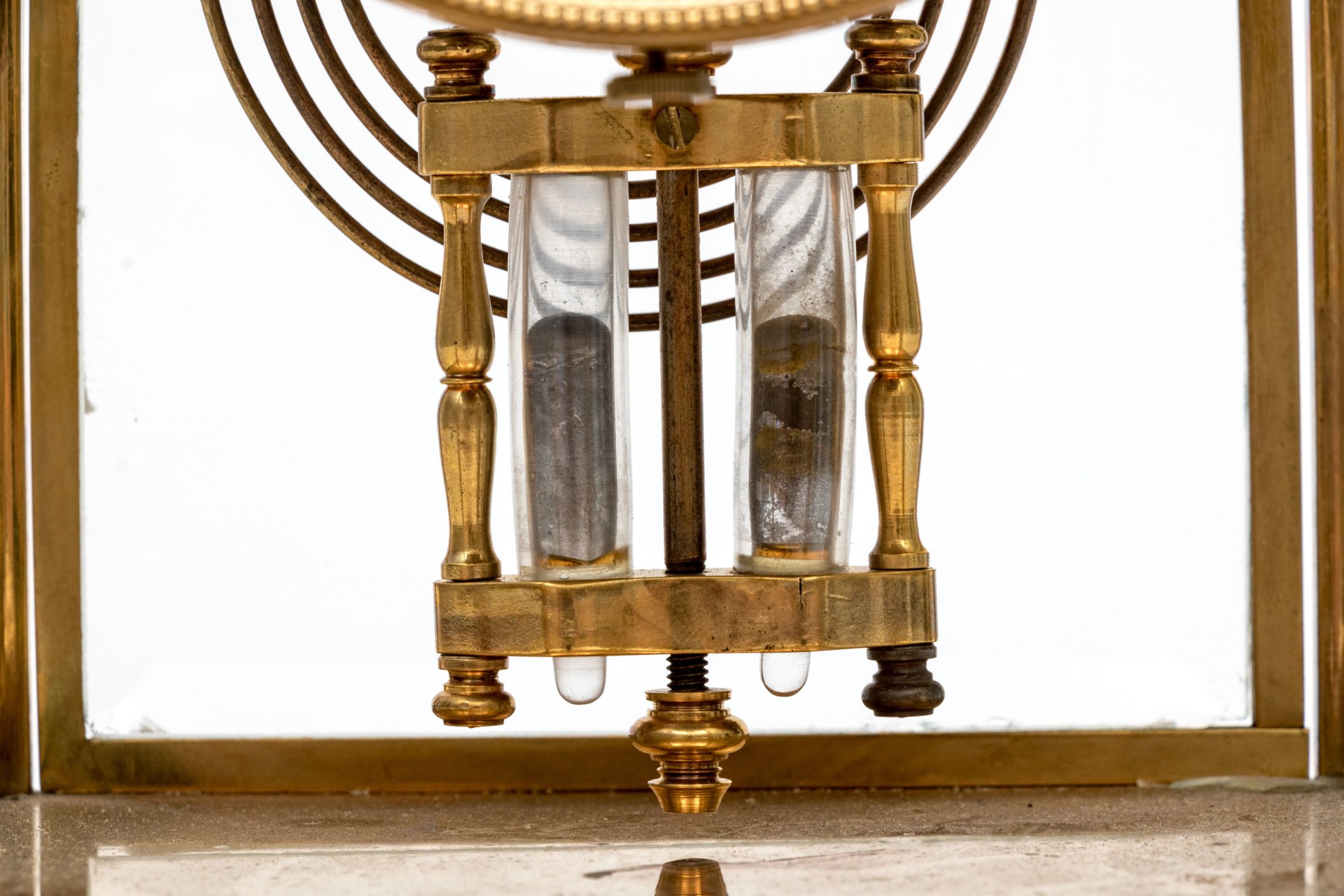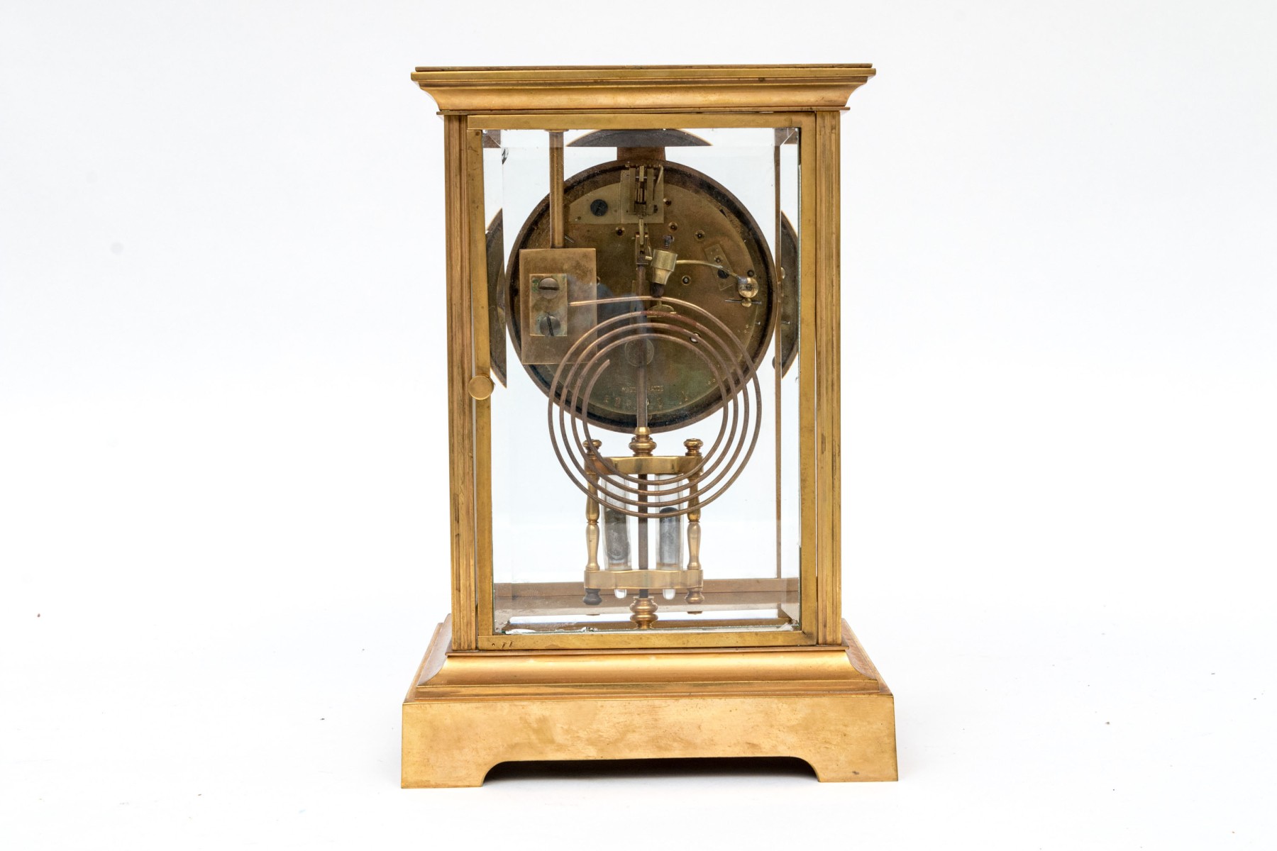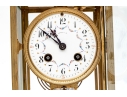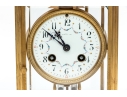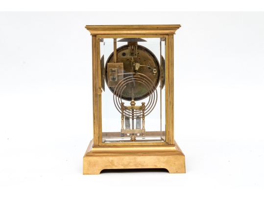 The mantle clock has a brass frame with glass panels and hinged doors to access the interior workings.