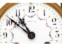 The mantle clock has a white enameled dial with polychrome painted floral garlands for decorative embellishment.
