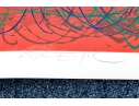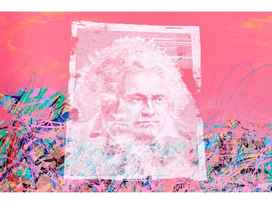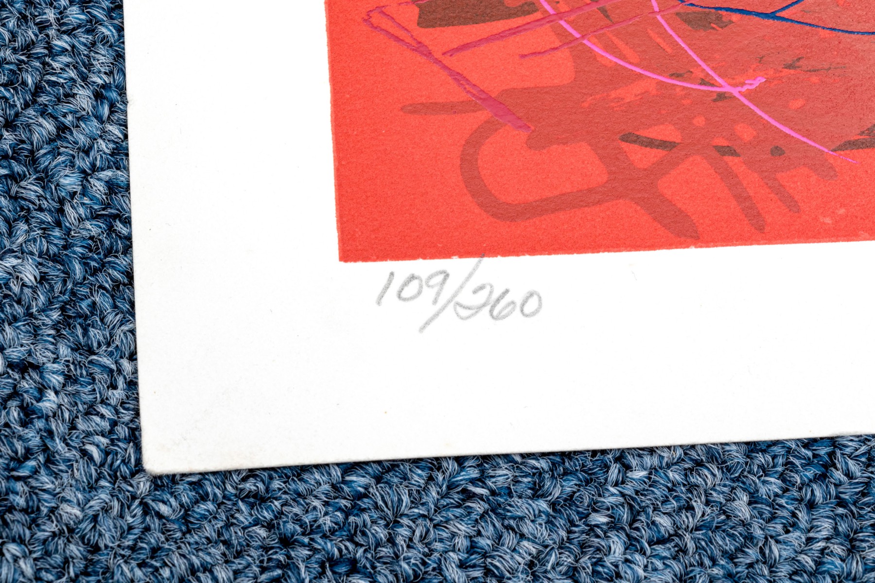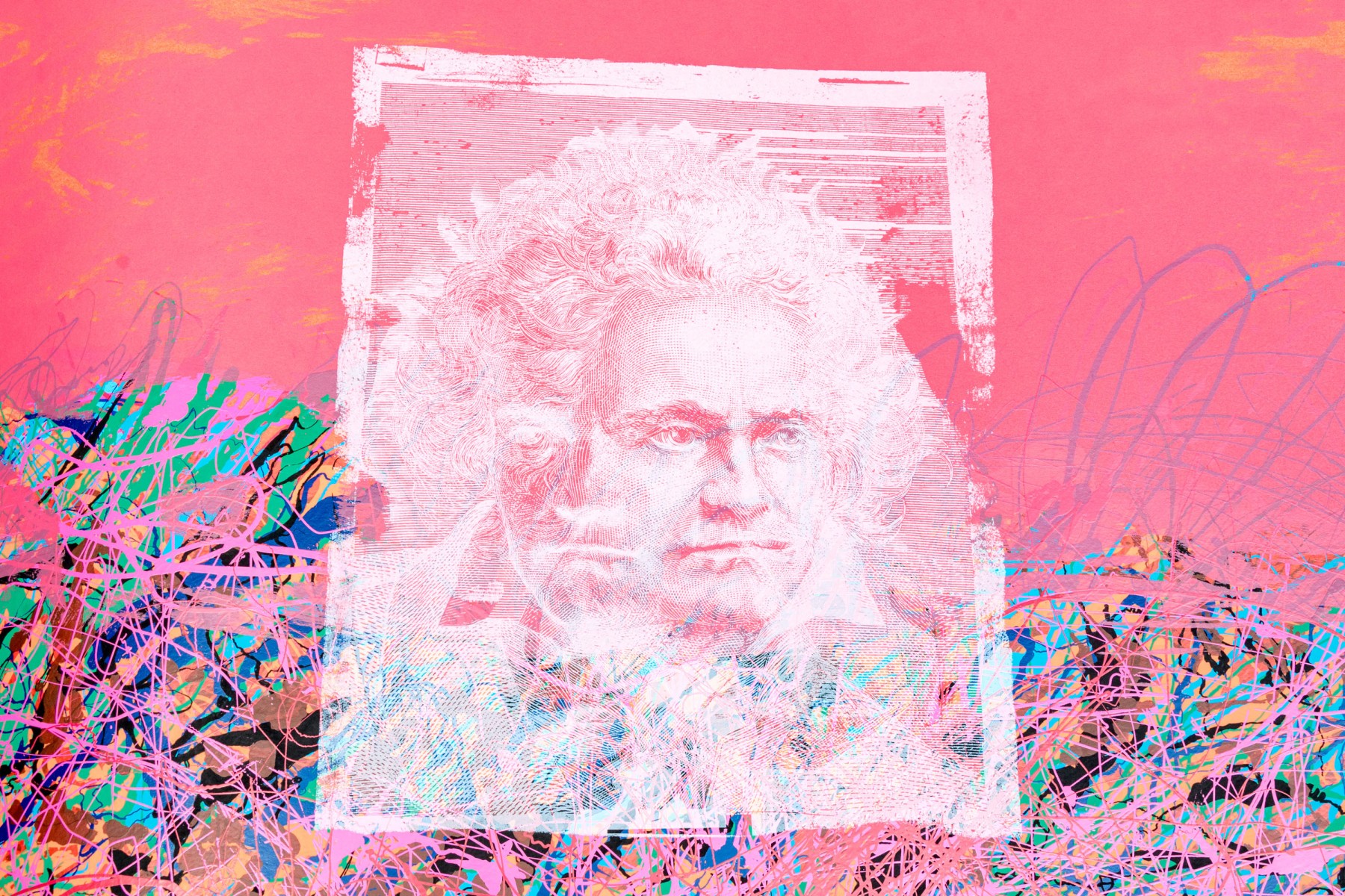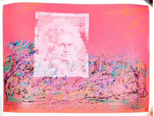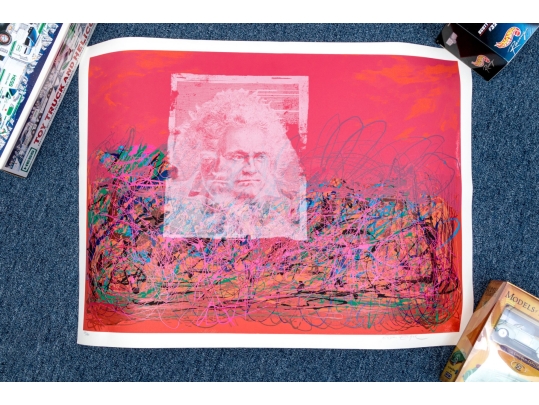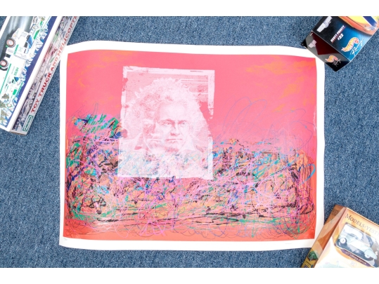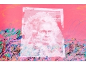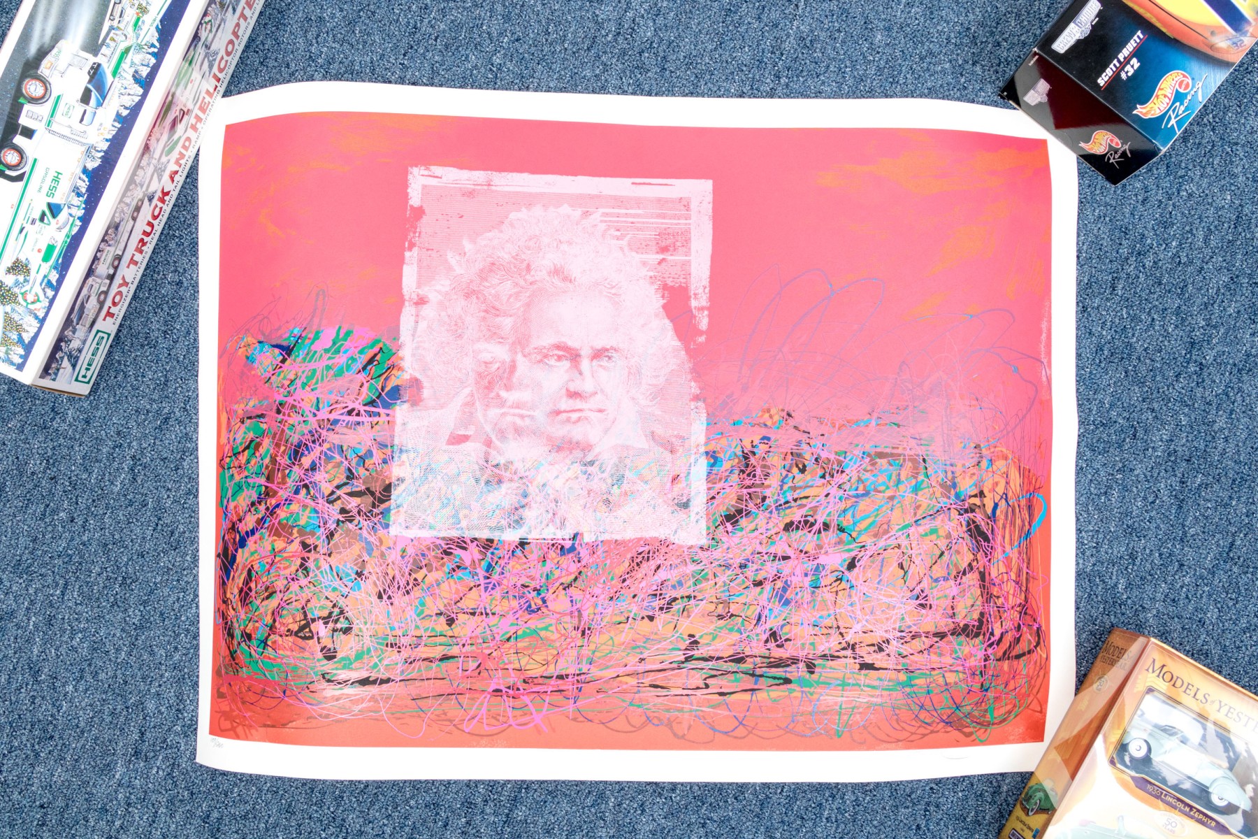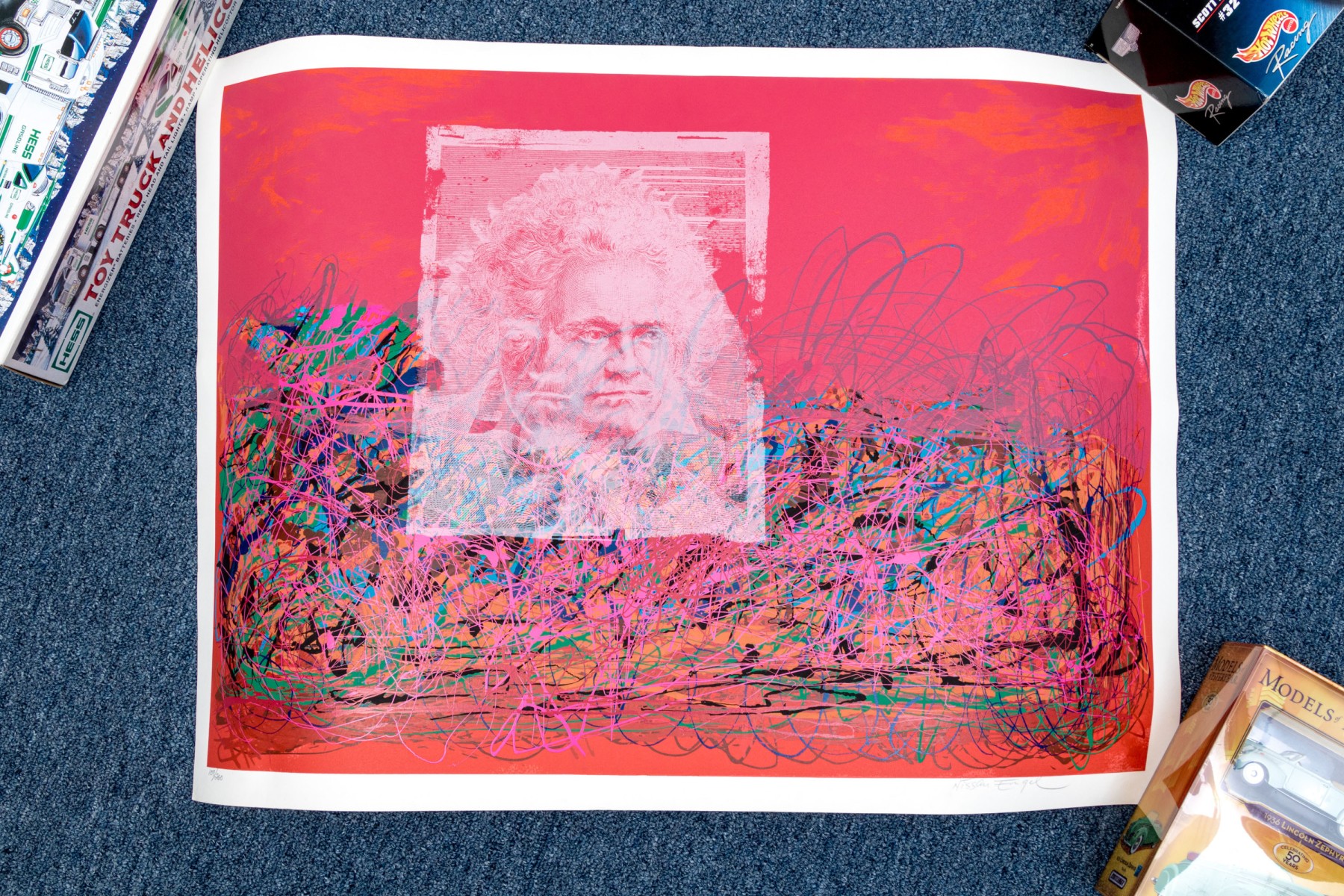 Nissan Engel (Israeli, 1931-2016) Series Beethoven limited edition print depicting a superimposed white stamp style portrait bust of composer Beethoven over a vibrant red ground embellished with absract lyrical style linework in pink, blue, green, and yellow.