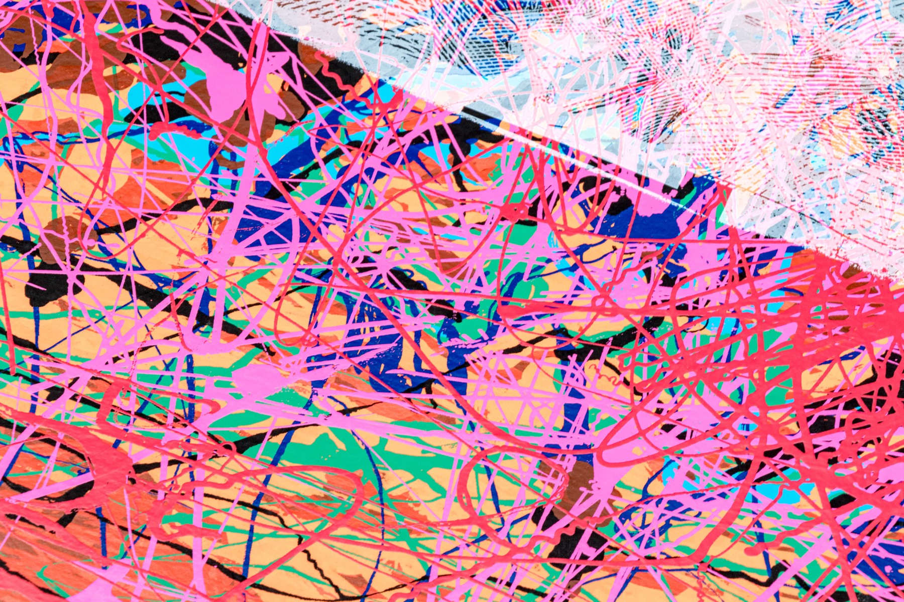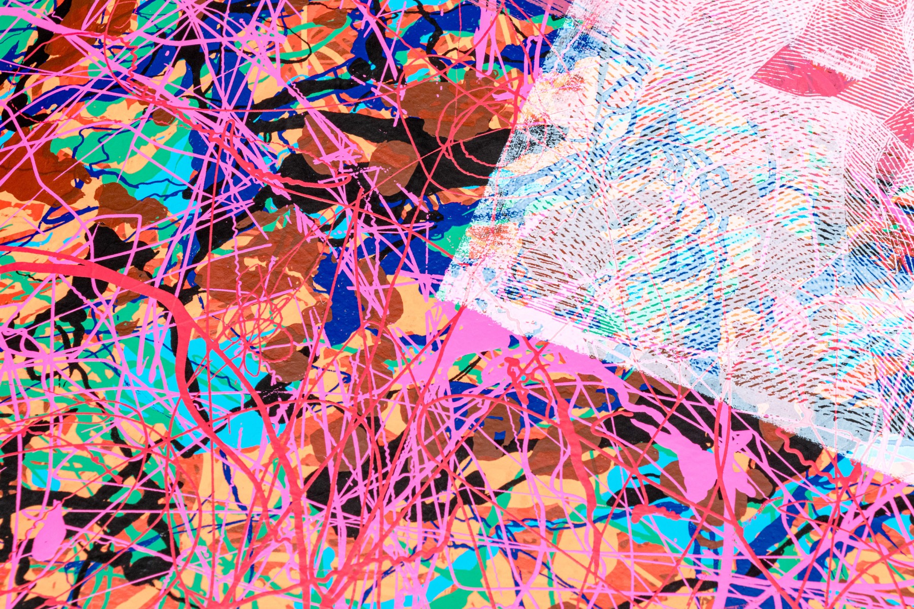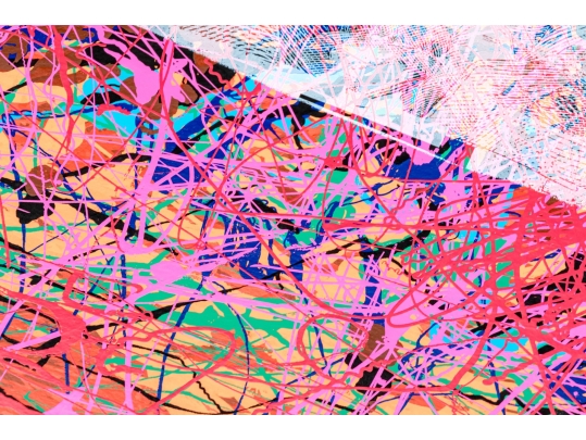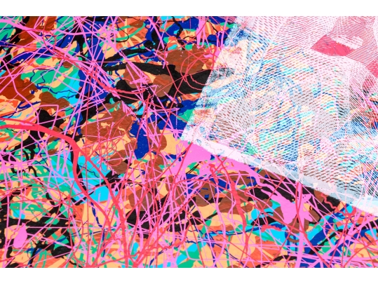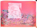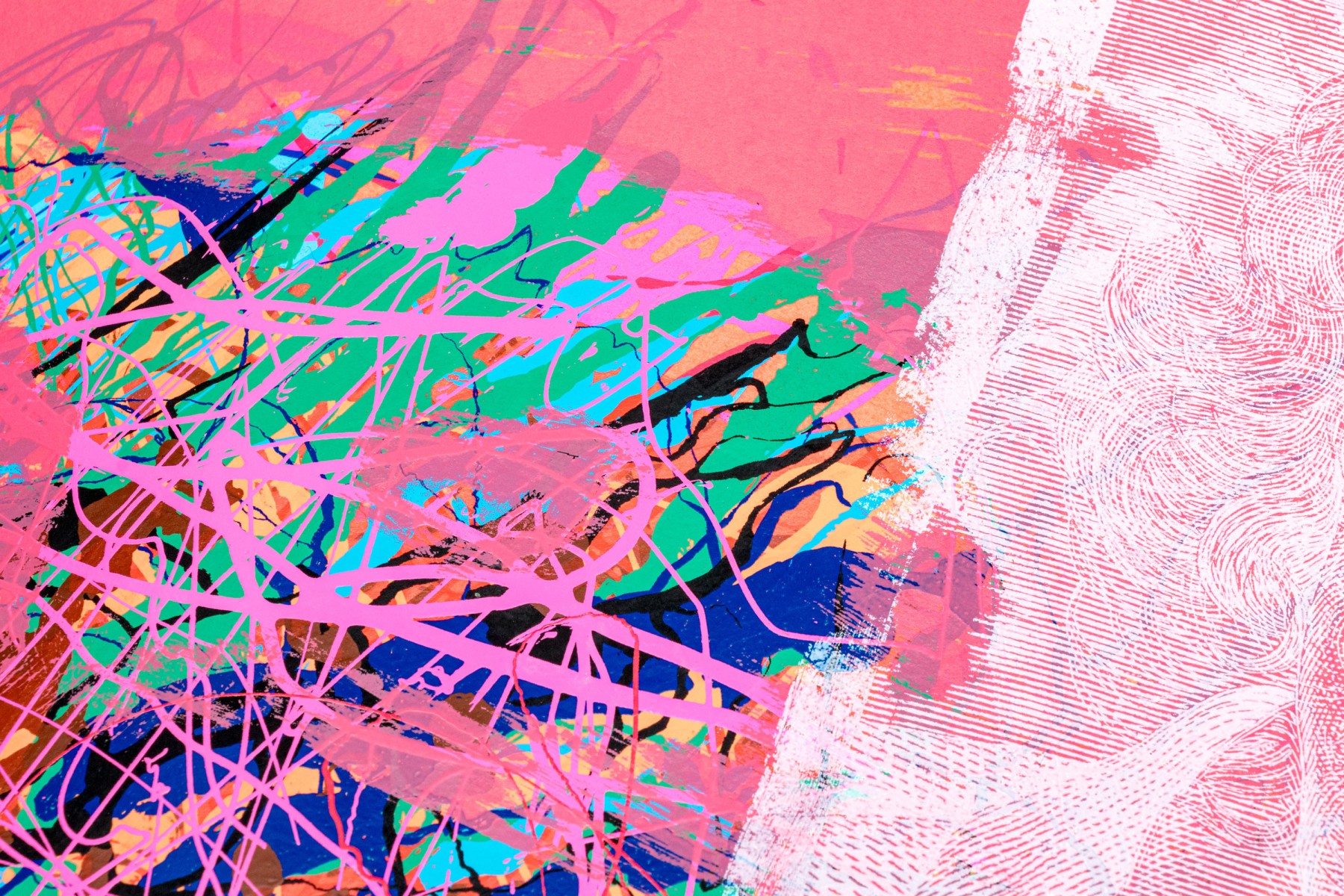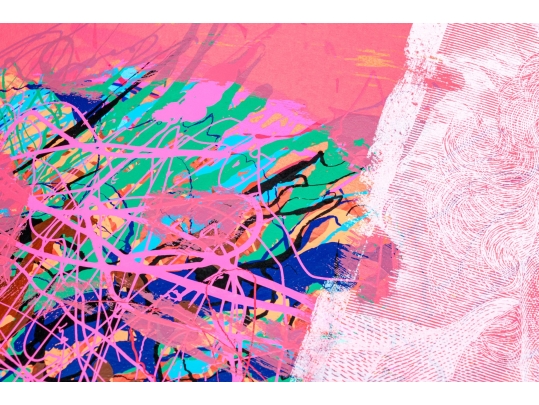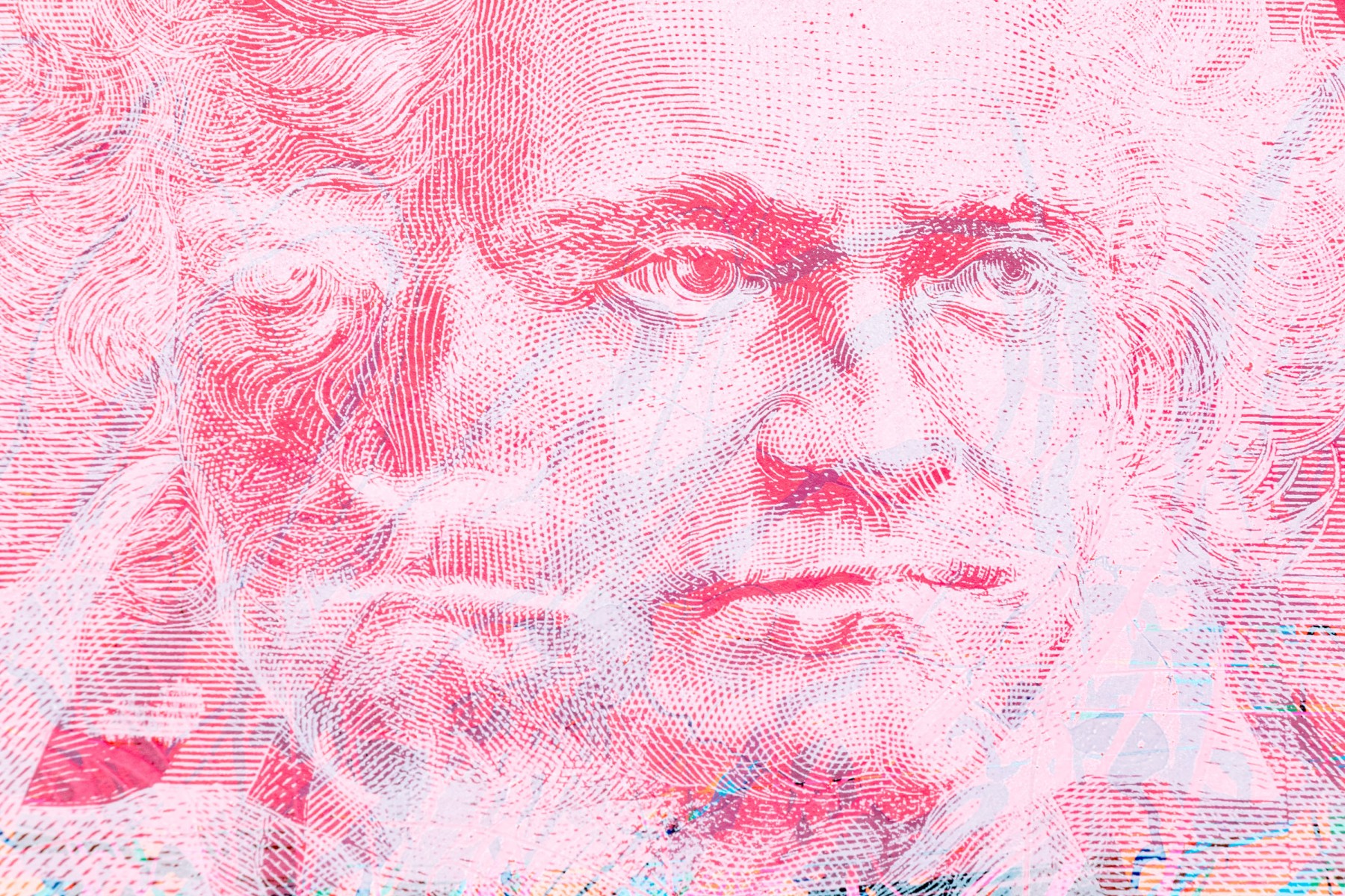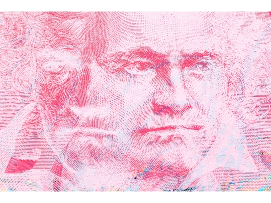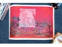 Nissan Engel (Israeli, 1931-2016) Series Beethoven limited edition print depicting a superimposed white stamp style portrait bust of composer Beethoven over a vibrant red ground embellished with absract lyrical style linework in pink, blue, green, and yellow.