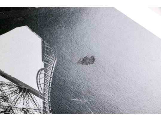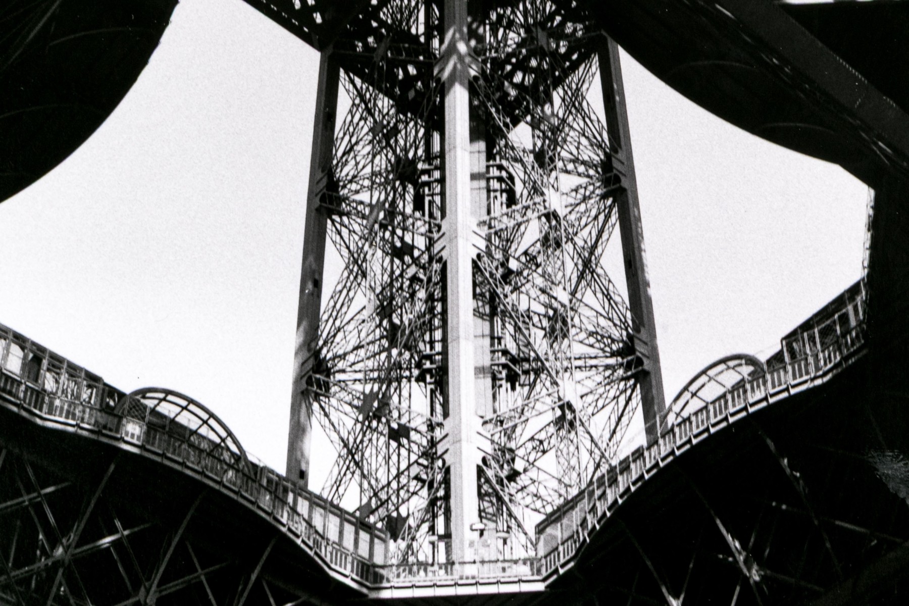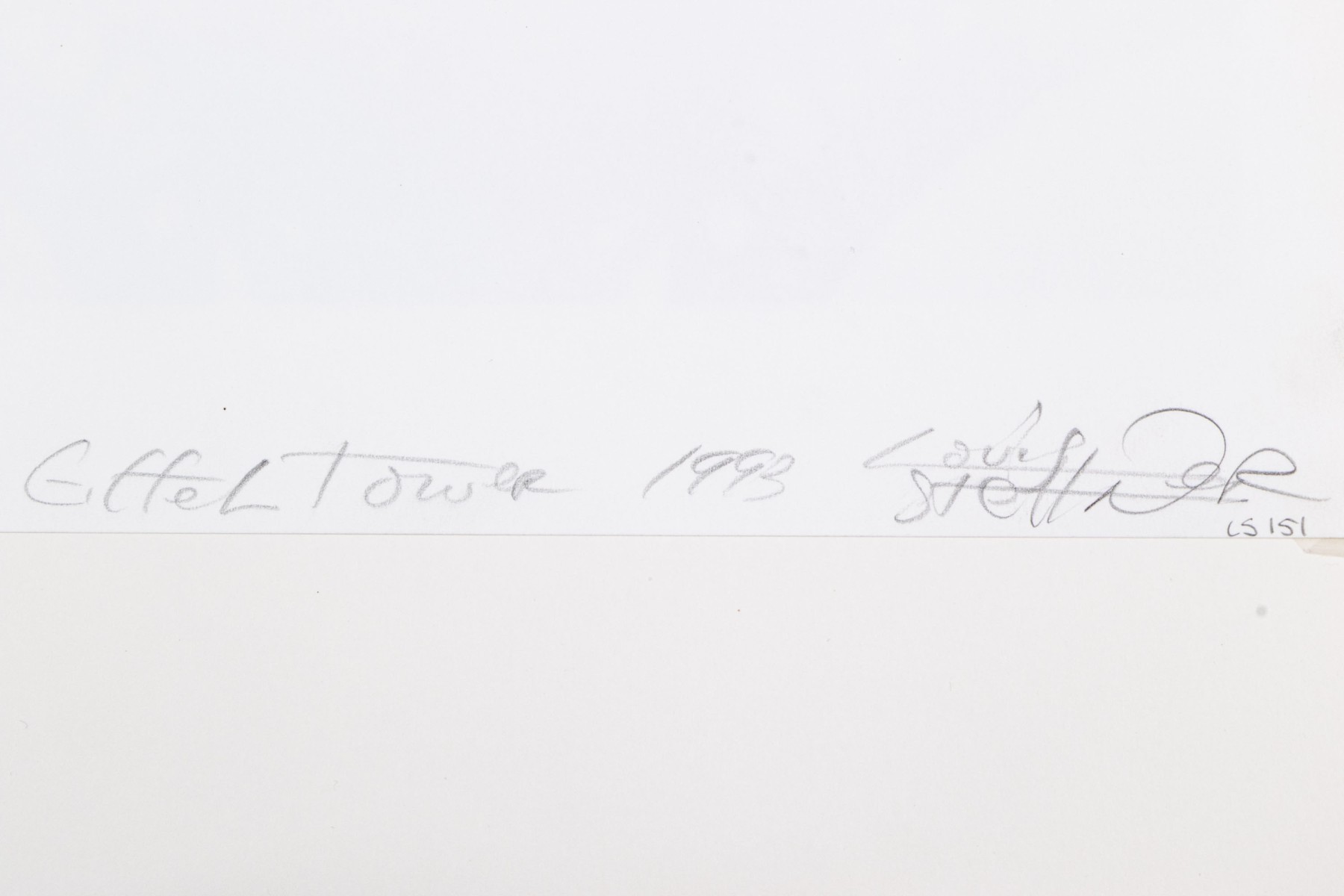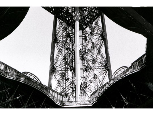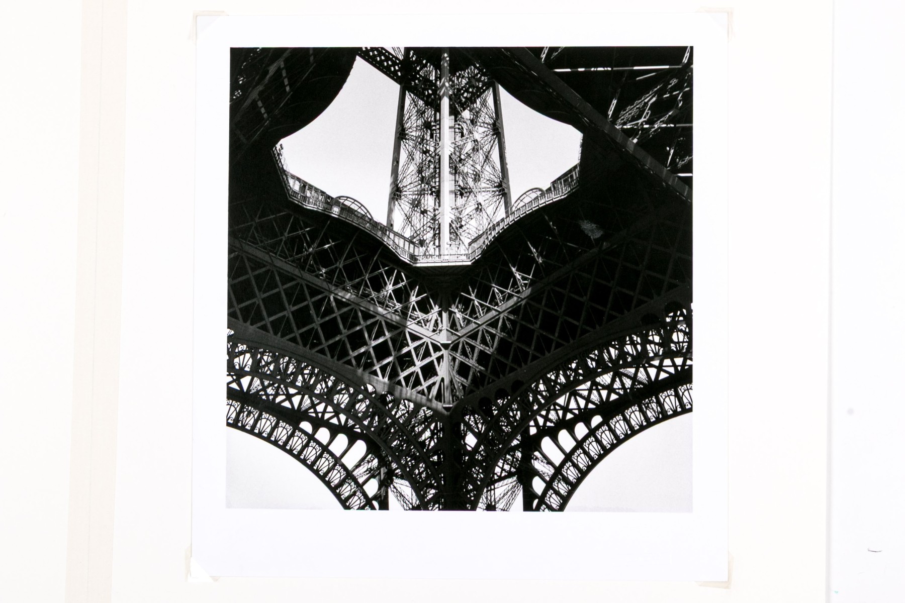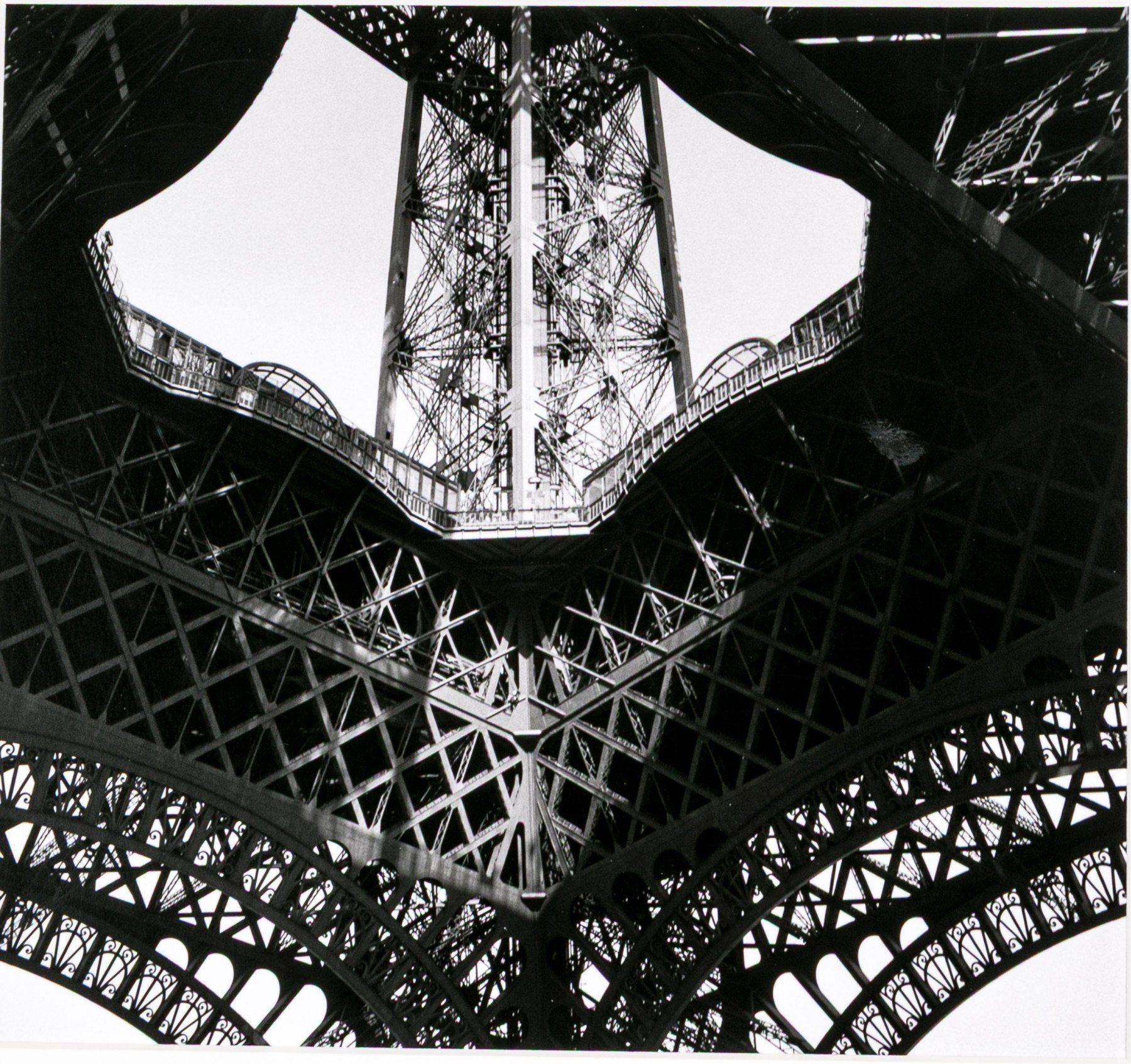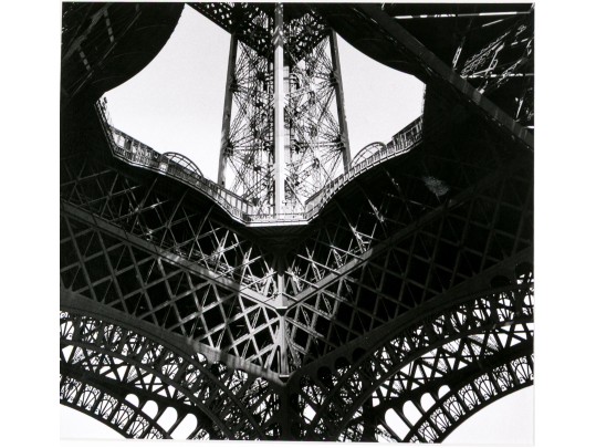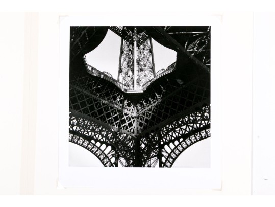 Louis Stettner (American, 1922-2016) "Eiffel Tower (1993)" gelatin silver print depicting a view of the intricate architecture of the Eiffel Tower from below. Titled, dated 1993, and signed on the verso. Unframed.