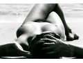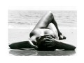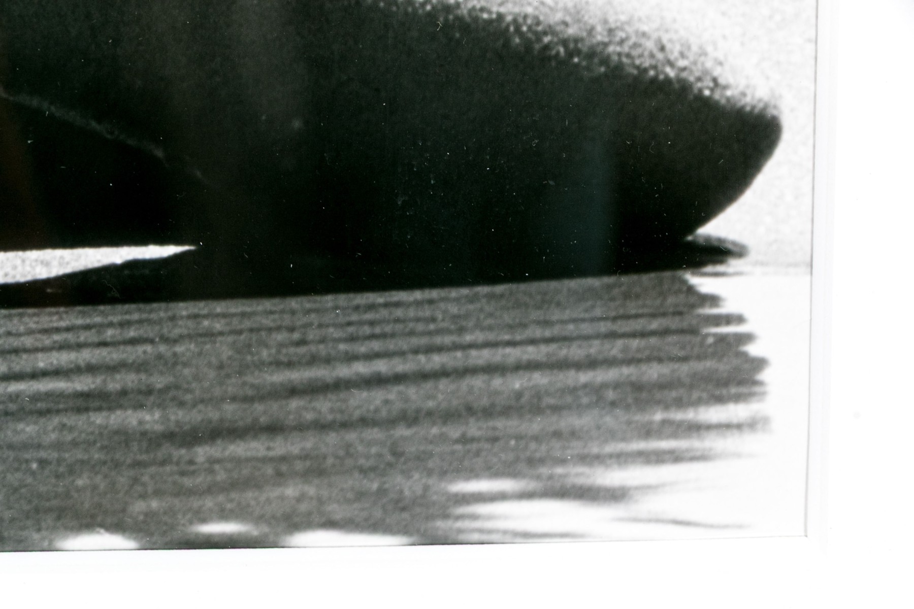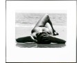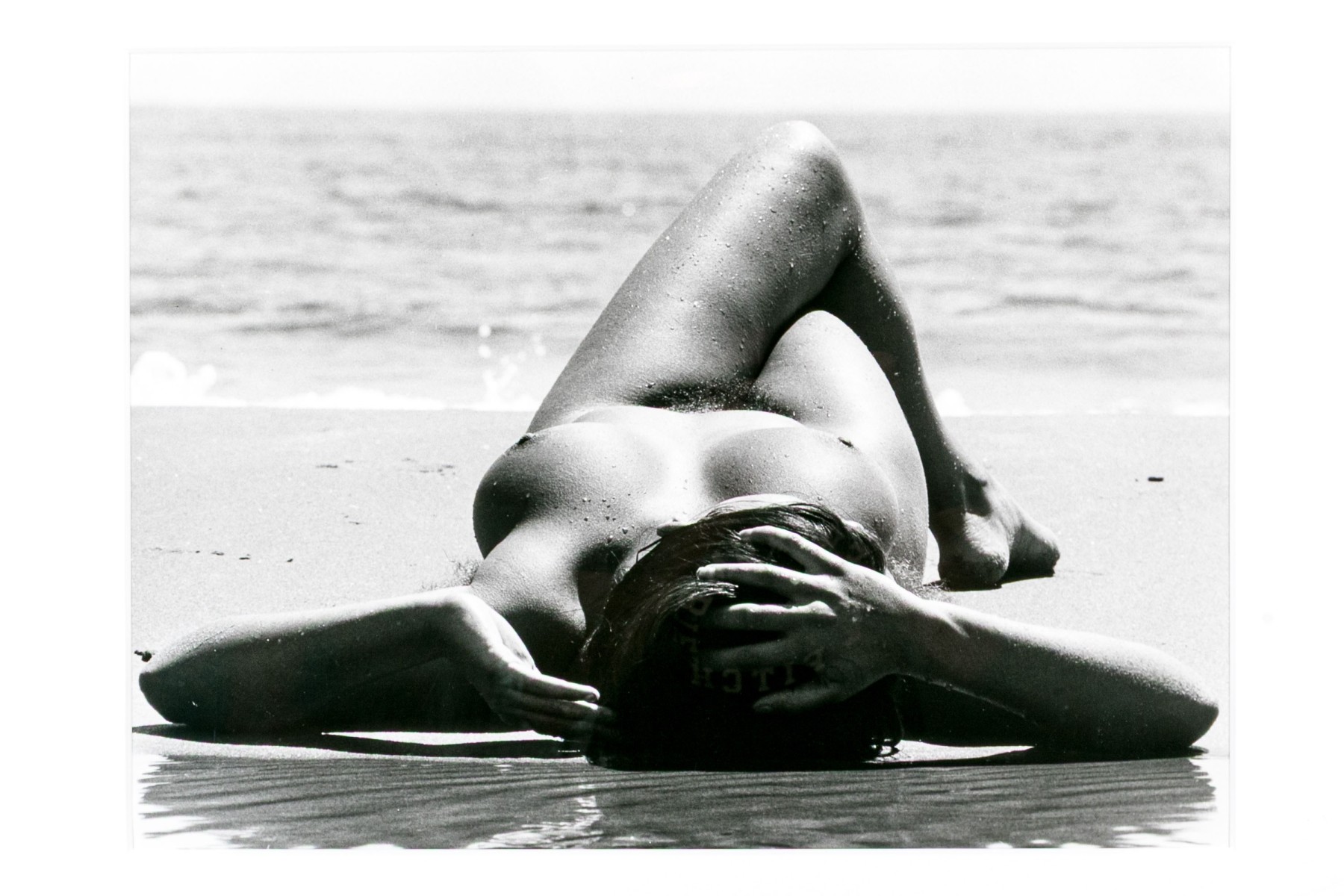 Lucien Clergue (French, 1934-2014) "Nude On The Beach, Camargue" Gelatin silver print depicting a perspective view of a female nude reclining on the beach with legs crossed leading to a view of the ocean.