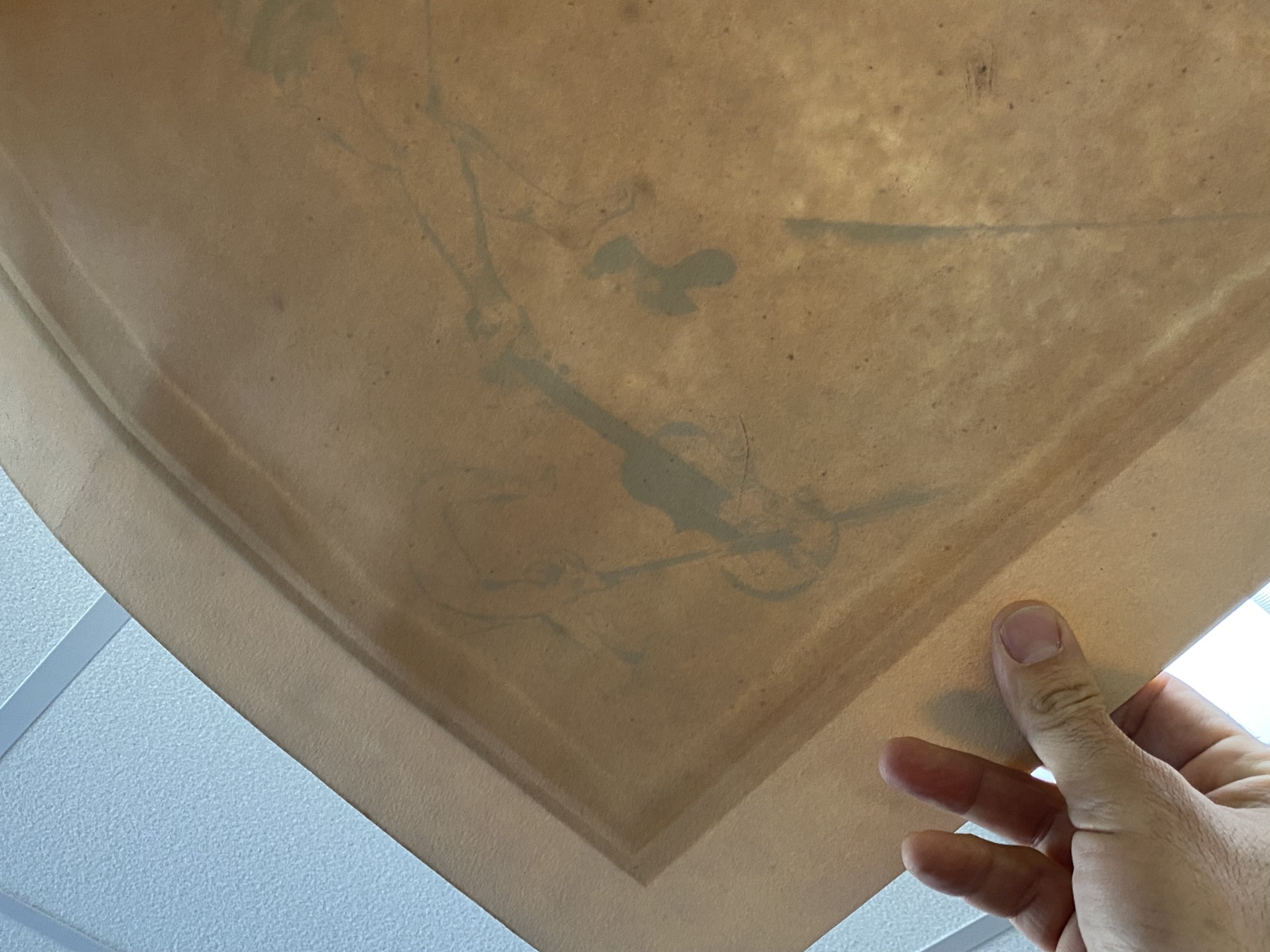Light foxing, some acid burning around the mat. There is a light line on the left side and bottom of the print, a q quick glance it looks like water damage, but when viewed from the reverse it is actually a darker box on 90% of the image, it may be a type of oxidation from the acid mat. The piece should be professionally cleaned.