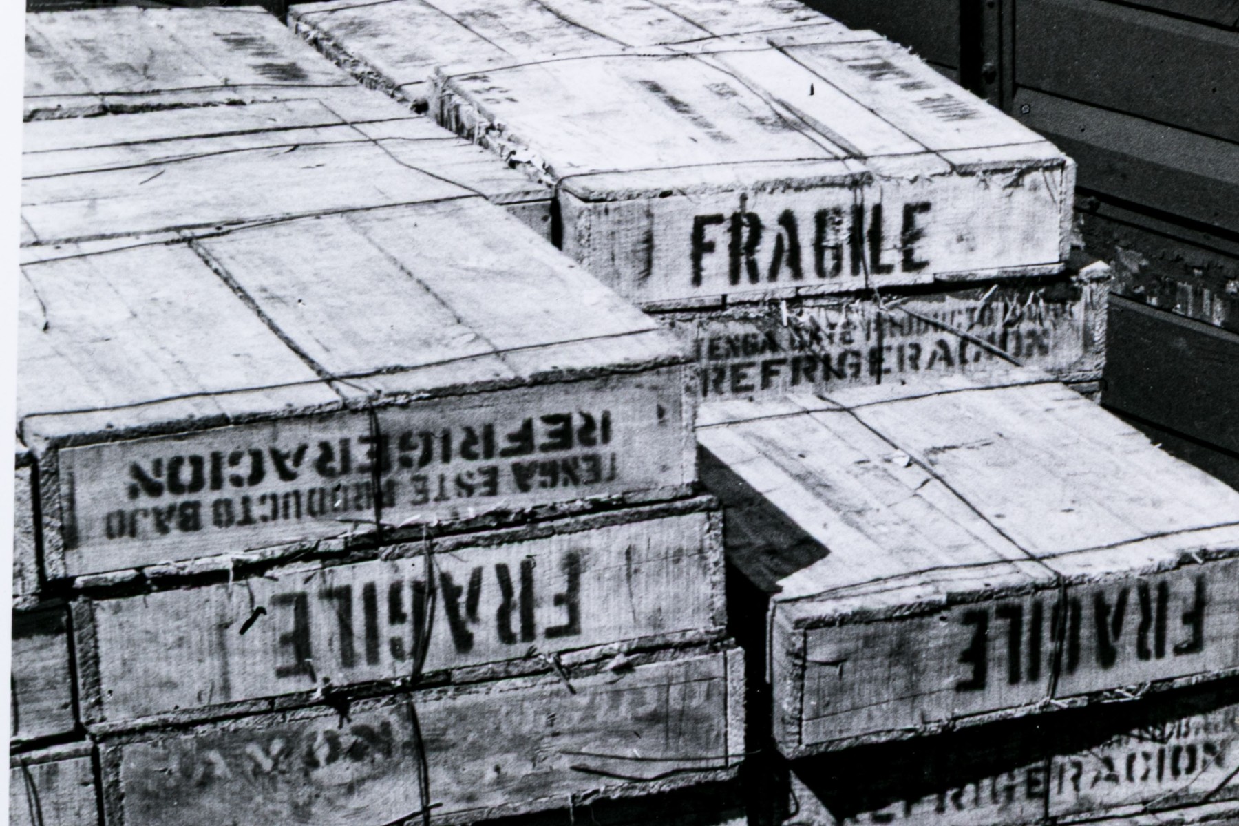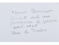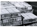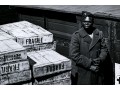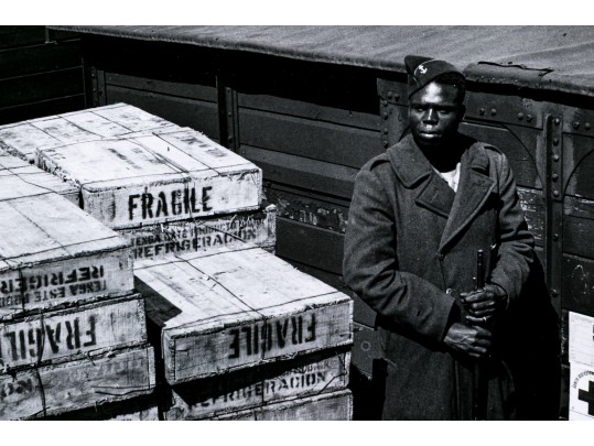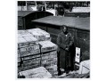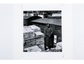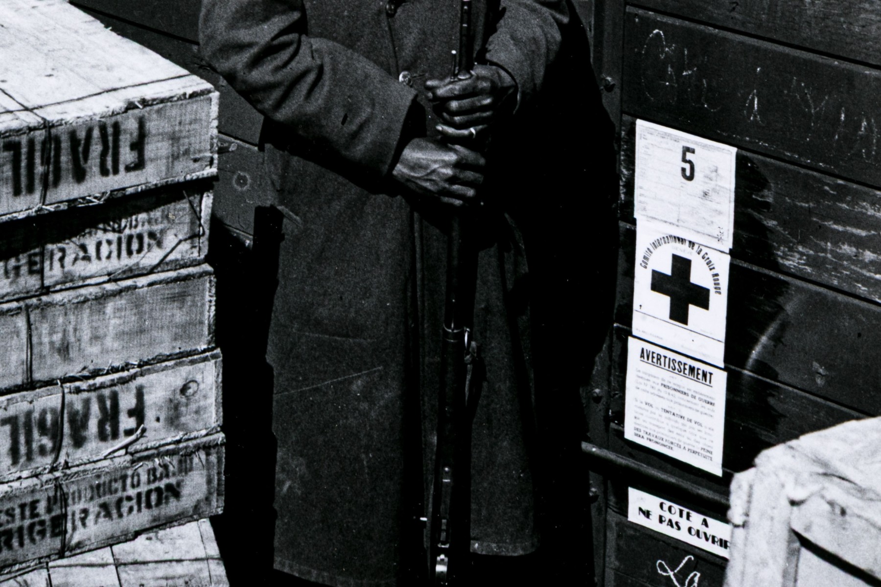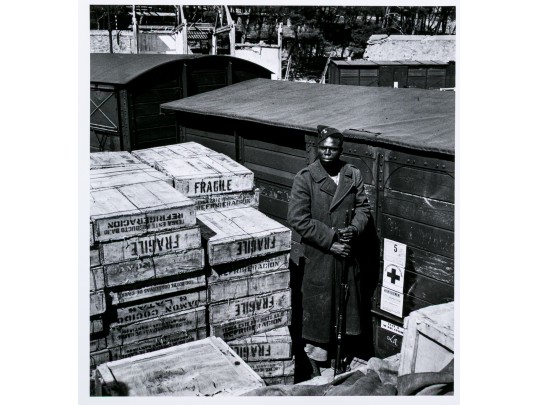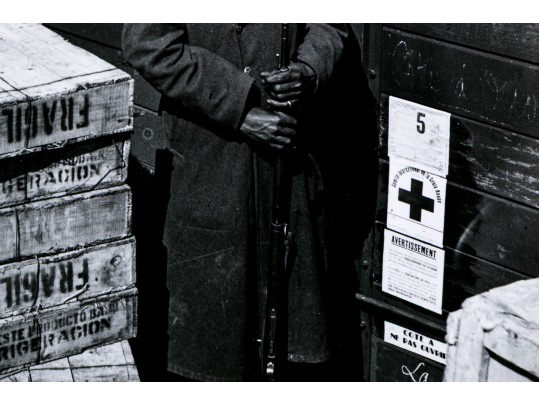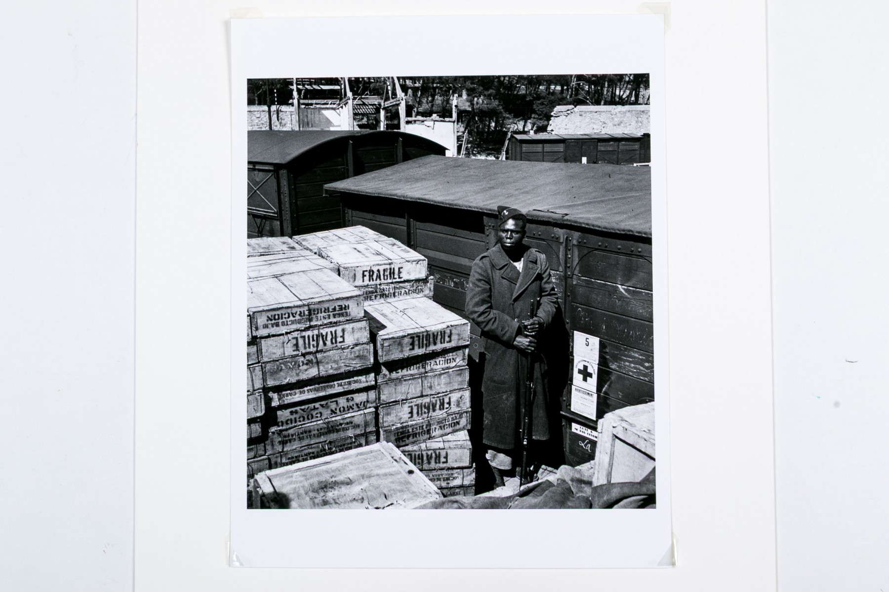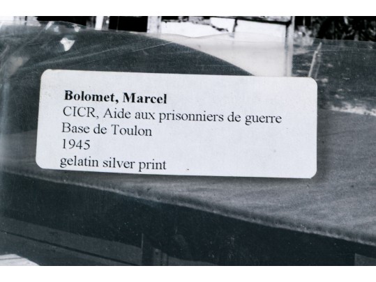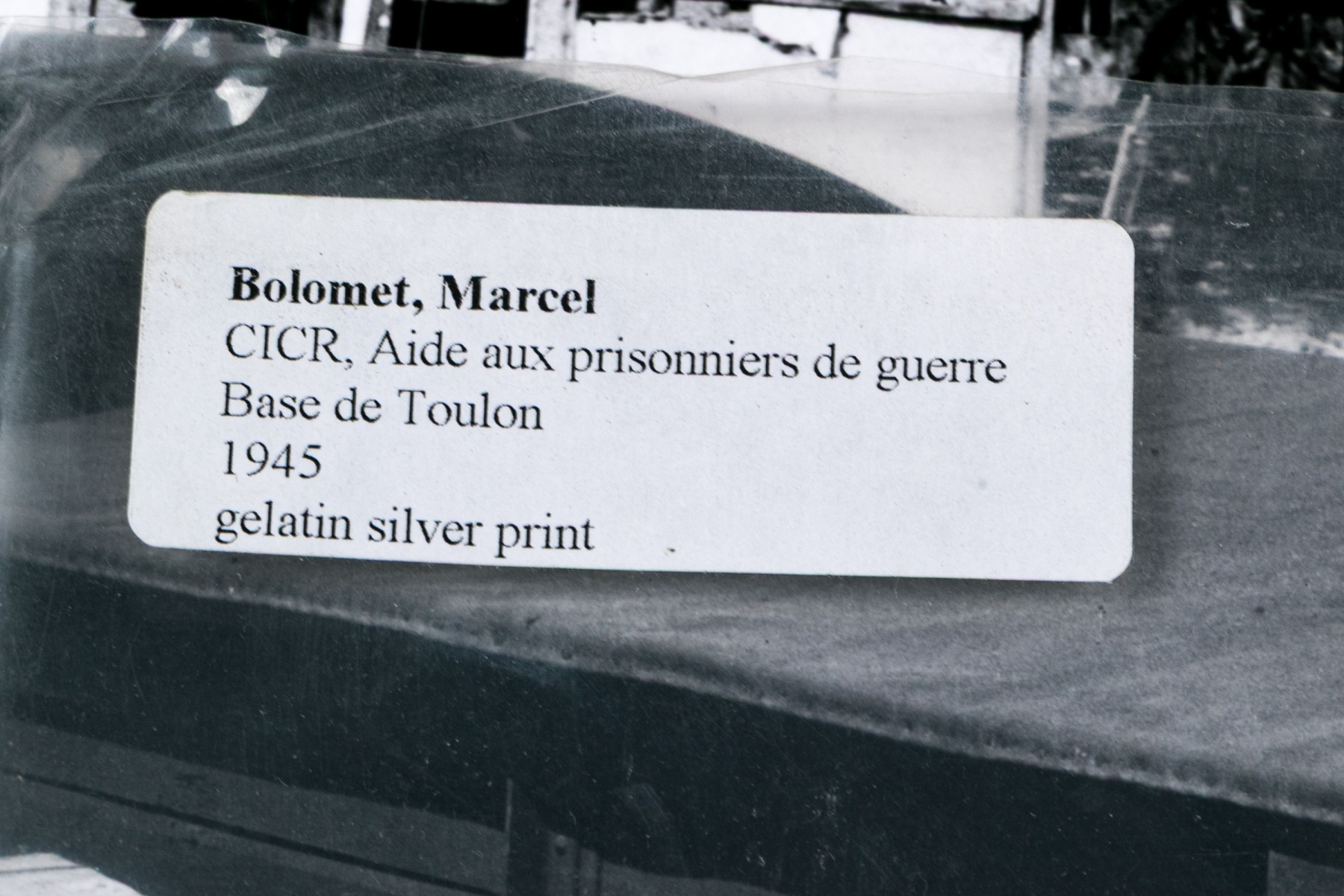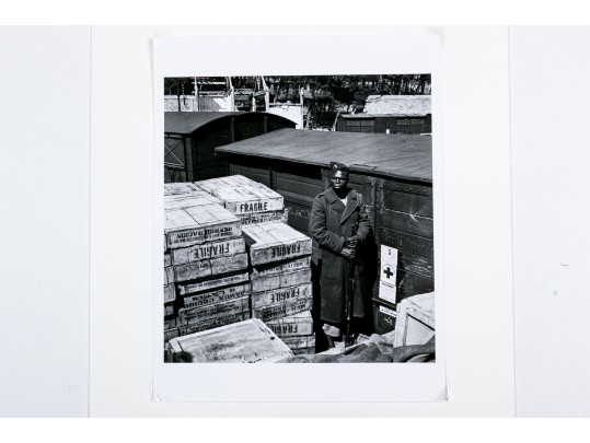 Marcel Bolomet (Swiss-French, 1905-2003) "C.I.C.R. Aide Aux Prisonniers De Guerre, Avril 1945, Base de Toulon" gelatin silver print depicting a man in a trench coat standing beside stacked crates and train cars in the background. Unframed.