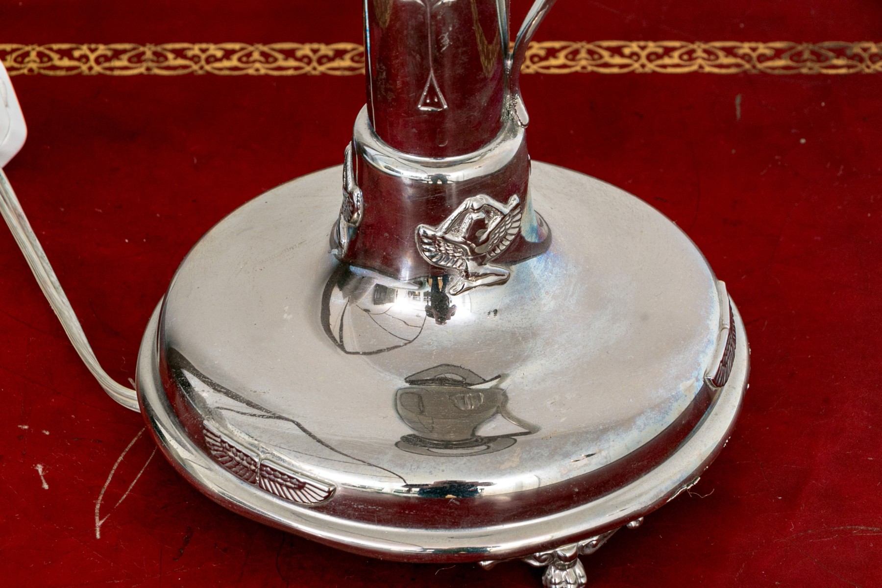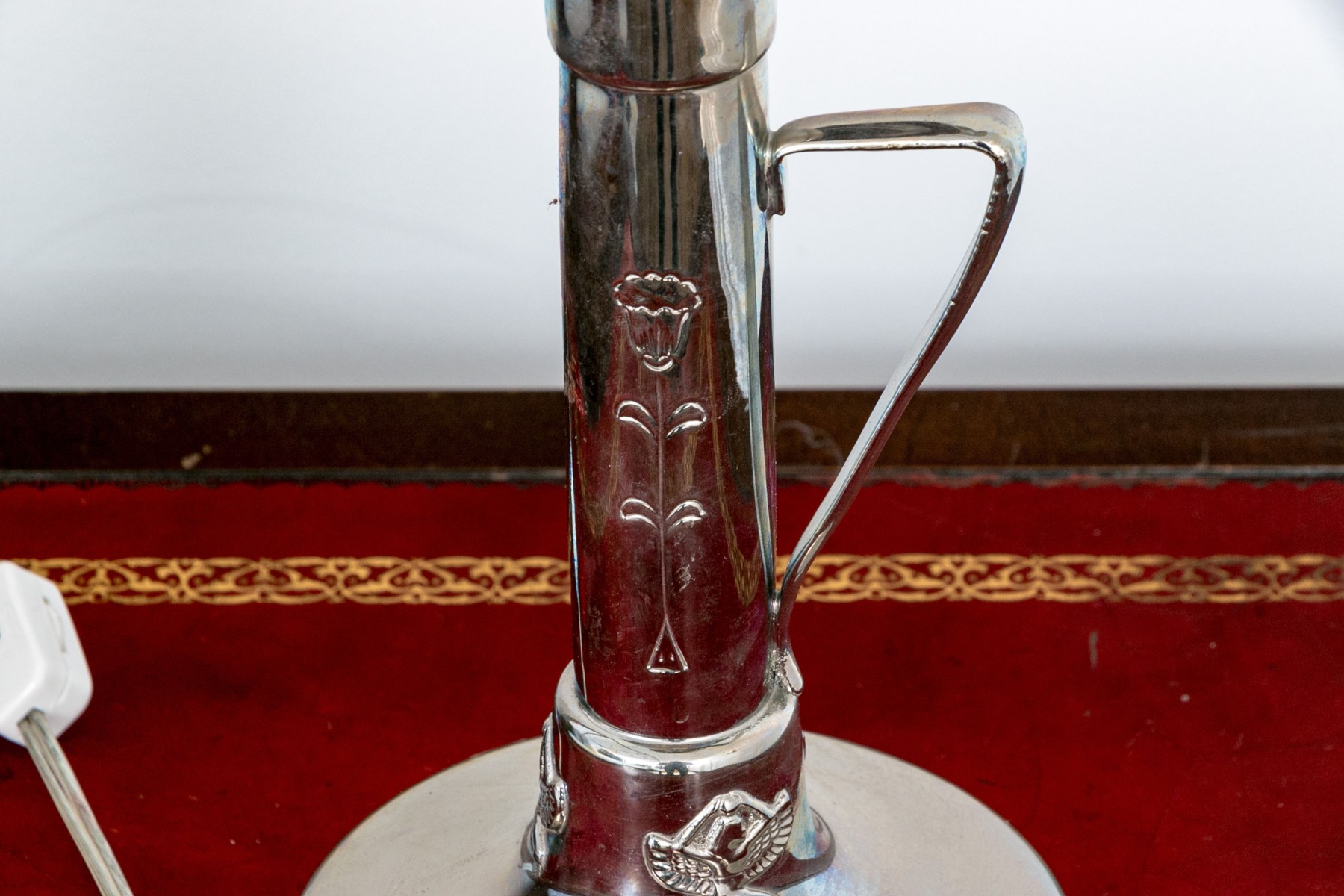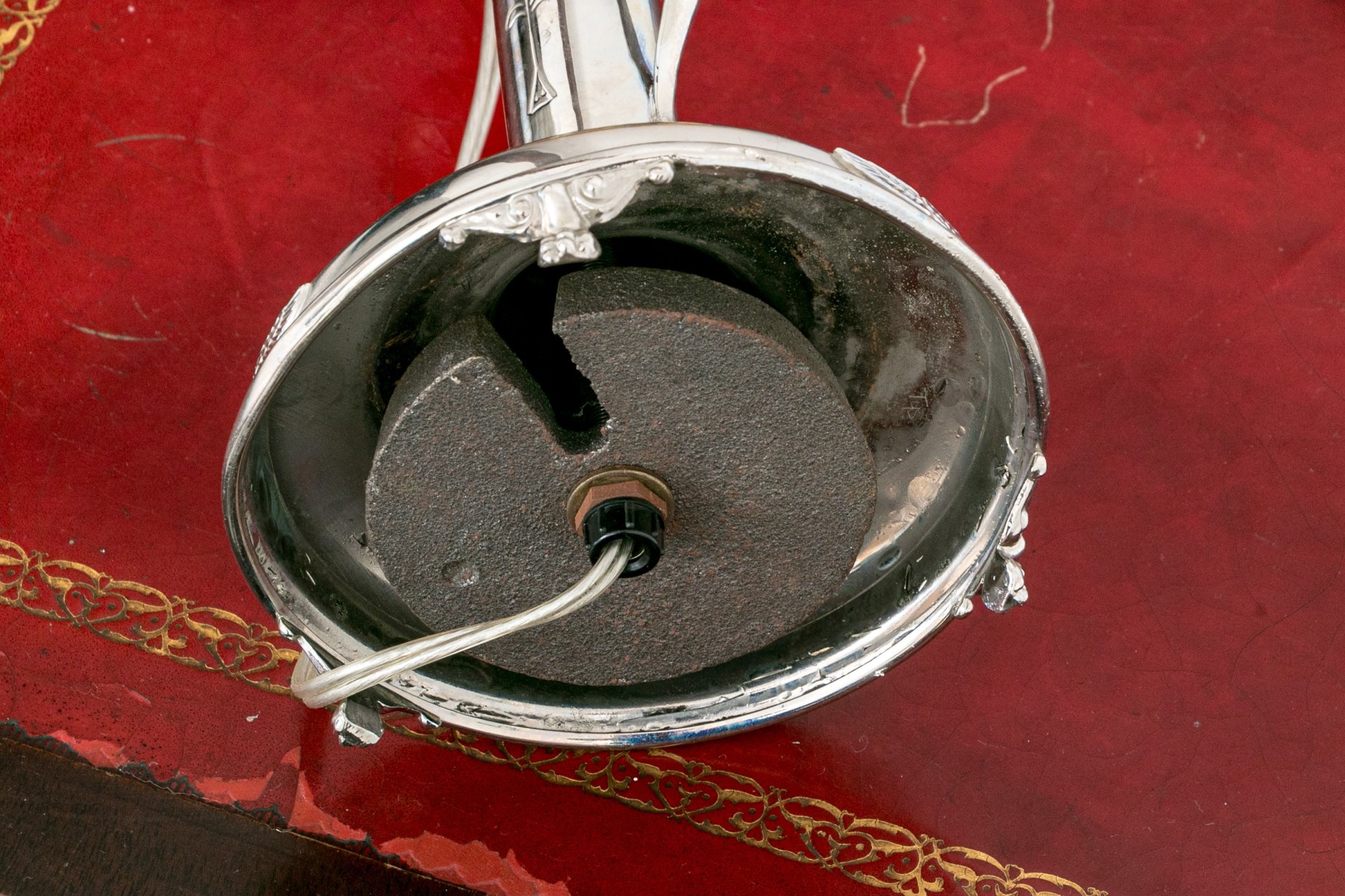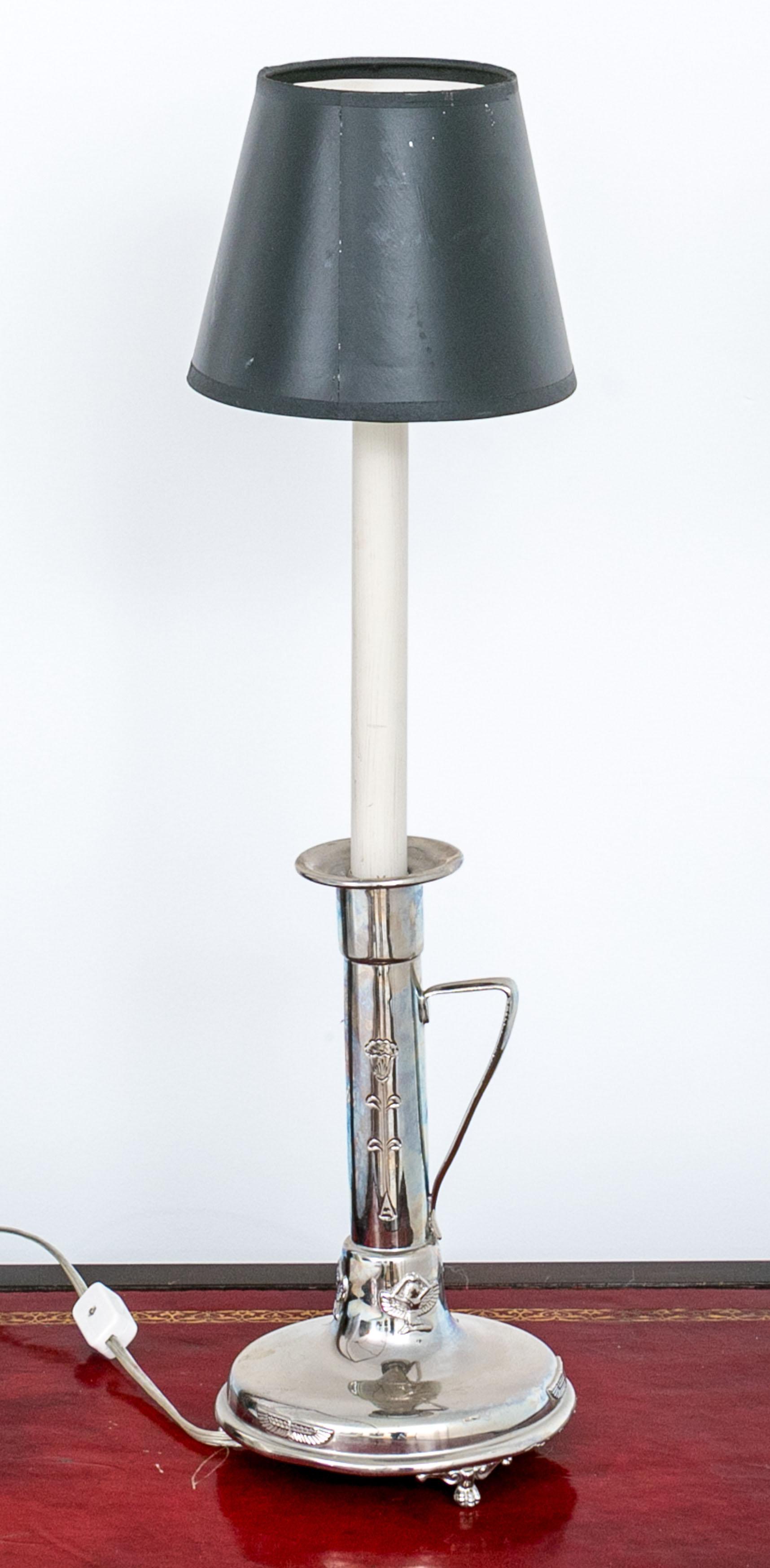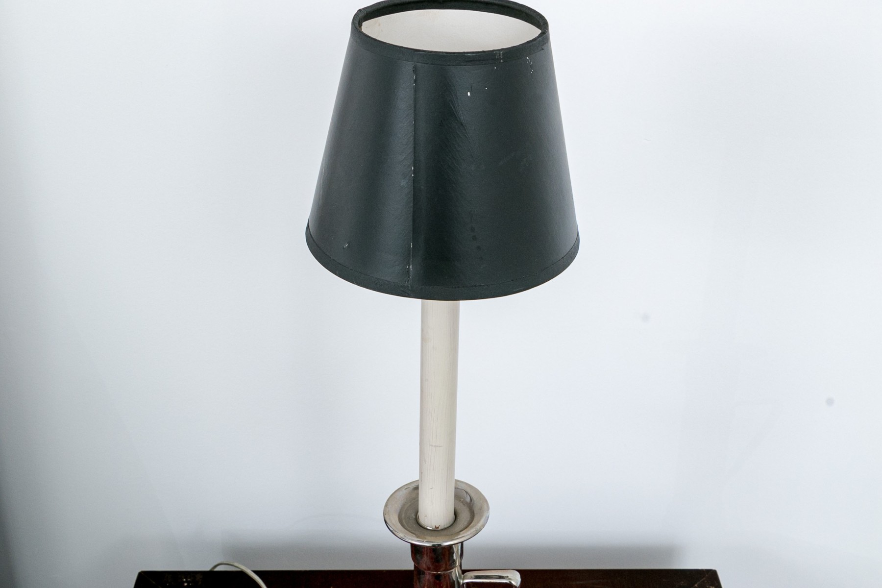 Condition: Some losses to the paint on the shades and some tarnishing to the base. Large blue stain to one of the shades and dripping down the candlestick. See images as they are part of the condition report.
