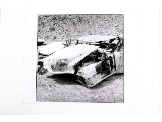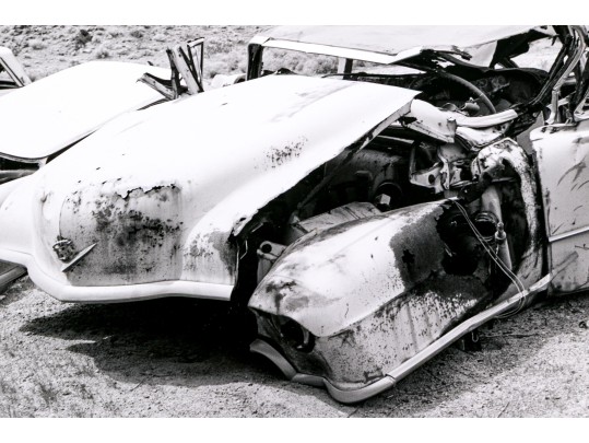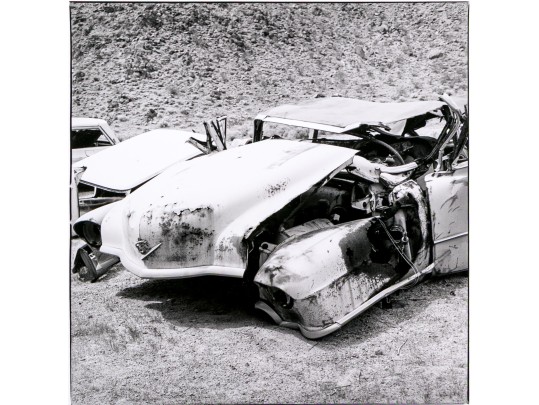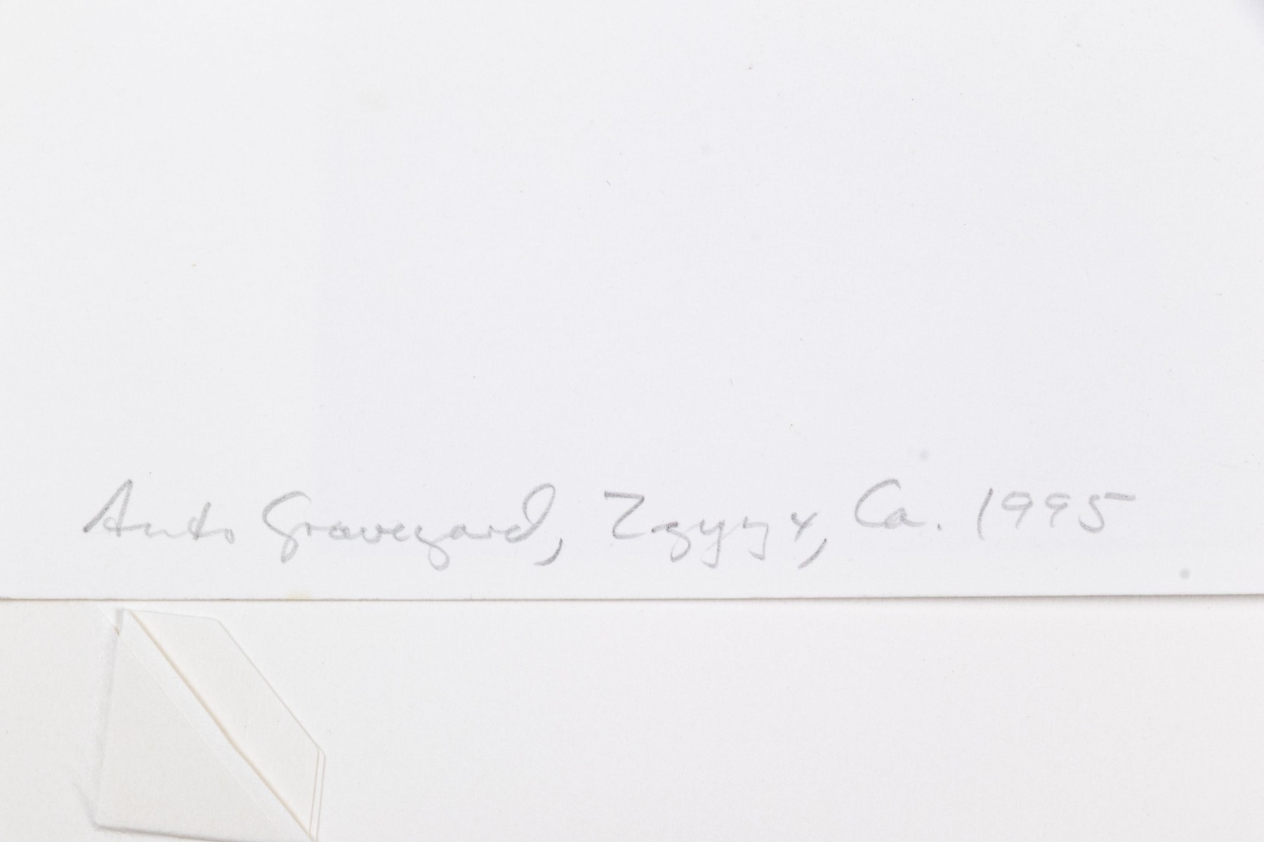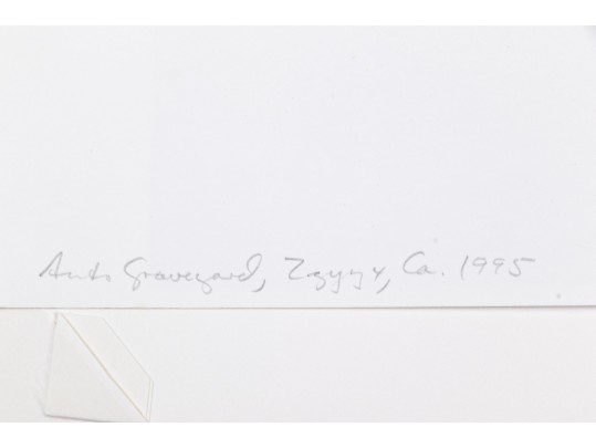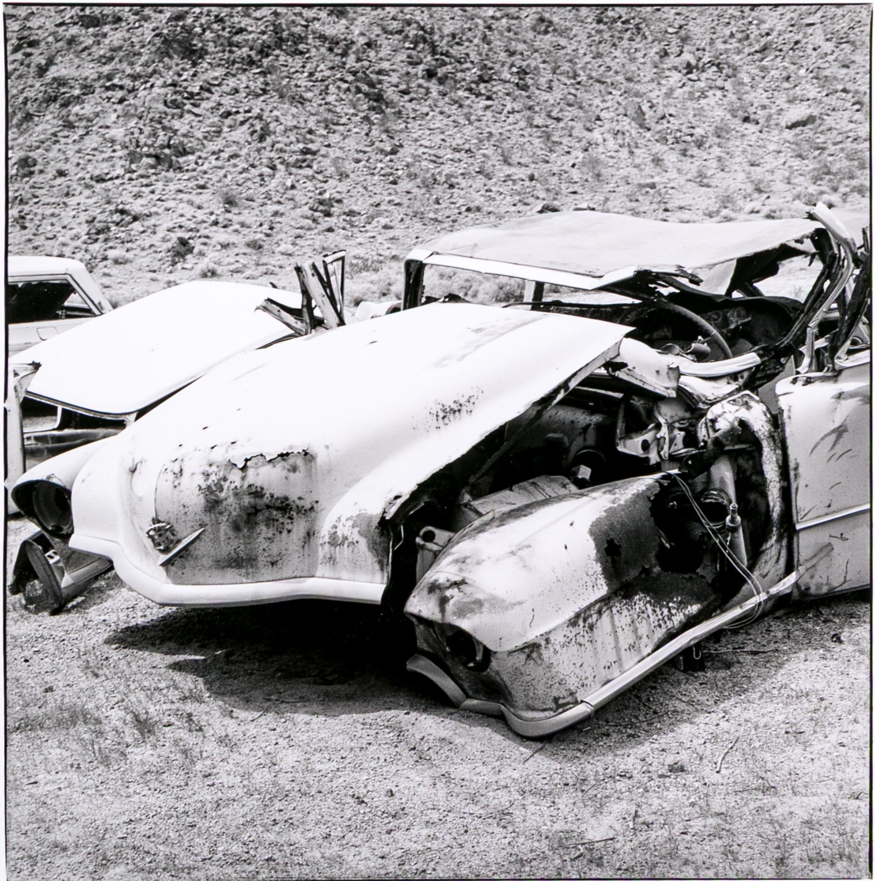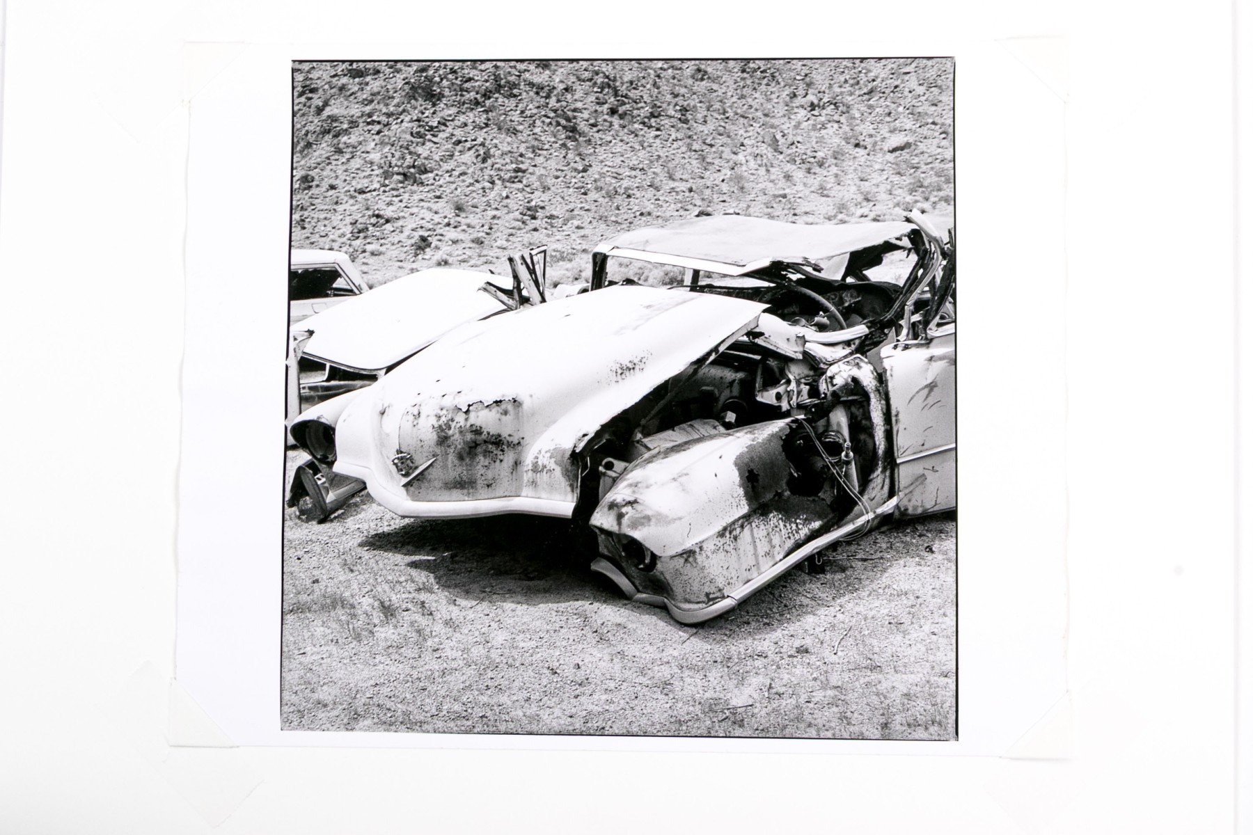 Michael Miller "Auto Graveyard, Zzyzx, CA, 1995" gelatin silver print depicting wrecked cars along the curve of an arid landscape. Pencil signed, numbered 1/10, and titled on the verso. Unframed.