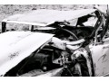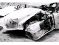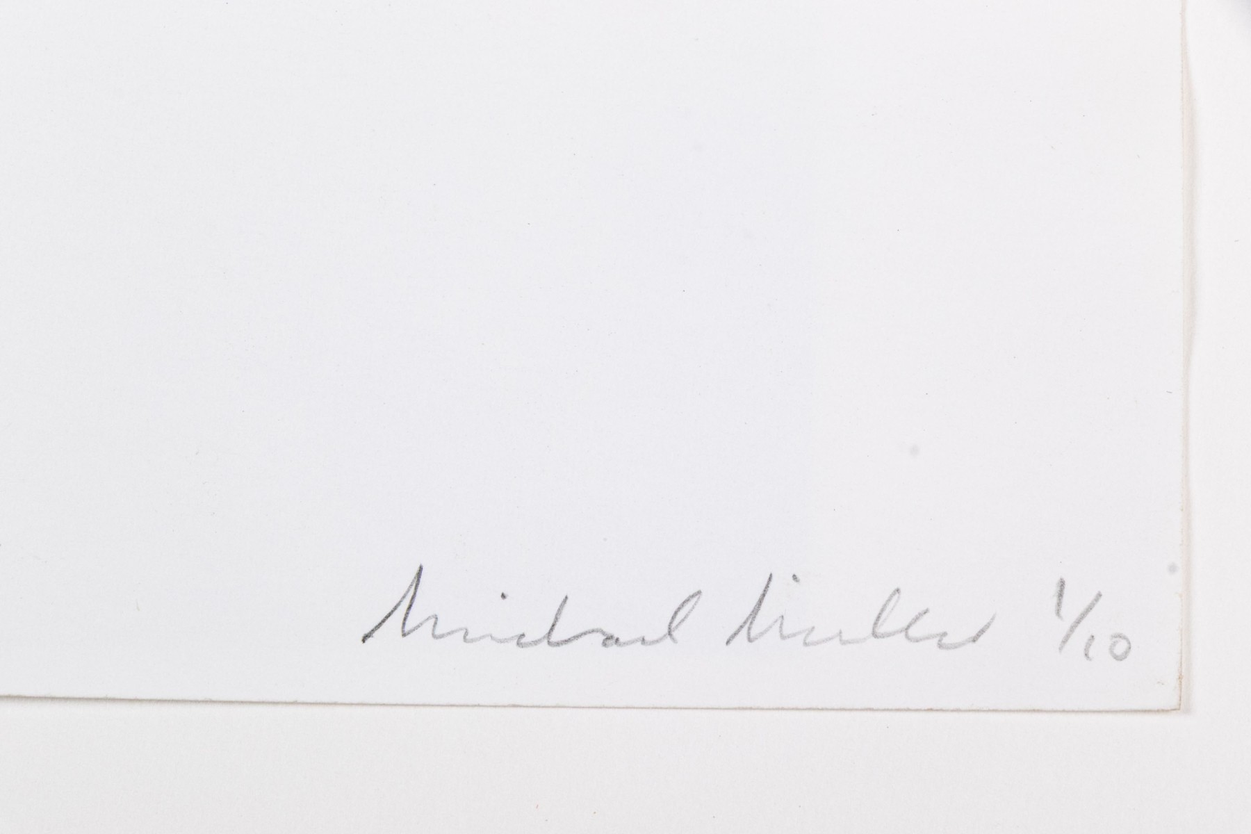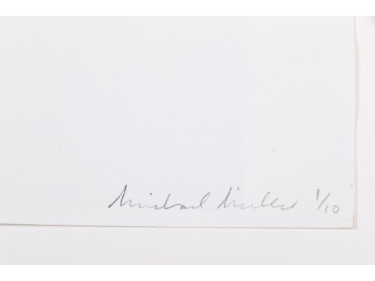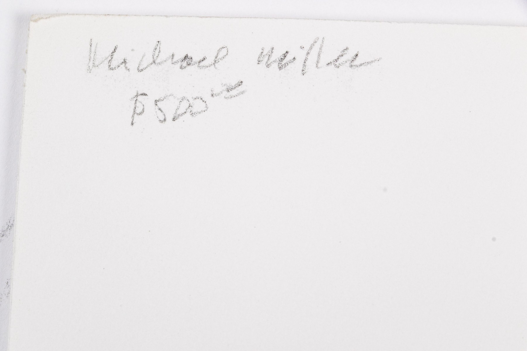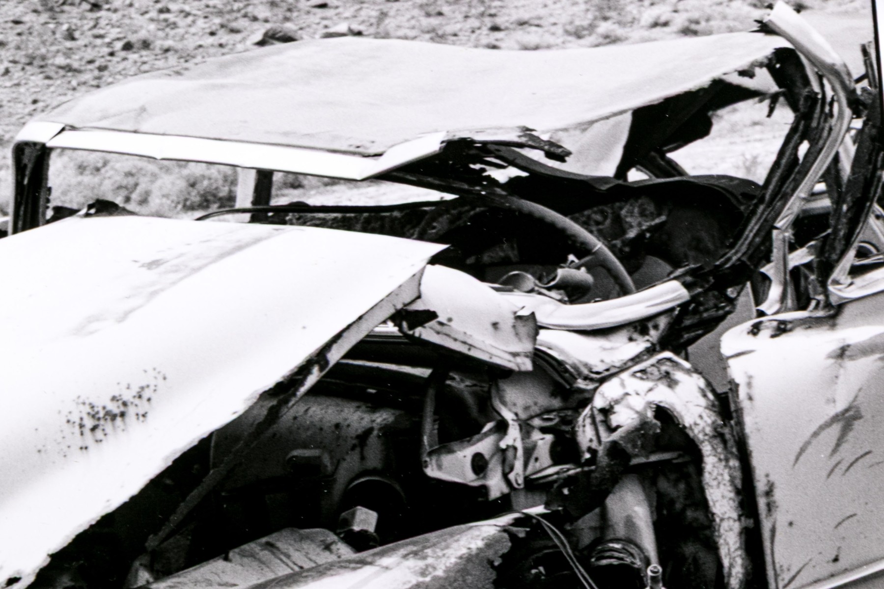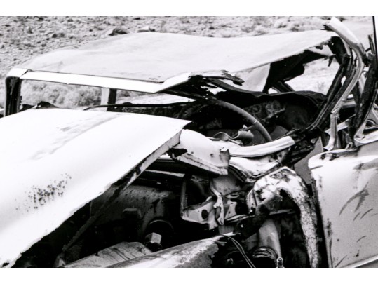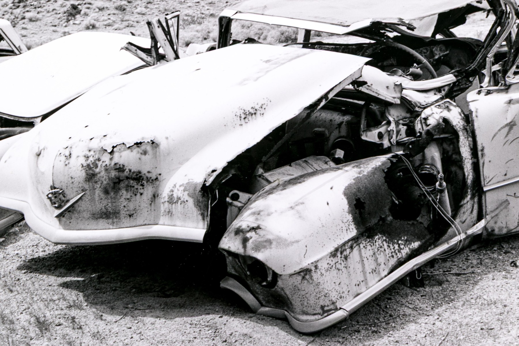 Michael Miller "Auto Graveyard, Zzyzx, CA, 1995" gelatin silver print depicting wrecked cars along the curve of an arid landscape. Pencil signed, numbered 1/10, and titled on the verso. Unframed.