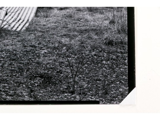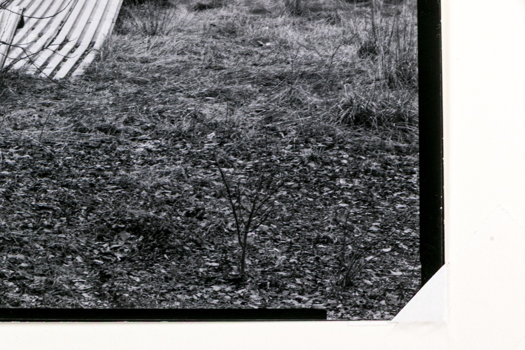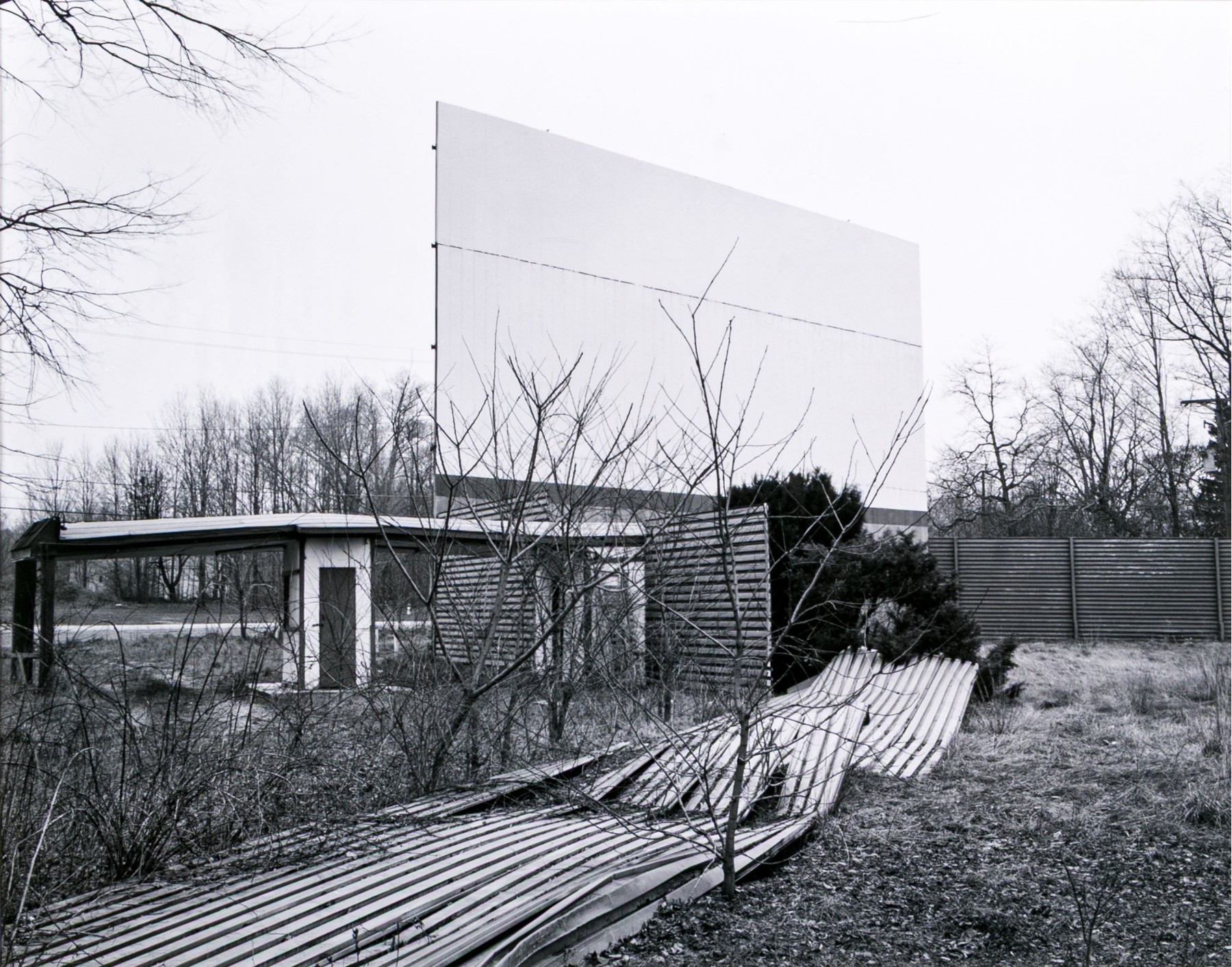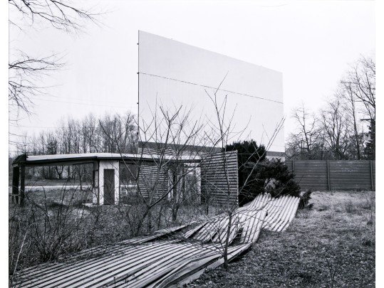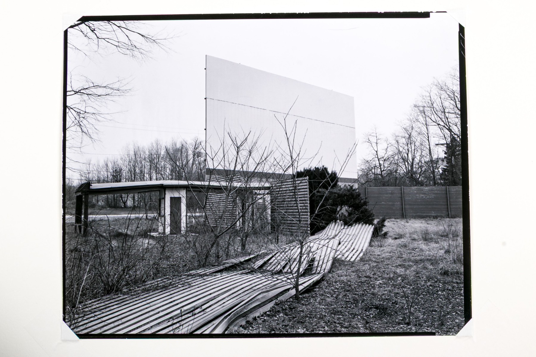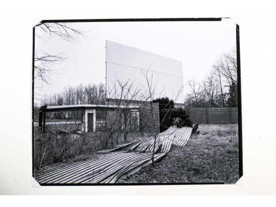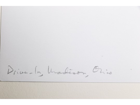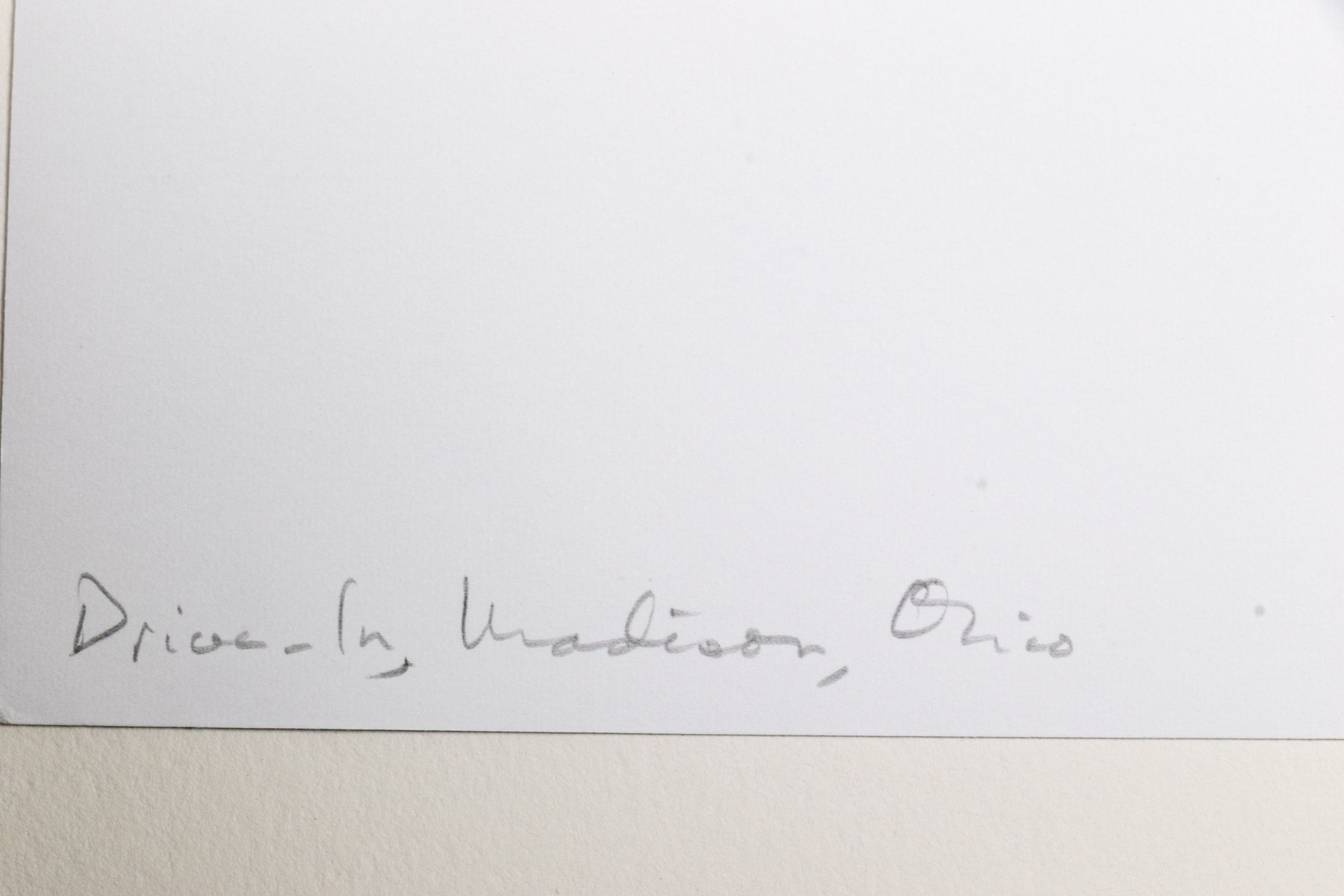 Michael Miller "Drive-In, Madison, Ohio" gelatin silver print a monochromatic scene with a rural drive-in with a tall sign at the front surrounded by Autumn trees. Pencil signed, numbered 1/10, and titled on the verso. Unframed.