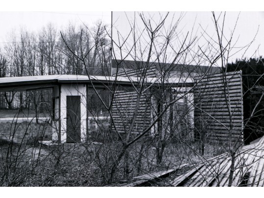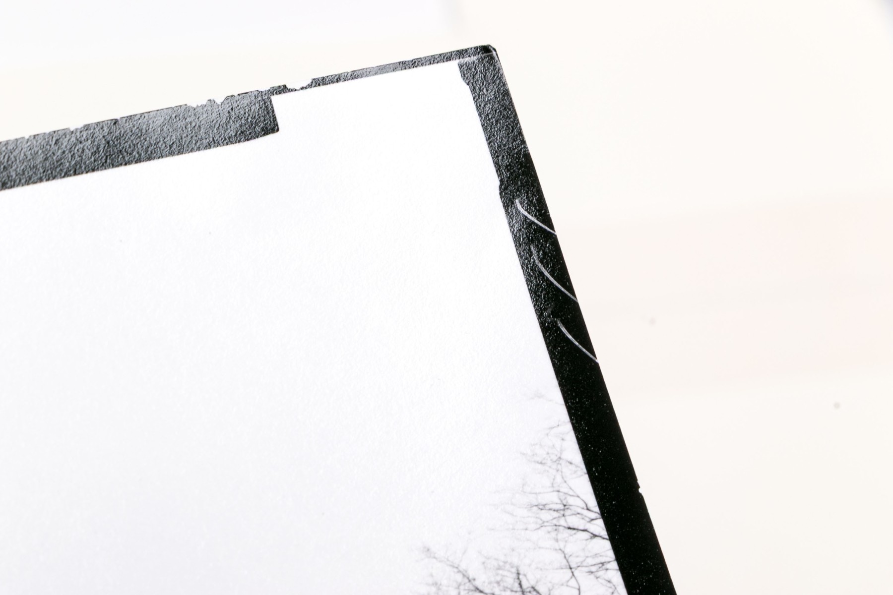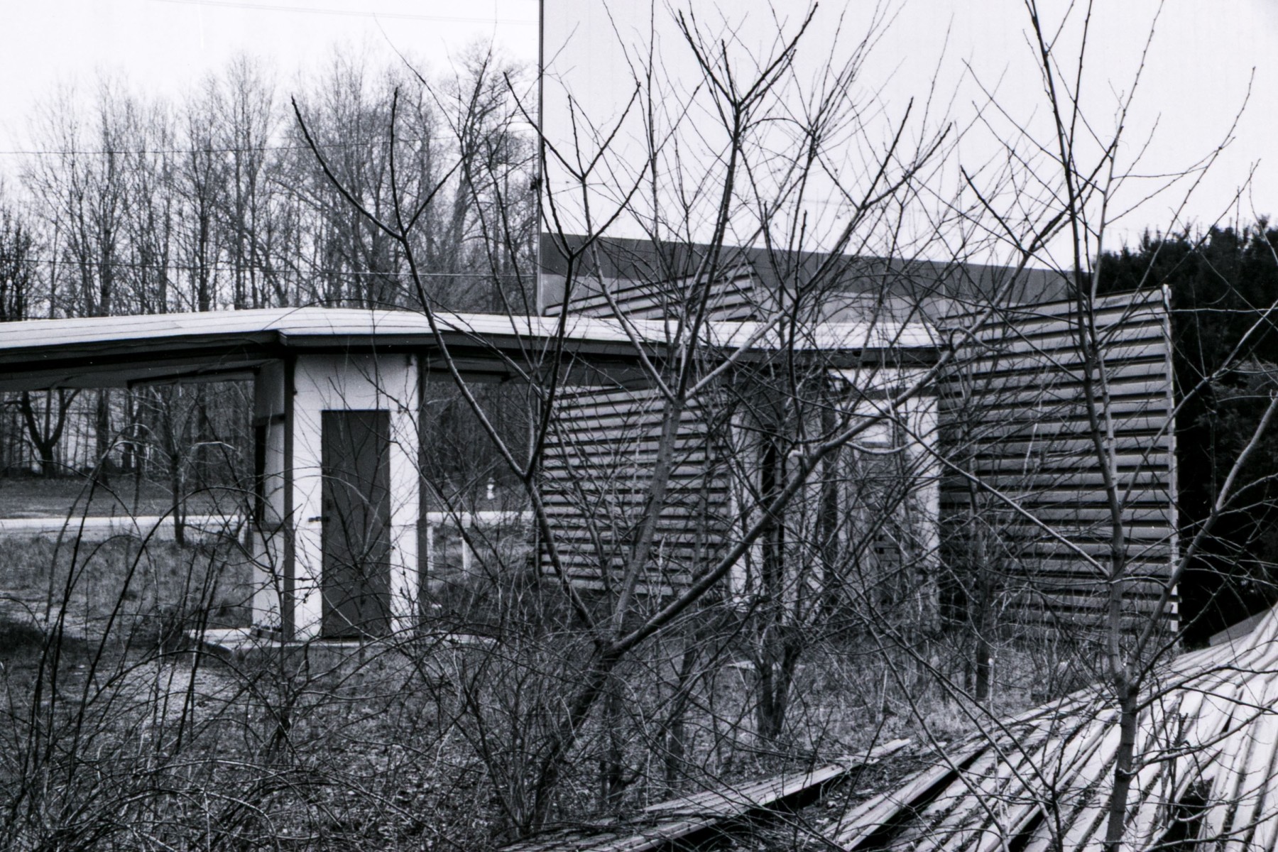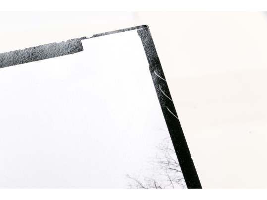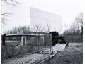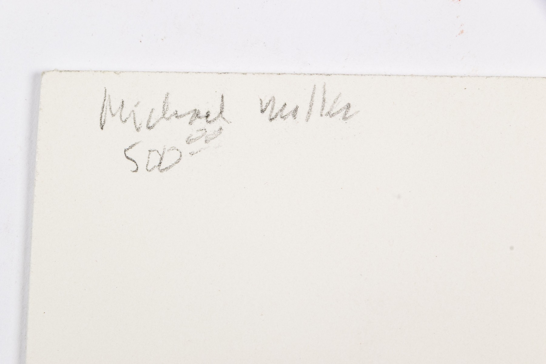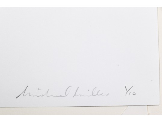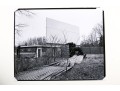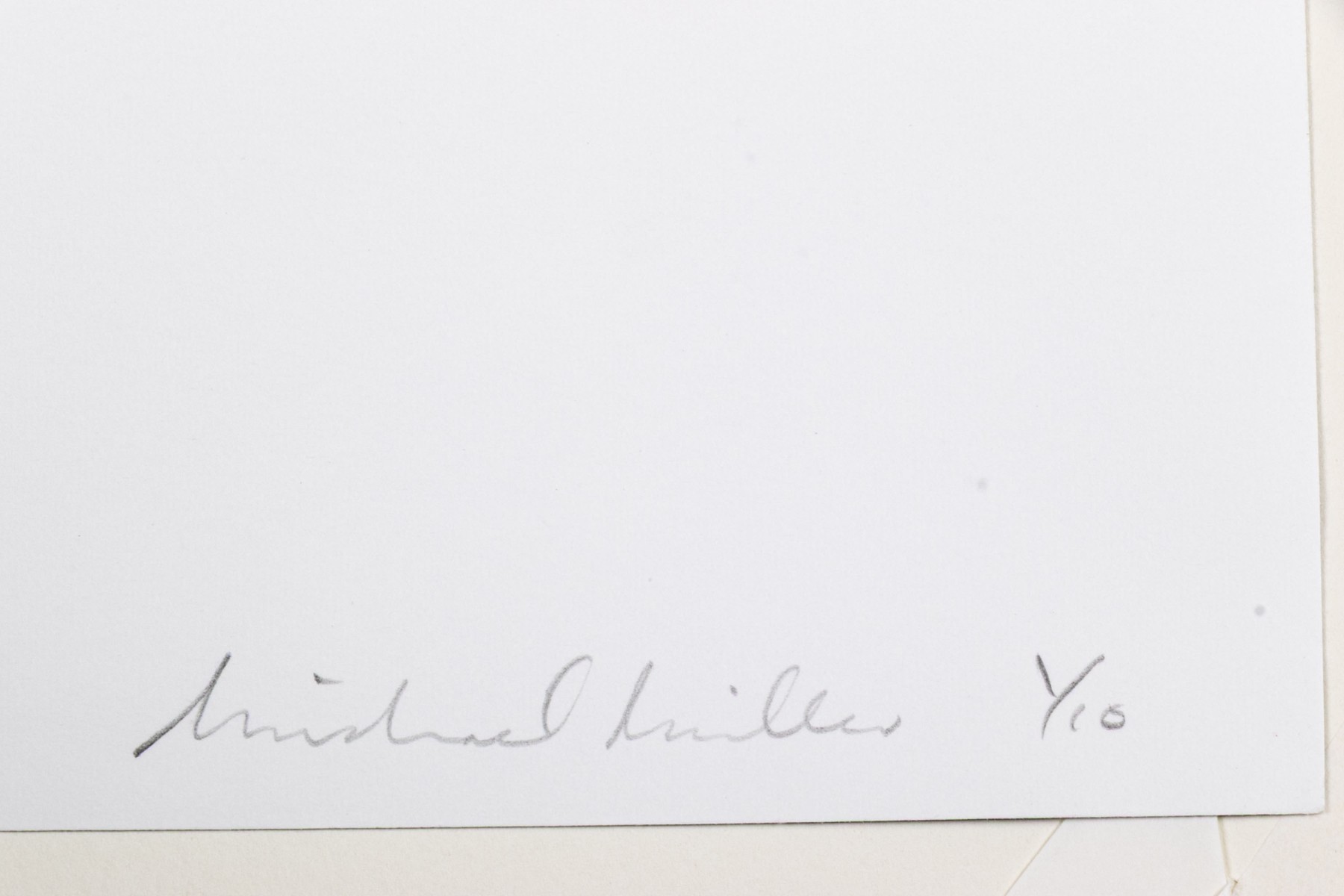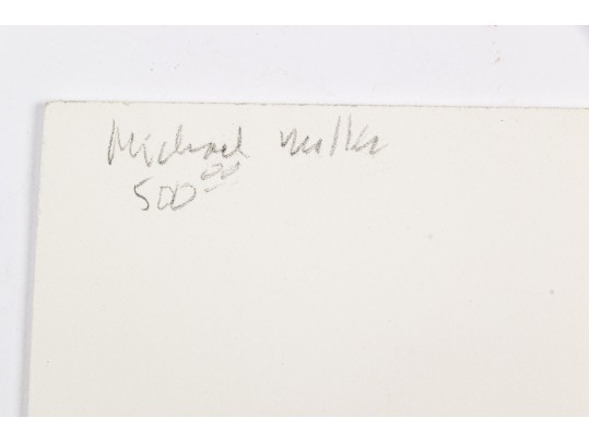 Michael Miller "Drive-In, Madison, Ohio" gelatin silver print a monochromatic scene with a rural drive-in with a tall sign at the front surrounded by Autumn trees. Pencil signed, numbered 1/10, and titled on the verso. Unframed.
