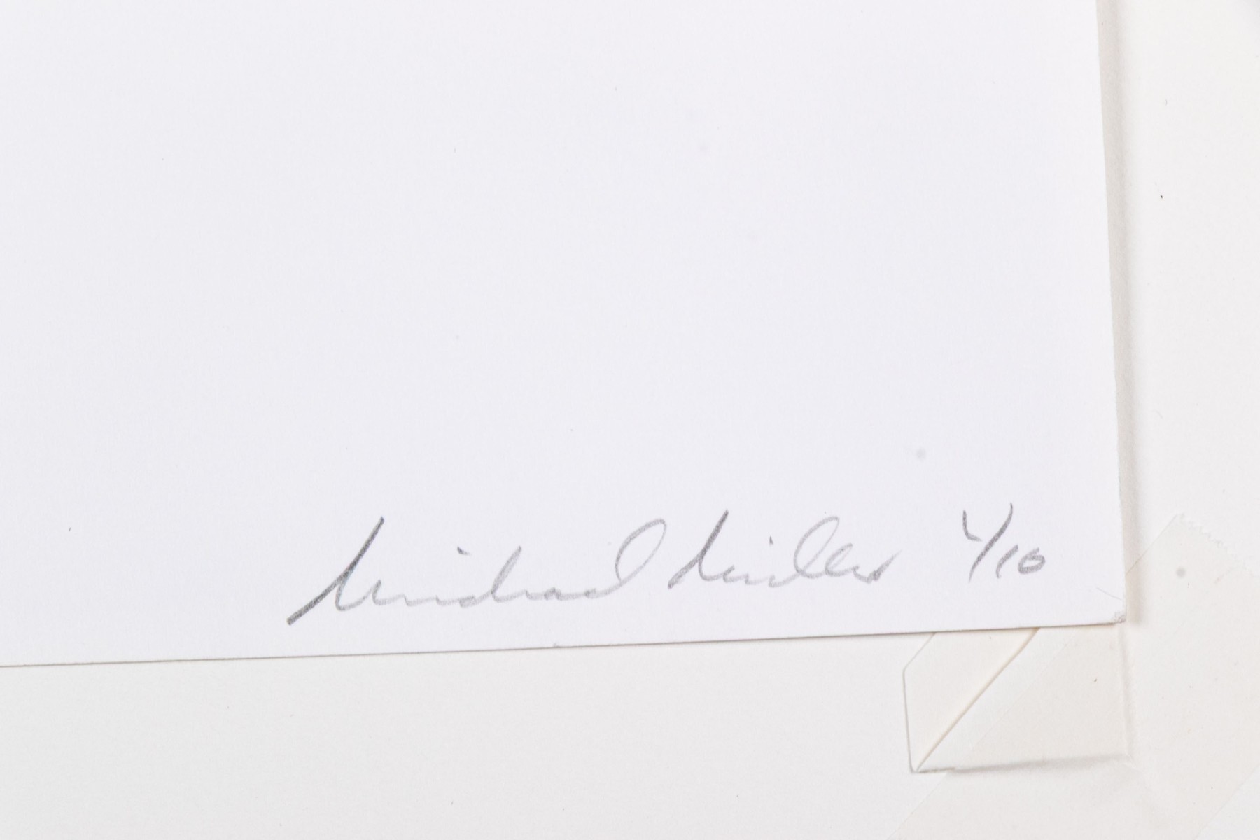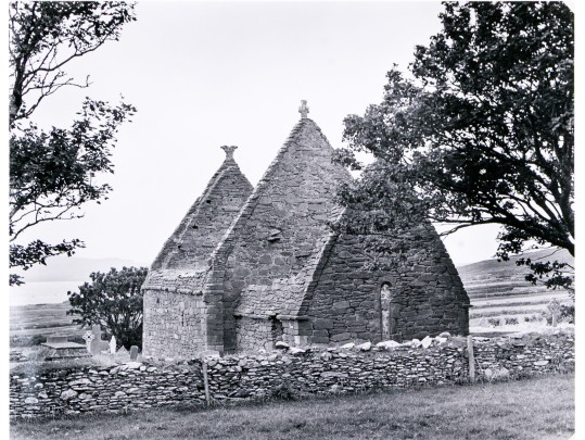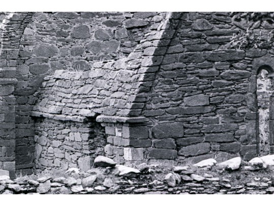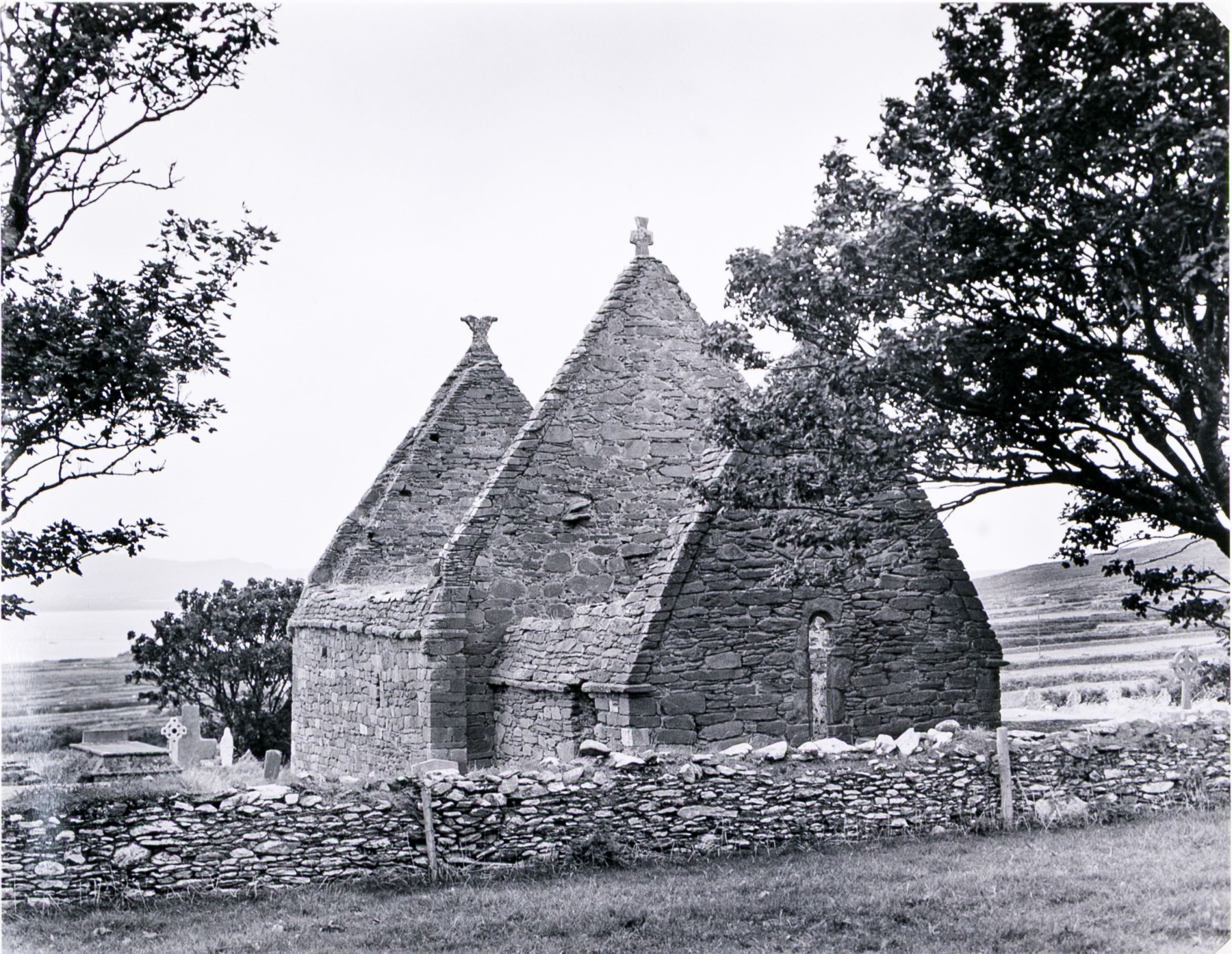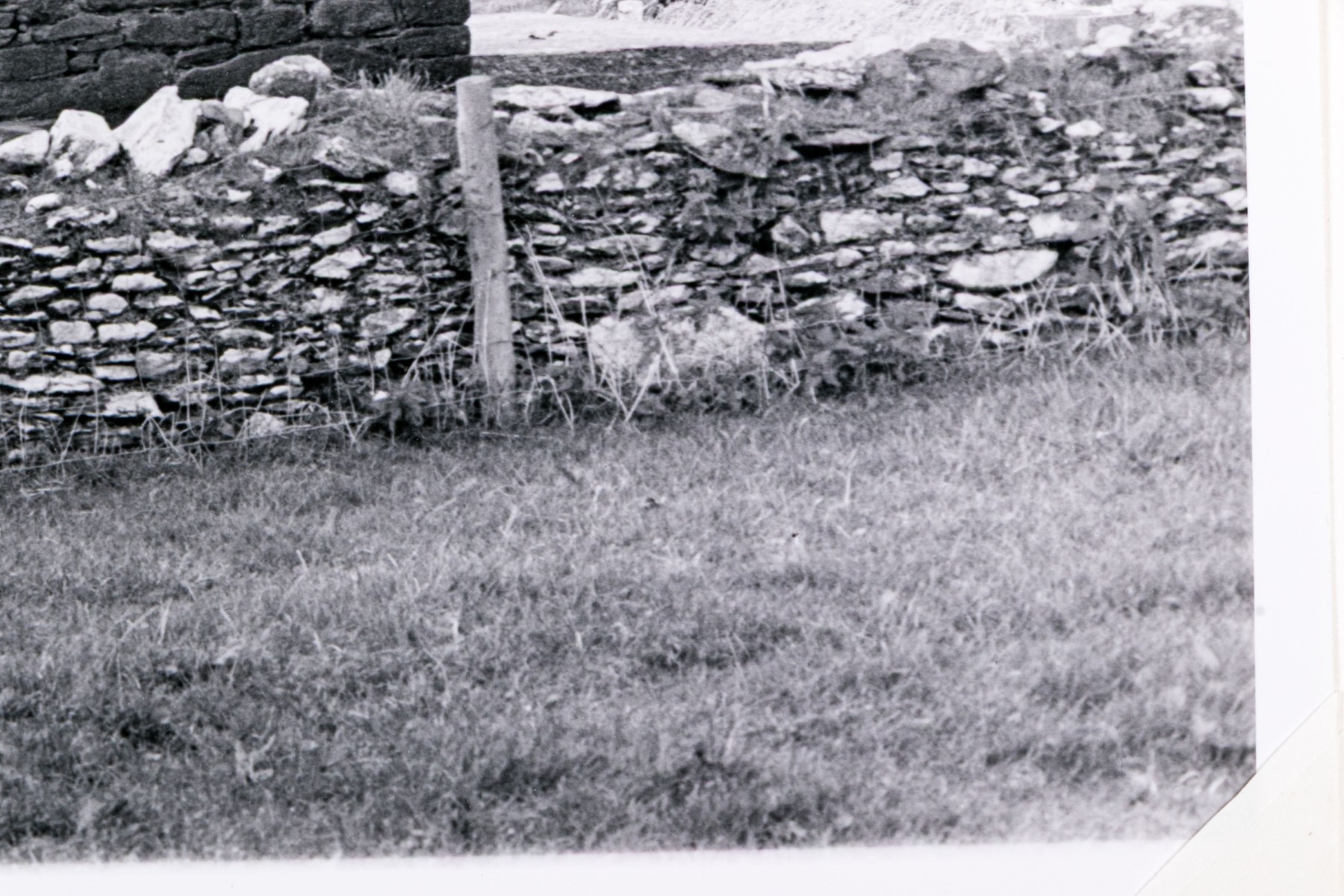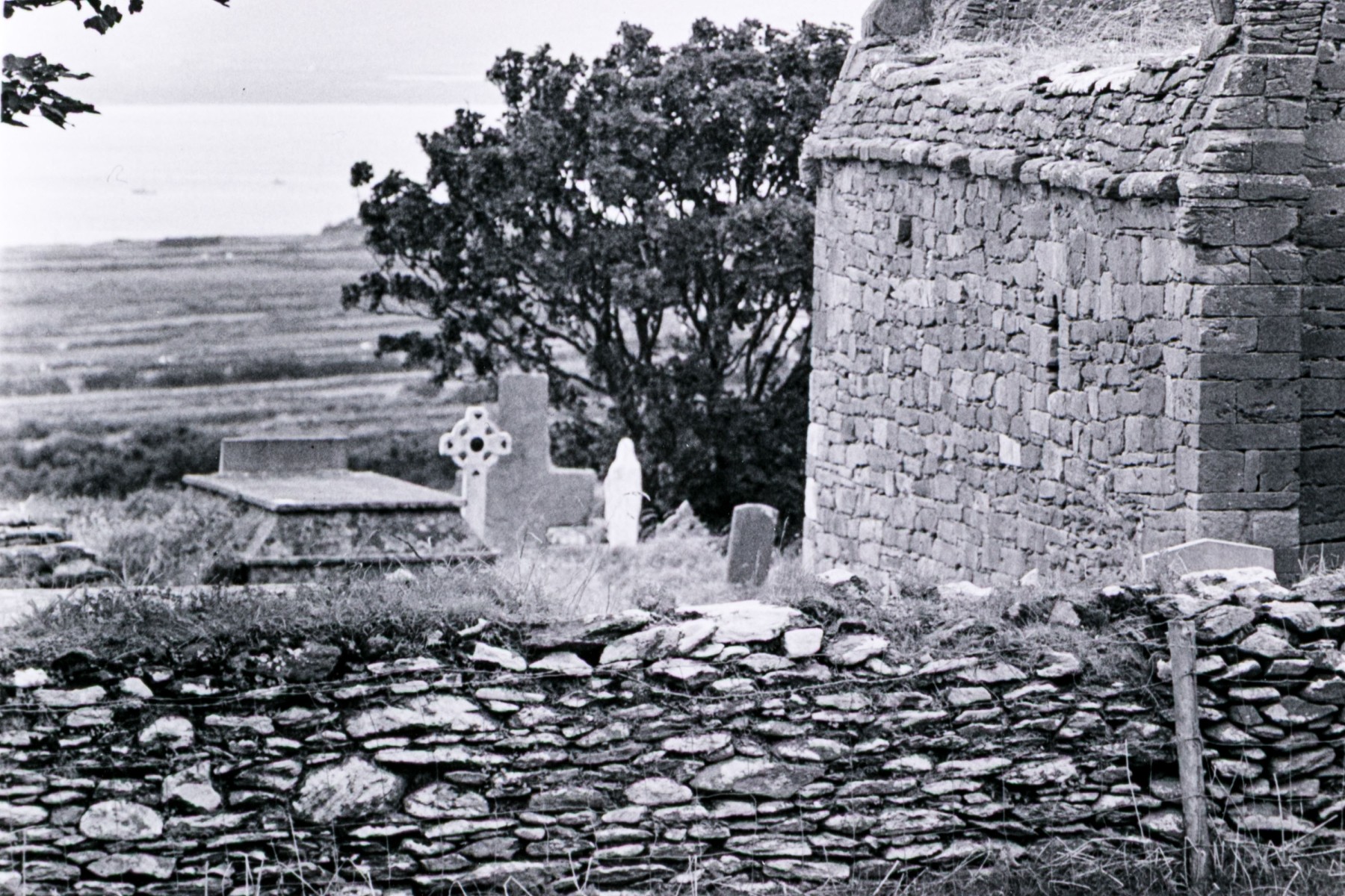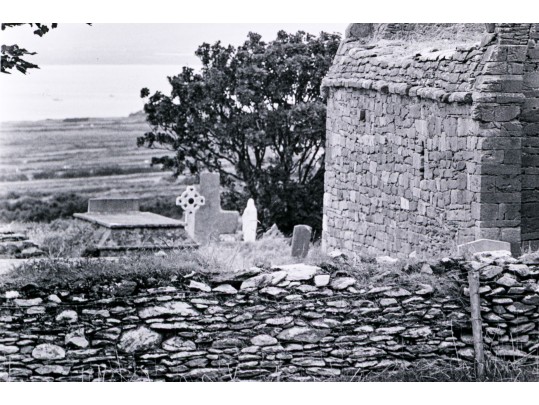 A wonderful Michael Miller gelatin silver print depicting Kilmalkedar Church, Ireland, with stone architecture and a stone fence near gravestones. Pencil signed and numbered 1/10 on the verso. Unframed.