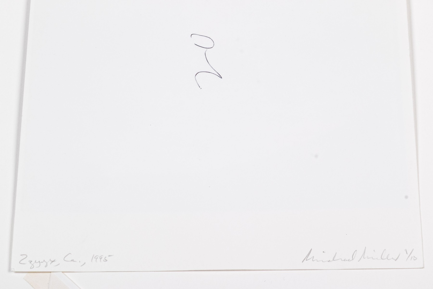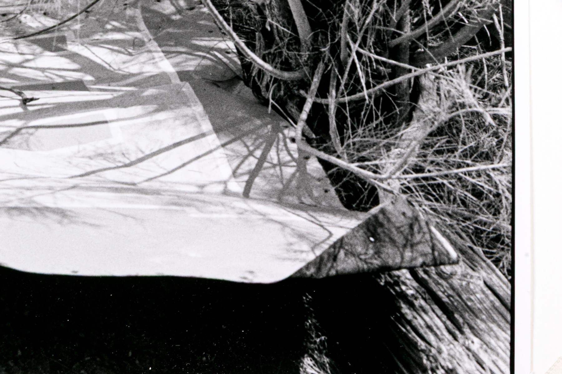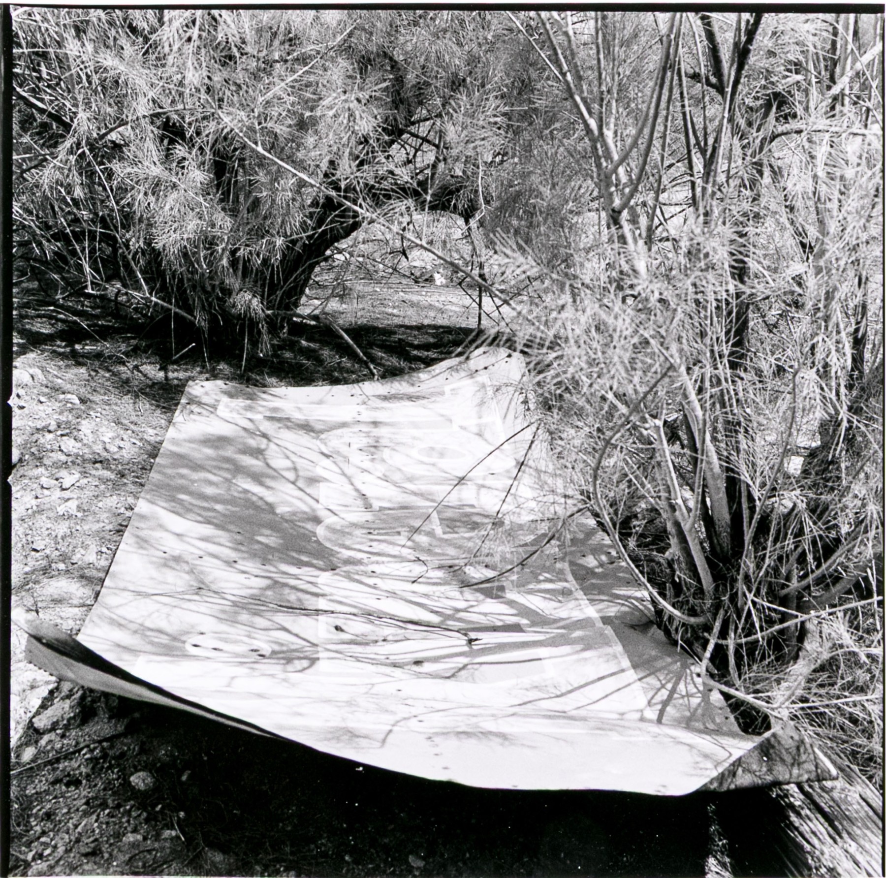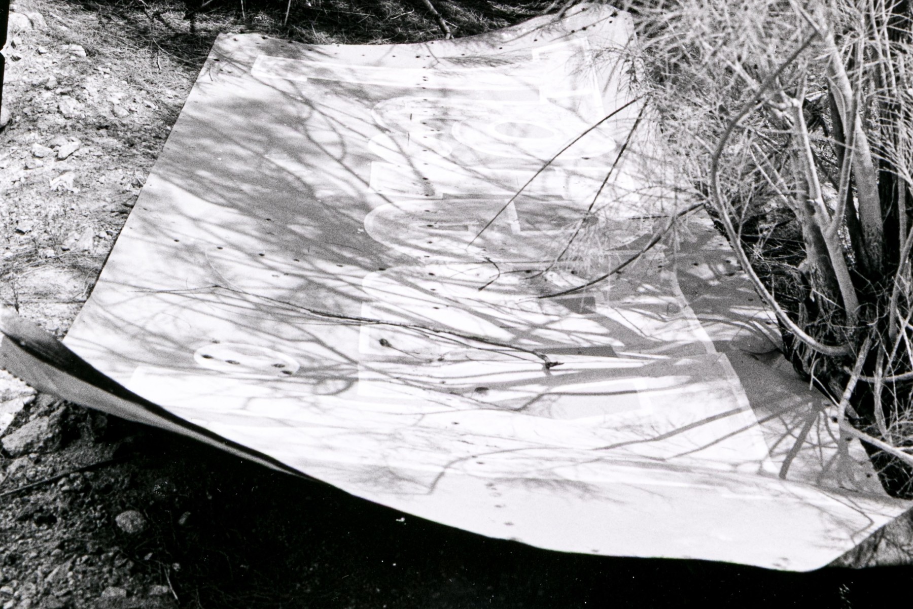 Michael Miller "Zzyzx, Ca, 1995" gelatin silver print depicting a large banner with text laid on a dirt ground surrounded by foliage. Pencil signed, numbered 1/10, and titled on the verso. Unframed.