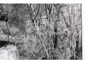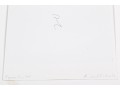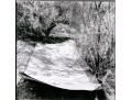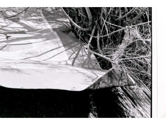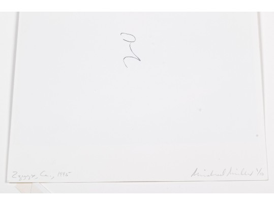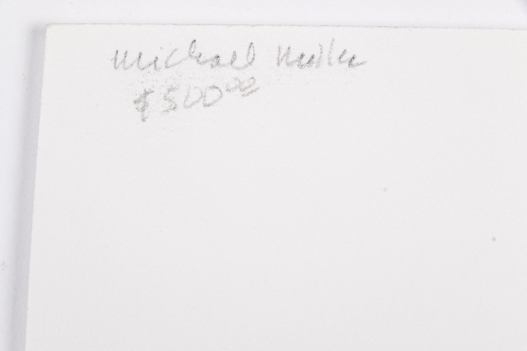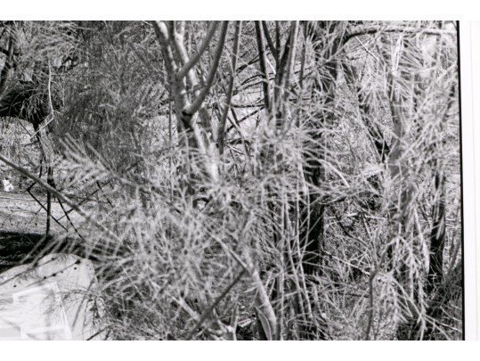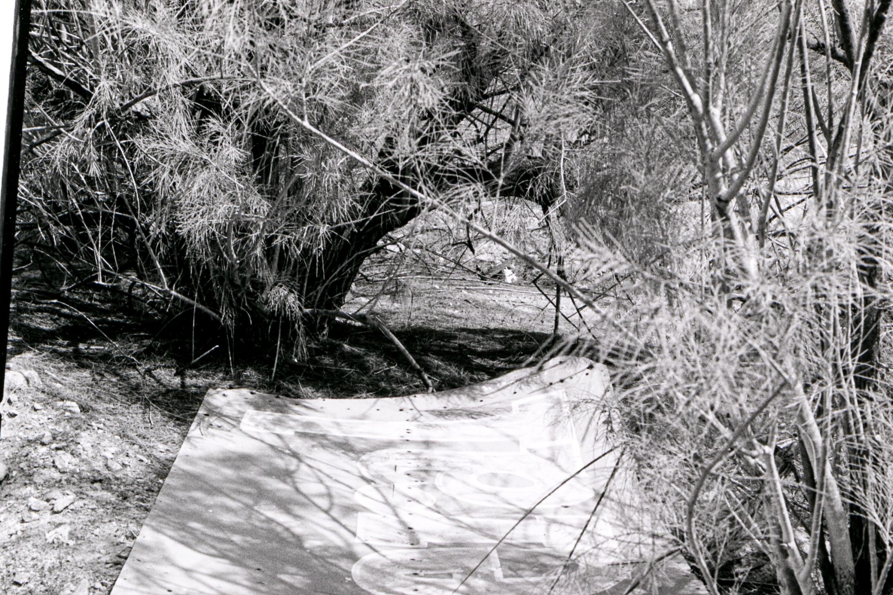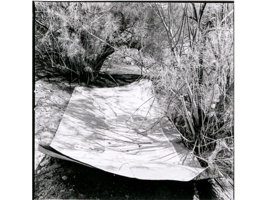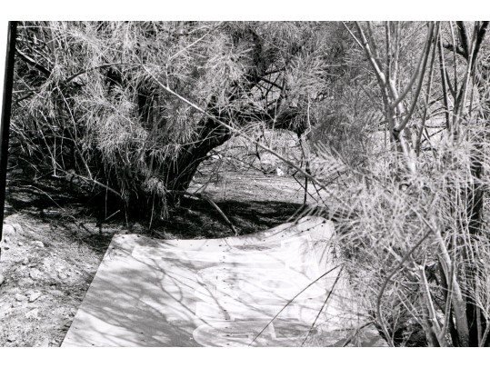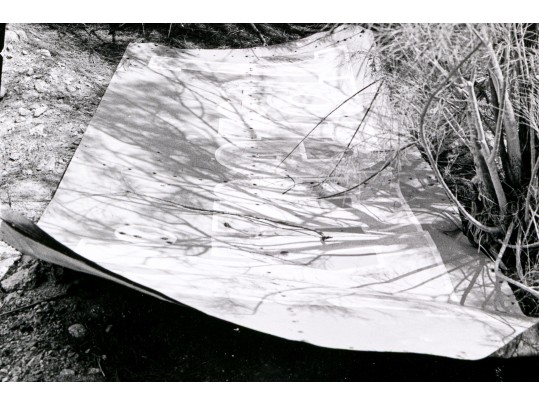 Michael Miller "Zzyzx, Ca, 1995" gelatin silver print depicting a large banner with text laid on a dirt ground surrounded by foliage. Pencil signed, numbered 1/10, and titled on the verso. Unframed.
