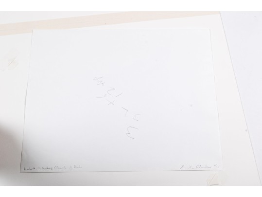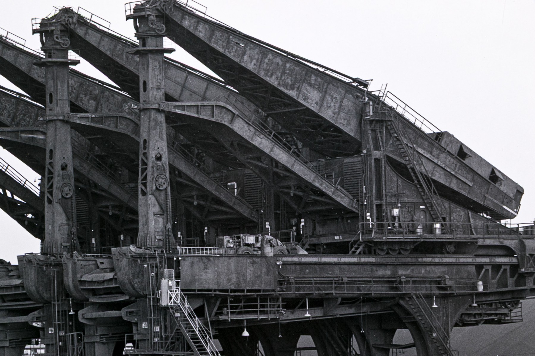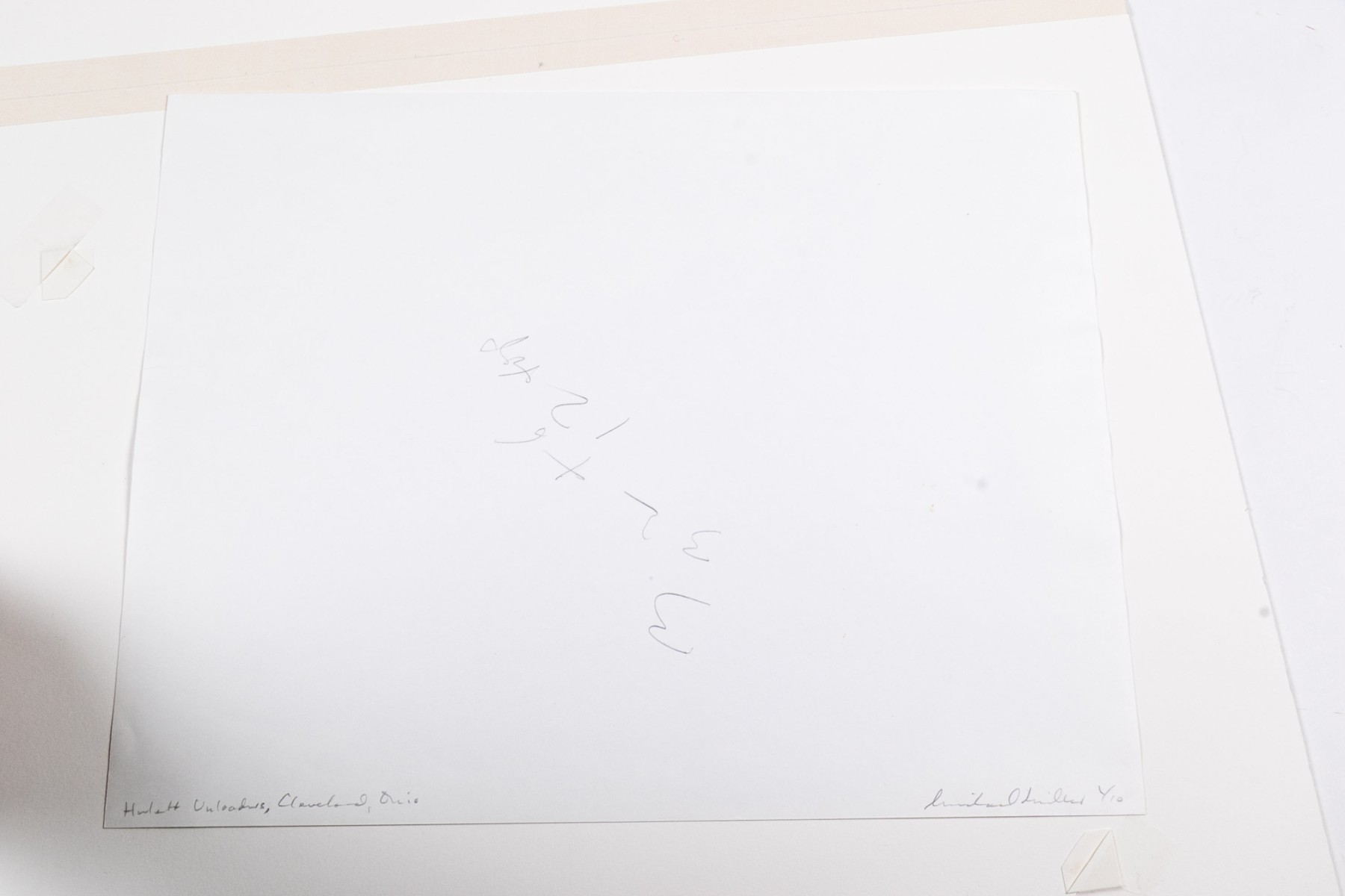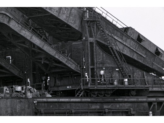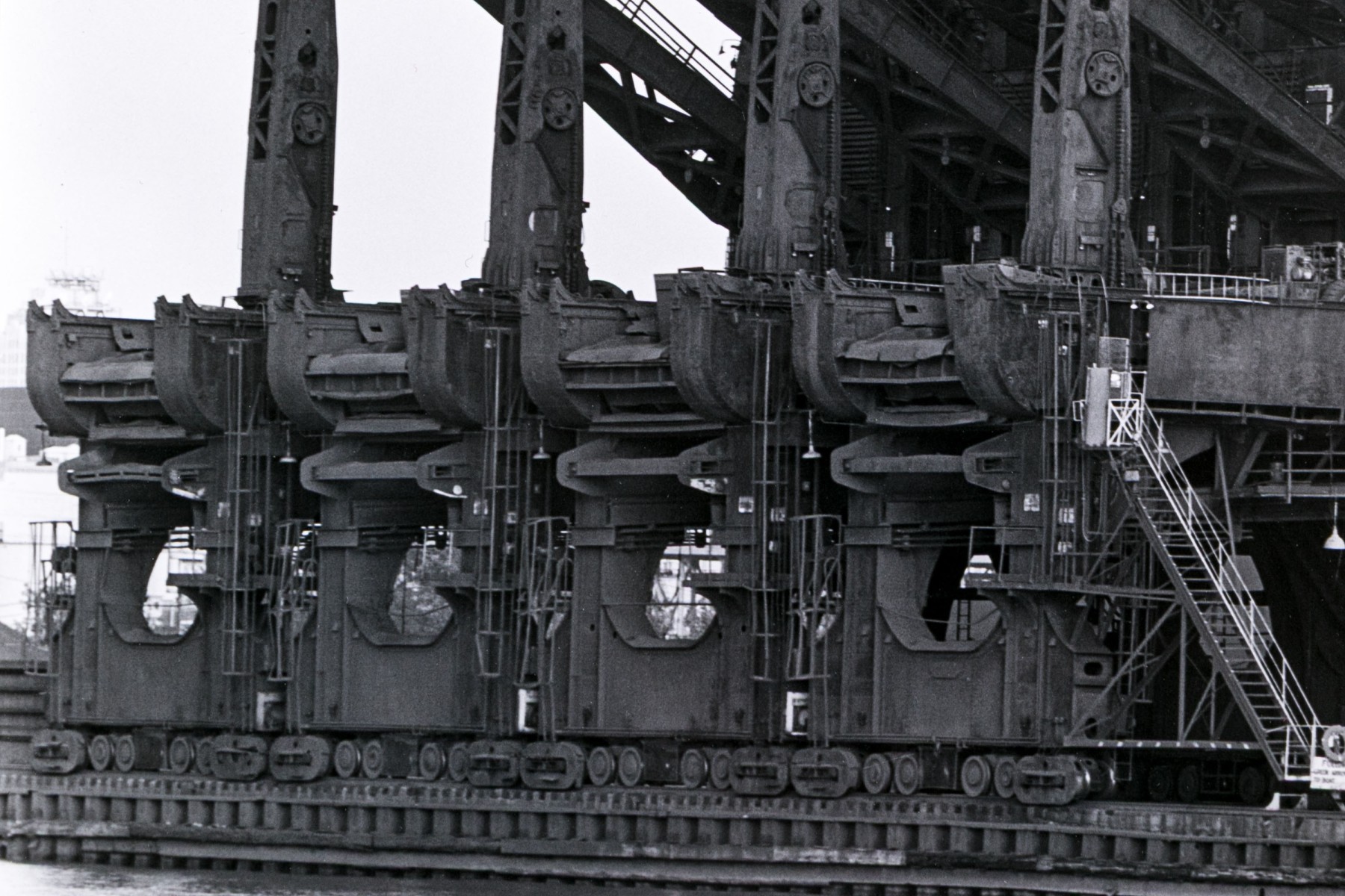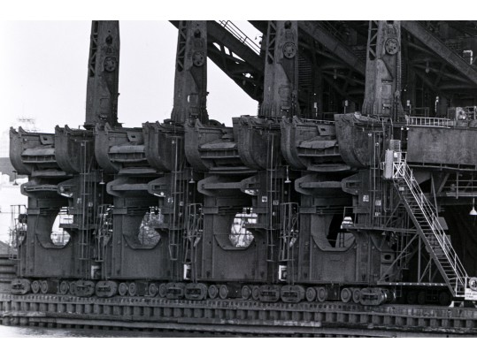 Michael Millers "Hulett Unloaders, Cleveland, Ohio" gelatin silver print depicting impressive industrial ore unloader near water and mountains under a clear sky. Pencil signed, numbered 1/10, and titled on the verso. Unframed.
