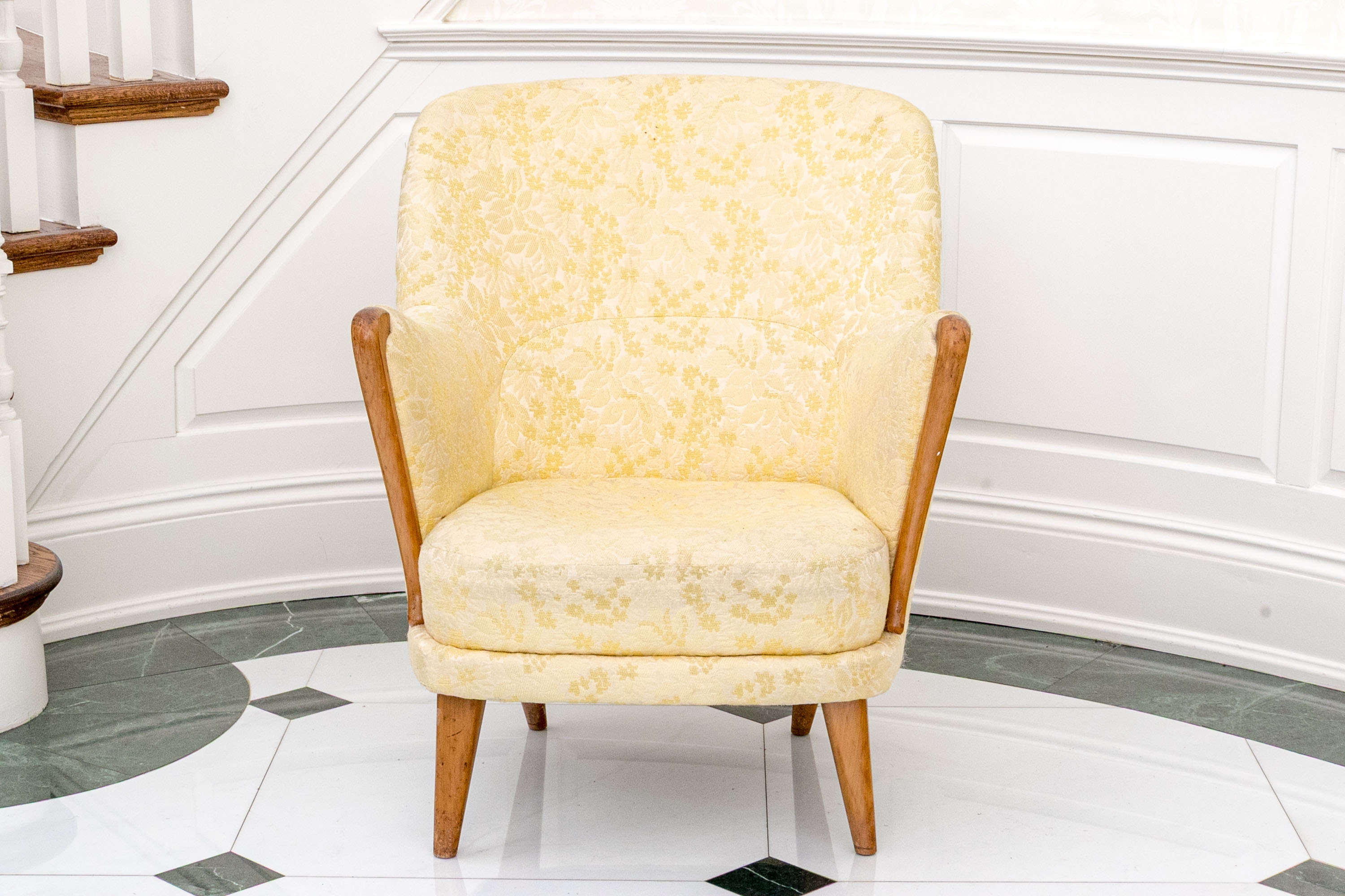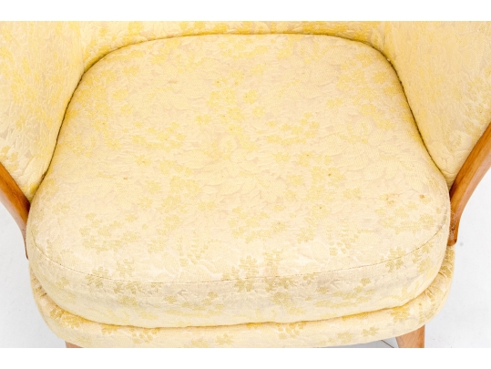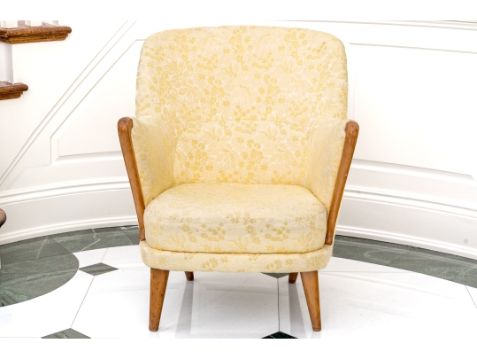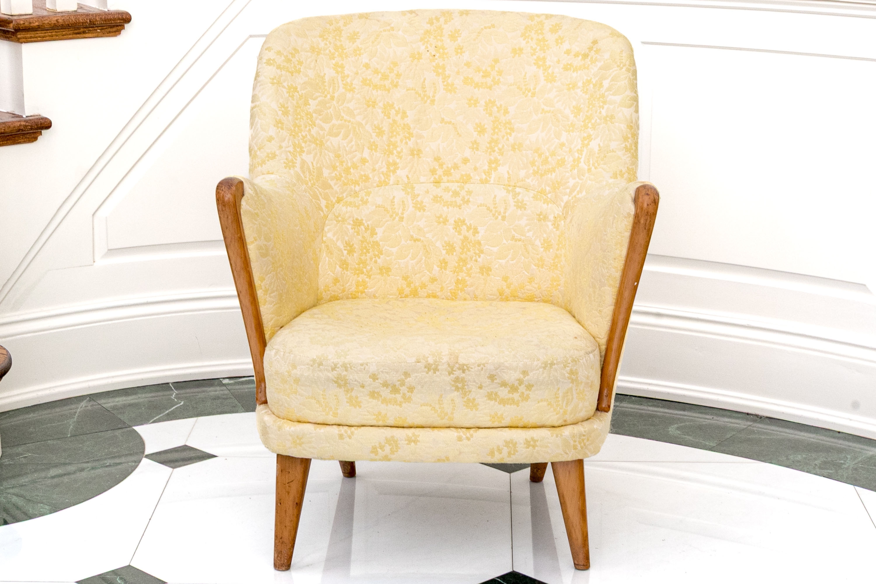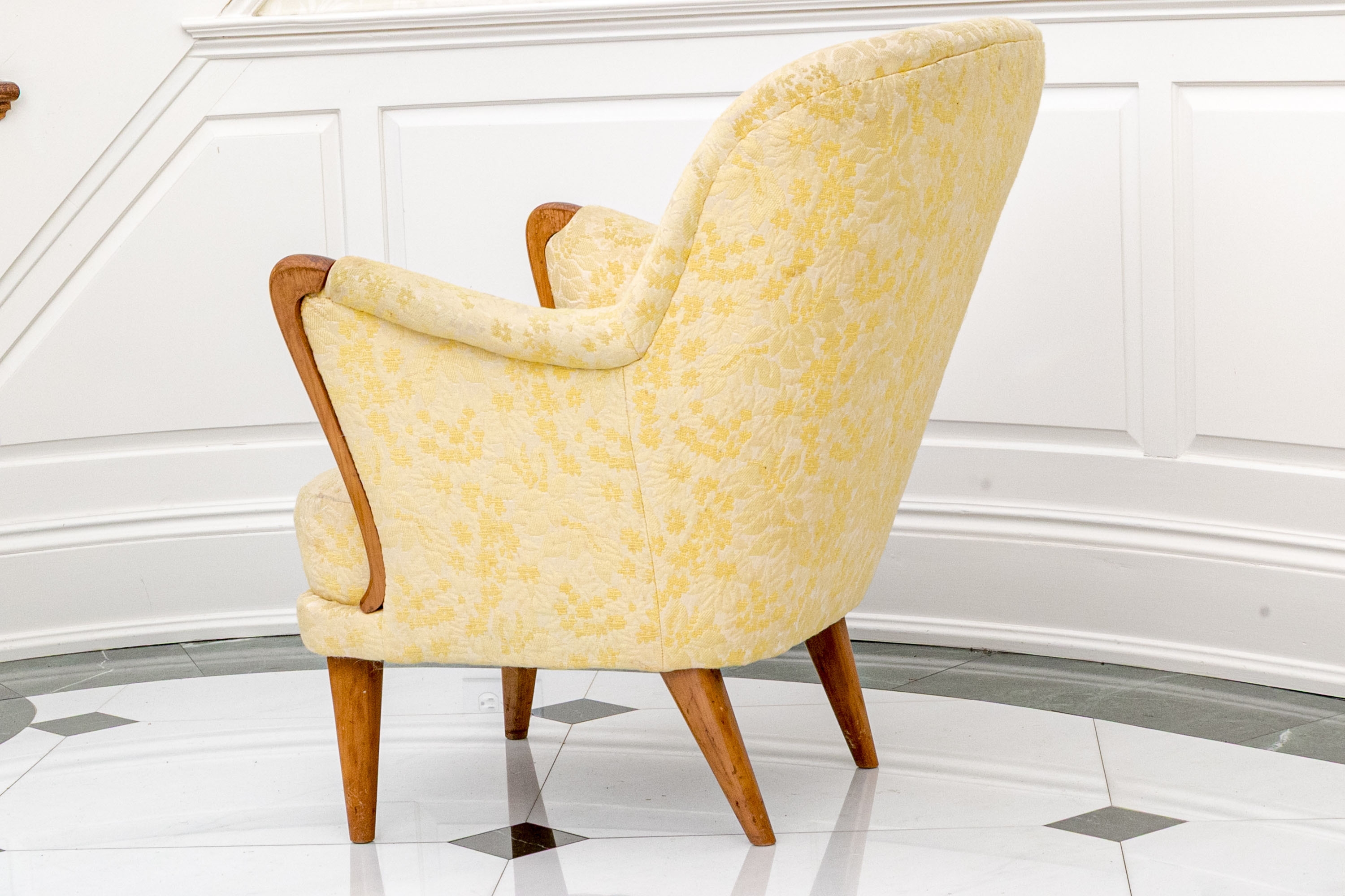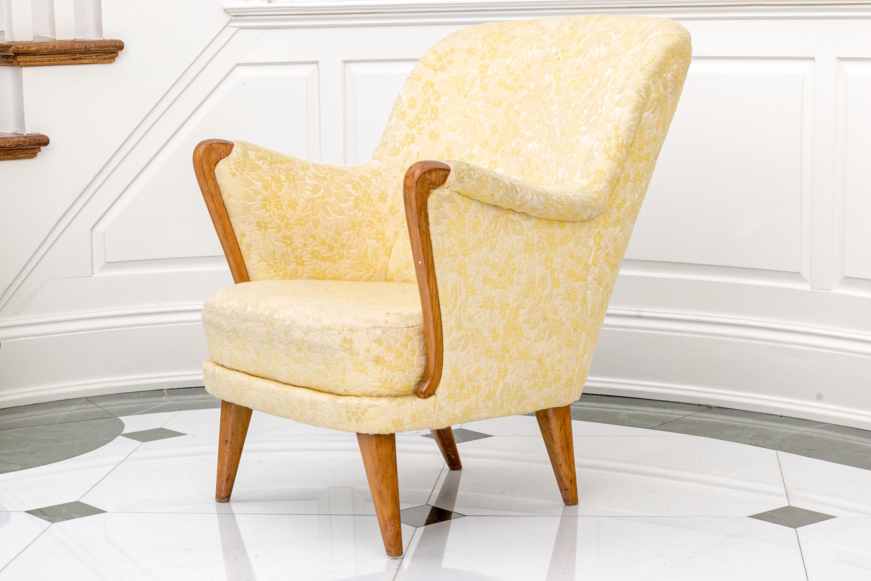 A fabulous armchair with great mid-century atomic appeal, designed with a wide back scooping into gently rounded wings that lead into narrow arms flaring upwards. Upholstered in cheerful yellow fabric with rich floral and foliate patterns creating subtle texture. Medium brown exposed wood arm fronts and tapered, angled legs adds to the warmth of the design.