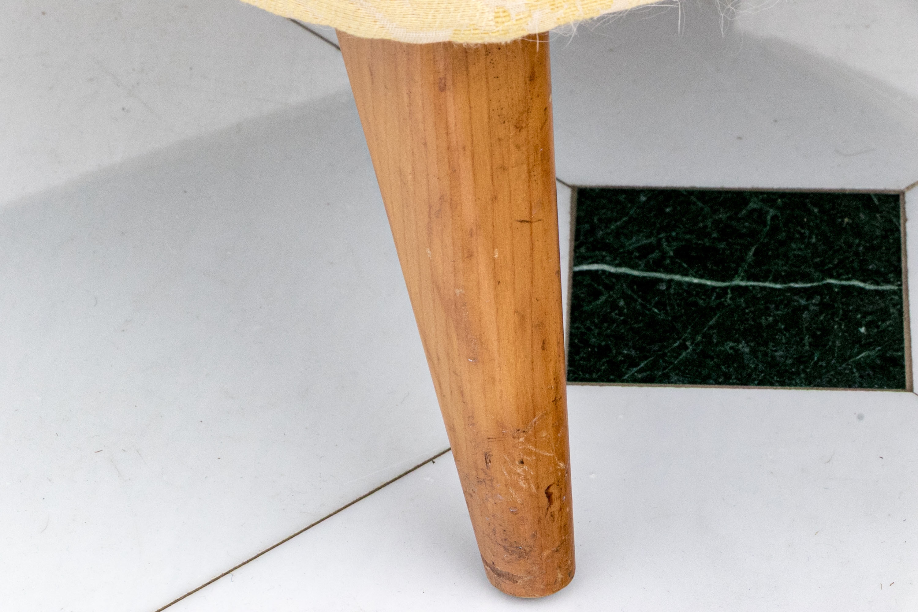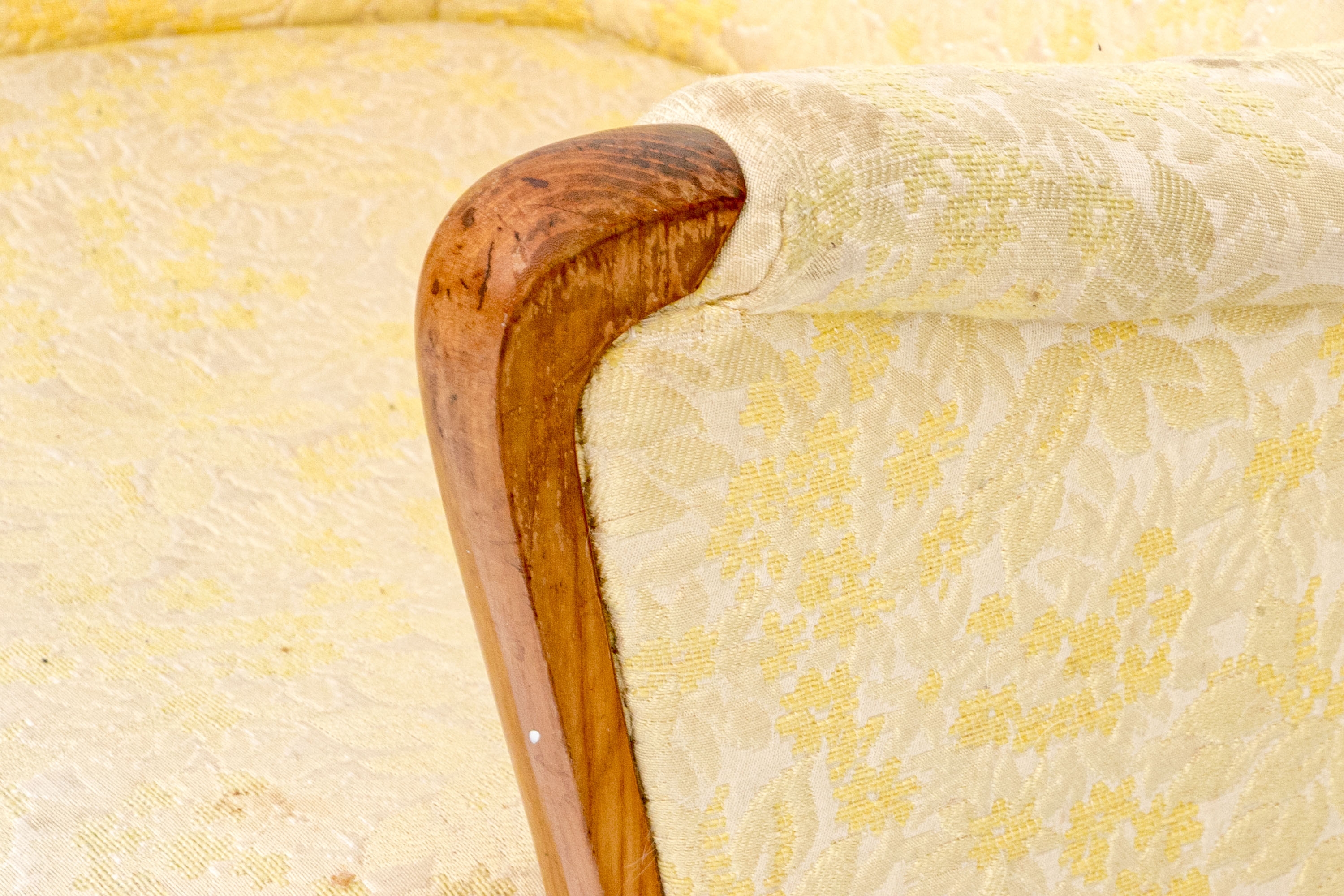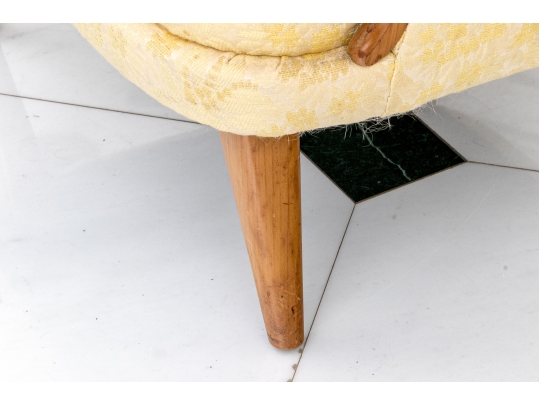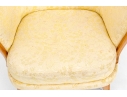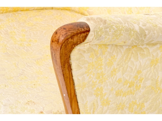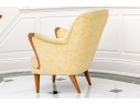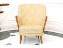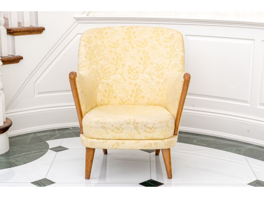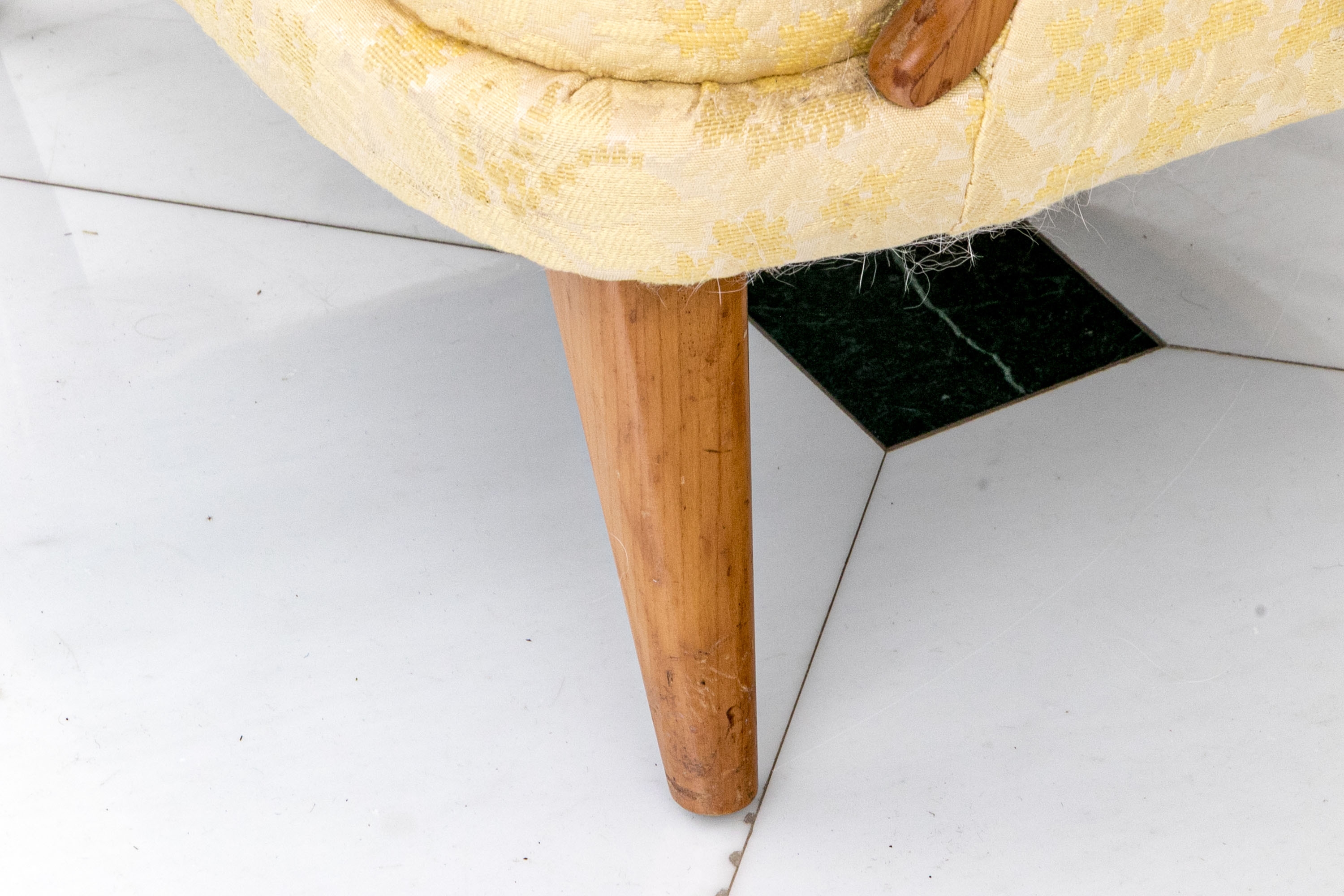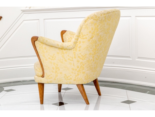 A fabulous armchair with great mid-century atomic appeal, designed with a wide back scooping into gently rounded wings that lead into narrow arms flaring upwards. Upholstered in cheerful yellow fabric with rich floral and foliate patterns creating subtle texture. Medium brown exposed wood arm fronts and tapered, angled legs adds to the warmth of the design.