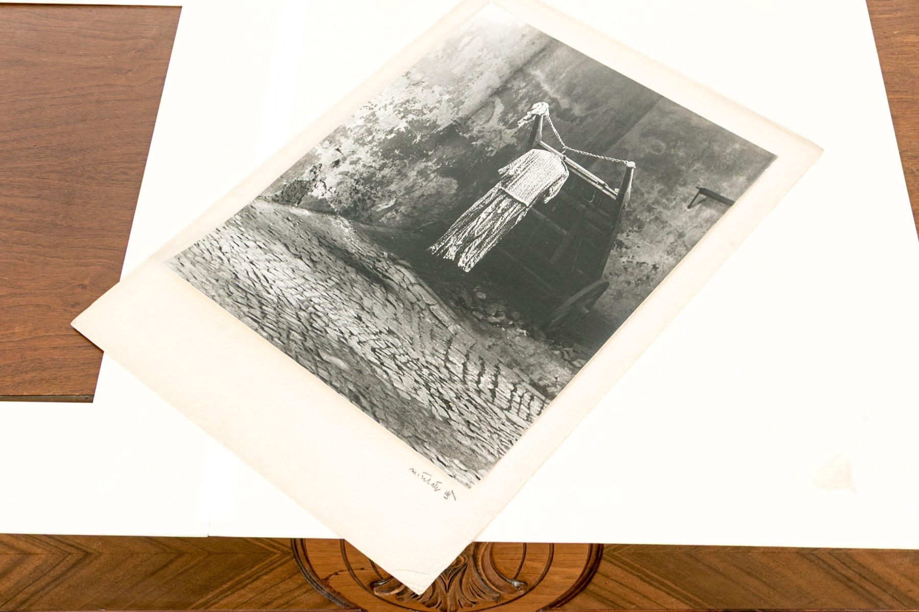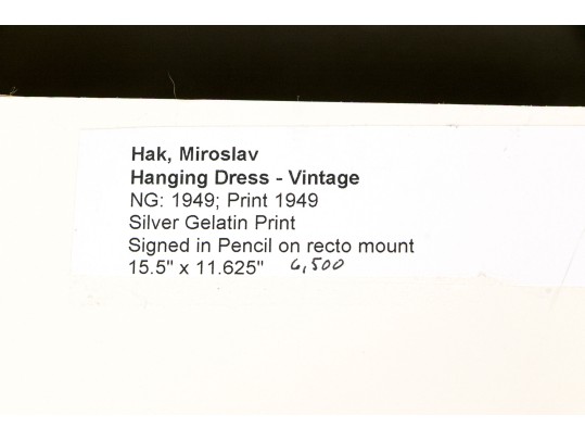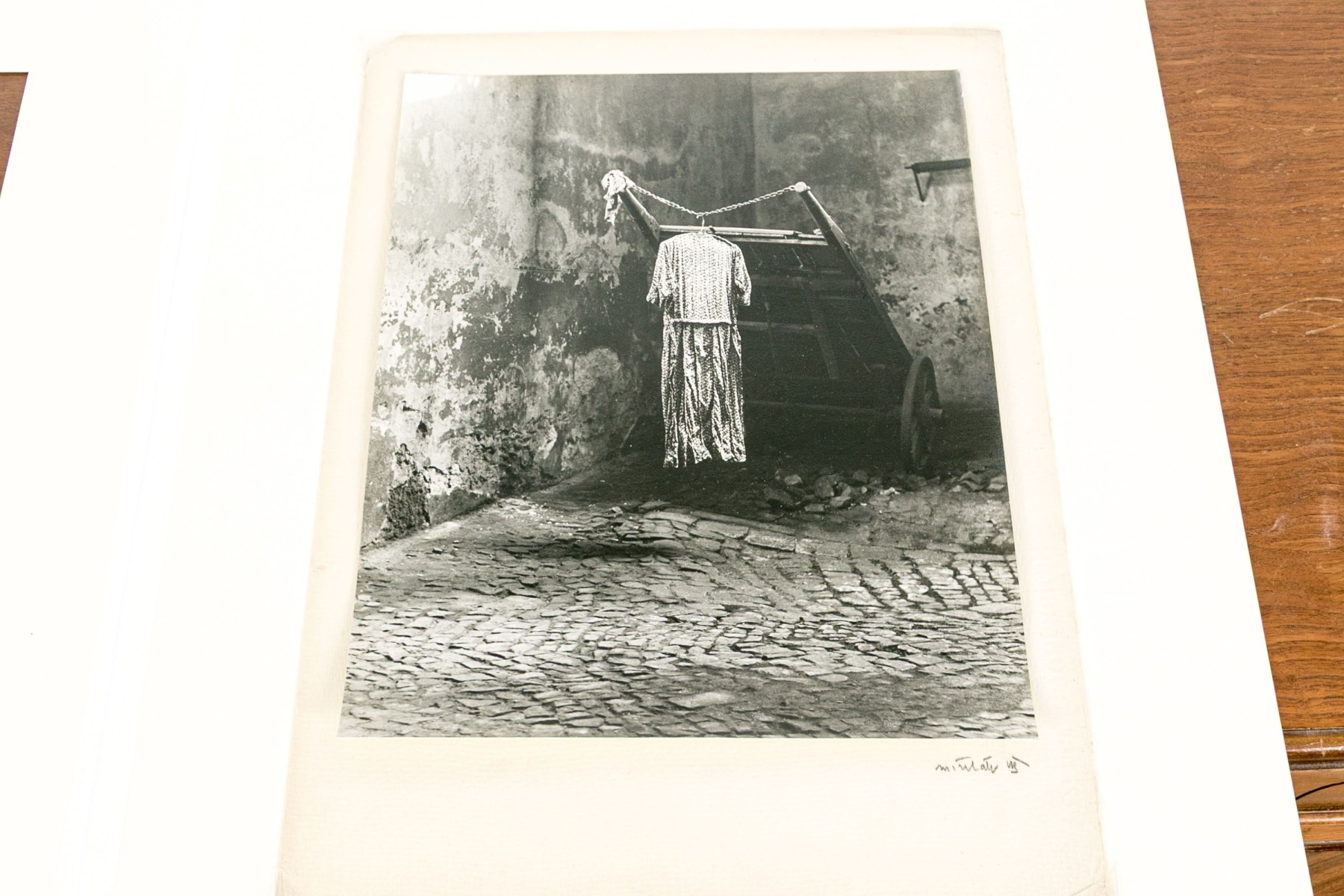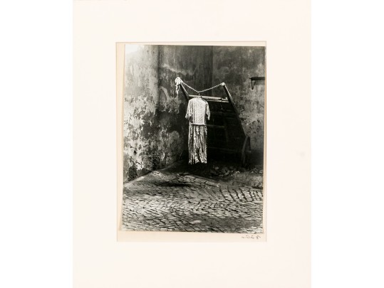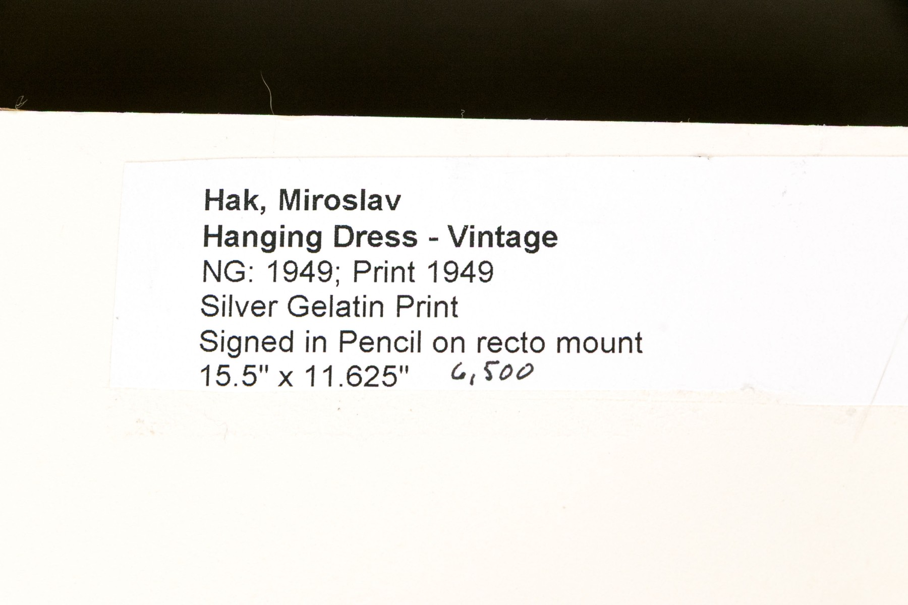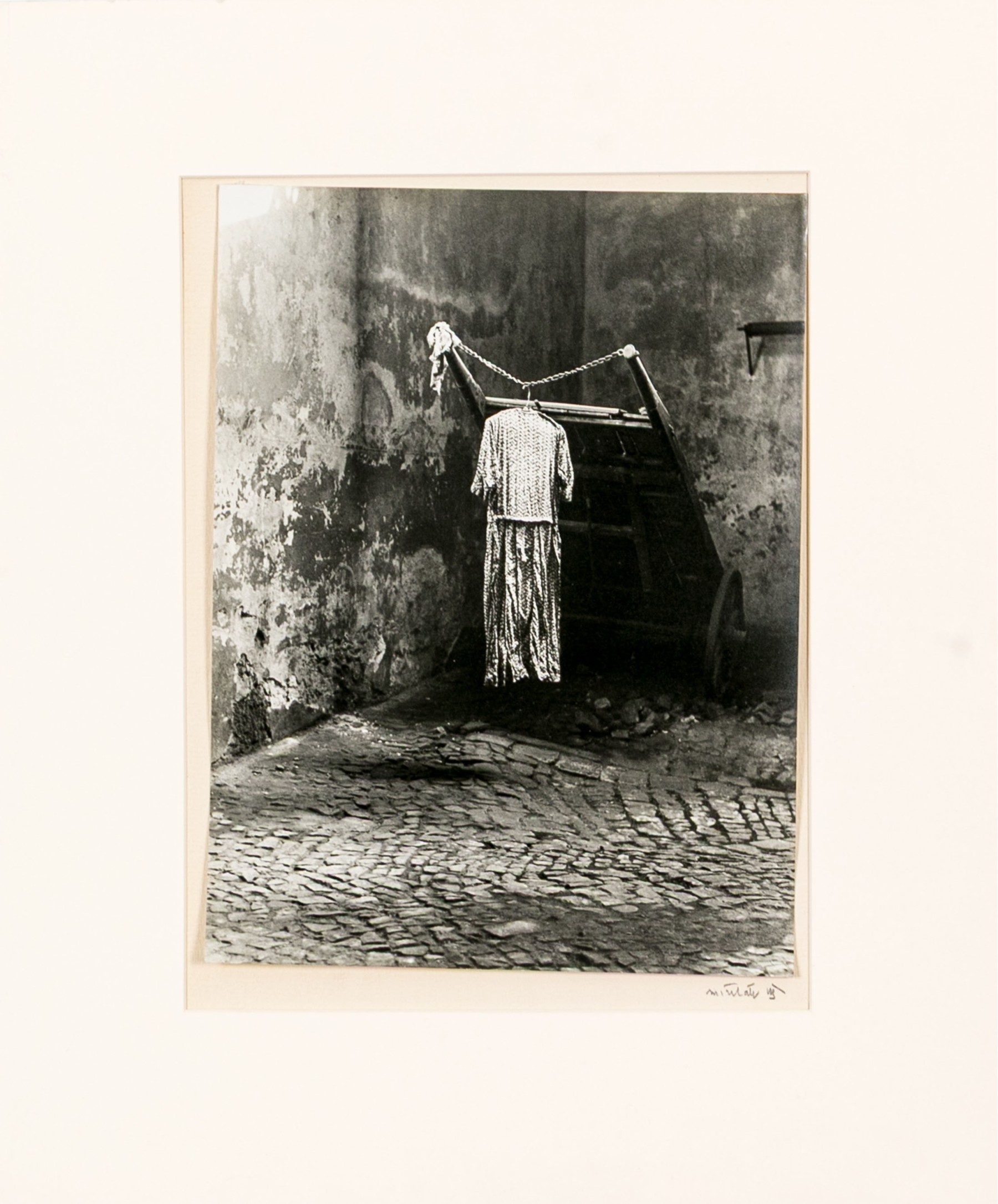 Miroslav Hák (Czechoslovakian, 1911-1978) "Town Corner" gelatin silver print depicting a dress on a hanger hanging from a rope tied to a wooden handcart at the corner of a stone paved street. Pencil signed lower right. Unframed.