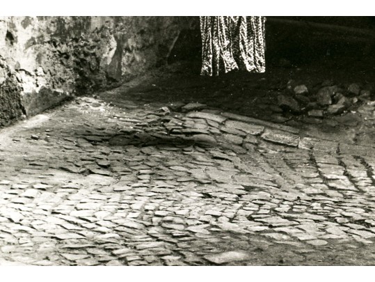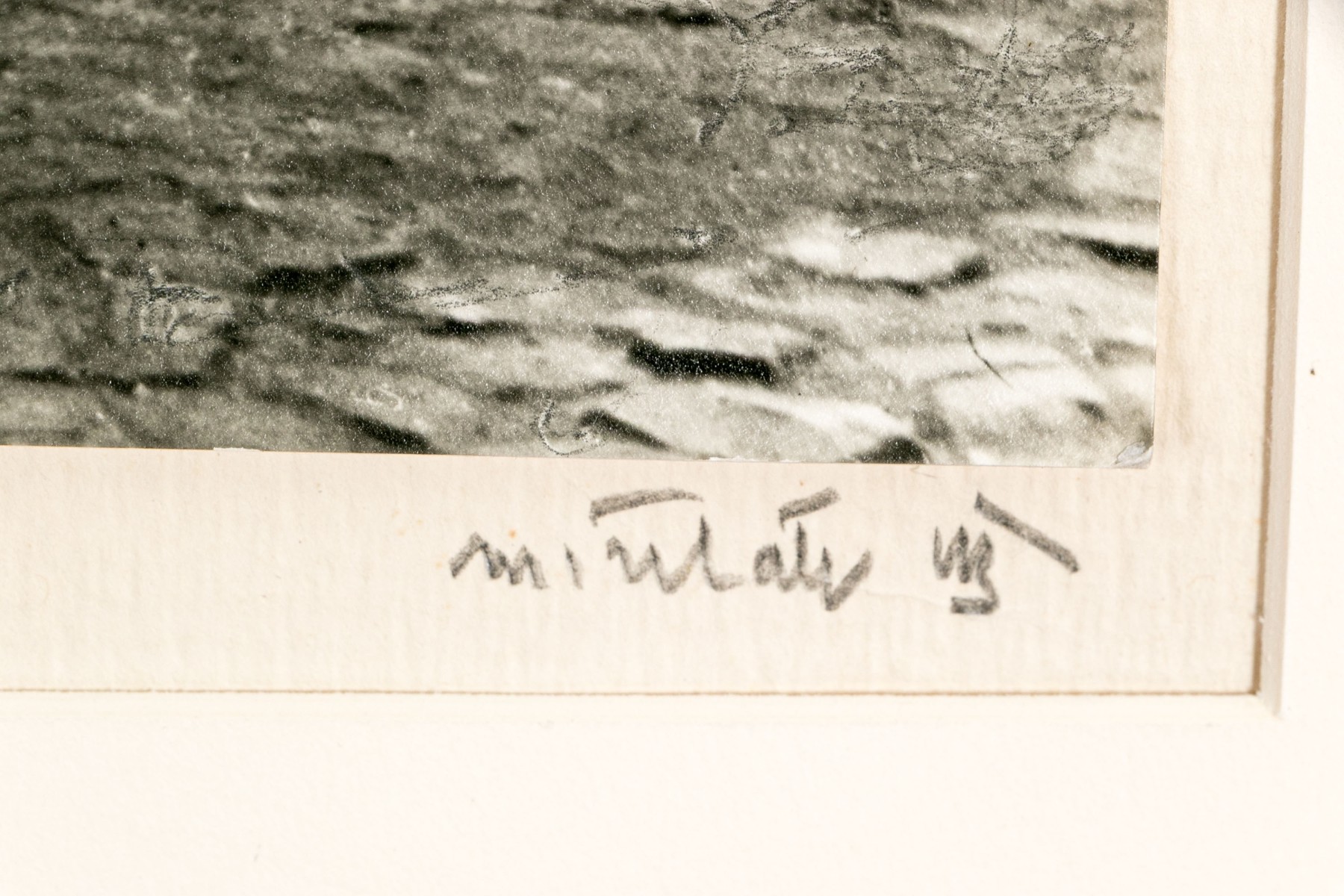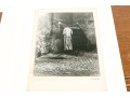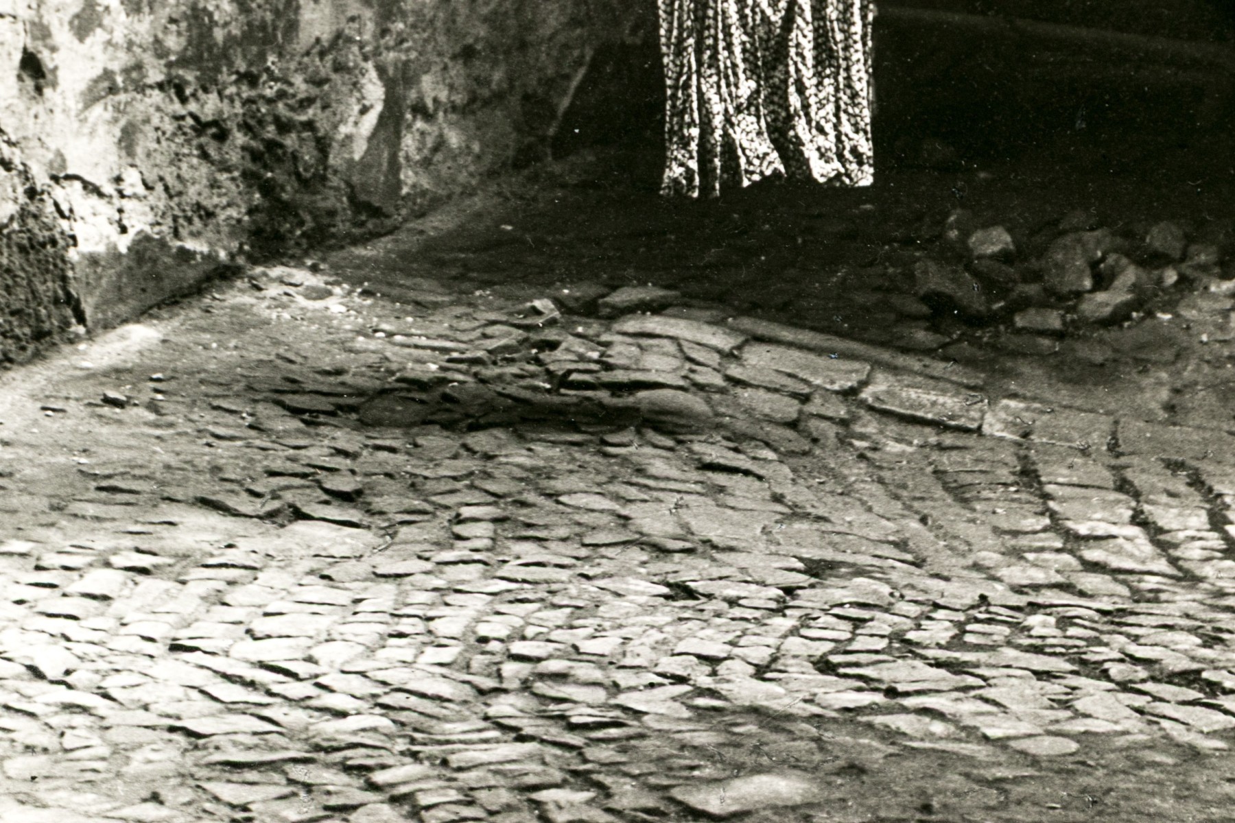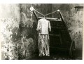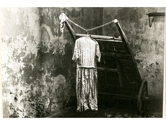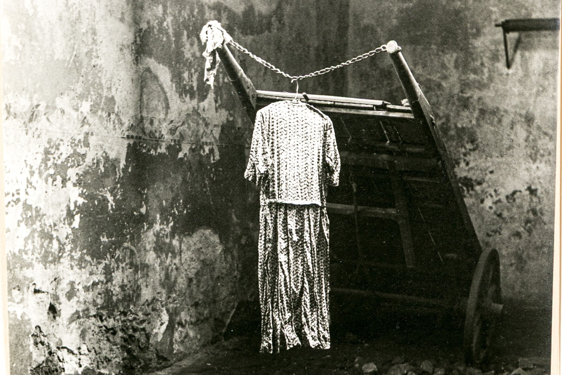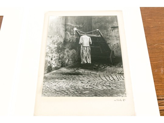 Miroslav Hák (Czechoslovakian, 1911-1978) "Town Corner" gelatin silver print depicting a dress on a hanger hanging from a rope tied to a wooden handcart at the corner of a stone paved street. Pencil signed lower right. Unframed.
