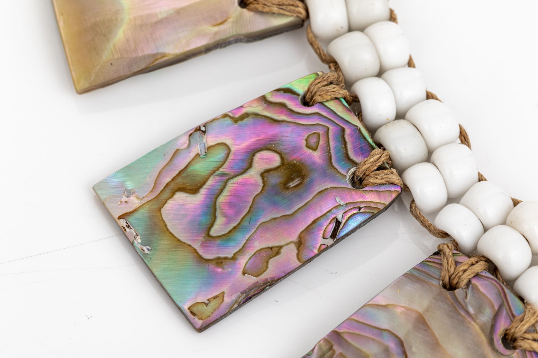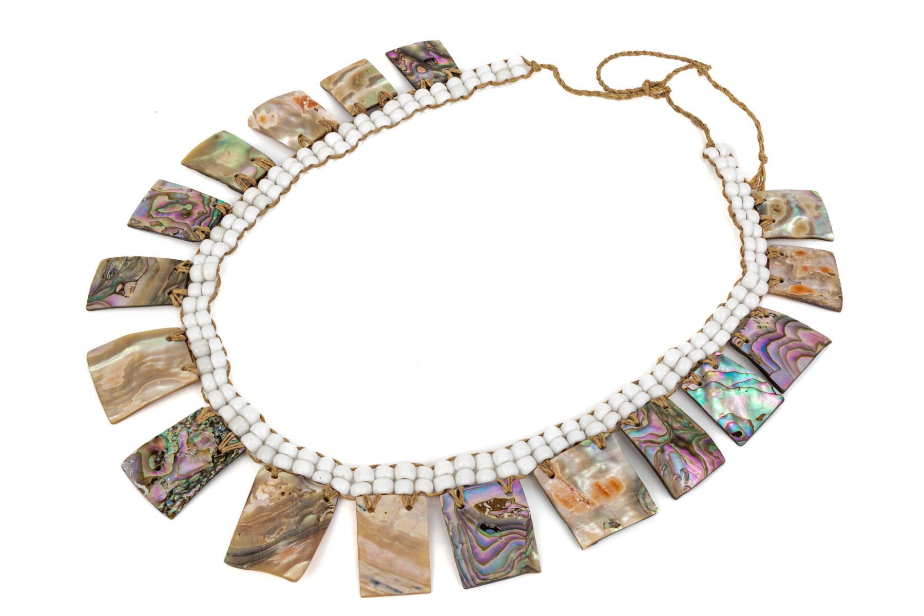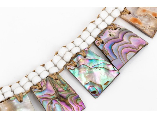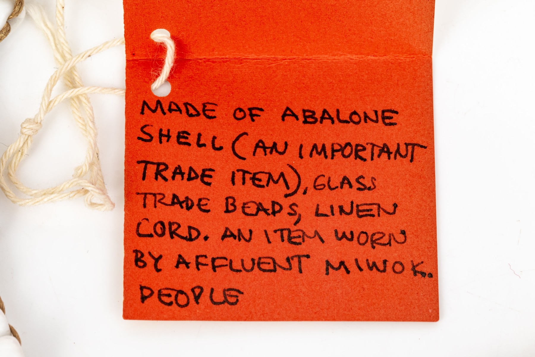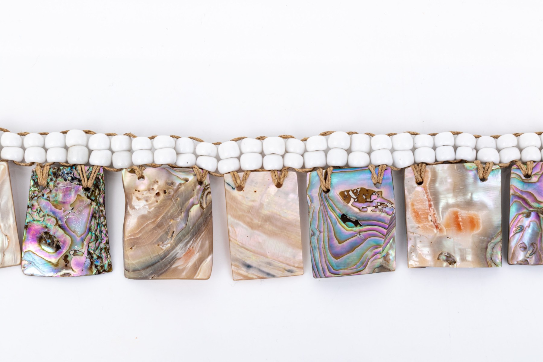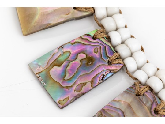 Miwok beautiful abalone tile and white glass bead necklace, on linen twine, adjustable length