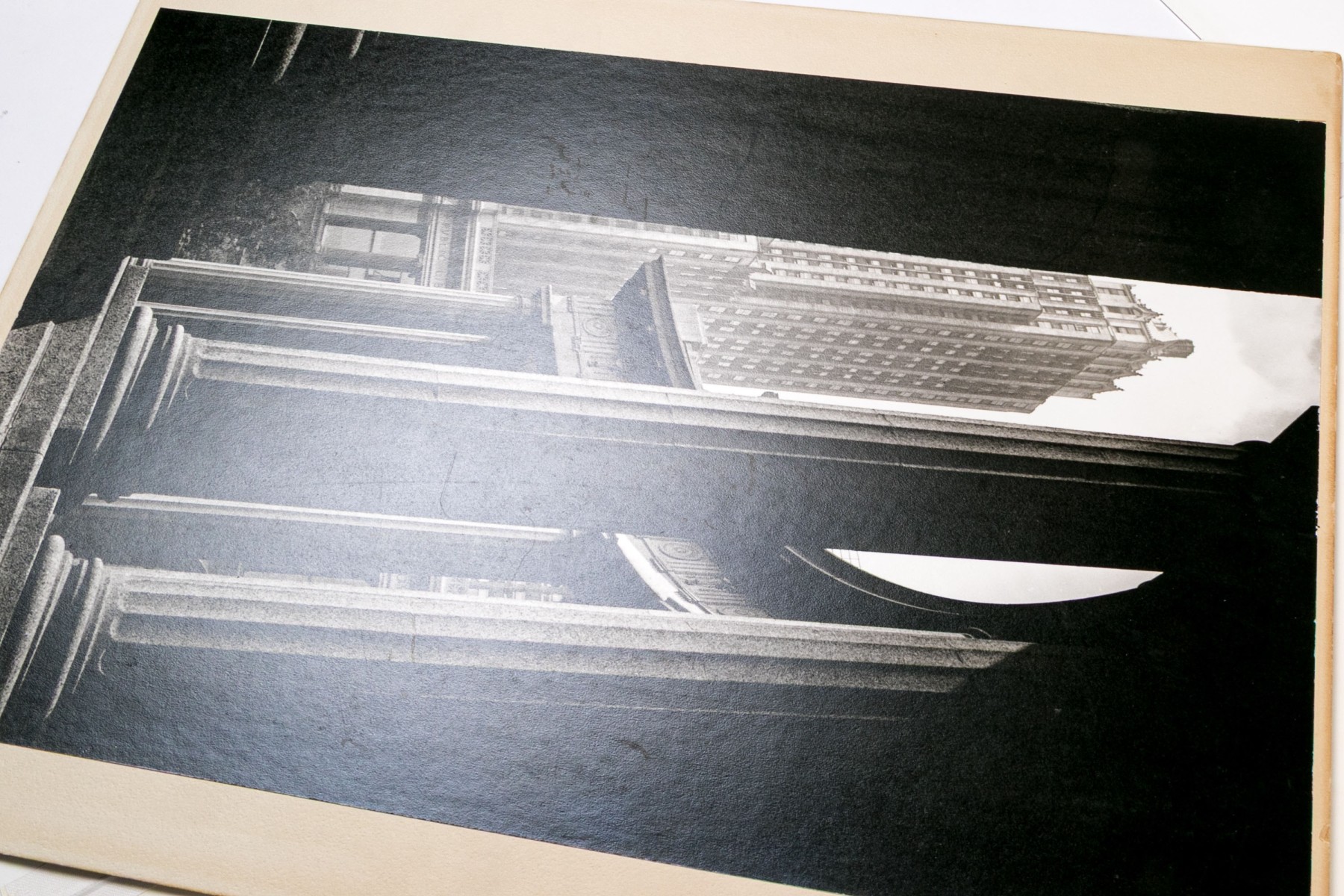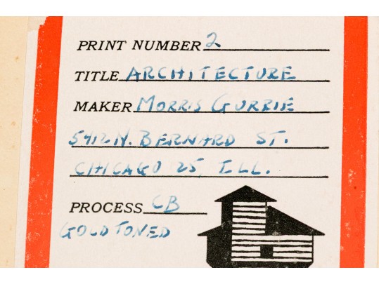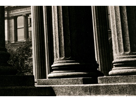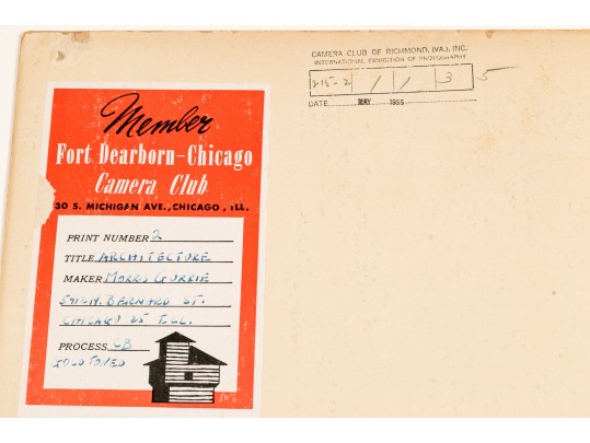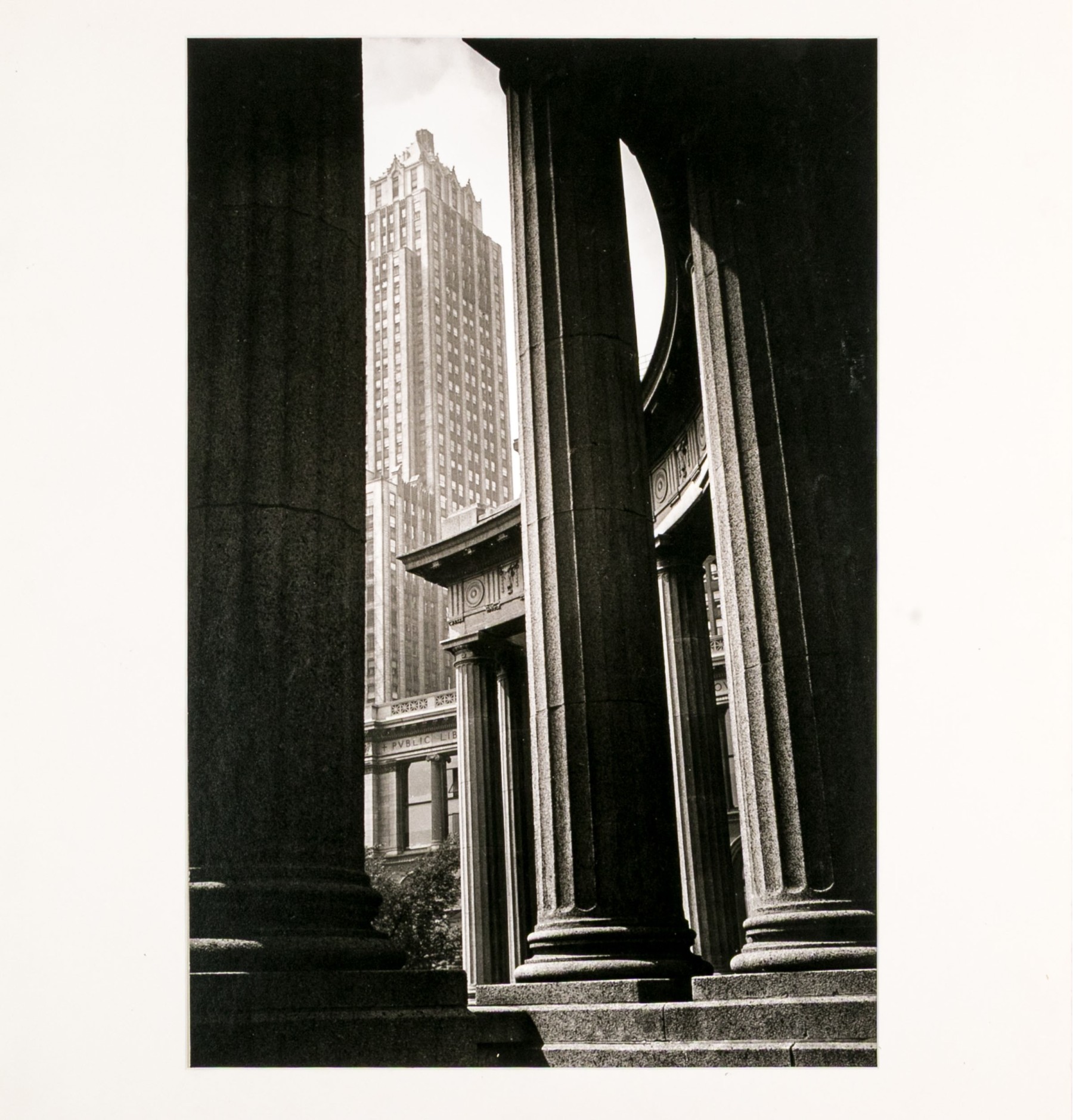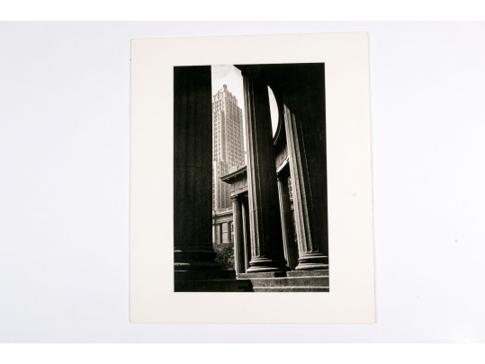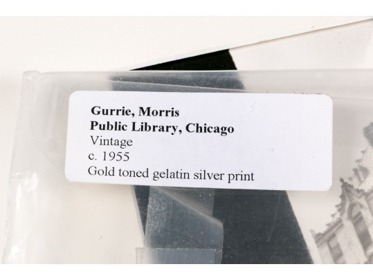 Morris Gurrie (American [IL], 20th C.) "Architecture" gold tone gelatin silver print depicting a view of fluted columns and architecture of a Chicago public library. Stamped labels on the verso and affixed with a label from the Fort Dearborn-Chicago Camera Club. Mounted on board, unframed.