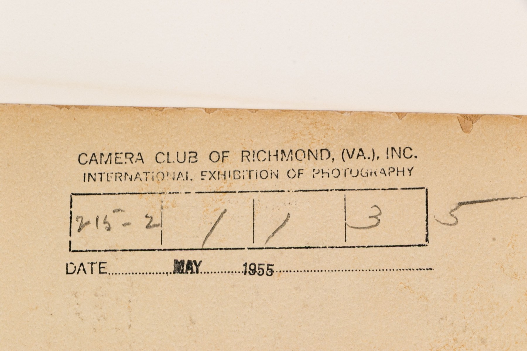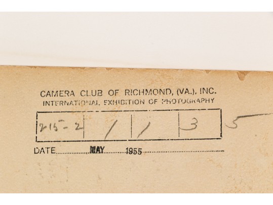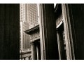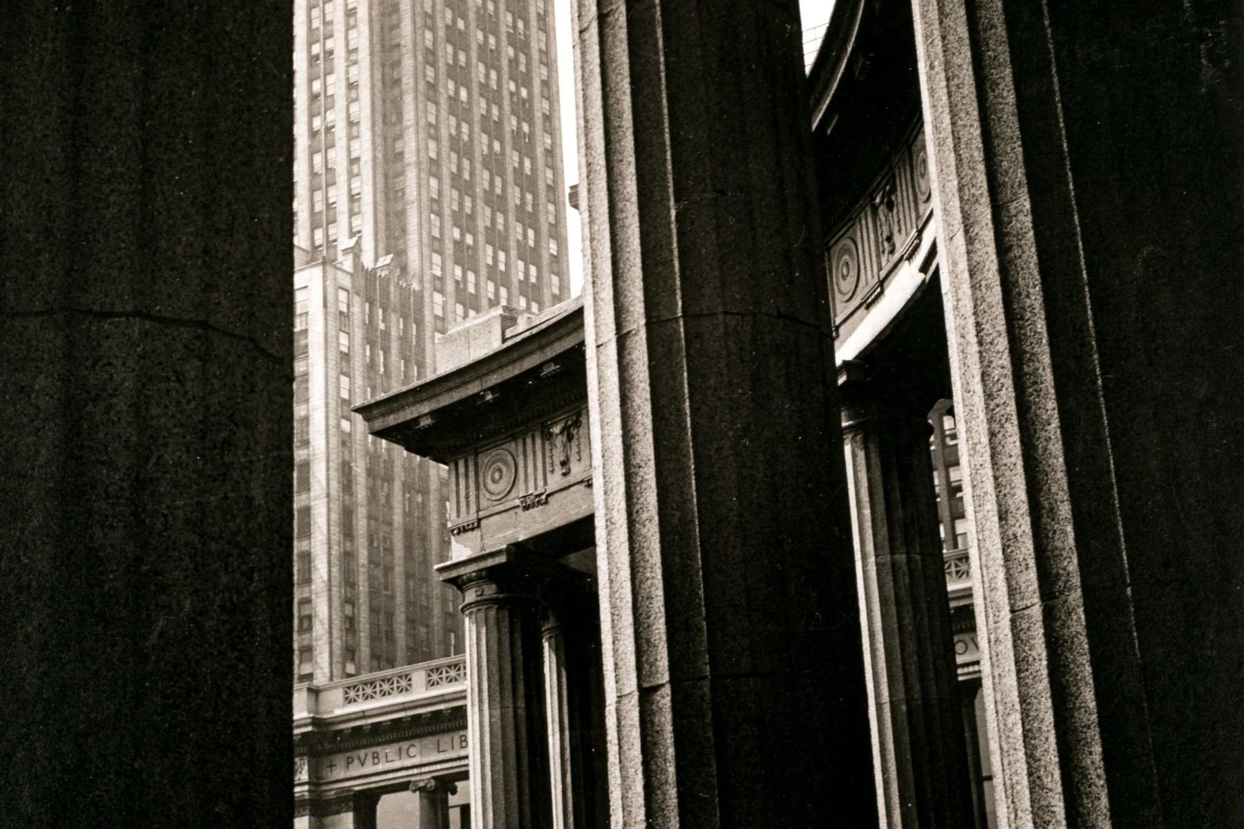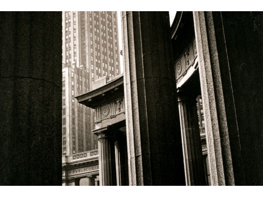 Morris Gurrie (American [IL], 20th C.) "Architecture" gold tone gelatin silver print depicting a view of fluted columns and architecture of a Chicago public library. Stamped labels on the verso and affixed with a label from the Fort Dearborn-Chicago Camera Club. Mounted on board, unframed.