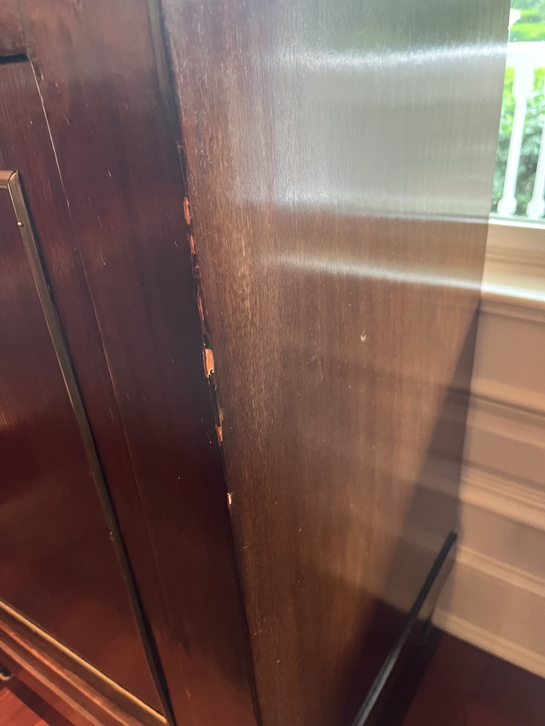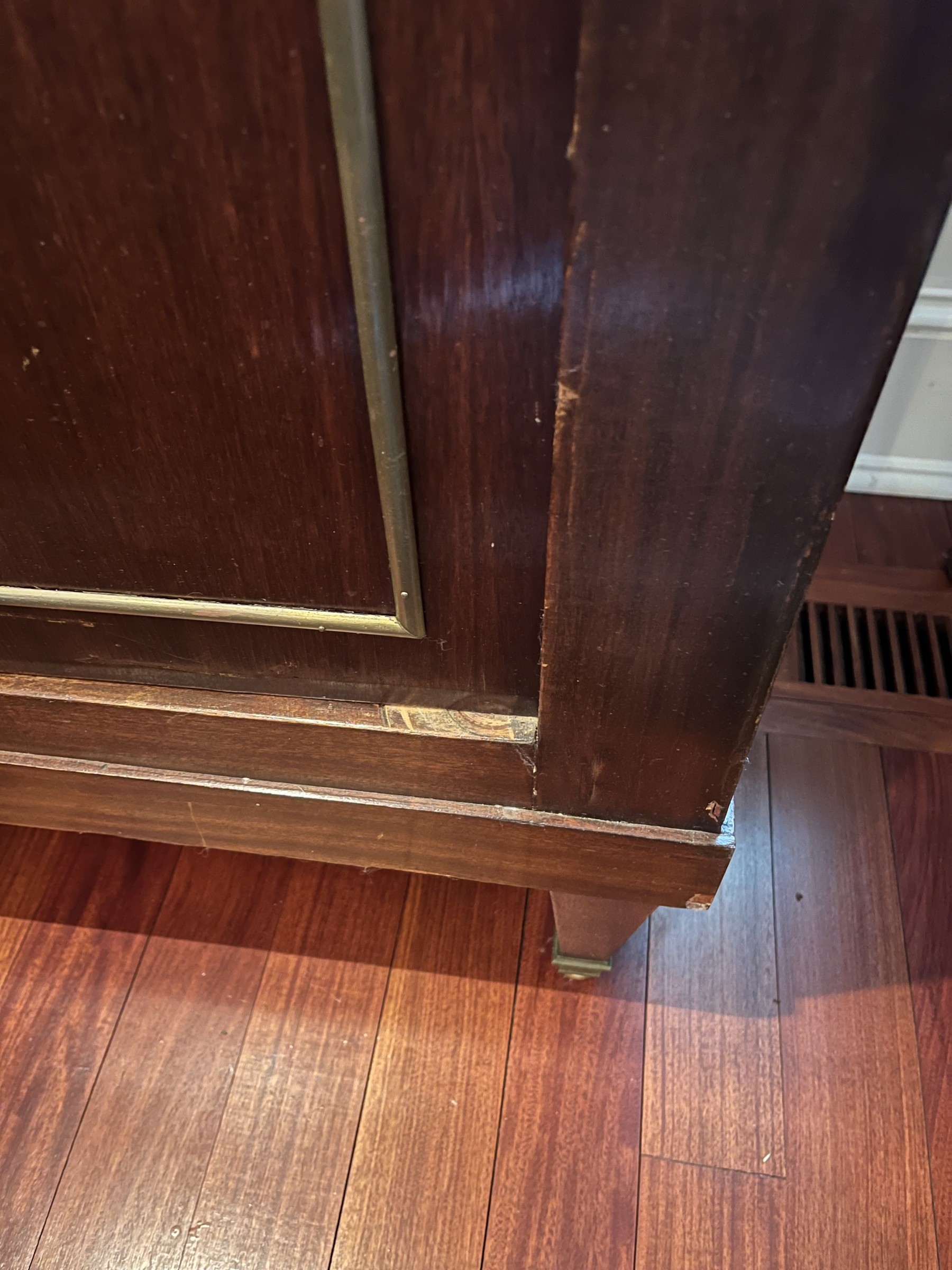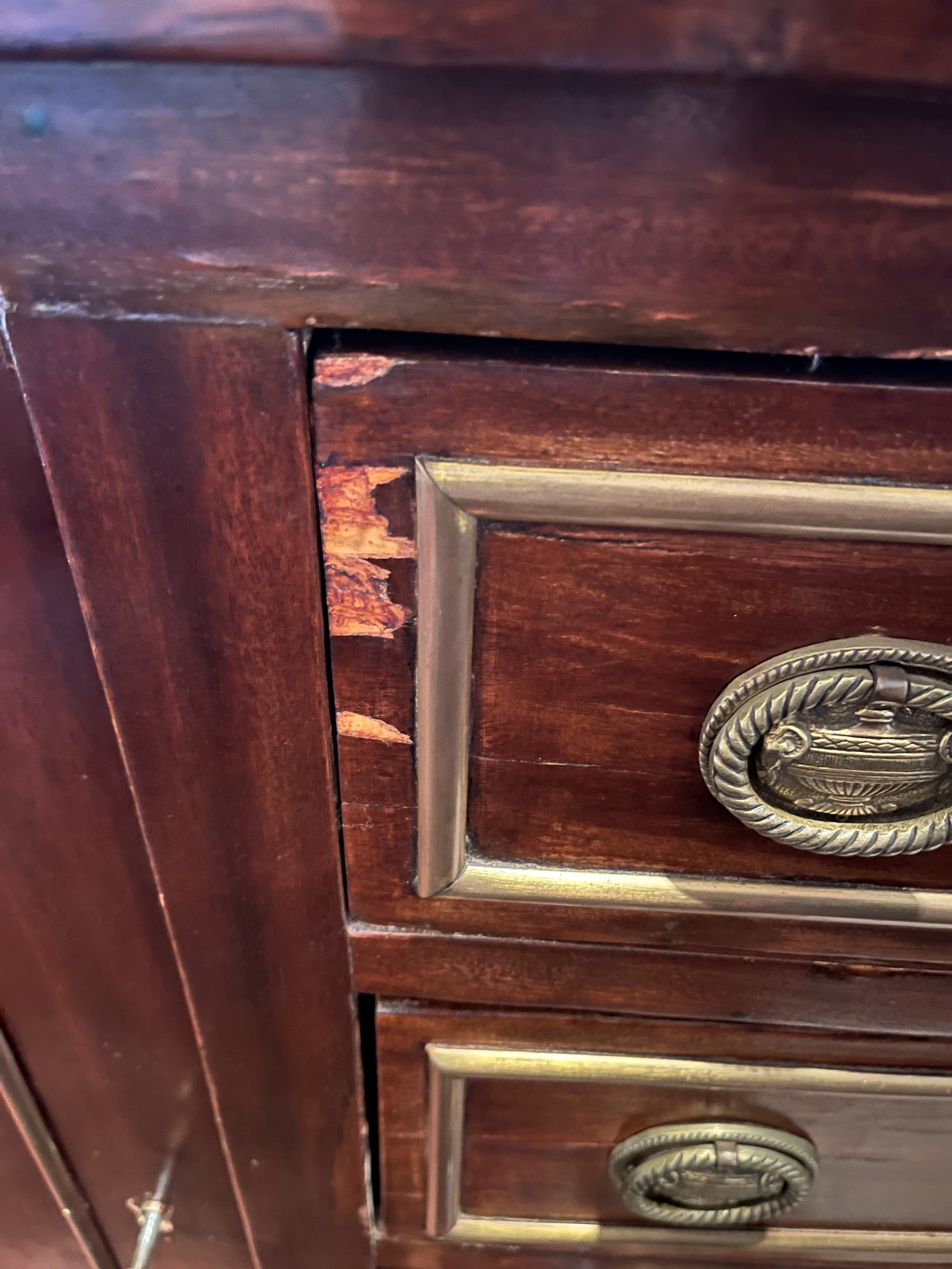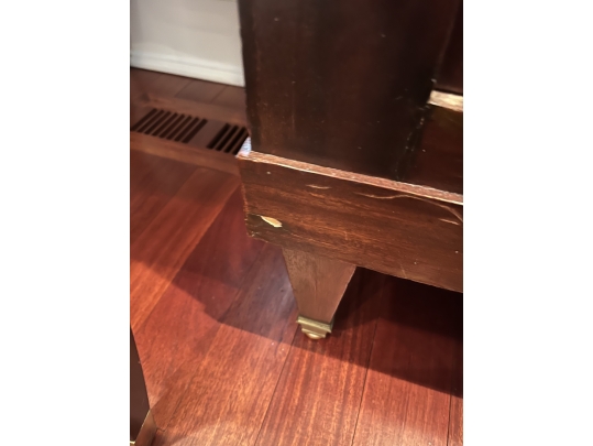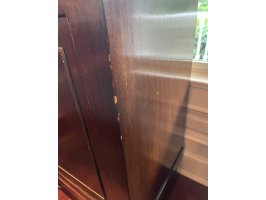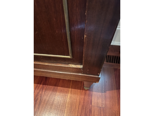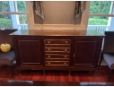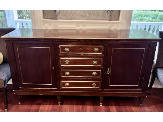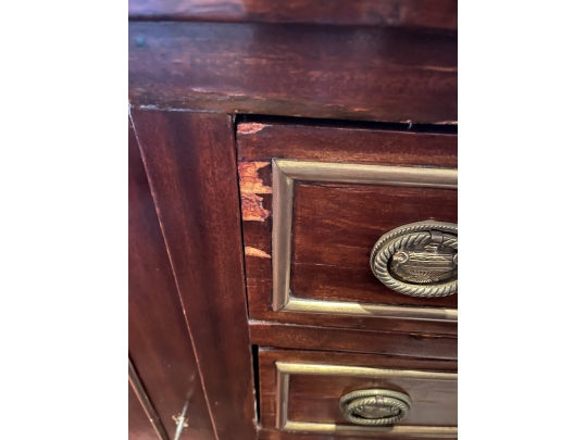 This Neoclassical Style Sideboard embodies timeless elegance with its fluted columns and intricate moldings. While there is some damage and losses to the veneer, the piece remains a valuable and stylish addition to any interior, offering both storage and a classic aesthetic appeal.