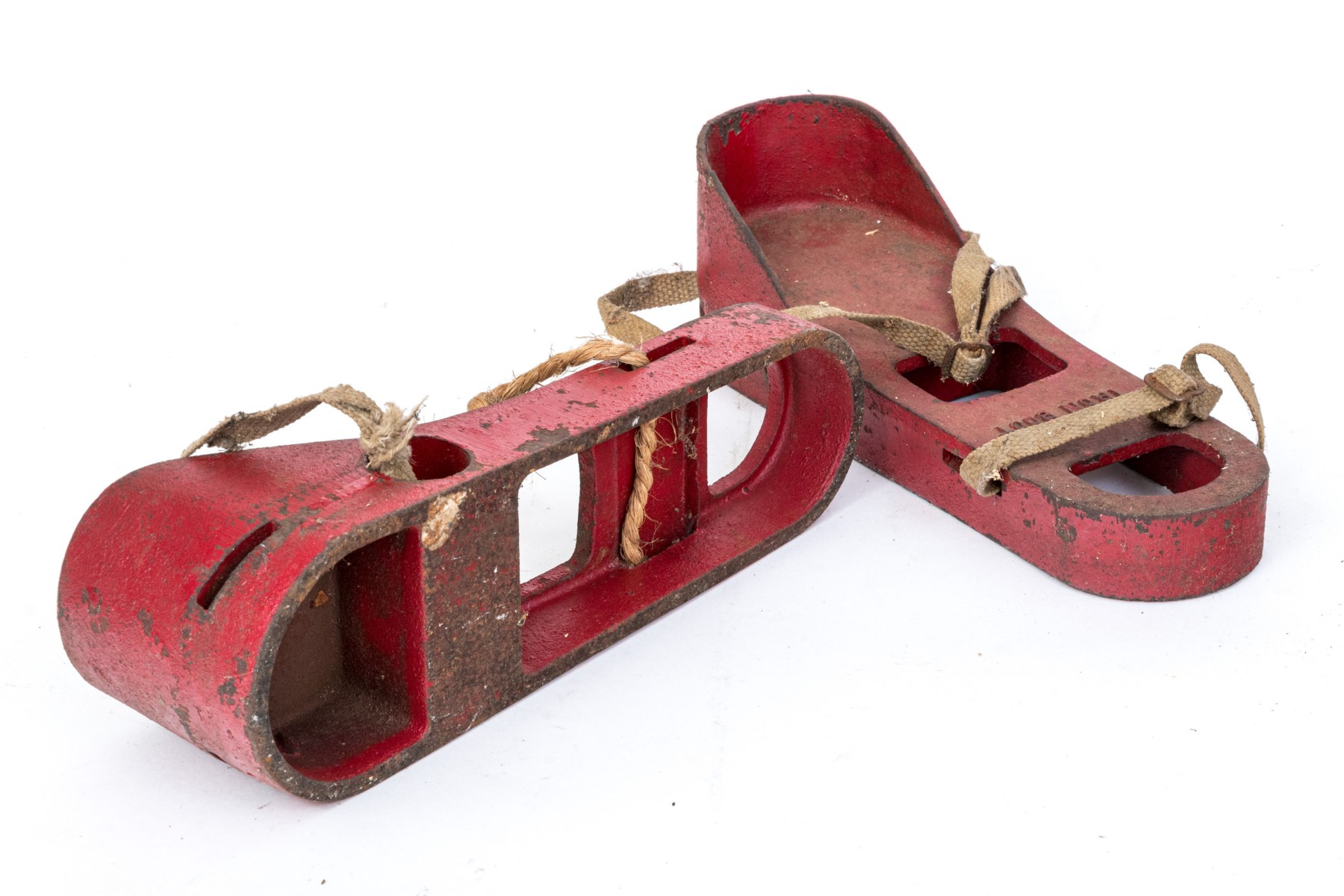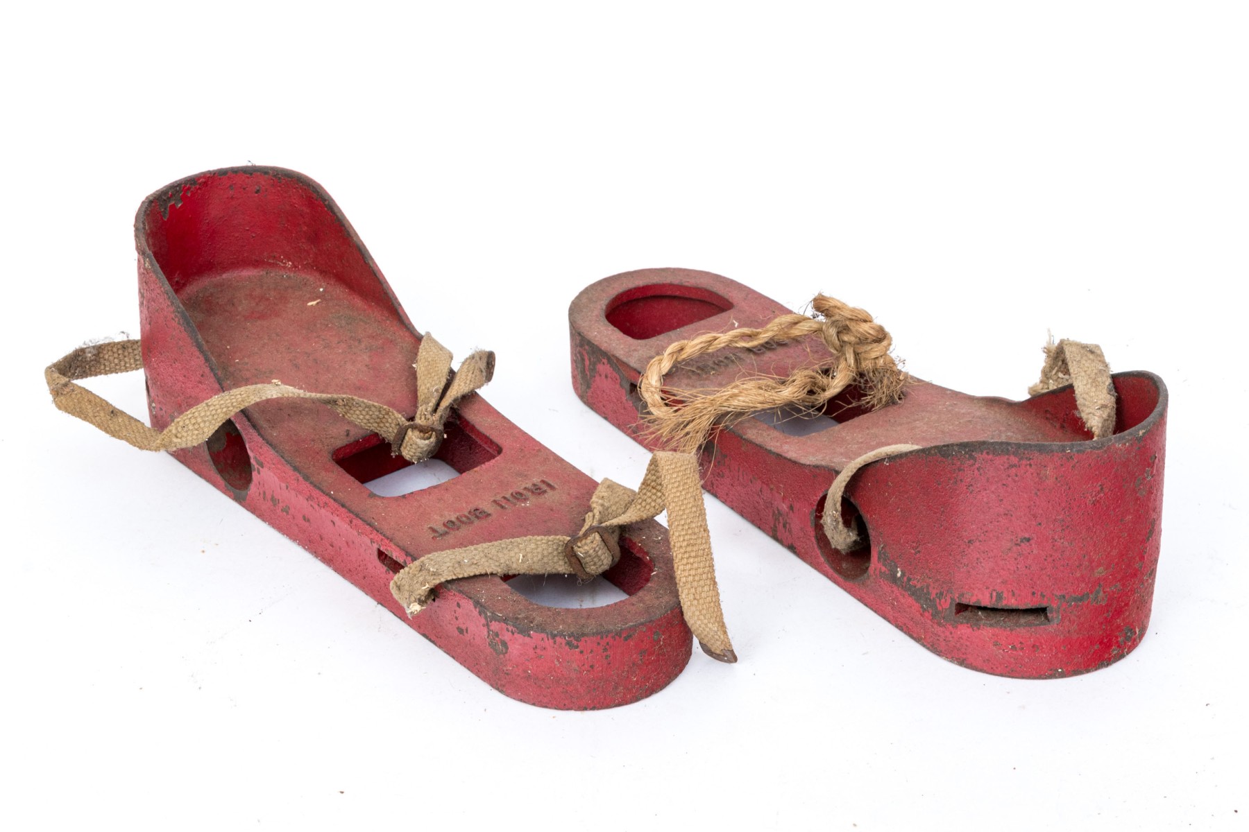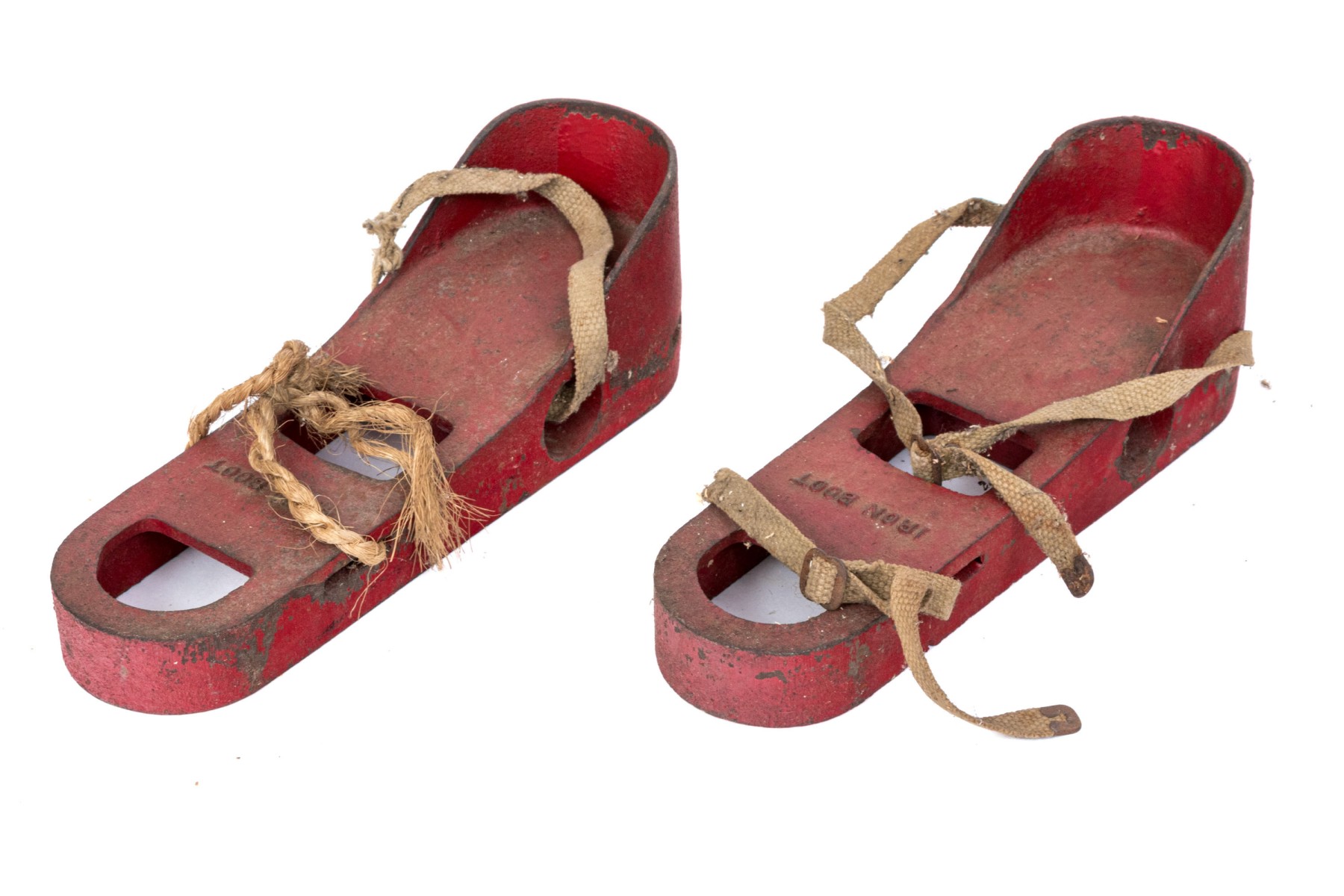A fun pair of vintage cast iron health shoes, intended for use as foot weights for exercise. Circular holes at the arches allow the attachment of barbells. Finished in red with old ropes tied around. Both are marked “Iron Boot” near the middle front.