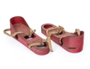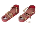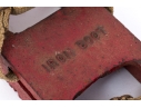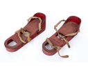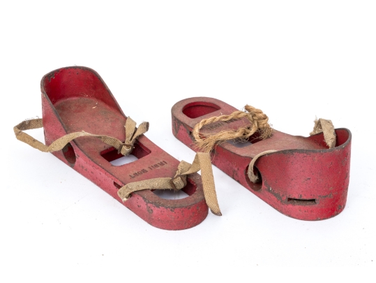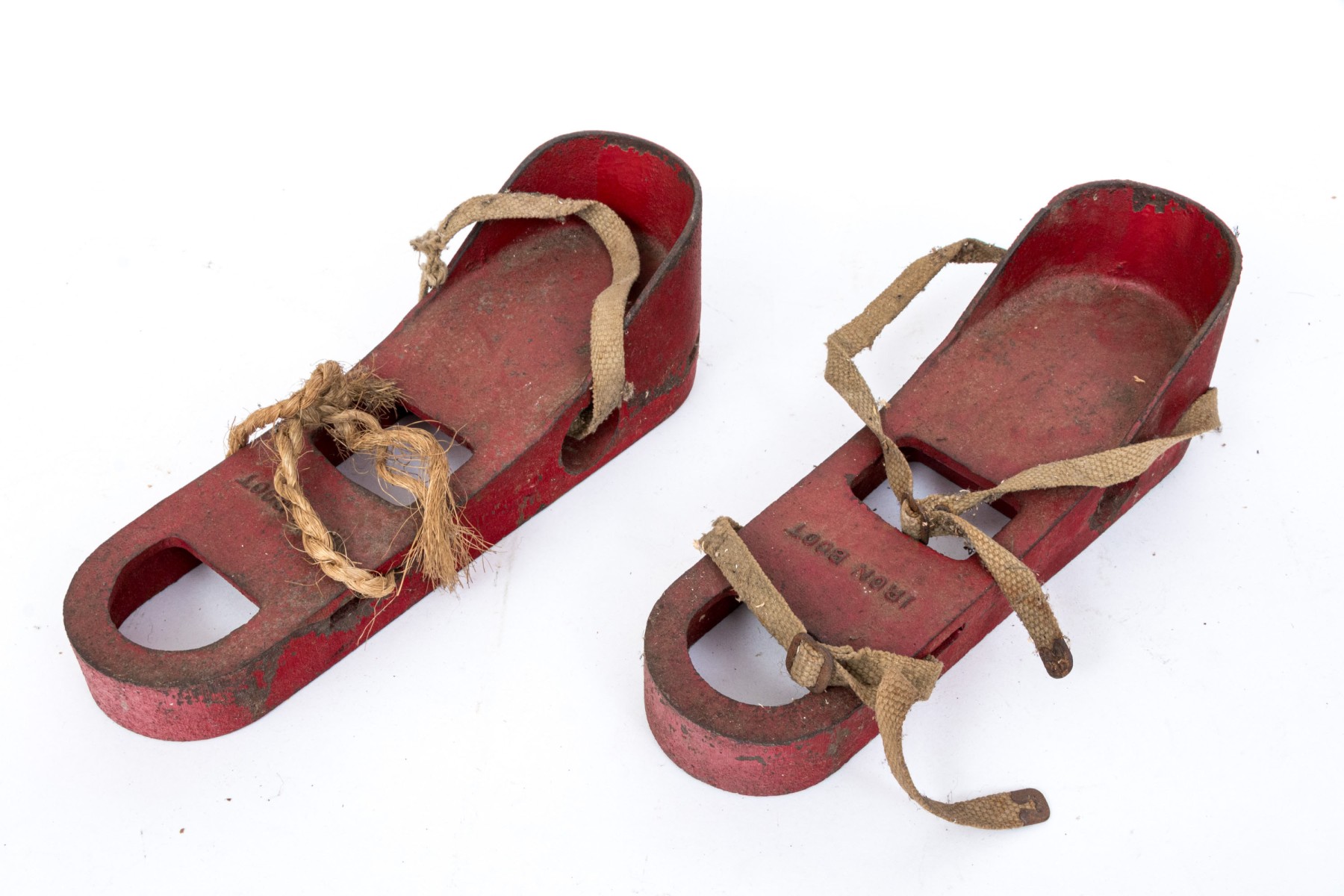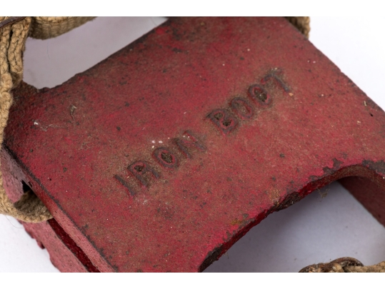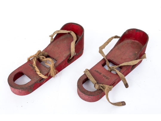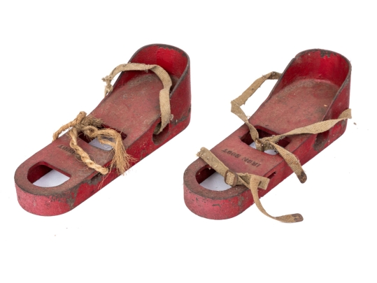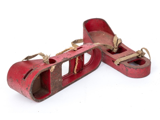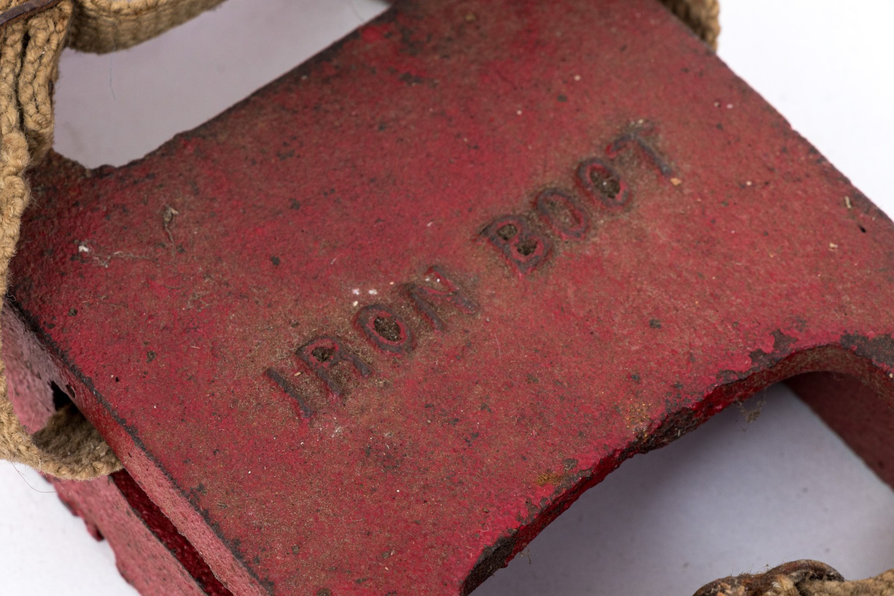 A fun pair of vintage cast iron health shoes, intended for use as foot weights for exercise. Circular holes at the arches allow the attachment of barbells. Finished in red with old ropes tied around. Both are marked “Iron Boot” near the middle front.