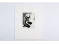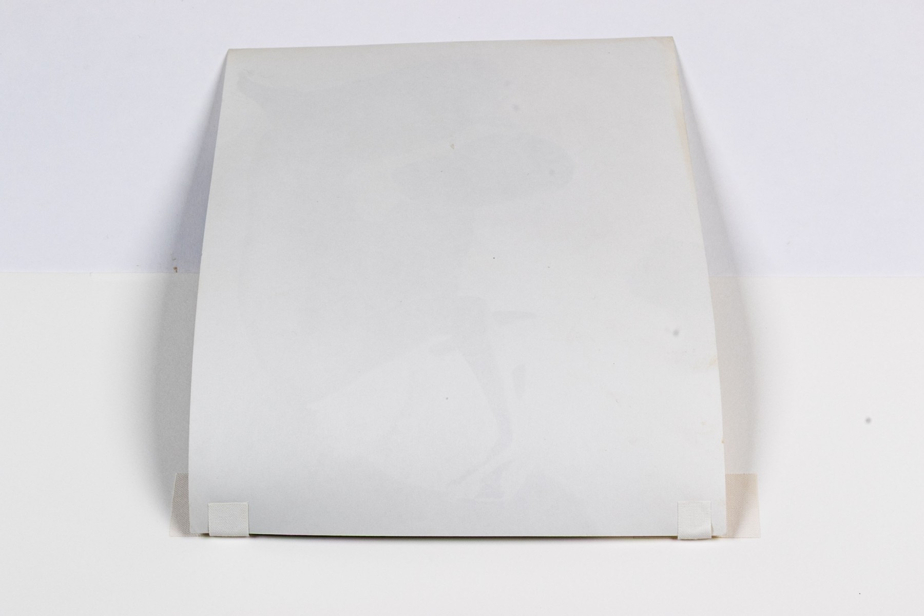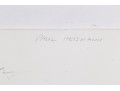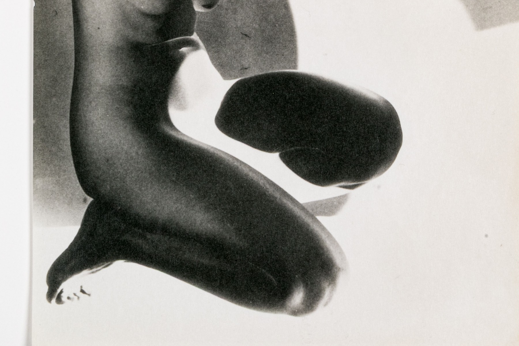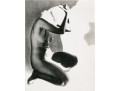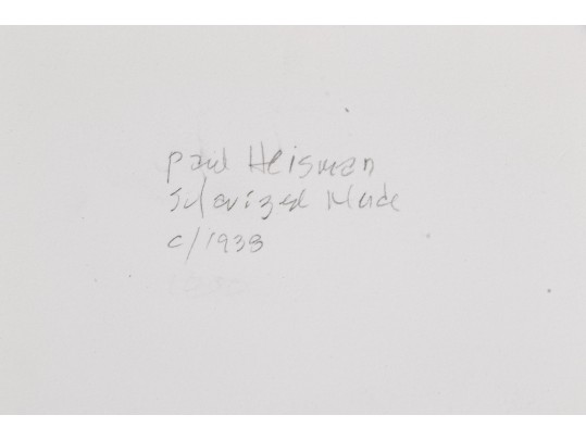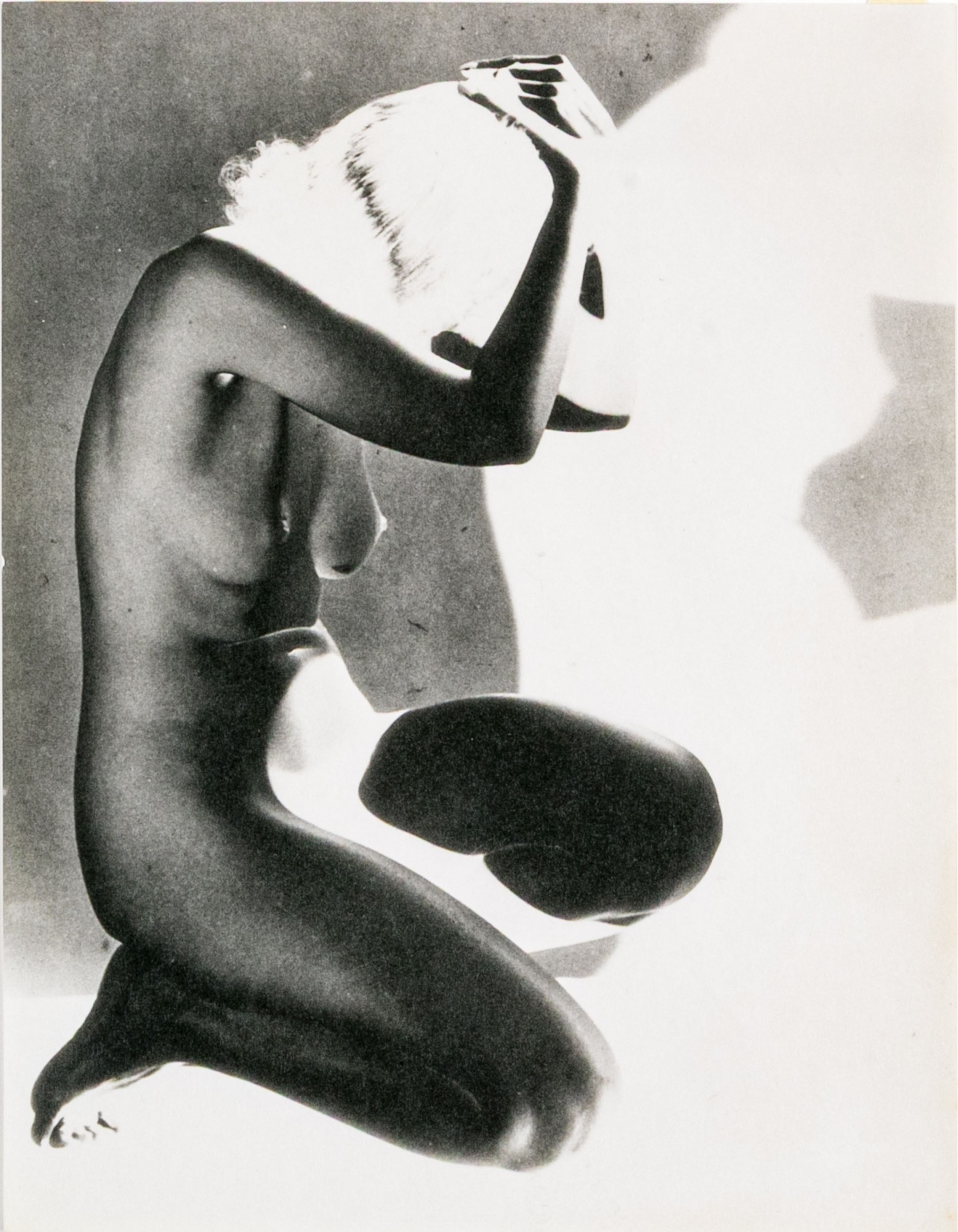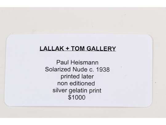 Paul Heismann (German-American, 1912-2002) "Solarized Nude C. 1938" gelatin silver print depicting a female nude posed kneeling with arms covering her head. Dramatic lighting causes her hair to appear to glow, inverting her shadow into a glowing apparition to the right. Pencil marked on the verso and bearing a label from Lallak + Tom Gallery denoting the piece as being printed lated and having a original gallery price of $1,000. Unframed.