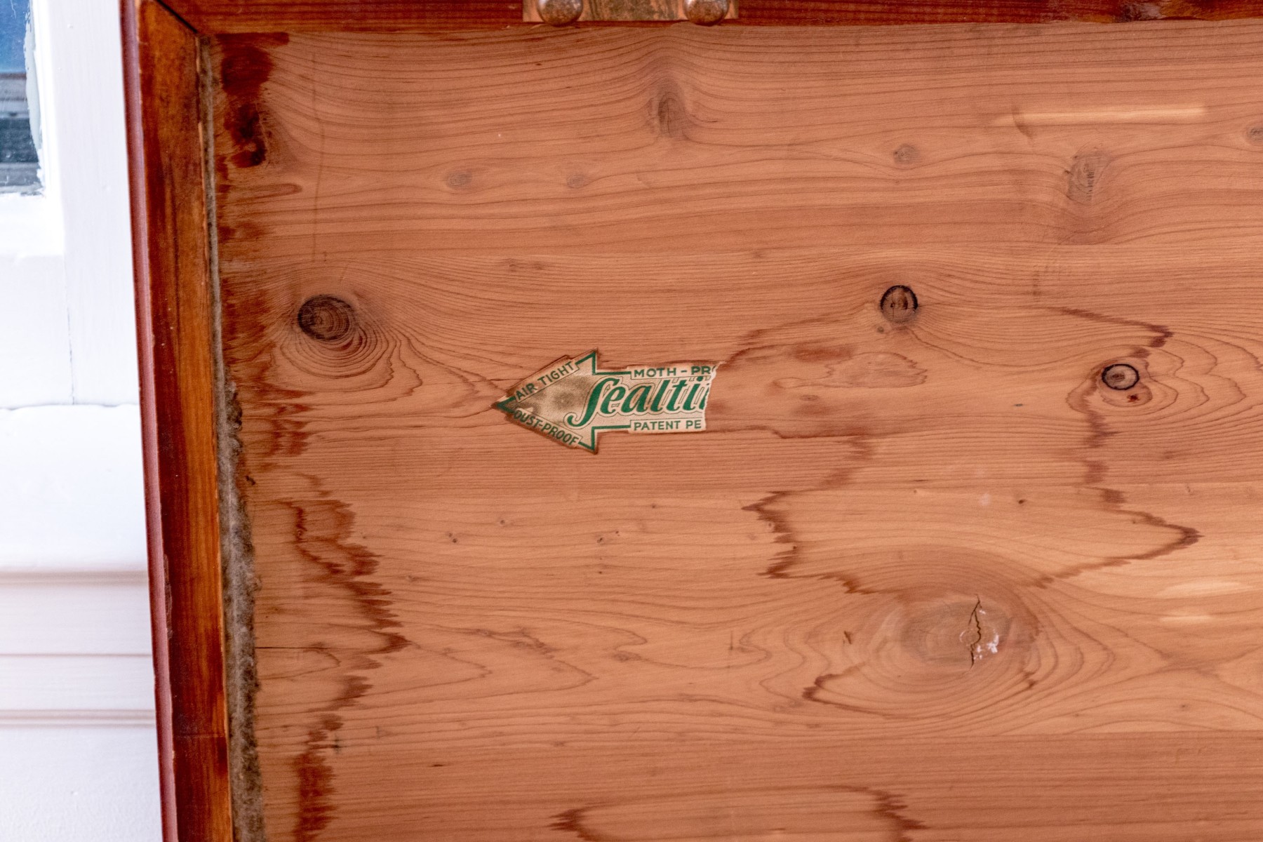 There are two brass casters that have come loose and are in the case. Some water staining to the interior lid. Wear commensurate with age and use but overall still in good form.