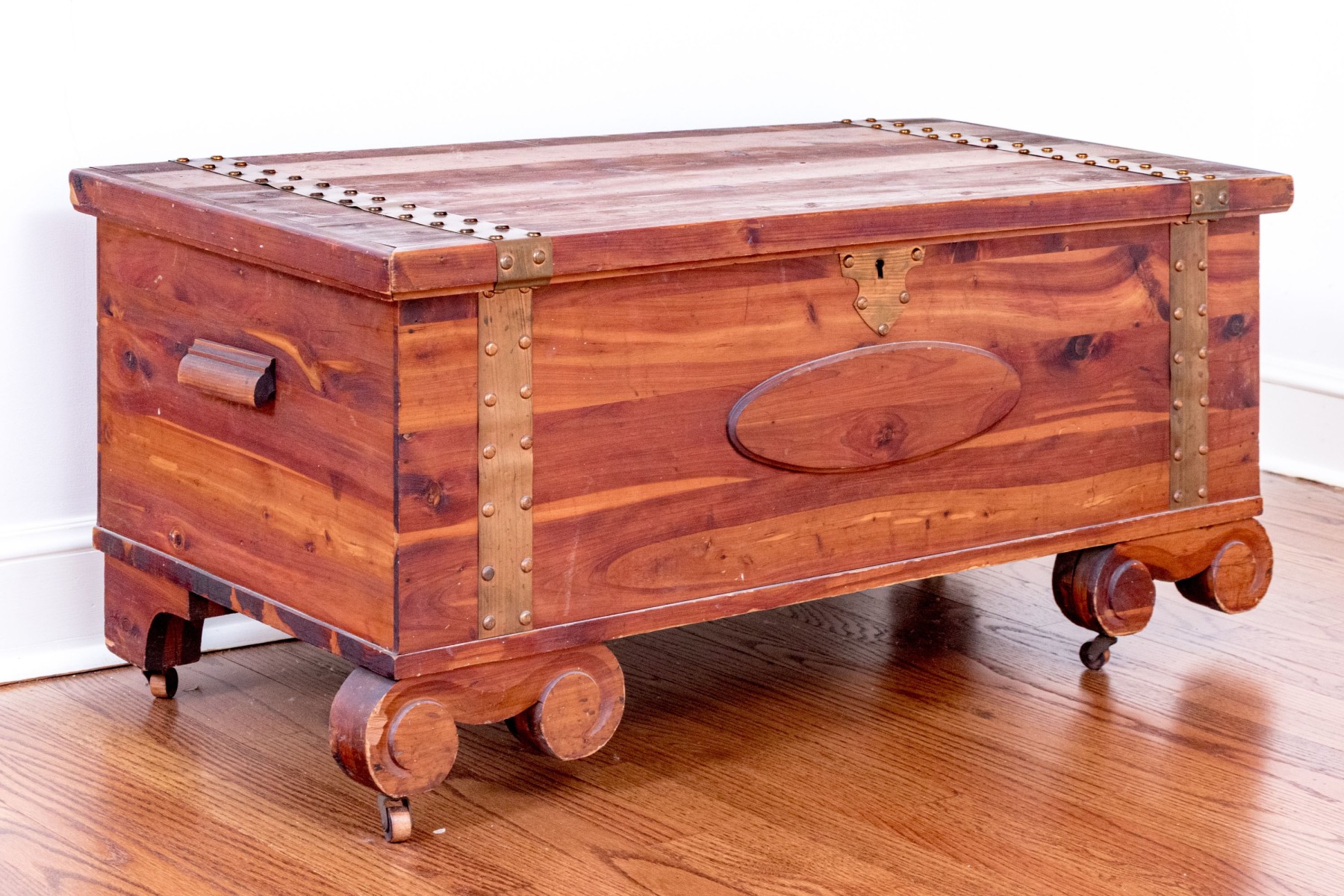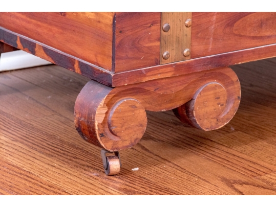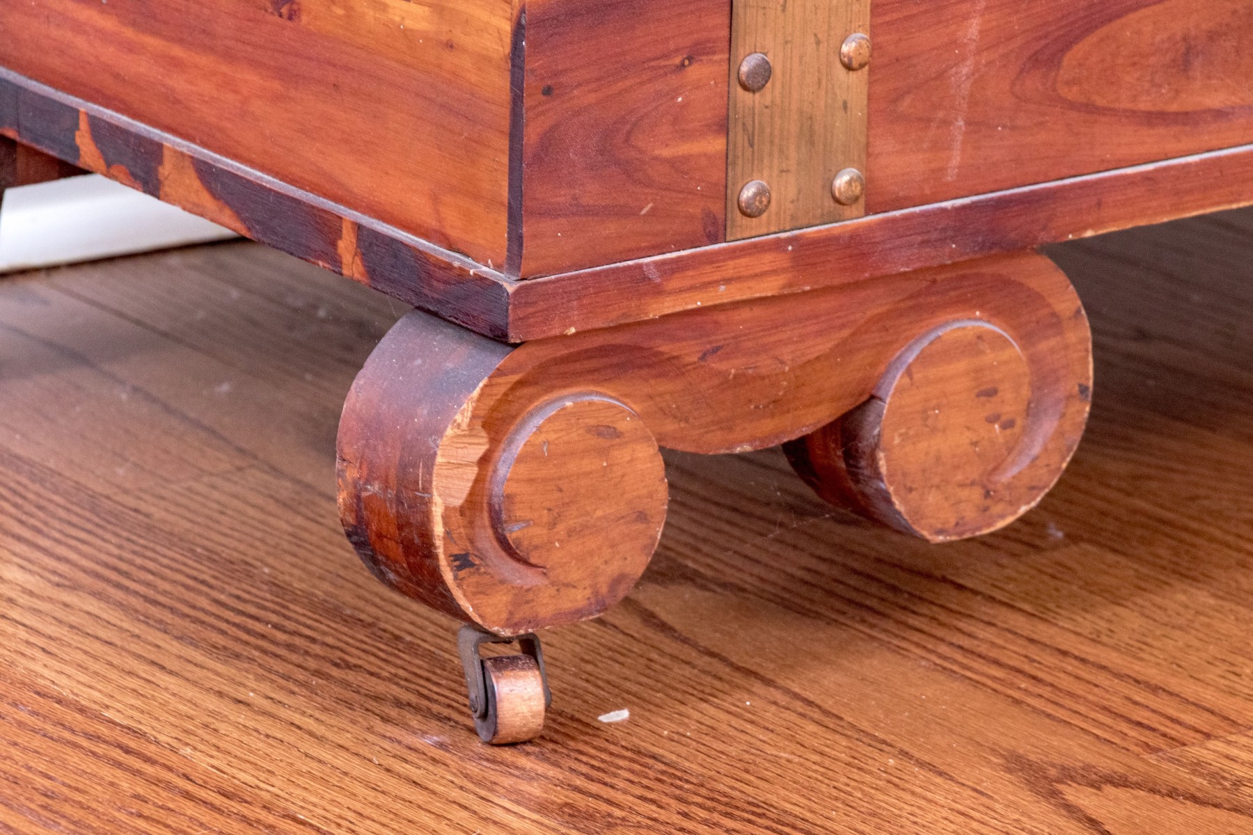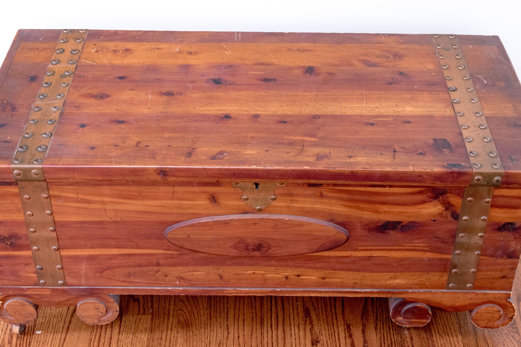 A charming first half 20th century blanket chest designed with great Arts & Crafts appeal in vibrant red-brown streaked pine with great wood grain and knot adding captivating visual interest. The chest features a rectangular form with an overhanging hinged lid, twin handles, and metal bands extending around. Further detailed with a shaped key escutcheon and oval plaque at the front and fun double-scrolled front legs, finished with bracket back legs and all on casters for easy mobility. Opens to a spacious cedar lined interior.