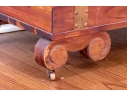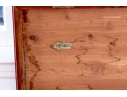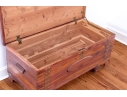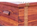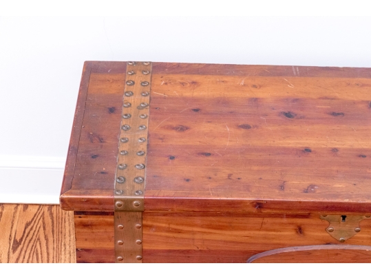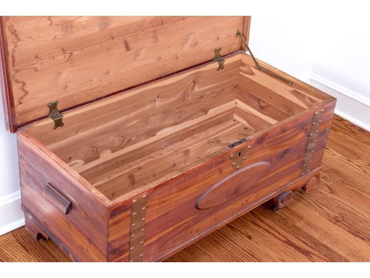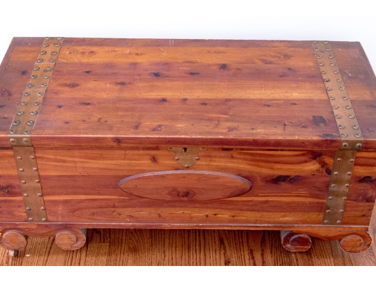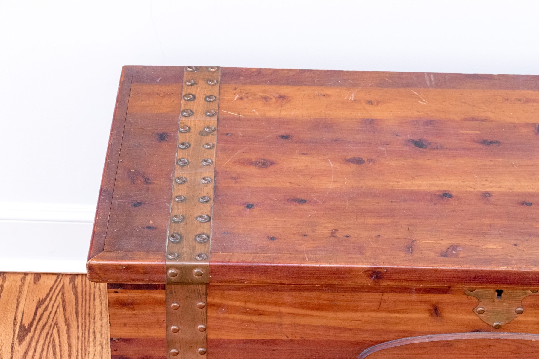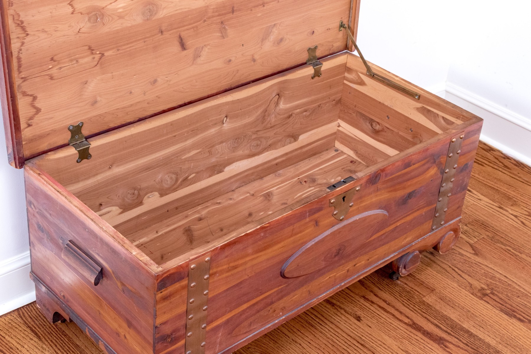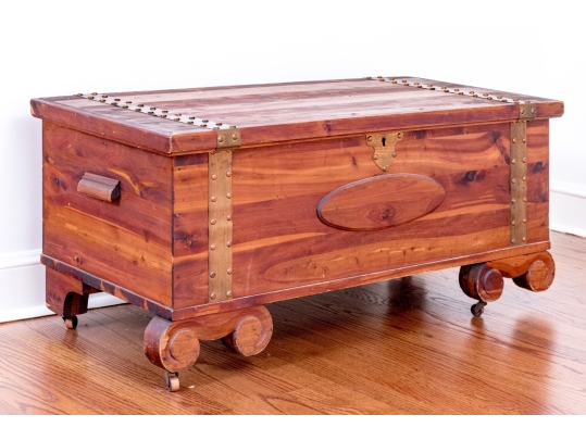 A charming first half 20th century blanket chest designed with great Arts & Crafts appeal in vibrant red-brown streaked pine with great wood grain and knot adding captivating visual interest. The chest features a rectangular form with an overhanging hinged lid, twin handles, and metal bands extending around. Further detailed with a shaped key escutcheon and oval plaque at the front and fun double-scrolled front legs, finished with bracket back legs and all on casters for easy mobility. Opens to a spacious cedar lined interior.