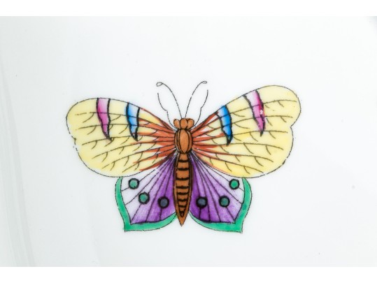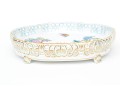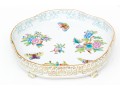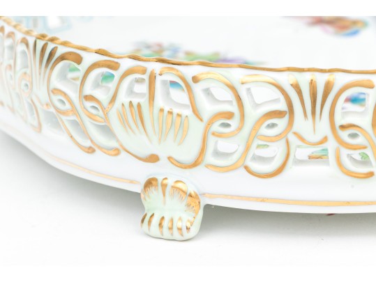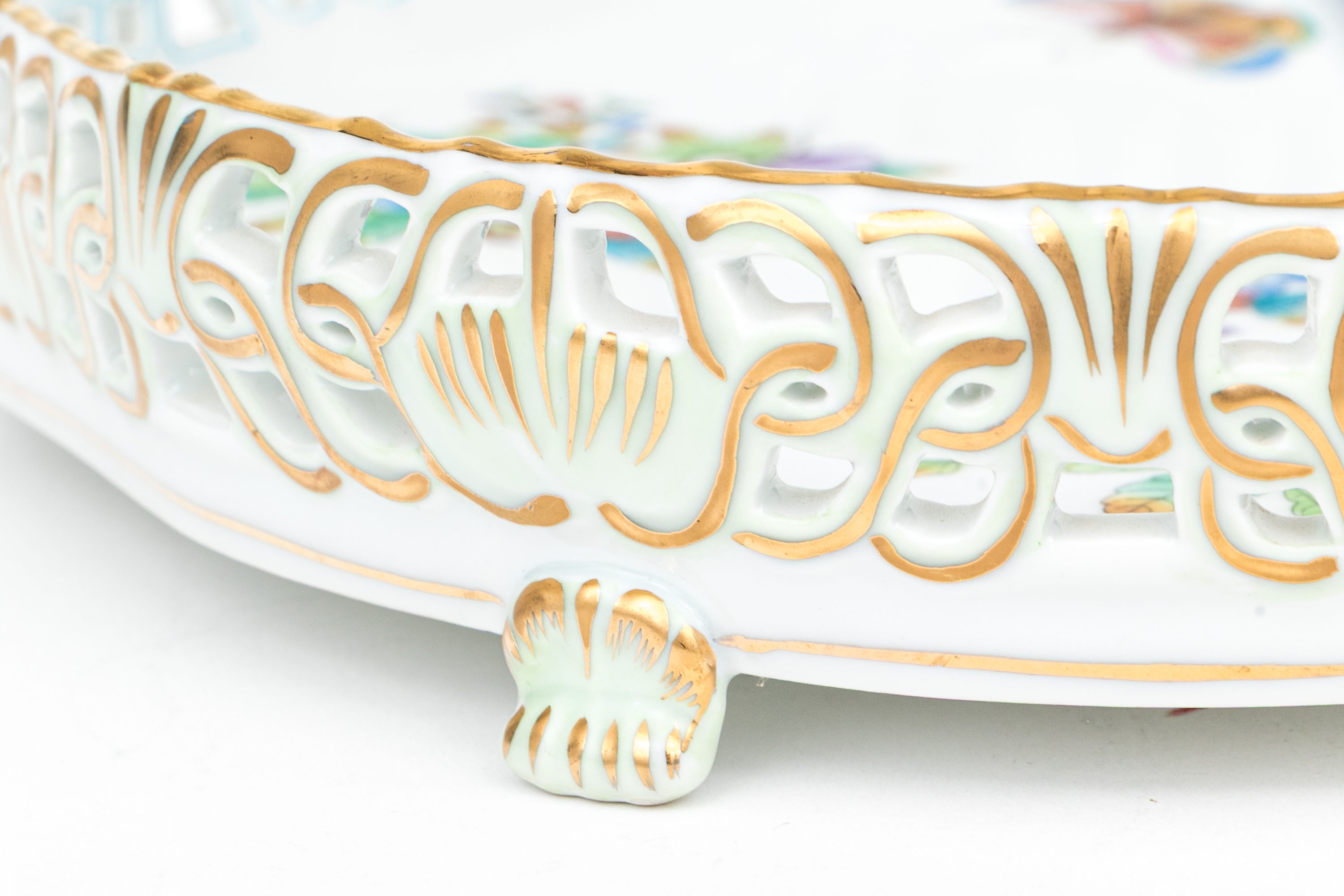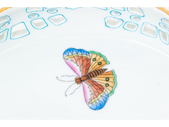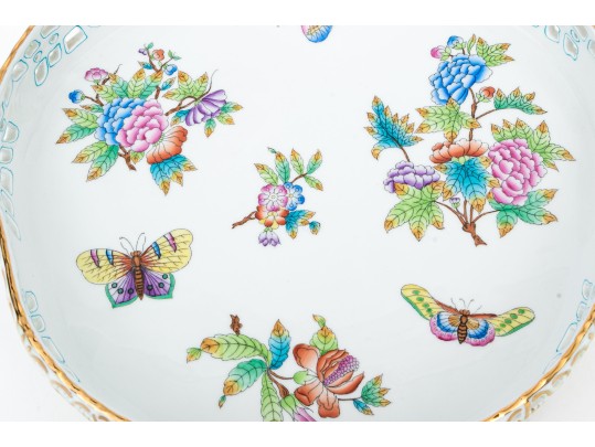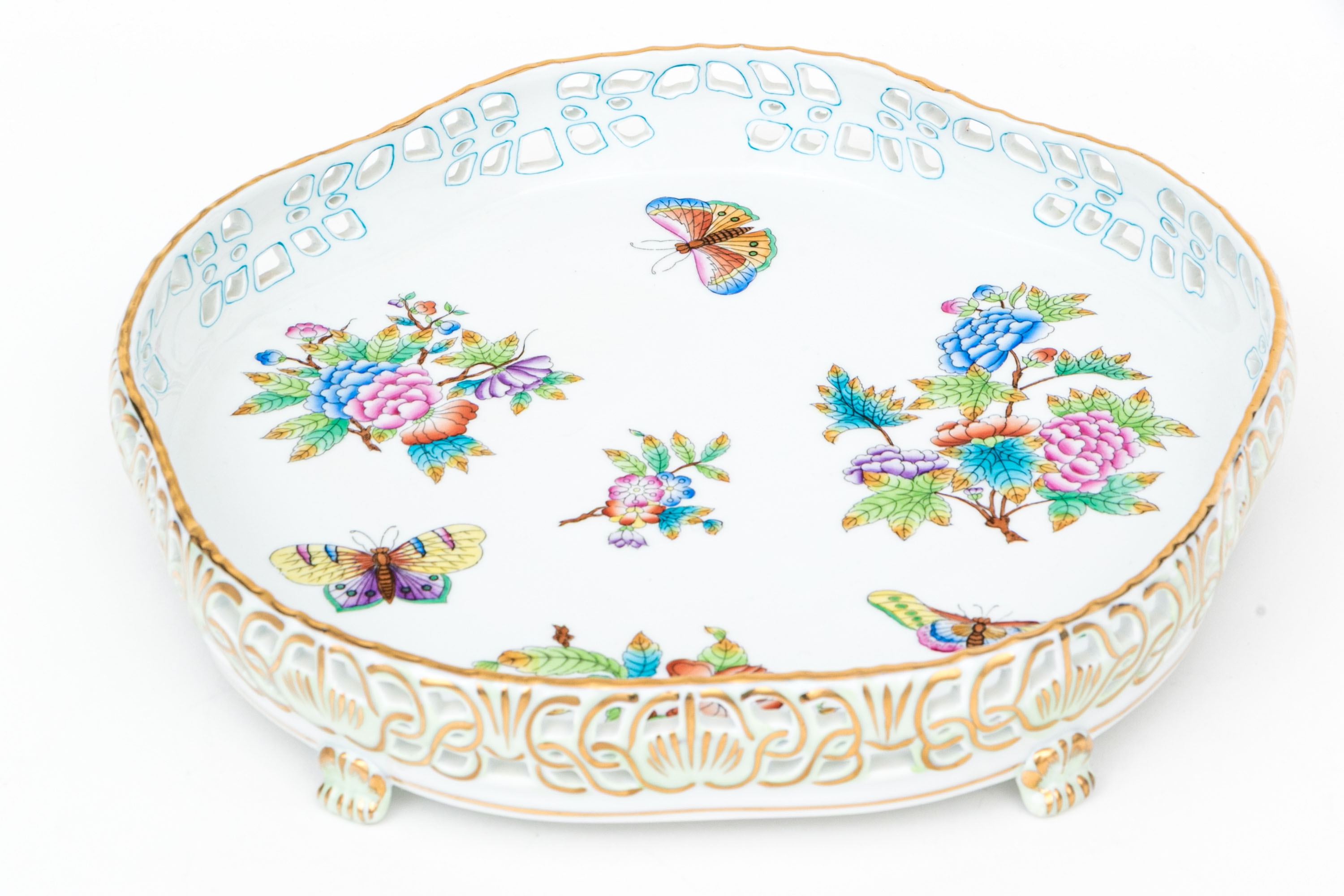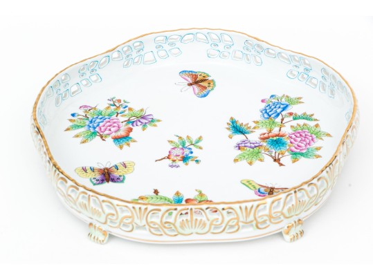 Herend Hungary hand-painted porcelain reticulated compote or footed tray in the Queen Victoria (VBO) pattern. This piece displays a lavish hand-painted motif of vibrant butterflies, peonies, and flowering branches, all executed in rich, jewel-like enamels of magenta, lilac, green, turquoise, and yellow. The openwork border is delicately reticulated with stylized scroll and fan motifs with a scalloped edge, accented throughout in 24k gold, while the piece rests on four shell-form gilt decorated feet. The underside bears the Herend blue shield hallmark with crossed paintbrushes and HANDPAINTED inscription, along with the form number 7535/VBO.